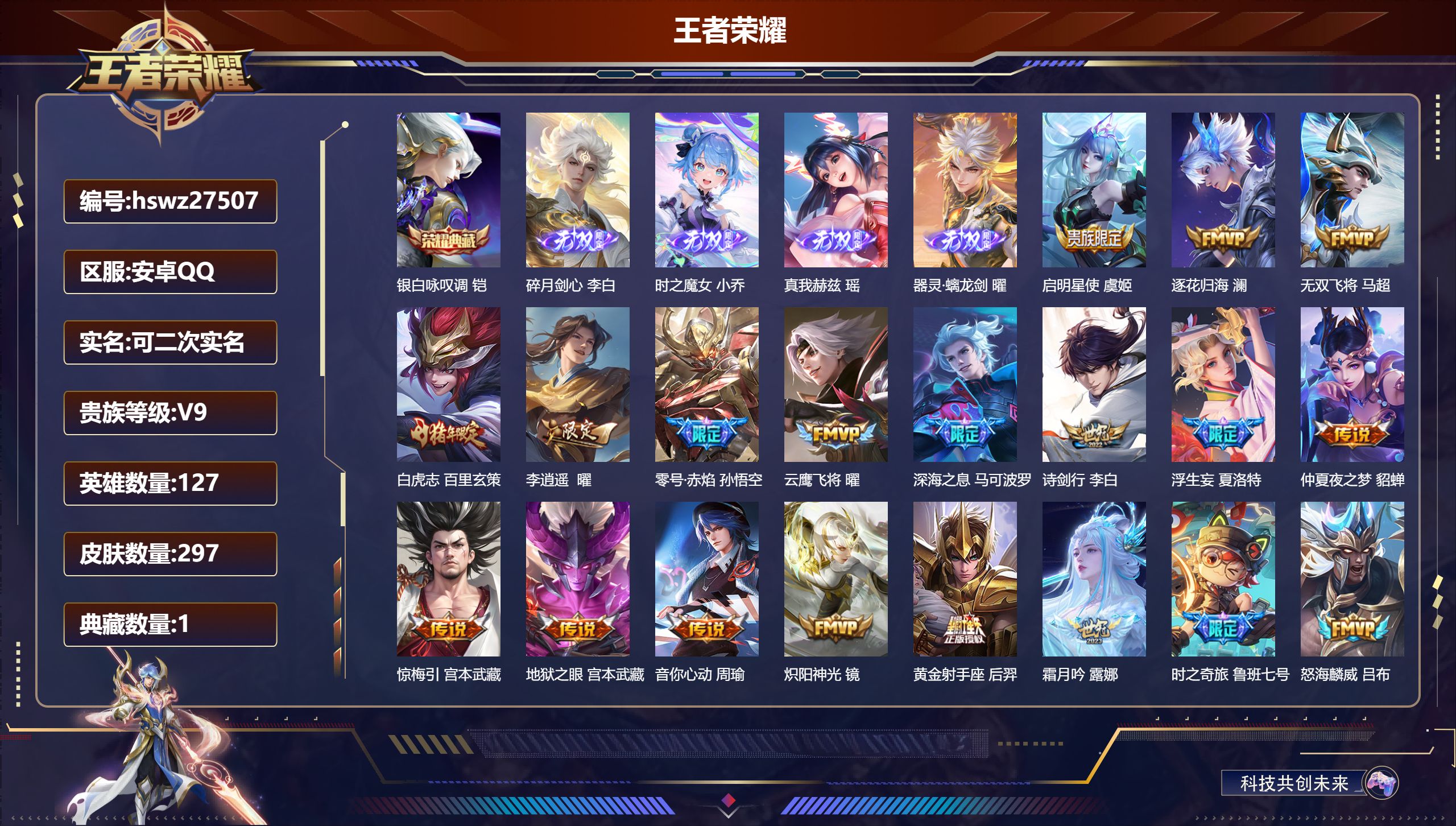 PX_2541684-Q/至尊星耀/297皮肤/127英雄/1典藏/0珍品无双/4无双/0珍品传说/42传说/90史诗/9稀有英雄 【1,典藏皮肤】银白咏叹调,铠, 【4,无双皮肤】碎月剑心,李白,时之魔女,小乔,真我赫兹,瑶,器灵·螭龙剑,曜, 【42,传说皮肤】启明星使,虞姬,逐花归海,澜,无双飞将,马超,白虎志,百里玄策,李逍遥,,曜,零号·赤焰,孙悟空,云鹰飞将,曜,深海之息,马可波罗,诗剑行,李白,浮生妄,夏洛特,仲夏夜之梦,貂蝉,惊梅引,宫本武藏,地狱之眼,宫本武藏,音你心动,周瑜,炽阳神光,镜,黄金射手座,后羿,霜月吟,露娜,时之奇旅,鲁班七号,怒海麟威,吕布,乘龙·问璇玑,孙尚香,时之恋人,刘备,黄金狮子座,达摩,绯月行,不知火舞,乘龙·淬吴钩,孙策,末日机甲,孙策,一念神魔,李信,战鼓燎原,典韦,乘龙·铭钟鼎,赵云,绛天战甲,铠,妄想奇谈,上官婉儿,音你闪耀,孙尚香,星之鸣奏,杨玉环,愿照·九州拓,澜,愿照·众生和,妲己,愿照·福禄聚,蔡文姬,幻光神枪,云缨,愿照·山河定,司空震,祥瑞亨通,裴擒虎,愿照·岁时盈,虞姬,千劫归真,后羿,愿照·千秋盛,女娲,鸣野蒿,桑启, 【90,史诗皮肤】电玩小子,鲁班七号,末日机甲,吕布,蔬乡物语,鲁班七号,超元猎域,百里玄策,百解令,蒙犽,暗渊魔法,司马懿,匿光决锋者,夏侯惇,乘龙·忆丹青,大乔,暗影游猎,马可波罗,燃音魔法,高渐离,狮舞东方,鲁班七号,妄想食味,姬小满,糖绘人间,亚连,德古拉伯爵,刘邦,五谷丰年,鬼谷子,戍鼓铭心,钟无艳,巫礼祀神,少司缘,鬼剑武藏,宫本武藏,百相守梦,黄忠,迷踪丽影,阿轲,星夜王子,白起,至美·乘鲤谣,西施,地狱燃心,司空震,线条小狗,周瑜,摇滚巨星,嬴政,修罗,橘右京,拒霜思,嫦娥,魅力维加斯,妲己,黄金分割率,诸葛亮,苍鳞隐世,白起,荣光圣徽,蒙恬,女仆咖啡,妲己,赏金猎手,澜,九幽镇关,项羽,遇见神鹿,瑶,舞动绿茵,蔡文姬,鹰眼统帅,狄仁杰,孙行者,孙悟空,李小龙,裴擒虎,纤云弄巧,云中君,傲雪梅枪,韩信,冰霜神祇,盘古,猫狗日记,孙策,逐浪之夏,李元芳,真我赫兹,百里守约,鸭鸭历险记,刘禅,驭风魔法,戈娅,魔术师,狄仁杰,埋骨钱,暃,龙之律动,狂铁,唤灵魅影,貂蝉,皇家上将,赵云,冰冠公主,雅典娜,辉光之辰,后羿,功夫厨神,程咬金,圣诞恋歌,貂蝉,水晶猎龙者,花木兰,涂山容容,公孙离,破空之剑,亚连,御风骁将,吕布,圣诞狂欢,吕布,青焰无极,镜,群星魔术团,上官婉儿,器灵·浮梦炉,赵怀真,岱宗,典韦,星界战将,牛魔,地狱岩魂,廉颇,茶境仙,孙膑,冰雪圆舞曲,甄姬,千年之狐,李白,曙光守护者,铠,心灵骇客,安琪拉,乘龙·聚宝船,安琪拉,夜都魔契,曹操,箭羽风息,伽罗,乱世虎臣,张飞,百相守梦,周瑜,琥珀纪元,伽罗,万物之道,弈星,绅士熊喵,刘禅,缤纷独角兽,小乔,百相守梦,百里守约,水果甜心,孙尚香,狂想玩偶喵,蒙犽,化蝶舞,阿轲,江河有灵,阿古朵,狼魂孤将,苍,幽灵船长,曹操,乘风破浪,夏侯惇,暗隐猎兽者,兰陵王, 【121,勇者皮肤】时空谍影,海诺,玲珑珍味,西施,暖冬絮语,程咬金,缤纷绘卷,张良,拳王,达摩,龙舞盛年,沈梦溪,丁香结,小乔,沉稳之力,孙尚香,海盐诗旅,桑启,朔望之晖,女娲,热血海滩,哪吒,白色死神,白起,黄金武士,典韦,阴阳师,狄仁杰,古海寻踪,张良,戏梦巡演,空空儿,功夫老勺,老夫子,西部大镖客,牛魔,虎啸剑宗,刘邦,海滩派对,项羽,完美运算,后羿,无尽征程,廉颇,克喵,鬼谷子,踏浪烽翎,莱西奥,红桃皇后,芈月,野性能量,吕布,瓷语鉴心,露娜,星空之诺,沈梦溪,潮玩探月行,猪八戒,鸿运当头,亚瑟,天穹祈灯,鬼谷子,无尽旅途,扁鹊,五福同心,张飞,金色潮汐,朵莉亚,星际陆战队,程咬金,虹云星官,明世隐,潮玩牛仔,马可波罗,救世之瞳,扁鹊,死亡骑士,亚瑟,敏锐之力,李白,危途狂花,戈娅,胡桃狂想曲,蒙犽,破局者,亚连,掌控之力,诸葛亮,忍·炎影,赵云,雪境奇遇,西施,炽热元素使,姜子牙,坚韧之力,苏烈,万事如意,刘备,擒涛扼浪,裴擒虎,苍云破阵,蒙恬,乓乓大师,鲁班大师,逐霄之志,曹操,溯影追猎,虞姬,极光幻客,蚩奼,探海日志,鲁班大师,天使之翼,孙膑,雾都夜雨,干将莫邪,兔女郎,花木兰,龙腾万里,关羽,流音漫舞,艾琳,金庭之子,兰陵王,幻夜行动,兰陵王,未来纪元,宫本武藏,零食大作战,姬小满,花好人间,甄姬,万象初新,宫本武藏,聚星闪耀,钟无艳,潮玩造梦师,刘备,春野之旅,钟无艳,教廷特使,韩信,街头霸王,韩信,云中旅人,李元芳,妄想特派,李元芳,西部大镖客,孙悟空,重装意志,盘古,蔬乡物语,李元芳,灵卜魔法,妲己,蔚蓝守将,蒙恬,春野闲踪,苏烈,布丁狗之约,阿古朵,绒语心约,大乔,命运加冕,露娜,小满鸭,姬小满,灵野札记,张良,潮玩士官长,雅典娜,鸭鸭历险记,沈梦溪,死霸装,白起,特工战影,狂铁,虚灵犬护,钟馗,班班快跑,鲁班七号,漠中幻影,嫦娥,白执事,赵云,劲辣红锅,太乙真人,神迹守卫,孙悟空,剑破天穹,刘邦,苍威无极,项羽,铁骨偃魂,典韦,熔金海岸,周瑜,苍林狼骑,苍,天穹之誓,姜子牙,魅影绮裳,影,访茗客,马超,星梦巡礼,姜子牙,谧流熔炉,太乙真人,金福满堂,东皇太一,群星魔术团,程咬金,经纬探寻者,盘古,暗都幽影,大司命,鹤鸣心笺,艾琳,锦麟游梦,庄周,逆浪荇歌,甄姬,百相守梦,孙策,线条小狗,周瑜,线条小狗,桑启,百相守梦,老夫子,噬灭天穹,东皇太一,灵卦秘语,少司缘,敬我三分,盘古,爆裂喵拳,达摩,景韶洛都,明世隐, 【41,其他皮肤】战争骑士,夏侯惇,圣殿之光,刘邦,龙域领主,铠,生化警戒,钟无艳,第七人偶,干将莫邪,海之征途,孙策,木偶奇遇记,鲁班七号,福禄兄弟,鲁班七号,帝