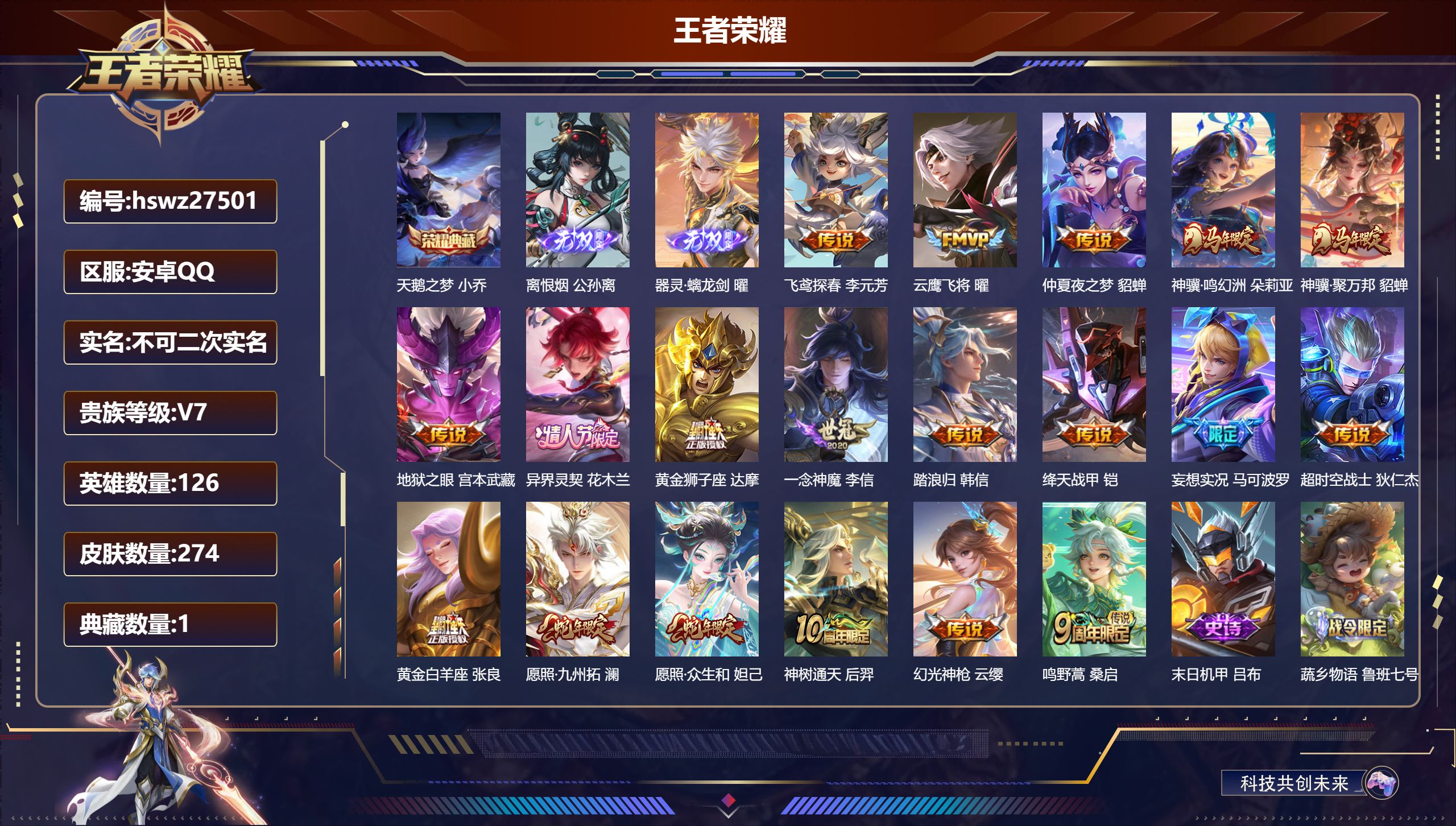 PX_2541376-Q/至尊星耀/274皮肤/126英雄/1典藏/0珍品无双/2无双/0珍品传说/19传说/75史诗/7稀有英雄 【1,典藏皮肤】天鹅之梦,小乔, 【2,无双皮肤】离恨烟,公孙离,器灵·螭龙剑,曜, 【19,传说皮肤】飞鸢探春,李元芳,云鹰飞将,曜,仲夏夜之梦,貂蝉,神骥·鸣幻洲,朵莉亚,神骥·聚万邦,貂蝉,地狱之眼,宫本武藏,异界灵契,花木兰,黄金狮子座,达摩,一念神魔,李信,踏浪归,韩信,绛天战甲,铠,妄想实况,马可波罗,超时空战士,狄仁杰,黄金白羊座,张良,愿照·九州拓,澜,愿照·众生和,妲己,神树通天,后羿,幻光神枪,云缨,鸣野蒿,桑启, 【75,史诗皮肤】末日机甲,吕布,蔬乡物语,鲁班七号,紫霞仙子,露娜,百解令,蒙犽,燃音魔法,高渐离,妄想食味,姬小满,糖绘人间,亚连,山海·玄木吟,马可波罗,心灵战警,亚瑟,巫礼祀神,少司缘,鬼剑武藏,宫本武藏,百相守梦,黄忠,幻珠鲛人,朵莉亚,星夜王子,白起,守夜人,弈星,线条小狗,周瑜,百晓客,明世隐,摇滚巨星,嬴政,拒霜思,嫦娥,魅力维加斯,妲己,赞萌露比,云缨,乐园奇幻夜,钟馗,偶像歌手,王昭君,九幽镇关,项羽,鹰眼统帅,狄仁杰,光弋星穹,莱西奥,春霖将至,上官婉儿,纤云弄巧,云中君,驯魔猎人,兰陵王,金属风暴,墨子,特工魅影,百里守约,猫狗日记,孙策,原初追逐者,百里玄策,逐浪之夏,李元芳,未来纪元,赵云,灵蛊蚀心,扁鹊,黎明之约,雅典娜,鸭鸭历险记,刘禅,魔术师,狄仁杰,埋骨钱,暃,龙之律动,狂铁,顽岩魄,蒙犽,皇家上将,赵云,冰冠公主,雅典娜,至尊宝,孙悟空,涂山红红,少司缘,功夫厨神,程咬金,云间偶戏,元歌,水晶猎龙者,花木兰,心动手记,海诺,青焰无极,镜,器灵·浮梦炉,赵怀真,浮光幕影,芈月,夏日便利店,蔡文姬,星界战将,牛魔,茶境仙,孙膑,蔷薇恋人,孙尚香,冰雪圆舞曲,甄姬,青蛇,小乔,月团寄思,沈梦溪,节奏热浪,阿轲,织梦人,西施,万灵启世,女娲,心灵骇客,安琪拉,箭羽风息,伽罗,乱世虎臣,张飞,百相守梦,周瑜,绅士熊喵,刘禅,百相守梦,百里守约,线条小狗,小乔,水果甜心,孙尚香,化蝶舞,阿轲,幽灵船长,曹操,乘风破浪,夏侯惇,暗隐猎兽者,兰陵王, 【131,勇者皮肤】时空谍影,海诺,玲珑珍味,西施,缤纷绘卷,张良,纽约教父,刘备,拳王,达摩,大发明家,达摩,龙舞盛年,沈梦溪,丁香结,小乔,功夫炙烤,廉颇,白色死神,白起,黑桃队长,鲁班七号,阴阳师,狄仁杰,径山谋武,孙权,次元突破,哪吒,古海寻踪,张良,牛运亨通,牛魔,戏梦巡演,空空儿,西部大镖客,牛魔,鲨炮海盗猫,沈梦溪,海滩派对,项羽,完美运算,后羿,无尽征程,廉颇,克喵,鬼谷子,踏浪烽翎,莱西奥,红桃皇后,芈月,野性能量,吕布,哥特玫瑰,露娜,瓷语鉴心,露娜,百相守梦,影,鸿运当头,亚瑟,天穹祈灯,鬼谷子,无尽旅途,扁鹊,五福同心,张飞,金色潮汐,朵莉亚,星际陆战队,程咬金,虹云星官,明世隐,雾影缉谜,兰陵王,潮玩牛仔,马可波罗,舞狮寰,吕布,死亡骑士,亚瑟,浪漫序章,刘备,破局者,亚连,幽兰居士,张良,玩偶对对碰,安琪拉,掌控之力,诸葛亮,海滩丽影,钟无艳,落日弦歌,高渐离,忍·炎影,赵云,雪境奇遇,西施,唤灵魔甲,刘禅,逐霄战戟,吕布,糖果风暴,安琪拉,乓乓大师,鲁班大师,溯影追猎,虞姬,极光幻客,蚩奼,探海日志,鲁班大师,天使之翼,孙膑,雾都夜雨,干将莫邪,龙腾万里,关羽,未来纪元,宫本武藏,罗小黑战记,哪吒,往忆晖光,明世隐,荣光之誓,亚瑟,花好人间,甄姬,万象初新,宫本武藏,时尚教父,姜子牙,春野之旅,钟无艳,秘密基地,刘禅,教廷特使,韩信,妄想特派,李元芳,西部大镖客,孙悟空,紫罗兰之誓,妲己,重装意志,盘古,蔬乡物语,李元芳,少女阿狸,妲己,灵卜魔法,妲己,秘证寻踪,小乔,蔚蓝守将,蒙恬,春野闲踪,苏烈,契约魔法,米莱狄,布丁狗之约,阿古朵,暖冬·兔眠,嫦娥,绒语心约,大乔,命运加冕,露娜,小满鸭,姬小满,幻想奇妙夜,王昭君,灵野札记,张良,潮玩士官长,雅典娜,鸭鸭历险记,沈梦溪,命运角斗场,狂铁,死霸装,白起,特工战影,狂铁,虚灵犬护,钟馗,漠中幻影,嫦娥,白执事,赵云,劲辣红锅,太乙真人,神迹守卫,孙悟空,罗小黑战记,张良,剑破天穹,刘邦,青衿临川,桑启,异域游侠,刘备,苍威无极,项羽,铁骨偃魂,典韦,熔金海岸,周瑜,天穹之誓,姜子牙,魅影绮裳,影,长夏之忆,貂蝉,访茗客,马超,星梦巡礼,姜子牙,破阵·退雄兵,杨戬,谧流熔炉,太乙真人,金福满堂,东皇太一,群星魔术团,程咬金,经纬探寻者,盘古,暗都幽影,大司命,夏日便利店,虞姬,鹤鸣心笺,艾琳,线条小狗,妲己,锦麟游梦,庄周,云械蓝图,云中君,逆浪荇歌,甄姬,百相守梦,孙策,线条小狗,周瑜,线条小狗,桑启,百相守梦,老夫子,噬灭天穹,东皇太一,灵卦秘语,少司缘,敬我三分,盘古,爆裂喵拳,达摩,玫蓝誓约,戈娅,景韶洛都,明世隐, 【49,其他皮肤】伊势巫女,大乔,金属狂潮,高渐离,前尘,金蝉,战争骑士,夏侯惇,芝加哥教父,黄忠,龙域领主,铠,花见巫女,伽罗,第七人偶,干将莫邪,幻珠鲛人,朵莉亚,万圣前夜,小乔,熊喵少女,阿古朵,海之征途,孙策,碧珀绯影,暃,星航指挥官,诸葛亮,魇语军师,司马懿,英喵野望,刘禅,午夜歌剧院,元歌,启蛰,司空震,隐刃,兰陵王,霓裳曲,杨玉环,花间舞,公孙离,异域舞娘,貂蝉,东海龙王,东皇太一,修竹墨客,上官婉儿,剑舞者,花木兰,范海辛,李白,维京掠夺者,苍,占星师,明世隐,激情绿茵,马可波罗,埃及法老,杨戬,画中游,桑启,年年有余,猪八戒,尼罗河女神,女娲,锦衣卫,狄仁杰,归虚梦演,曜,幸存者,马超,战争女神,雅典娜,绝影神枪,百里守约,蔷薇王座,蔡文姬,森,瑶,孤猎,澜,加勒比