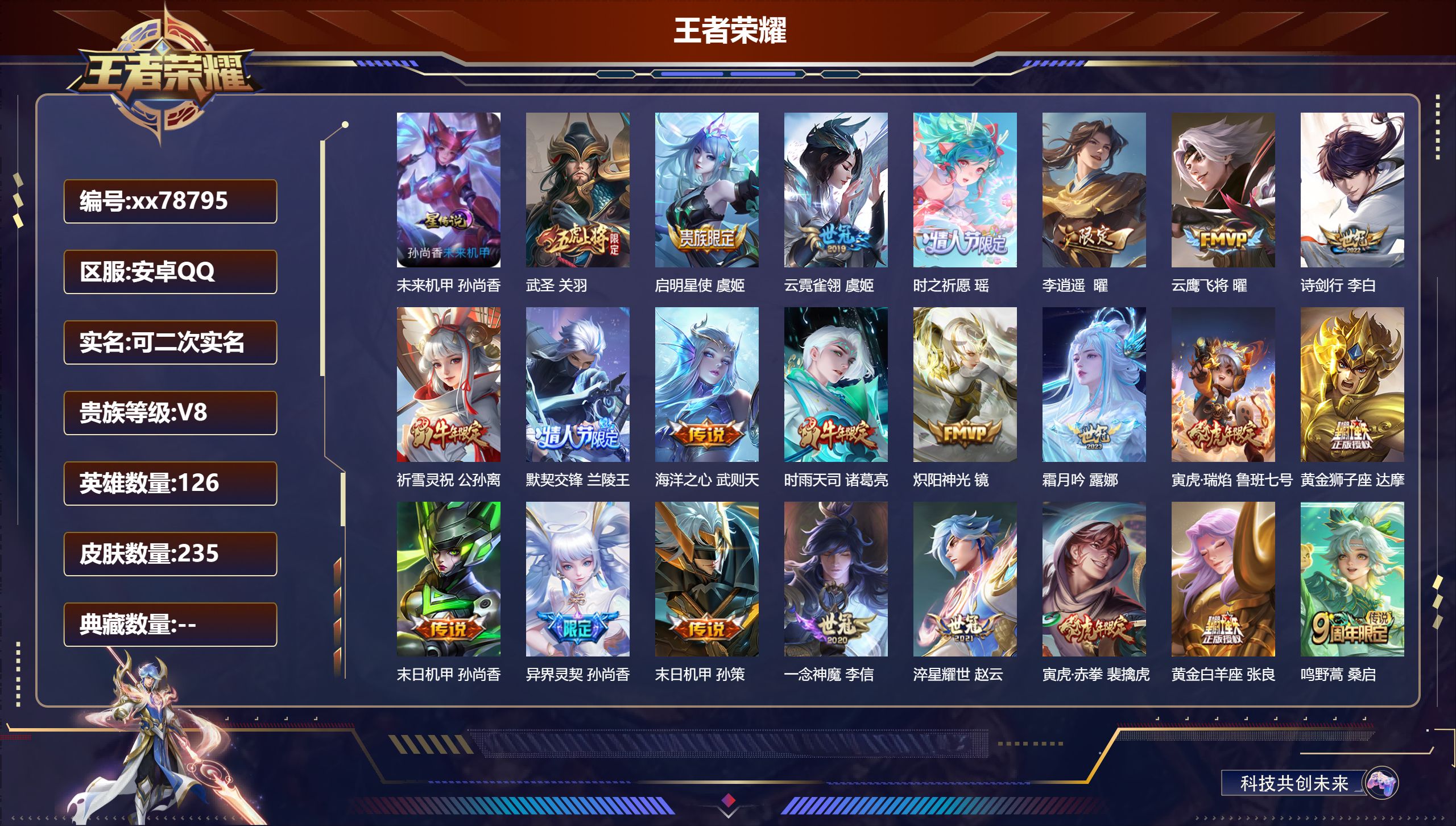 PX_2566831-,不包人脸,V9,贵族积分,安卓QQ/331皮肤/127英雄/3典藏/0珍品无双/1无双/1珍品传说/25传说/102史诗/8稀有英雄,对抗路30段 【2,星传说皮肤】,时之羁绊,刘备,幽冥之眼,宫本武藏, 【1,珍品传说】,器灵·落星盏,嫦娥, 【3,典藏皮肤】,全息碎影,孙悟空,银白咏叹调,铠,神鉴启示录,虞姬, 【1,无双皮肤】,离恨烟,公孙离, 【25,传说皮肤】,武圣,关羽,启明星使,虞姬,无双飞将,马超,白虎志,百里玄策,零号·赤焰,孙悟空,云鹰飞将,曜,凤求凰,李白,浮生妄,夏洛特,神骥·赴朔漠,狄仁杰,惊梅引,宫本武藏,神骥·逐星野,马超,地狱之眼,宫本武藏,神骥·越千峰,云缨,黄金射手座,后羿,霜月吟,露娜,时之恋人,刘备,黄金狮子座,达摩,久胜战神,干将莫邪,山海·炽霜斩,李信,一念神魔,李信,天魔缭乱,吕布,山海·苍雷引,曜,冠军飞将,花木兰,鸣野蒿,桑启,云诺千山,公孙离, 【102,史诗皮肤】,龙鼓争鸣,蒙犽,霸王别姬,项羽,电玩小子,鲁班七号,末日机甲,吕布,白昼王子,嬴政,紫霞仙子,露娜,高山流水,庄周,银河之约,李元芳,暗渊魔法,司马懿,暗影游猎,马可波罗,燃音魔法,高渐离,冰霜恋舞曲,干将莫邪,苍穹之光,项羽,狮舞东方,鲁班七号,德古拉伯爵,刘邦,五谷丰年,鬼谷子,诗语江南,西施,无心,元歌,鬼剑武藏,宫本武藏,星夜王子,白起,地狱燃心,司空震,线条小狗,周瑜,百晓客,明世隐,摇滚巨星,嬴政,电玩高手,狂铁,顽趣,梦奇,冰锋战神,关羽,百相守梦,关羽,修罗,橘右京,拒霜思,嫦娥,魅力维加斯,妲己,黄金分割率,诸葛亮,乐园奇幻夜,钟馗,偶像歌手,王昭君,梅西,裴擒虎,荣光圣徽,蒙恬,晚萤,娜可露露,猪悟能,猪八戒,舞动绿茵,蔡文姬,繁星吟游,蔡文姬,暗夜贵公子,嬴政,鹰眼统帅,狄仁杰,飞衡,韩信,孙行者,孙悟空,李小龙,裴擒虎,春霖将至,上官婉儿,纤云弄巧,云中君,驯魔猎人,兰陵王,如梦令,后羿,龙骑士,墨子,金属风暴,墨子,特工魅影,百里守约,猫狗日记,孙策,原初追逐者,百里玄策,逐浪之夏,李元芳,奇幻香踪,扁鹊,未来纪元,赵云,朱雀志,百里守约,黎明之约,雅典娜,魔术师,狄仁杰,埋骨钱,暃,龙之律动,狂铁,神威,马超,皇家上将,赵云,冰冠公主,雅典娜,至尊宝,孙悟空,功夫厨神,程咬金,梁祝,上官婉儿,电玩·爆裂旋风,刘禅,天才门将,刘禅,圣诞恋歌,貂蝉,云间偶戏,元歌,水晶猎龙者,花木兰,撼地雄心,廉颇,圣诞狂欢,吕布,白龙吟,韩信,永昼,夏洛特,地狱岩魂,廉颇,冰雪圆舞曲,甄姬,默契交锋,花木兰,千年之狐,李白,节奏热浪,阿轲,暗夜猫娘,阿轲,曙光守护者,铠,万灵启世,女娲,青龙志,铠,心灵骇客,安琪拉,乱世虎臣,张飞,吟游魔法,明世隐,万物之道,弈星,龙胆,赵云,王者之锤,钟无艳,绅士熊喵,刘禅,缤纷独角兽,小乔,线条小狗,小乔,蓝屏警告,典韦,天狼狩猎者,裴擒虎,水果甜心,孙尚香,江河有灵,阿古朵,幽灵船长,曹操,乘风破浪,夏侯惇,暗隐猎兽者,兰陵王, 【135,勇者皮肤】,时空谍影,海诺,胡桃夹子,干将莫邪,圆桌骑士,盾山,烛龙,曹操,爱心护理,阿轲,太极少年,赵怀真,星际陆战队,达摩,沙漠行僧,达摩,大漠名商,沈梦溪,纽约教父,刘备,拳王,达摩,大发明家,达摩,丁香结,小乔,功夫炙烤,廉颇,沉稳之力,孙尚香,海盐诗旅,桑启,幻泉雾影,海月,朔风刀,夏侯惇,醍醐杖,老夫子,朔望之晖,女娲,汉昭烈帝,刘备,白色死神,白起,黑桃队长,鲁班七号,黄金武士,典韦,御旌,牛魔,阴阳师,狄仁杰,径山谋武,孙权,次元突破,哪吒,古海寻踪,张良,科学大爆炸,项羽,功夫老勺,老夫子,西部大镖客,牛魔,鲨炮海盗猫,沈梦溪,海滩派对,项羽,万华元夜,狄仁杰,无尽征程,廉颇,制霸全明星,牛魔,演武夺筹,程咬金,奇妙博物学,庄周,猎兽之王,吕布,野性能量,吕布,哥特玫瑰,露娜,守护之力,大乔,无双福将,程咬金,瓷语鉴心,露娜,原初探秘者,鬼谷子,星空之诺,沈梦溪,潮玩探月行,猪八戒,天穹祈灯,鬼谷子,西部大镖客,猪八戒,疑决卦,明世隐,如懿,安琪拉,化身博士,扁鹊,潮玩骑士王,亚瑟,阿尔法小队,后羿,五福同心,张飞,夜都怪侠,白起,次元傲视,杨戬,星际陆战队,程咬金,幻乐之宴,鬼谷子,霸王丸,宫本武藏,虹云星官,明世隐,雾影缉谜,兰陵王,潮玩骑兵,杨戬,赤莲之焰,周瑜,死亡骑士,亚瑟,浪漫序章,刘备,敏锐之力,李白,危途狂花,戈娅,破局者,亚连,幽兰居士,张良,玩偶对对碰,安琪拉,掌控之力,诸葛亮,海滩丽影,钟无艳,忍·炎影,赵云,雪境奇遇,西施,重明,芈月,坚韧之力,苏烈,万事如意,刘备,擒涛扼浪,裴擒虎,乓乓大师,鲁班大师,死亡摇滚,高渐离,溯影追猎,虞姬,极光幻客,蚩奼,探海日志,鲁班大师,天使之翼,孙膑,兔女郎,花木兰,龙腾万里,关羽,流音漫舞,艾琳,金庭之子,兰陵王,未来纪元,宫本武藏,千军破阵,苏烈,零食大作战,姬小满,荣光之誓,亚瑟,花好人间,甄姬,万象初新,宫本武藏,聚星闪耀,钟无艳,潮玩造梦师,刘备,御銮,盾山,时尚教父,姜子牙,春野之旅,钟无艳,秘密基地,刘禅,穷奇,典韦,教廷特使,韩信,街头霸王,韩信,云中旅人,李元芳,西部大镖客,孙悟空,重装意志,盘古,进击墨子号,墨子,少女阿狸,妲己,灵卜魔法,妲己,混沌棋,弈星,御霄,米莱狄,蔚蓝守将,蒙恬,布丁狗之约,阿古朵,命运加冕,露娜,午后时光,王昭君,小满鸭,姬小满,幻想奇妙夜,王昭君,驱傩正仪,钟馗,神迹守卫,钟馗,命运角斗场,狂铁,死霸装,白起,特工战影,狂铁,虚灵犬护,钟馗,御狮,狂铁,白执事,赵云,劲辣红锅,太乙真人,剑破天穹,刘邦,熔金海岸,周瑜,星梦巡礼,姜子牙,破阵·退雄兵,杨戬,线条小狗,周瑜,噬灭天穹,东皇太
