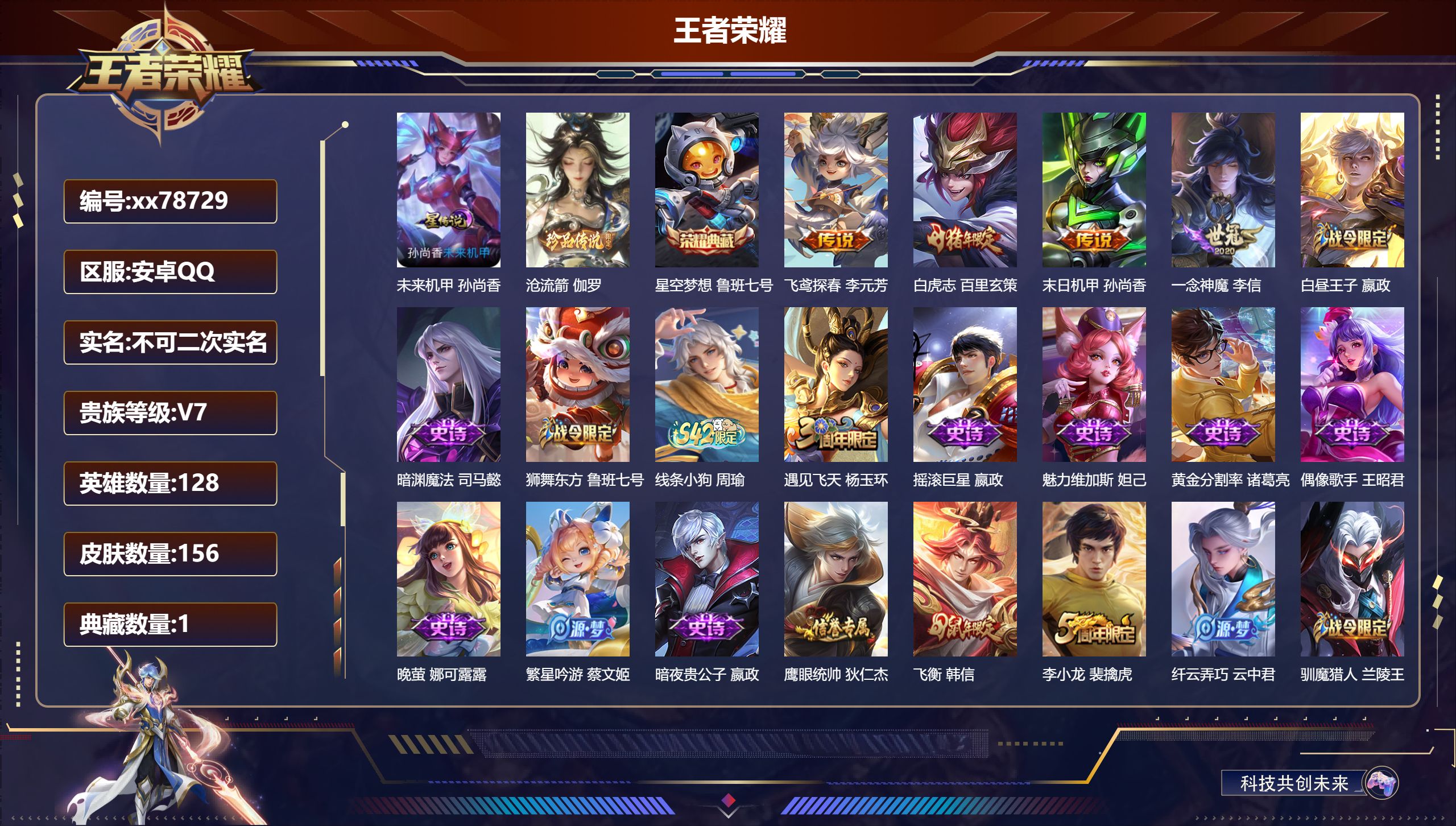 PX_2566829-,不包人脸,V7,贵族积分29058,安卓QQ/156皮肤/128英雄/1典藏/0珍品无双/0无双/1珍品传说/4传说/38史诗/8稀有英雄 【1,星传说皮肤】,未来机甲,孙尚香, 【1,珍品传说】,沧流箭,伽罗, 【1,典藏皮肤】,星空梦想,鲁班七号, 【4,传说皮肤】,飞鸢探春,李元芳,白虎志,百里玄策,末日机甲,孙尚香,一念神魔,李信, 【38,史诗皮肤】,白昼王子,嬴政,暗渊魔法,司马懿,狮舞东方,鲁班七号,线条小狗,周瑜,遇见飞天,杨玉环,摇滚巨星,嬴政,魅力维加斯,妲己,黄金分割率,诸葛亮,偶像歌手,王昭君,晚萤,娜可露露,繁星吟游,蔡文姬,暗夜贵公子,嬴政,鹰眼统帅,狄仁杰,飞衡,韩信,李小龙,裴擒虎,纤云弄巧,云中君,驯魔猎人,兰陵王,原初追逐者,百里玄策,逐浪之夏,李元芳,魔术师,狄仁杰,龙之律动,狂铁,神威,马超,皇家上将,赵云,梁祝,上官婉儿,天才门将,刘禅,圣诞恋歌,貂蝉,圣诞狂欢,吕布,器灵·浮梦炉,赵怀真,罗小黑战记,百里玄策,白龙吟,韩信,地狱岩魂,廉颇,千年之狐,李白,节奏热浪,阿轲,游园惊梦,甄姬,心灵骇客,安琪拉,线条小狗,小乔,水果甜心,孙尚香,幽灵船长,曹操, 【76,勇者皮肤】,胡桃夹子,干将莫邪,圆桌骑士,盾山,爱心护理,阿轲,沙漠行僧,达摩,纽约教父,刘备,拳王,达摩,功夫炙烤,廉颇,沉稳之力,孙尚香,朔风刀,夏侯惇,醍醐杖,老夫子,归虚梦演,孙膑,汉昭烈帝,刘备,白色死神,白起,黑桃队长,鲁班七号,御旌,牛魔,阴阳师,狄仁杰,次元突破,哪吒,功夫老勺,老夫子,鲨炮海盗猫,沈梦溪,海滩派对,项羽,万华元夜,狄仁杰,踏浪烽翎,莱西奥,演武夺筹,程咬金,猎兽之王,吕布,哥特玫瑰,露娜,守护之力,大乔,无双福将,程咬金,百相守梦,影,原初探秘者,鬼谷子,疑决卦,明世隐,化身博士,扁鹊,阿尔法小队,后羿,五福同心,张飞,幻乐之宴,鬼谷子,虹云星官,明世隐,赤莲之焰,周瑜,死亡骑士,亚瑟,敏锐之力,李白,玩偶对对碰,安琪拉,掌控之力,诸葛亮,海滩丽影,钟无艳,忍·炎影,赵云,雪境奇遇,西施,擒涛扼浪,裴擒虎,苍云破阵,蒙恬,糖果风暴,安琪拉,乓乓大师,鲁班大师,溯影追猎,虞姬,极光幻客,蚩奼,兔女郎,花木兰,龙腾万里,关羽,未来纪元,宫本武藏,千军破阵,苏烈,荣光之誓,亚瑟,万象初新,宫本武藏,御銮,盾山,穷奇,典韦,街头霸王,韩信,云中旅人,李元芳,西部大镖客,孙悟空,混沌棋,弈星,御霄,米莱狄,布丁狗之约,阿古朵,命运加冕,露娜,小满鸭,姬小满,幻想奇妙夜,王昭君,驱傩正仪,钟馗,神迹守卫,钟馗,死霸装,白起,虚灵犬护,钟馗,御狮,狂铁,星梦巡礼,姜子牙,暗都幽影,大司命,鹤鸣心笺,艾琳,海之女神,海月,线条小狗,周瑜, 【39,其他皮肤】,沧流箭,伽罗,伊势巫女,大乔,金属狂潮,高渐离,战争骑士,夏侯惇,圣殿之光,刘邦,三太子,哪吒,花见巫女,伽罗,爱与和平,苏烈,第七人偶,干将莫邪,灼热之刃,李信,木偶奇遇记,鲁班七号,精灵王,后羿,冰刃幻境,镜,海军大将,周瑜,魇语军师,司马懿,午夜歌剧院,元歌,启蛰,司空震,花间舞,公孙离,异域舞娘,貂蝉,街头旋风,裴擒虎,东海龙王,东皇太一,修竹墨客,上官婉儿,剑舞者,花木兰,范海辛,李白,维京掠夺者,苍,激情绿茵,马可波罗,画中游,桑启,年年有余,猪八戒,威尼斯狂欢,百里玄策,幸存者,马超,战争女神,雅典娜,荷鲁斯之眼,云中君,特种部队,李元芳,森,瑶,加勒比小姐,虞姬,秩序猎龙将,蒙恬,精灵公主,王昭君,赤焰之缨,云缨,西部大镖客,孙悟空, 【8,稀有英雄】,嬴政,不知火舞,橘右京,夏洛特,娜可露露,韩信,艾琳,赵云, 营地ID:,