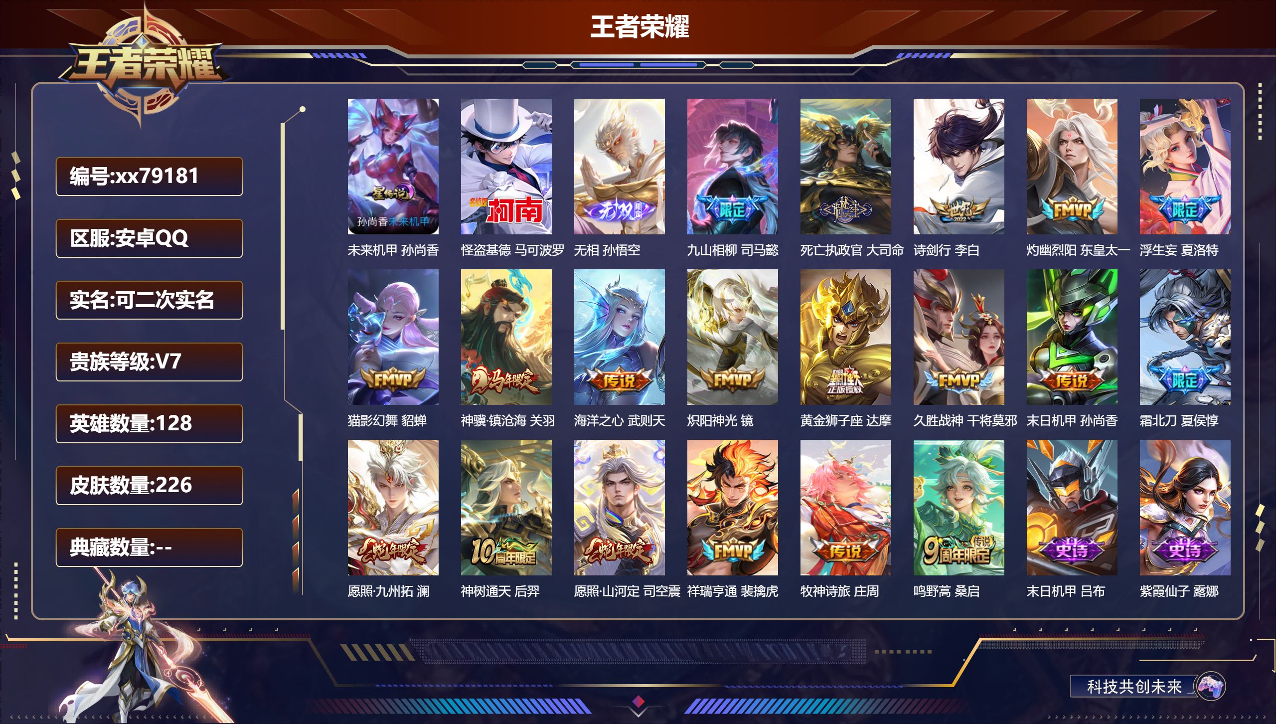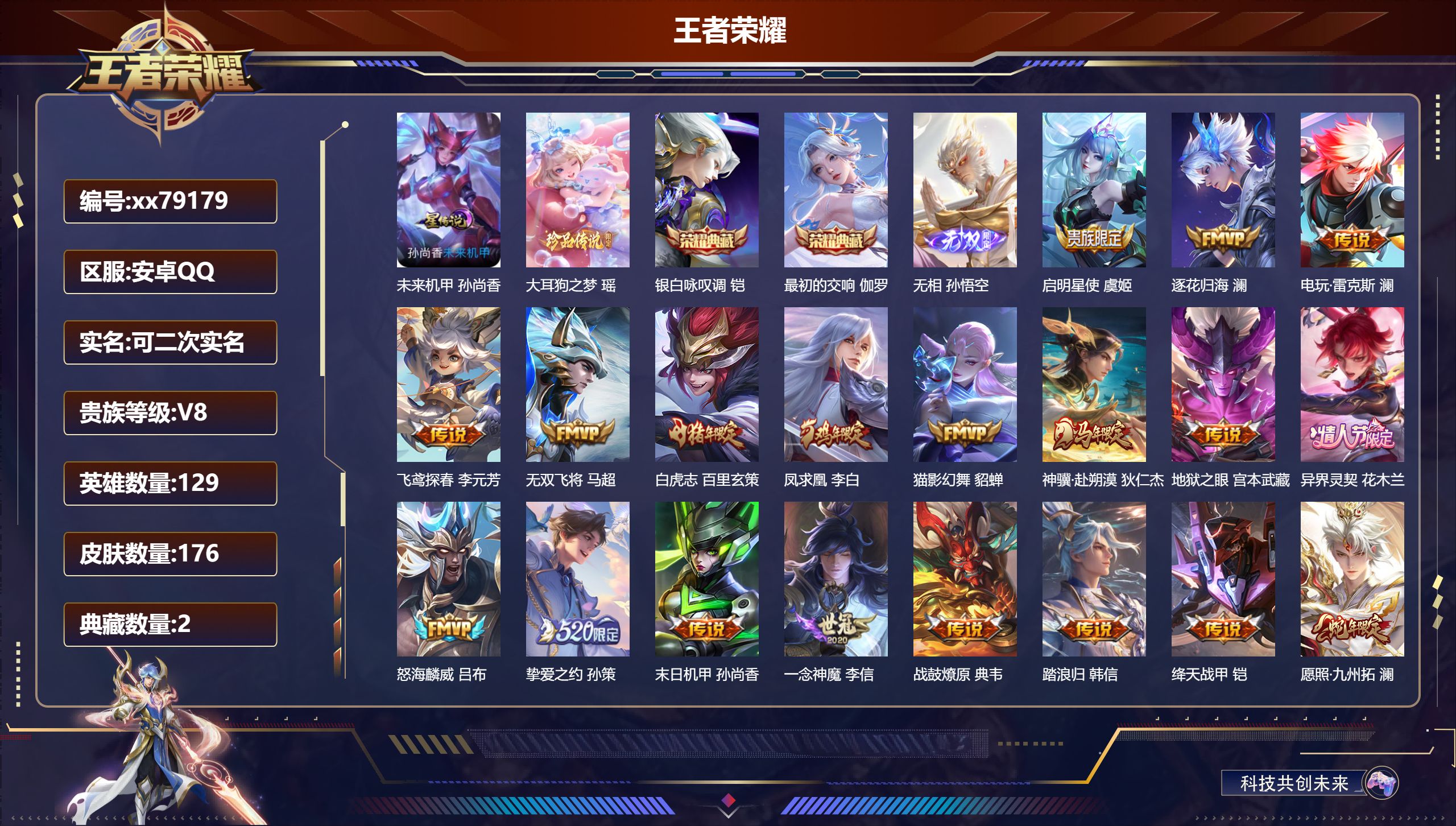 PX_2569319-,可二次,V8,贵族积分53052,安卓QQ/176皮肤/129英雄/2典藏/0珍品无双/1无双/1珍品传说/21传说/52史诗/9稀有英雄,,历史(,省标澜,) 【1,星传说皮肤】,未来机甲,孙尚香, 【1,珍品传说】,大耳狗之梦,瑶, 【2,典藏皮肤】,银白咏叹调,铠,最初的交响,伽罗, 【1,无双皮肤】,无相,孙悟空, 【21,传说皮肤】,启明星使,虞姬,逐花归海,澜,电玩·雷克斯,澜,飞鸢探春,李元芳,无双飞将,马超,白虎志,百里玄策,凤求凰,李白,猫影幻舞,貂蝉,神骥·赴朔漠,狄仁杰,地狱之眼,宫本武藏,异界灵契,花木兰,怒海麟威,吕布,挚爱之约,孙策,末日机甲,孙尚香,一念神魔,李信,战鼓燎原,典韦,踏浪归,韩信,绛天战甲,铠,愿照·九州拓,澜,幻光神枪,云缨,鸣野蒿,桑启, 【52,史诗皮肤】,末日机甲,吕布,暗渊魔法,司马懿,冰霜恋舞曲,干将莫邪,天秀·启明,杨戬,山海·玄木吟,马可波罗,心灵战警,亚瑟,星君·亢金,达摩,无心,元歌,巫礼祀神,少司缘,鬼剑武藏,宫本武藏,无限星赏官,公孙离,线条小狗,周瑜,百晓客,明世隐,摇滚巨星,嬴政,修罗,橘右京,魅力维加斯,妲己,女仆咖啡,妲己,赏金猎手,澜,九幽镇关,项羽,鹰眼统帅,狄仁杰,光弋星穹,莱西奥,春霖将至,上官婉儿,金属风暴,墨子,特工魅影,百里守约,逐浪之夏,李元芳,未来纪元,赵云,引擎之心,赵云,石田雨龙,后羿,鸭鸭历险记,刘禅,魔术师,狄仁杰,龙之律动,狂铁,皇家上将,赵云,冰冠公主,雅典娜,功夫厨神,程咬金,破空之剑,亚连,圣诞狂欢,吕布,浮梦罗烟,海月,器灵·浮梦炉,赵怀真,星界战将,牛魔,地狱岩魂,廉颇,千年之狐,李白,万灵启世,女娲,箭羽风息,伽罗,乱世虎臣,张飞,缤纷独角兽,小乔,线条小狗,小乔,水果甜心,孙尚香,瑰影绮梦,芈月,化蝶舞,阿轲,幽灵船长,曹操,乘风破浪,夏侯惇,暗隐猎兽者,兰陵王, 【82,勇者皮肤】,时空谍影,海诺,缤纷绘卷,张良,拳王,达摩,龙舞盛年,沈梦溪,沉稳之力,孙尚香,汉昭烈帝,刘备,白色死神,白起,黑桃队长,鲁班七号,黄金武士,典韦,阴阳师,狄仁杰,径山谋武,孙权,牛运亨通,牛魔,西部大镖客,牛魔,海滩派对,项羽,无尽征程,廉颇,踏浪烽翎,莱西奥,红桃皇后,芈月,哥特玫瑰,露娜,守护之力,大乔,潮玩探月行,猪八戒,五福同心,张飞,幻乐之宴,鬼谷子,潮玩牛仔,马可波罗,舞狮寰,吕布,救世之瞳,扁鹊,赤刃凌霄,敖隐,死亡骑士,亚瑟,浪漫序章,刘备,玩偶对对碰,安琪拉,掌控之力,诸葛亮,海滩丽影,钟无艳,落日弦歌,高渐离,忍·炎影,赵云,雪境奇遇,西施,逐霄战戟,吕布,苍云破阵,蒙恬,糖果风暴,安琪拉,逐霄之志,曹操,溯影追猎,虞姬,极光幻客,蚩奼,玩趣恶龙,高渐离,兔女郎,花木兰,龙腾万里,关羽,未来纪元,宫本武藏,罗小黑战记,哪吒,往忆晖光,明世隐,荣光之誓,亚瑟,花好人间,甄姬,万象初新,宫本武藏,街头霸王,韩信,紫罗兰之誓,妲己,少女阿狸,妲己,春野闲踪,苏烈,布丁狗之约,阿古朵,命运加冕,露娜,小满鸭,姬小满,幻想奇妙夜,王昭君,灵野札记,张良,潮玩士官长,雅典娜,鸭鸭历险记,沈梦溪,死霸装,白起,虚灵犬护,钟馗,班班快跑,鲁班七号,神迹守卫,孙悟空,罗小黑战记,张良,铁骨偃魂,典韦,苍林狼骑,苍,天穹之誓,姜子牙,谧流熔炉,太乙真人,暗都幽影,大司命,鹤鸣心笺,艾琳,线条小狗,妲己,逆浪荇歌,甄姬,线条小狗,周瑜,线条小狗,桑启,噬灭天穹,东皇太一,灵卦秘语,少司缘,动物派对,亚瑟,敬我三分,盘古,爆裂喵拳,达摩,玫蓝誓约,戈娅,景韶洛都,明世隐, 【19,其他皮肤】,前尘,金蝉,圣殿之光,刘邦,潮流仙人,老夫子,棒球奇才,沈梦溪,龙域领主,铠,第七人偶,干将莫邪,精灵王,后羿,星航指挥官,诸葛亮,启蛰,司空震,隐刃,兰陵王,街头旋风,裴擒虎,激情绿茵,马可波罗,大耳狗之梦,瑶,绝影神枪,百里守约,蔷薇王座,蔡文姬,孤猎,澜,踏雪寻梅,弈星,秩序猎龙将,蒙恬,美梦成真,梦奇, 【9,稀有英雄】,敖隐,嬴政,不知火舞,橘右京,夏洛特,娜可露露,韩信,艾琳,赵云, 营地ID:,