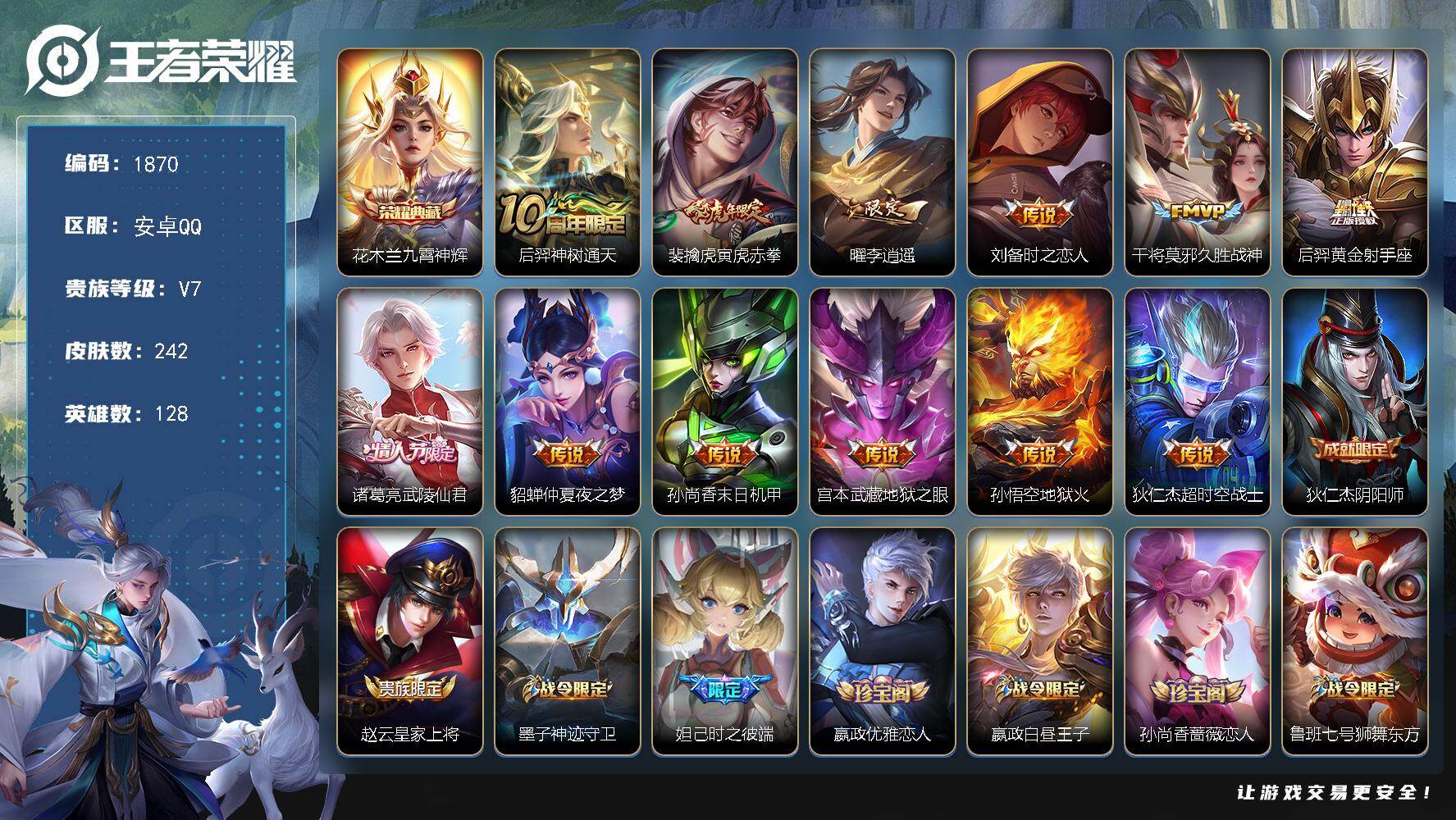 PX_2551829-【242皮1典藏12传说,九霄神辉,寅虎赤拳,李逍遥,金色仲夏夜】安卓Q-V7-永恒钻石III段位-128英雄-242皮肤-1典藏皮肤-12传说-64史诗 【荣耀典藏】:花木兰九霄神辉 【传说皮肤】:后羿神树通天,裴擒虎寅虎赤拳,曜李逍遥,,刘备时之恋人,干将莫邪久胜战神,后羿黄金射手座,诸葛亮武陵仙君,貂蝉仲夏夜之梦,孙尚香末日机甲,宫本武藏地狱之眼,孙悟空地狱火,狄仁杰超时空战士 【限定皮肤】:狄仁杰阴阳师,赵云皇家上将,墨子神迹守卫,妲己时之彼端,嬴政优雅恋人,嬴政白昼王子,孙尚香蔷薇恋人,鲁班七号狮舞东方,高渐离死亡摇滚,阿轲迷踪丽影,钟无艳超时空战士,吕布猎兽之王,吕布御风骁将,周瑜赤莲之焰,元歌云间偶戏,元歌无心,夏侯惇朔风刀,甄姬游园惊梦,甄姬落雪兰心,典韦穷奇,典韦蓝屏警告,马可波罗暗影游猎,狄仁杰魔术师,狄仁杰万华元夜,达摩星际陆战队,达摩沙漠行僧,项羽海滩派对,老夫子醍醐杖,老夫子航海奇遇记,程咬金演武夺筹,刘邦夺宝奇兵,兰陵王驯魔猎人,兰陵王金庭之子,亚瑟潮玩骑士王,牛魔御旌,李元芳云中旅人,钟馗神迹守卫,钟馗驱傩正仪,杨玉环遇见飞天,雅典娜单词大作战,雅典娜黎明之约,太乙真人华丽摇滚,鬼谷子原初探秘者,鬼谷子五谷丰年,诸葛亮武陵仙君,百里玄策原初追逐者,弈星混沌棋,梦奇顽趣,沈梦溪大漠名商,明世隐疑决卦,裴擒虎李小龙,裴擒虎寅虎赤拳,裴擒虎擒涛扼浪,狂铁御狮,米莱狄御霄,米莱狄胡桃异想国,云中君纤云弄巧,盾山御銮,猪八戒西部大镖客,上官婉儿梁祝,曜李逍遥,,蒙犽狂想玩偶喵,桑启海盐诗旅,张良古海寻踪,鬼谷子天穹祈灯 【年限皮肤】:吕布御风骁将,裴擒虎寅虎赤拳 【赛季限定】:典韦穷奇,狂铁御狮,米莱狄御霄,牛魔御旌,盾山御銮,夏侯惇朔风刀,弈星混沌棋,明世隐疑决卦,老夫子醍醐杖,鬼谷子原初探秘者,狄仁杰万华元夜,程咬金演武夺筹,钟馗驱傩正仪,达摩沙漠行僧,兰陵王金庭之子,沈梦溪大漠名商,李元芳云中旅人,桑启海盐诗旅,裴擒虎擒涛扼浪,张良古海寻踪,鬼谷子天穹祈灯,钟馗虚灵犬护,甄姬逆浪荇歌,百里玄策原初追逐者,雅典娜黎明之约,梦奇顽趣 【战令限定】:嬴政白昼王子,吕布猎兽之王,典韦蓝屏警告,鲁班七号狮舞东方,钟馗神迹守卫,兰陵王驯魔猎人,周瑜赤莲之焰,阿轲迷踪丽影,刘邦夺宝奇兵,马可波罗暗影游猎,猪八戒西部大镖客,蒙犽狂想玩偶喵,雅典娜单词大作战,元歌云间偶戏,亚瑟潮玩骑士王,米莱狄胡桃异想国,达摩星际陆战队,老夫子航海奇遇记,墨子神迹守卫,钟无艳超时空战士,甄姬落雪兰心 【史诗皮肤】:女娲万灵启世,公孙离涂山容容,黄忠百相守梦,后羿石田雨龙,扁鹊灵蛊蚀心,狂铁龙之律动,弈星万物之道,梦奇顽趣,元歌无心,鬼谷子五谷丰年,钟无艳超时空战士,澜赏金猎手,雅典娜黎明之约,司马懿暗渊魔法,老夫子航海奇遇记,百里玄策热力回旋,米莱狄胡桃异想国,吕布御风骁将,元歌云间偶戏,云中君纤云弄巧,裴擒虎李小龙,百里玄策原初追逐者,蒙犽狂想玩偶喵,马可波罗暗影游猎,橘右京修罗,阿轲迷踪丽影,不知火舞魅语,妲己时之彼端,娜可露露晚萤,上官婉儿梁祝,兰陵王驯魔猎人,狄仁杰鹰眼统帅,鲁班七号狮舞东方,典韦蓝屏警告,孙策猫狗日记,嬴政白昼王子,杨玉环遇见飞天,阿轲节奏热浪,程咬金功夫厨神,李元芳逐浪之夏,刘禅天才门将,蔡文姬舞动绿茵,百里守约特工魅影,安琪拉心灵骇客,雅典娜冰冠公主,甄姬游园惊梦,诸葛亮黄金分割率,刘邦德古拉伯爵,韩信白龙吟,吕布末日机甲,李白千年之狐,曹操幽灵船长,墨子金属风暴,墨子龙骑士,妲己魅力维加斯,嬴政暗夜贵公子,嬴政优雅恋人,孙尚香水果甜心,孙尚香蔷薇恋人,宫本武藏鬼剑武藏,狄仁杰魔术师,甄姬冰雪圆舞曲,貂蝉圣诞恋歌,赵云皇家上将 【其他皮肤】:兰陵王雾影缉谜,蚩奼极光幻客,艾琳鹤鸣心笺,鬼谷子克喵,莱西奥踏浪烽翎,庄周锦麟游梦,云中君云械蓝图,甄姬逆浪荇歌,白起死霸装,姬小满小满鸭,露娜命运加冕,阿古朵布丁狗之约,钟馗虚灵犬护,姜子牙星梦巡礼,影魅影绮裳,廉颇功夫炙烤,海诺时空谍影,鬼谷子天穹祈灯,后羿完美运算,张良古海寻踪,裴擒虎擒涛扼浪,赵怀真太极少年,猪八戒潮玩探月行,桑启海盐诗旅,李元芳云中旅人,甄姬落雪兰心,沈梦溪大漠名商,兰陵王金庭之子,刘邦虎啸剑宗,程咬金无双福将,达摩沙漠行僧,鲁班大师乓乓大师,墨子神迹守卫,钟馗驱傩正仪,张良缤纷绘卷,程咬金演武夺筹,达摩星际陆战队,露娜瓷语鉴心,杨戬次元傲视,刘禅秘密基地,亚瑟潮玩骑士王,狄仁杰万华元夜,雅典娜单词大作战,鬼谷子原初探秘者,廉颇无尽征程,猪八戒西部大镖客,老夫子醍醐杖,盾山圆桌骑士,刘邦夺宝奇兵,明世隐疑决卦,哪吒次元突破,弈星混沌棋,周瑜赤莲之焰,夏侯惇朔风刀,姜子牙炽热元素使,沈梦溪鲨炮海盗猫,孙膑归虚梦演,盾山御銮,钟馗神迹守卫,吕布野性能量,小乔丁香结,牛魔御旌,庄周奇妙博物学,明世隐虹云星官,吕布猎兽之王,米莱狄御霄,项羽科学大爆炸,大乔守护之力,苏烈坚韧之力,太乙真人华丽摇滚,狂铁御狮,鬼谷子幻乐之宴,李白敏锐之力,诸葛亮掌控之力,典韦穷奇,孙尚香沉稳之力,老夫子功夫老勺,狂铁命运角斗场,钟无艳海滩丽影,关羽龙腾万里,刘备汉昭烈帝,高渐离死亡摇滚,狄仁杰阴阳师,宫本武藏万象初新,刘备万事如意,甄姬花好人间,张飞五福同心,花木兰兔女郎,达摩拳王,亚