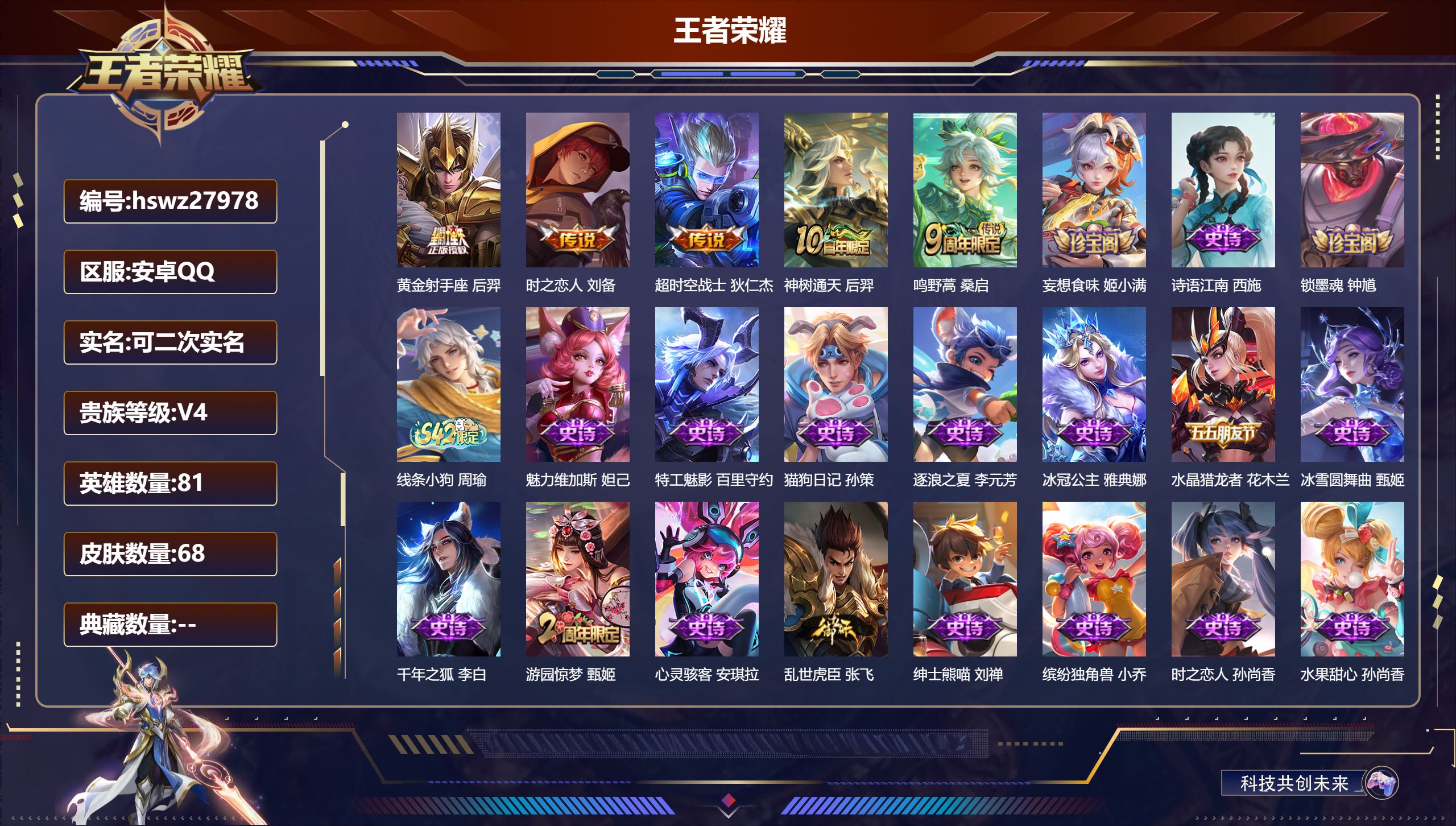 PX_2551824-Q/尊贵铂金/68皮肤/81英雄/0典藏/0珍品无双/0无双/0珍品传说/5传说/21史诗/5稀有英雄 【5,传说皮肤】黄金射手座,后羿,时之恋人,刘备,超时空战士,狄仁杰,神树通天,后羿,鸣野蒿,桑启, 【21,史诗皮肤】妄想食味,姬小满,诗语江南,西施,锁墨魂,钟馗,线条小狗,周瑜,魅力维加斯,妲己,特工魅影,百里守约,猫狗日记,孙策,逐浪之夏,李元芳,冰冠公主,雅典娜,水晶猎龙者,花木兰,冰雪圆舞曲,甄姬,千年之狐,李白,游园惊梦,甄姬,心灵骇客,安琪拉,乱世虎臣,张飞,绅士熊喵,刘禅,缤纷独角兽,小乔,时之恋人,孙尚香,水果甜心,孙尚香,江河有灵,阿古朵,乘风破浪,夏侯惇, 【33,勇者皮肤】爱心护理,阿轲,沙漠行僧,达摩,大漠名商,沈梦溪,纽约教父,刘备,拳王,达摩,古海寻踪,张良,海滩派对,项羽,完美运算,后羿,天穹祈灯,鬼谷子,化身博士,扁鹊,救世之瞳,扁鹊,死亡骑士,亚瑟,玩偶对对碰,安琪拉,雪境奇遇,西施,万事如意,刘备,糖果风暴,安琪拉,兔女郎,花木兰,金庭之子,兰陵王,零食大作战,姬小满,万象初新,宫本武藏,穷奇,典韦,教廷特使,韩信,街头霸王,韩信,云中旅人,李元芳,妄想特派,李元芳,命运角斗场,狂铁,班班快跑,鲁班七号,漠中幻影,嫦娥,白执事,赵云,鹤鸣心笺,艾琳,线条小狗,周瑜,线条小狗,桑启,灵卦秘语,少司缘, 【10,其他皮肤】海之征途,孙策,异域舞娘,貂蝉,街头旋风,裴擒虎,东海龙王,东皇太一,尼罗河女神,女娲,绝影神枪,百里守约,森,瑶,踏雪寻梅,弈星,精灵公主,王昭君,赤焰之缨,云缨, 【5,稀有英雄】橘右京,夏洛特,娜可露露,韩信,赵云, 营地ID:,