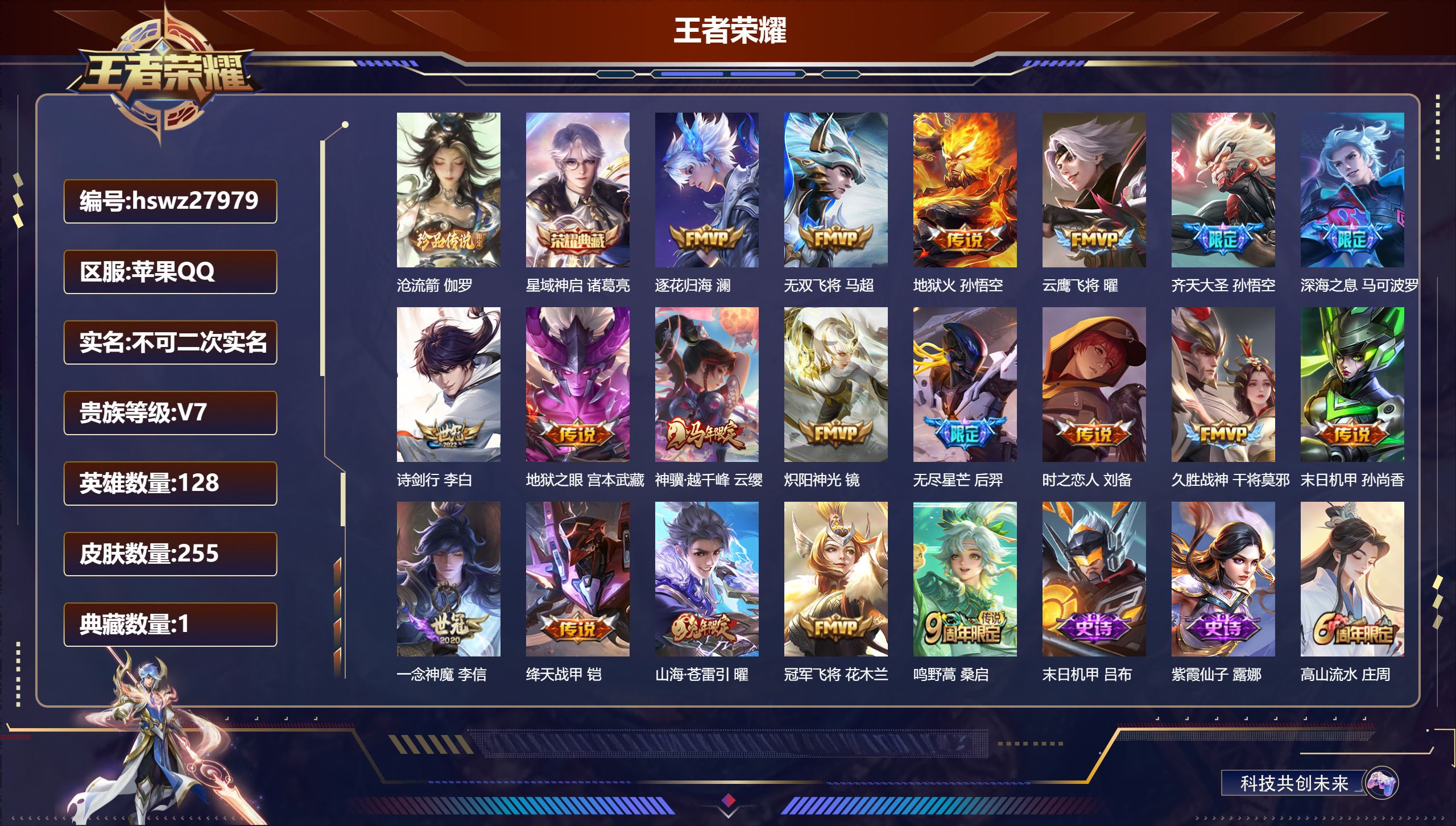 PX_2551830-Q/荣耀王者/255皮肤/128英雄/1典藏/0珍品无双/0无双/1珍品传说/19传说/66史诗/8稀有英雄 【1,珍品传说】沧流箭,伽罗, 【1,典藏皮肤】星域神启,诸葛亮, 【19,传说皮肤】逐花归海,澜,无双飞将,马超,地狱火,孙悟空,云鹰飞将,曜,齐天大圣,孙悟空,深海之息,马可波罗,诗剑行,李白,地狱之眼,宫本武藏,神骥·越千峰,云缨,炽阳神光,镜,无尽星芒,后羿,时之恋人,刘备,久胜战神,干将莫邪,末日机甲,孙尚香,一念神魔,李信,绛天战甲,铠,山海·苍雷引,曜,冠军飞将,花木兰,鸣野蒿,桑启, 【66,史诗皮肤】末日机甲,吕布,紫霞仙子,露娜,高山流水,庄周,天秀·音浪,高渐离,德古拉伯爵,刘邦,五谷丰年,鬼谷子,无心,元歌,巫礼祀神,少司缘,鬼剑武藏,宫本武藏,百相守梦,黄忠,星夜王子,白起,线条小狗,周瑜,摇滚巨星,嬴政,电玩高手,狂铁,顽趣,梦奇,拒霜思,嫦娥,魅力维加斯,妲己,黄金分割率,诸葛亮,偶像歌手,王昭君,荣光圣徽,蒙恬,女仆咖啡,妲己,赏金猎手,澜,九幽镇关,项羽,星界游侠,暃,遇见神鹿,瑶,暗夜贵公子,嬴政,鹰眼统帅,狄仁杰,李小龙,裴擒虎,金属风暴,墨子,傲雪梅枪,韩信,特工魅影,百里守约,猫狗日记,孙策,逐浪之夏,李元芳,未来纪元,赵云,灵蛊蚀心,扁鹊,朱雀志,百里守约,黎明之约,雅典娜,魔术师,狄仁杰,龙之律动,狂铁,皇家上将,赵云,冰冠公主,雅典娜,功夫厨神,程咬金,梁祝,上官婉儿,地狱岩魂,廉颇,蔷薇恋人,孙尚香,冰雪圆舞曲,甄姬,火炮绅士,黄忠,千年之狐,李白,暗夜猫娘,阿轲,超时空战士,钟无艳,曙光守护者,铠,万灵启世,女娲,瑞麟志,花木兰,心灵骇客,安琪拉,乱世虎臣,张飞,百相守梦,周瑜,吟游魔法,明世隐,万物之道,弈星,绅士熊喵,刘禅,线条小狗,小乔,真爱魔法,干将莫邪,水果甜心,孙尚香,江河有灵,阿古朵,幽灵船长,曹操,乘风破浪,夏侯惇,暗隐猎兽者,兰陵王, 【106,勇者皮肤】时空谍影,海诺,玲珑珍味,西施,圆桌骑士,盾山,爱心护理,阿轲,沙漠行僧,达摩,大漠名商,沈梦溪,暖冬絮语,程咬金,纽约教父,刘备,拳王,达摩,龙舞盛年,沈梦溪,丁香结,小乔,功夫炙烤,廉颇,沉稳之力,孙尚香,幻夜卜梦,芈月,海盐诗旅,桑启,幻泉雾影,海月,归虚梦演,孙膑,白色死神,白起,落雪兰心,甄姬,阴阳师,狄仁杰,径山谋武,孙权,次元突破,哪吒,古海寻踪,张良,功夫老勺,老夫子,鲨炮海盗猫,沈梦溪,海滩派对,项羽,完美运算,后羿,万华元夜,狄仁杰,克喵,鬼谷子,踏浪烽翎,莱西奥,演武夺筹,程咬金,红桃皇后,芈月,无双福将,程咬金,百相守梦,影,原初探秘者,鬼谷子,潮玩探月行,猪八戒,天穹祈灯,鬼谷子,化身博士,扁鹊,阿尔法小队,后羿,五福同心,张飞,夜都怪侠,白起,金色潮汐,朵莉亚,幻乐之宴,鬼谷子,东方不败,武则天,虹云星官,明世隐,潮玩牛仔,马可波罗,救世之瞳,扁鹊,赤刃凌霄,敖隐,死亡骑士,亚瑟,敏锐之力,李白,危途狂花,戈娅,破局者,亚连,玩偶对对碰,安琪拉,掌控之力,诸葛亮,海滩丽影,钟无艳,圣弓游侠,后羿,忍·炎影,赵云,雪境奇遇,西施,炽热元素使,姜子牙,唤灵魔甲,刘禅,擒涛扼浪,裴擒虎,苍云破阵,蒙恬,溯影追猎,虞姬,极光幻客,蚩奼,探海日志,鲁班大师,天使之翼,孙膑,雾都夜雨,干将莫邪,兔女郎,花木兰,龙腾万里,关羽,金庭之子,兰陵王,罗小黑战记,哪吒,千军破阵,苏烈,零食大作战,姬小满,荣光之誓,亚瑟,花好人间,甄姬,万象初新,宫本武藏,聚星闪耀,钟无艳,时尚教父,姜子牙,秘密基地,刘禅,教廷特使,韩信,街头霸王,韩信,云中旅人,李元芳,西部大镖客,孙悟空,蔚蓝守将,蒙恬,暖冬·兔眠,嫦娥,命运加冕,露娜,午后时光,王昭君,幻想奇妙夜,王昭君,灵野札记,张良,驱傩正仪,钟馗,命运角斗场,狂铁,特工战影,狂铁,虚灵犬护,钟馗,劲辣红锅,太乙真人,剑破天穹,刘邦,铁骨偃魂,典韦,苍林狼骑,苍,魅影绮裳,影,星梦巡礼,姜子牙,暗都幽影,大司命,鹤鸣心笺,艾琳,云械蓝图,云中君,逆浪荇歌,甄姬,百相守梦,孙策,线条小狗,周瑜,噬灭天穹,东皇太一, 【65,其他皮肤】沧流箭,伽罗,伊势巫女,大乔,金属狂潮,高渐离,前尘,金蝉,圣殿之光,刘邦,芝加哥教父,黄忠,潮流仙人,老夫子,棒球奇才,沈梦溪,极冰防御线,盾山,龙域领主,铠,生化警戒,钟无艳,花见巫女,伽罗,爱与和平,苏烈,第七人偶,干将莫邪,灼热之刃,李信,海之征途,孙策,木偶奇遇记,鲁班七号,福禄兄弟,鲁班七号,精灵王,后羿,绯红之刃,露娜,冰刃幻境,镜,碧珀绯影,暃,海军大将,周瑜,魇语军师,司马懿,午夜歌剧院,元歌,启蛰,司空震,隐刃,兰陵王,霓裳曲,杨玉环,花间舞,公孙离,异域舞娘,貂蝉,街头旋风,裴擒虎,归虚梦演,鲁班大师,修竹墨客,上官婉儿,剑舞者,花木兰,范海辛,李白,维京掠夺者,苍,占星师,明世隐,归虚梦演,蒙犽,激情绿茵,马可波罗,埃及法老,杨戬,阿摩司公爵,鬼谷子,画中游,桑启,年年有余,猪八戒,尼罗河女神,女娲,锦衣卫,狄仁杰,一千零一夜,张良,归虚梦演,曜,威尼斯狂欢,百里玄策,幸存者,马超,战争女神,雅典娜,创世神祝,盘古,特种部队,李元芳,绝影神枪,百里守约,蔷薇王座,蔡文姬,森,瑶,孤猎,澜,加勒比小姐,虞姬,踏雪寻梅,弈星,秩序猎龙将,蒙恬,精准探案法,米莱狄,赤焰之缨,云缨,露花倒影,嫦娥,地府判官,钟馗,天启骑士,关羽,西部大镖客,孙悟空, 【8,稀有英雄】嬴政,不知火舞,橘右京,夏洛特,娜可露露,韩信,艾琳,赵云, 营地ID:,