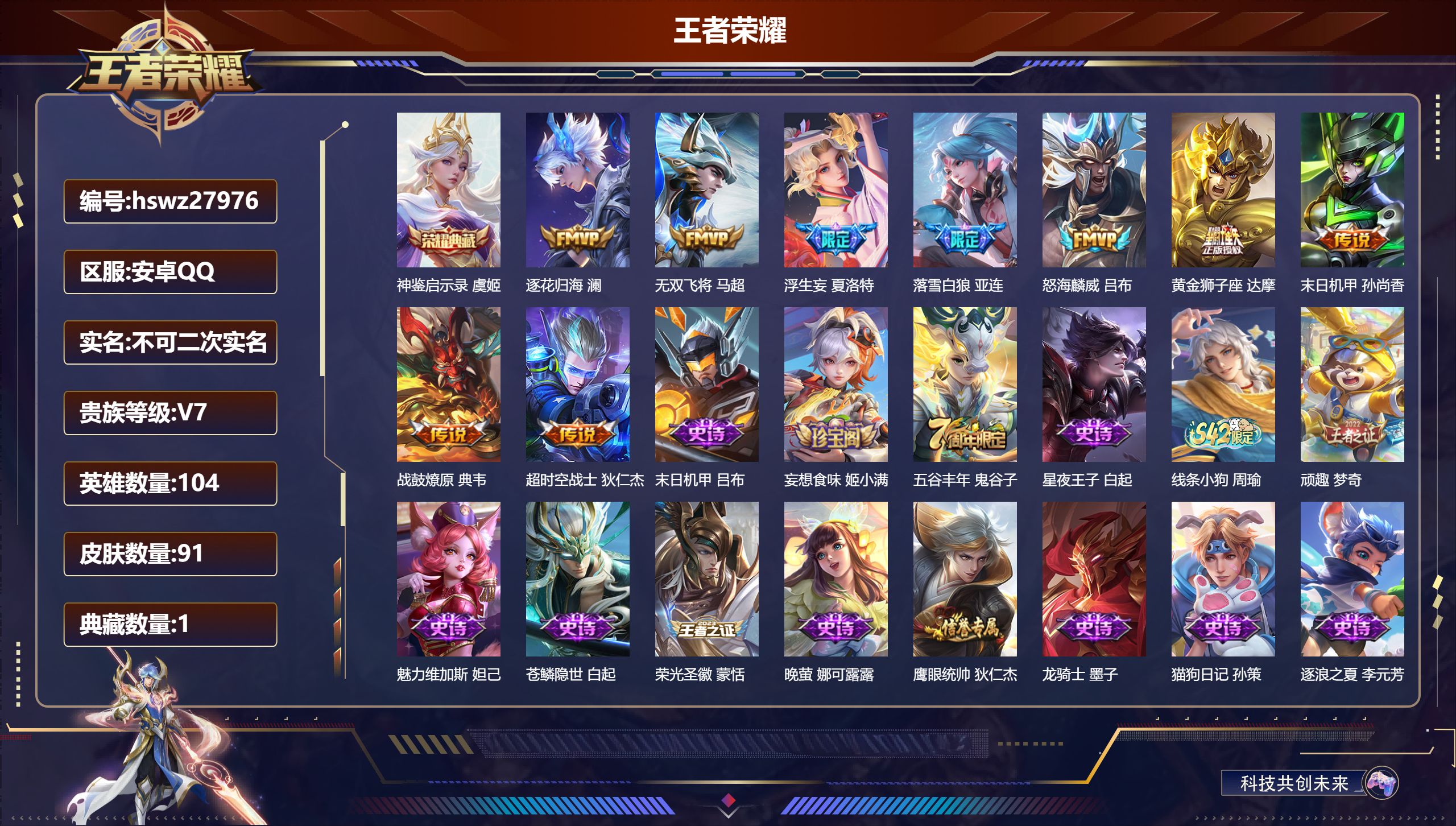 PX_2551807-Q/永恒钻石/91皮肤/104英雄/1典藏/0珍品无双/0无双/0珍品传说/9传说/27史诗/7稀有英雄 【1,典藏皮肤】神鉴启示录,虞姬, 【9,传说皮肤】逐花归海,澜,无双飞将,马超,浮生妄,夏洛特,落雪白狼,亚连,怒海麟威,吕布,黄金狮子座,达摩,末日机甲,孙尚香,战鼓燎原,典韦,超时空战士,狄仁杰, 【27,史诗皮肤】末日机甲,吕布,妄想食味,姬小满,五谷丰年,鬼谷子,星夜王子,白起,线条小狗,周瑜,顽趣,梦奇,魅力维加斯,妲己,苍鳞隐世,白起,荣光圣徽,蒙恬,晚萤,娜可露露,鹰眼统帅,狄仁杰,龙骑士,墨子,猫狗日记,孙策,逐浪之夏,李元芳,魔术师,狄仁杰,热力回旋,百里玄策,龙之律动,狂铁,皇家上将,赵云,功夫厨神,程咬金,水晶猎龙者,花木兰,圣诞老人,老夫子,永昼,夏洛特,千年之狐,李白,曙光守护者,铠,真我赫兹,镜,水果甜心,孙尚香,幽灵船长,曹操, 【41,勇者皮肤】沙漠行僧,达摩,大漠名商,沈梦溪,乐园追猎者,白起,功夫炙烤,廉颇,沉稳之力,孙尚香,海盐诗旅,桑启,汉昭烈帝,刘备,白色死神,白起,阴阳师,狄仁杰,径山谋武,孙权,古海寻踪,张良,功夫老勺,老夫子,海滩派对,项羽,野性能量,吕布,潮玩探月行,猪八戒,天穹祈灯,鬼谷子,化身博士,扁鹊,阿尔法小队,后羿,救世之瞳,扁鹊,死亡骑士,亚瑟,忍·炎影,赵云,擒涛扼浪,裴擒虎,探海日志,鲁班大师,雾都夜雨,干将莫邪,兔女郎,花木兰,龙腾万里,关羽,金庭之子,兰陵王,未来纪元,宫本武藏,零食大作战,姬小满,万象初新,宫本武藏,云中旅人,李元芳,西部大镖客,孙悟空,蔬乡物语,李元芳,蔚蓝守将,蒙恬,幻想奇妙夜,王昭君,命运角斗场,狂铁,死霸装,白起,特工战影,狂铁,班班快跑,鲁班七号,剑破天穹,刘邦,线条小狗,周瑜, 【15,其他皮肤】潮流仙人,老夫子,超能战警,曹操,未来旅行,孙膑,海之征途,孙策,木偶奇遇记,鲁班七号,精灵王,后羿,碧珀绯影,暃,海军大将,周瑜,启蛰,司空震,街头旋风,裴擒虎,幸存者,马超,绝影神枪,百里守约,孤猎,澜,秩序猎龙将,蒙恬,西部大镖客,孙悟空, 【7,稀有英雄】嬴政,不知火舞,橘右京,夏洛特,娜可露露,韩信,赵云, 营地ID:,