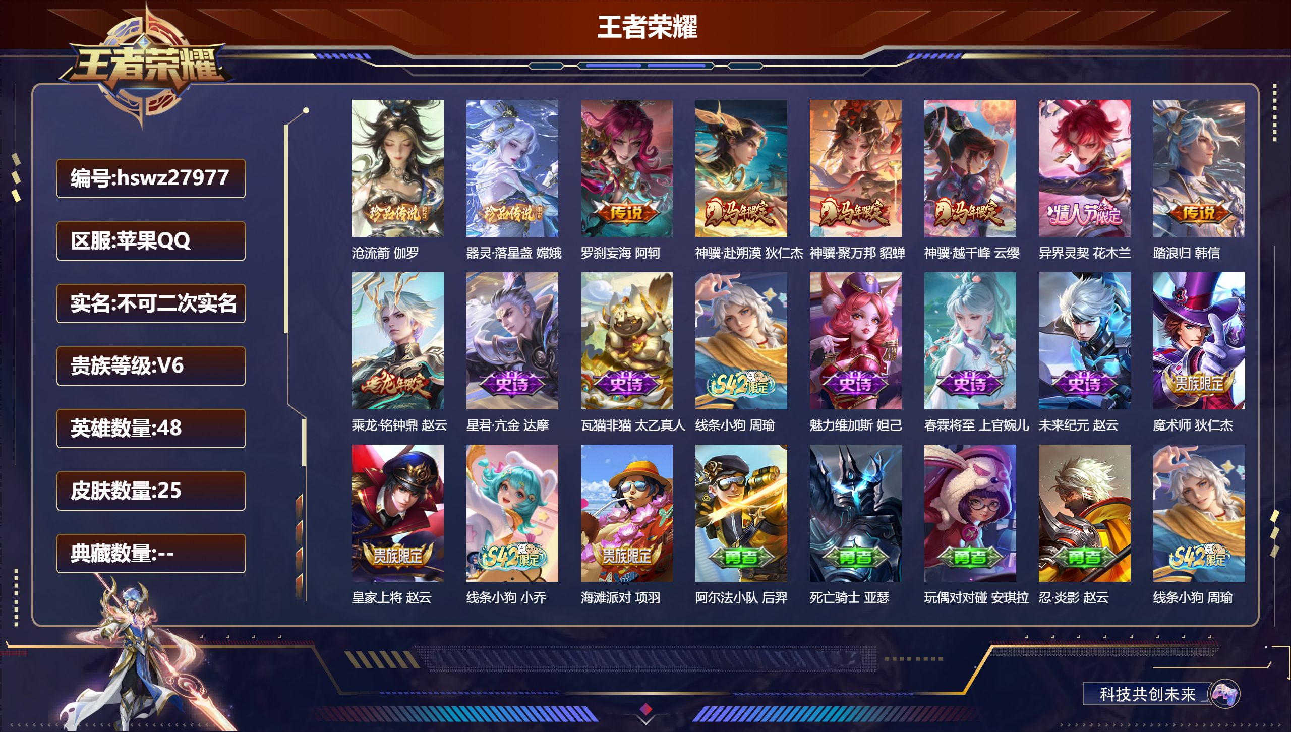 PX_2551817-Q/尊贵铂金/25皮肤/48英雄/0典藏/0珍品无双/0无双/2珍品传说/7传说/9史诗/4稀有英雄 【2,珍品传说】沧流箭,伽罗,器灵·落星盏,嫦娥, 【7,传说皮肤】罗刹妄海,阿轲,神骥·赴朔漠,狄仁杰,神骥·聚万邦,貂蝉,神骥·越千峰,云缨,异界灵契,花木兰,踏浪归,韩信,乘龙·铭钟鼎,赵云, 【9,史诗皮肤】星君·亢金,达摩,瓦猫非猫,太乙真人,线条小狗,周瑜,魅力维加斯,妲己,春霖将至,上官婉儿,未来纪元,赵云,魔术师,狄仁杰,皇家上将,赵云,线条小狗,小乔, 【6,勇者皮肤】海滩派对,项羽,阿尔法小队,后羿,死亡骑士,亚瑟,玩偶对对碰,安琪拉,忍·炎影,赵云,线条小狗,周瑜, 【4,其他皮肤】沧流箭,伽罗,龙域领主,铠,荷鲁斯之眼,云中君,器灵·落星盏,嫦娥, 【4,稀有英雄】不知火舞,橘右京,娜可露露,赵云, 营地ID:,