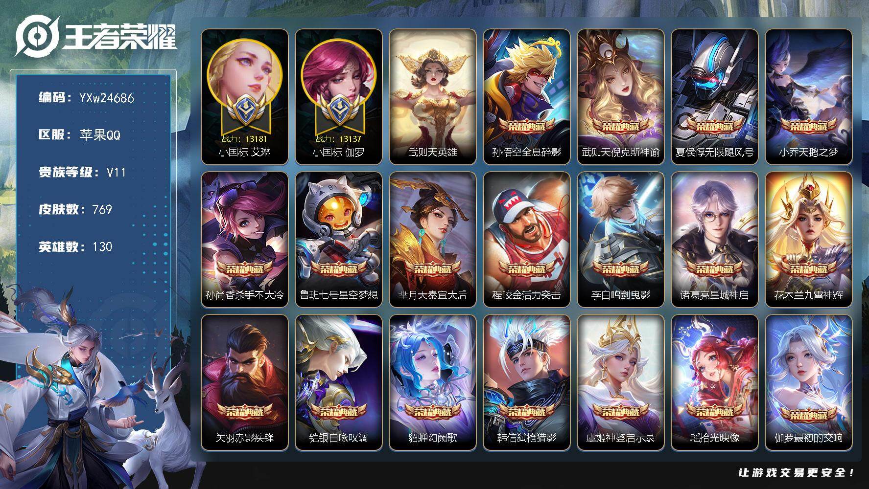 PX_2571218-??之宝·无双V10·15W流光积分·神骥仙使主页·全屏天幕·满典藏·背包多1水晶·满无双·满珍品·馥梦繁花·4水晶小兵·9天幕·小国标伽罗·小国标艾琳·18个星传说·241个按键·无二次包过】YXw24686-苹果Q-130英雄-769皮肤-26王者印记-300铭文-贵族积分80w【无双贵族10】【21典藏·1珍品无双·10珍品·14无双·18星传说·139传说·9天幕·241按键·246个性戳戳】【因赛季更新游戏段付以上号为准!】 【英雄全皮】:廉颇全皮,小乔全皮,赵云全皮,墨子全皮,妲己全皮,鲁班七号全皮,庄周全皮,刘禅全皮,高渐离全皮,阿轲全皮,钟无艳全皮,孙膑全皮,白起全皮,吕布全皮,元歌全皮,夏侯惇全皮,甄姬全皮,曹操全皮,典韦全皮,宫本武藏全皮,李白全皮,马可波罗全皮,达摩全皮,项羽全皮,武则天全皮,司马懿全皮,老夫子全皮,关羽全皮,貂蝉全皮,露娜全皮,姜子牙全皮,韩信全皮,孙权全皮,兰陵王全皮,花木兰全皮,艾琳全皮,不知火舞全皮,朵莉亚全皮,娜可露露全皮,橘右京全皮,亚瑟全皮,孙悟空全皮,牛魔全皮,刘备全皮,张飞全皮,虞姬全皮,杨玉环全皮,苍全皮,女娲全皮,哪吒全皮,干将莫邪全皮,雅典娜全皮,蔡文姬全皮,东皇太一全皮,鬼谷子全皮,诸葛亮全皮,大乔全皮,黄忠全皮,苏烈全皮,百里玄策全皮,百里守约全皮,弈星全皮,梦奇全皮,公孙离全皮,沈梦溪全皮,明世隐全皮,裴擒虎全皮,狂铁全皮,米莱狄全皮,瑶全皮,云中君全皮,李信全皮,伽罗全皮,盾山全皮,孙策全皮,猪八戒全皮,上官婉儿全皮,亚连全皮,嫦娥全皮,大司命全皮,马超全皮,敖隐全皮,海月全皮,曜全皮,西施全皮,鲁班大师全皮,蒙恬全皮,澜全皮,盘古全皮,镜全皮,阿古朵全皮,桑启全皮,夏洛特全皮,司空震全皮,云缨全皮,金蝉全皮,暃全皮,赵怀真全皮,莱西奥全皮,戈娅全皮,空空儿全皮,影全皮,海诺全皮,姬小满全皮,少司缘全皮 【荣耀典藏】:武则天英雄,孙悟空全息碎影,武则天倪克斯神谕,夏侯惇无限飓风号,小乔天鹅之梦,孙尚香杀手不太冷,鲁班七号星空梦想,芈月大秦宣太后,程咬金活力突击,李白鸣剑曳影,诸葛亮星域神启,花木兰九霄神辉,关羽赤影疾锋,铠银白咏叹调,貂蝉幻阙歌,韩信弑枪猎影,虞姬神鉴启示录,瑶拾光映像,伽罗最初的交响,吕布千魇归渊,安琪拉颠倒童话魔镜 【珍品无双】:貂蝉馥梦繁花 【无双皮肤】:李信问心剑,孙悟空无相,铠神罪,诸葛亮天机白泽,曜器灵螭龙剑,甄姬雪境奇遇,公孙离离恨烟,不知火舞花合斗,韩信群星魔术团,小乔时之魔女,李白碎月剑心,瑶真我赫兹,妲己青丘九尾,武则天神器明辉仪 【珍品传说】:伽罗沧流箭,宫本武藏黑崎一护,暃朽木白哉,安琪拉酷洛米之心,瑶大耳狗之梦,张飞兔狲蓬尾,嫦娥器灵落星盏,孙策时之奇旅,鲁班七号江户川柯南,马可波罗怪盗基德 【小国标】:小国标艾琳,小国标伽罗 【星元皮肤】:孙策漫霞共誓,诸葛亮苍灵仙君,王昭君乞巧织春,庄周牧野星辉,西施游龙堇华,鲁班七号寅虎焰心,镜破晓神光,貂蝉幻舞叠翠,虞姬无限倾慕,狄仁杰星际治安官,刘备时之思念,瑶时之愿境,孙悟空零号雷霆,孙尚香未来机甲,武则天幻海之心,孙悟空幽冥火,宫本武藏幽冥之眼,貂蝉金色仲夏夜 【小兵皮肤】:小兵线条小狗,小兵雪境奇遇,小兵赞萌露比,小兵马上有钱 【天幕】:雪境奇遇天幕,天骥开鸿天幕,箭叩九天天幕,黑崎一护天幕,墨染江湖天幕,春韵弦音天幕,无尽之约天幕,鸿兔大展天幕,秋月华灯天幕 【传说皮肤】:阿轲罗刹妄海,韩信踏浪归,云缨神骥越千峰,关羽神骥镇沧海,朵莉亚神骥鸣幻洲,狄仁杰神骥赴朔漠,貂蝉神骥聚万邦,马超神骥逐星野,李元芳星君娄金,花木兰异界灵契,王昭君长夜焕生,杨戬纵目迁山,后羿神树通天,曹操万灵伏威,干将莫邪千山共赴,元歌诡秘之主,大司命死亡执政官,司马懿九山相柳,公孙离云诺千山,西施续相思,杨玉环星之鸣奏,后羿千劫归真,司空震愿照山河定,女娲愿照千秋盛,妲己愿照众生和,澜愿照九州拓,蔡文姬愿照福禄聚,虞姬愿照岁时盈,云缨幻光神枪,裴擒虎祥瑞亨通,嬴政玄雷天君,王昭君映山客,桑启鸣野蒿,庄周牧神诗旅,夏侯惇霜北刀,朵莉亚心动手记,云中君群星魔术团,墨子黄金天蝎座,海月金乌负日,亚连落雪白狼,吕布曦玄引,貂蝉曦玄引,典韦战鼓燎原,孙尚香乘龙问璇玑,孙策乘龙淬吴钩,赵云乘龙铭钟鼎,马超琥珀纪元,铠琥珀纪元,澜逐花归海,艾琳觅芳踪,露娜霜月吟,孙膑小动物乐团,甄姬至美化雀舞,大乔时之奇旅,鲁班七号时之奇旅,兰陵王影龙天霄,吕布遇见神鼓,宫本武藏惊梅引,云缨鹤归松栖,上官婉儿妄想奇谈,马可波罗妄想实况,东皇太一灼幽烈阳,诸葛亮鹤羽星尊,澜电玩雷克斯,亚瑟追逃游戏,安琪拉追逃游戏,张飞百相守梦,公孙离记忆之芯,夏洛特浮生妄,干将莫邪画中仙,花木兰燃星之曲,虞姬无限倾心,项羽无限倾心,伽罗炽翼辉光,孙悟空齐天大圣,小乔山海琳琅生,曜山海苍雷引,李信山海炽霜斩,吕布怒海麟威,李白诗剑行,狄仁杰神器狴犴令,不知火舞绯月行,王昭君星穹之声,百里守约碎云,橘右京枫霜尽,娜可露露前尘镜,孙尚香音你闪耀,马可波罗深海之息,后羿无尽星芒,马超无双飞将,大乔挚爱花嫁,孙策挚爱之约,露娜启示之音,蔡文姬花朝如约,女娲补天,孙策末日机甲,瑶时之祈愿,裴擒虎寅虎赤拳,鲁班七号寅虎瑞焰,孙尚香异界灵契,貂蝉遇见胡旋,赵云淬星耀世,王昭君乞巧织情,西施游龙清影,曜李逍遥,,周瑜音你心动,小乔音你心动,李元芳飞鸢