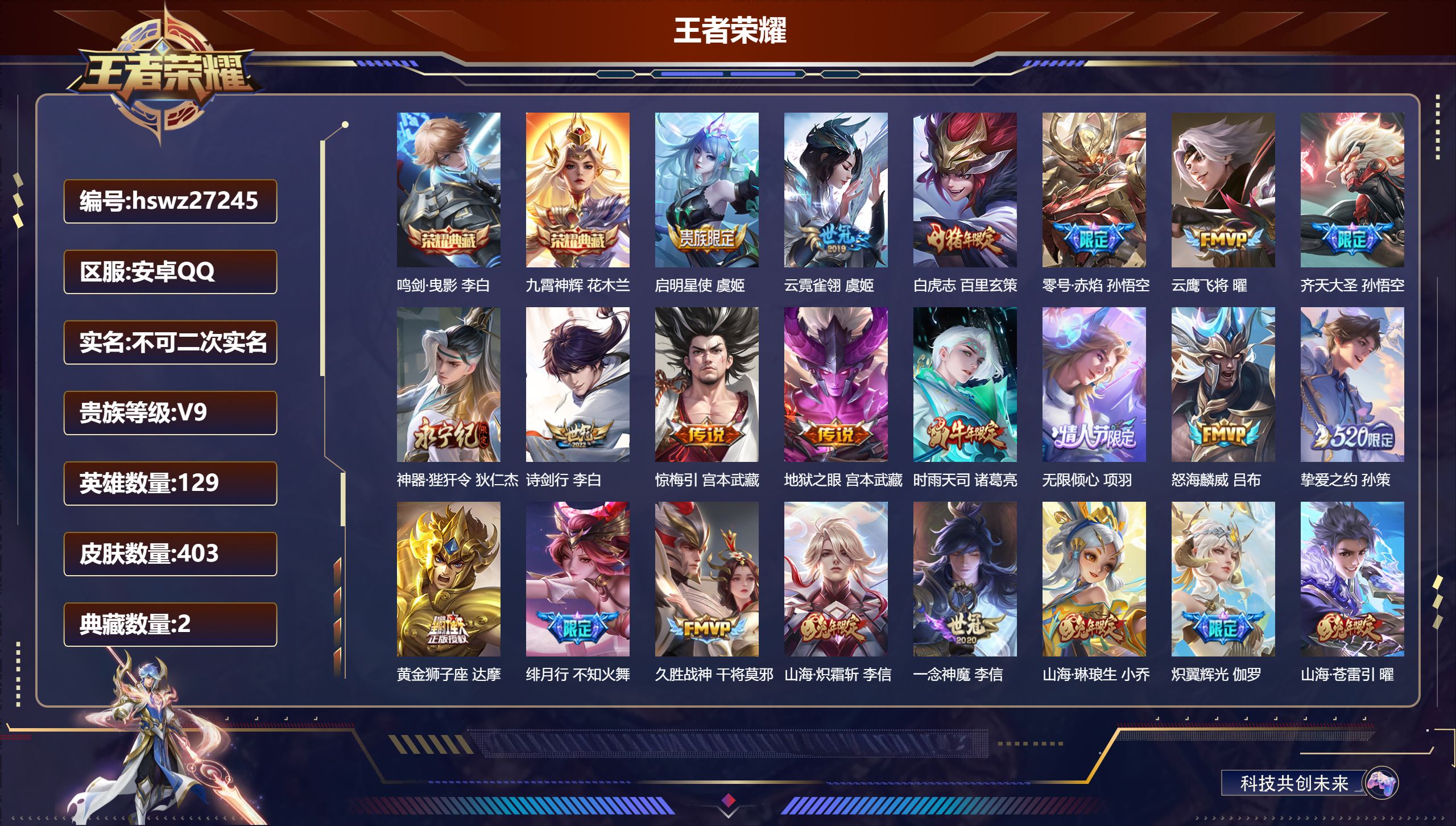 PX_2543088-Q/至尊星耀/288皮肤/127英雄/2典藏/0珍品无双/0无双/0珍品传说/15传说/76史诗/8稀有英雄 【2,典藏皮肤】全息碎影,孙悟空,弑枪猎影,韩信, 【15,传说皮肤】逐花归海,澜,白虎志,百里玄策,诗剑行,李白,浮生妄,夏洛特,猫影幻舞,貂蝉,地狱之眼,宫本武藏,音你心动,周瑜,黄金狮子座,达摩,一念神魔,李信,寅虎·赤拳,裴擒虎,超时空战士,狄仁杰,神树通天,后羿,愿照·岁时盈,虞姬,鸣野蒿,桑启,云诺千山,公孙离, 【76,史诗皮肤】末日机甲,吕布,紫霞仙子,露娜,百解令,蒙犽,高山流水,庄周,苍穹之光,项羽,天秀·启明,杨戬,德古拉伯爵,刘邦,山海·玄木吟,马可波罗,五谷丰年,鬼谷子,无心,元歌,鬼剑武藏,宫本武藏,百相守梦,黄忠,星夜王子,白起,地狱燃心,司空震,线条小狗,周瑜,摇滚巨星,嬴政,电玩高手,狂铁,顽趣,梦奇,修罗,橘右京,拒霜思,嫦娥,魅力维加斯,妲己,黄金分割率,诸葛亮,乐园奇幻夜,钟馗,偶像歌手,王昭君,女仆咖啡,妲己,九幽镇关,项羽,星界游侠,暃,舞动绿茵,蔡文姬,繁星吟游,蔡文姬,暗夜贵公子,嬴政,鹰眼统帅,狄仁杰,大圣娶亲,孙悟空,李小龙,裴擒虎,纤云弄巧,云中君,金属风暴,墨子,特工魅影,百里守约,猫狗日记,孙策,逐浪之夏,李元芳,未来纪元,赵云,黎明之约,雅典娜,鸭鸭历险记,刘禅,魔术师,狄仁杰,龙之律动,狂铁,神威,马超,皇家上将,赵云,冰冠公主,雅典娜,功夫厨神,程咬金,梁祝,上官婉儿,圣诞恋歌,貂蝉,云间偶戏,元歌,水晶猎龙者,花木兰,神器·万象笔,上官婉儿,青焰无极,镜,魅语,不知火舞,器灵·浮梦炉,赵怀真,岱宗,典韦,永昼,夏洛特,地狱岩魂,廉颇,茶境仙,孙膑,冰雪圆舞曲,甄姬,航海奇遇记,老夫子,节奏热浪,阿轲,超时空战士,钟无艳,曙光守护者,铠,青龙志,铠,心灵骇客,安琪拉,乱世虎臣,张飞,万物之道,弈星,绅士熊喵,刘禅,缤纷独角兽,小乔,水果甜心,孙尚香,化蝶舞,阿轲,江河有灵,阿古朵,幽灵船长,曹操,乘风破浪,夏侯惇,暗隐猎兽者,兰陵王, 【141,勇者皮肤】胡桃夹子,干将莫邪,圆桌骑士,盾山,爱心护理,阿轲,太极少年,赵怀真,沙漠行僧,达摩,大漠名商,沈梦溪,缤纷绘卷,张良,拳王,达摩,大发明家,达摩,龙舞盛年,沈梦溪,乐园追猎者,白起,丁香结,小乔,功夫炙烤,廉颇,沉稳之力,孙尚香,海盐诗旅,桑启,幻泉雾影,海月,朔风刀,夏侯惇,醍醐杖,老夫子,归虚梦演,孙膑,汉昭烈帝,刘备,白色死神,白起,黑桃队长,鲁班七号,黄金武士,典韦,王牌新星,海月,落雪兰心,甄姬,阴阳师,狄仁杰,径山谋武,孙权,次元突破,哪吒,古海寻踪,张良,功夫老勺,老夫子,西部大镖客,牛魔,鲨炮海盗猫,沈梦溪,海滩派对,项羽,完美运算,后羿,万华元夜,狄仁杰,克喵,鬼谷子,踏浪烽翎,莱西奥,演武夺筹,程咬金,红桃皇后,芈月,奇妙博物学,庄周,西部游侠,莱西奥,野性能量,吕布,哥特玫瑰,露娜,无双福将,程咬金,原初探秘者,鬼谷子,潮玩探月行,猪八戒,鸿运当头,亚瑟,天穹祈灯,鬼谷子,决胜大满贯,曹操,疑决卦,明世隐,潮玩骑士王,亚瑟,五福同心,张飞,次元傲视,杨戬,幻乐之宴,鬼谷子,东方不败,武则天,霸王丸,宫本武藏,虹云星官,明世隐,雾影缉谜,兰陵王,潮玩牛仔,马可波罗,救世之瞳,扁鹊,死亡骑士,亚瑟,浪漫序章,刘备,敏锐之力,李白,胡桃狂想曲,蒙犽,破局者,亚连,玩偶对对碰,安琪拉,掌控之力,诸葛亮,海滩丽影,钟无艳,忍·炎影,赵云,雪境奇遇,西施,炽热元素使,姜子牙,坚韧之力,苏烈,万事如意,刘备,擒涛扼浪,裴擒虎,乓乓大师,鲁班大师,溯影追猎,虞姬,极光幻客,蚩奼,探海日志,鲁班大师,女武神,艾琳,玩趣恶龙,高渐离,兔女郎,花木兰,龙腾万里,关羽,流音漫舞,艾琳,金庭之子,兰陵王,未来纪元,宫本武藏,罗小黑战记,哪吒,千军破阵,苏烈,荣光之誓,亚瑟,花好人间,甄姬,万象初新,宫本武藏,聚星闪耀,钟无艳,潮玩造梦师,刘备,御銮,盾山,时尚教父,姜子牙,秘密基地,刘禅,教廷特使,韩信,街头霸王,韩信,云中旅人,李元芳,妄想特派,李元芳,西部大镖客,孙悟空,神迹守卫,墨子,少女阿狸,妲己,灵卜魔法,妲己,混沌棋,弈星,御霄,米莱狄,秘证寻踪,小乔,春野闲踪,苏烈,布丁狗之约,阿古朵,暖冬·兔眠,嫦娥,命运加冕,露娜,午后时光,王昭君,小满鸭,姬小满,灵野札记,张良,驱傩正仪,钟馗,潮玩士官长,雅典娜,鸭鸭历险记,沈梦溪,命运角斗场,狂铁,死霸装,白起,特工战影,狂铁,虚灵犬护,钟馗,劲辣红锅,太乙真人,罗小黑战记,张良,剑破天穹,刘邦,青衿临川,桑启,苍威无极,项羽,熔金海岸,周瑜,天穹之誓,姜子牙,访茗客,马超,星梦巡礼,姜子牙,谧流熔炉,太乙真人,金福满堂,东皇太一,鹤鸣心笺,艾琳,锦麟游梦,庄周,云械蓝图,云中君,逆浪荇歌,甄姬,线条小狗,周瑜,噬灭天穹,东皇太一,灵卦秘语,少司缘,爆裂喵拳,达摩,玫蓝誓约,戈娅,景韶洛都,明世隐, 【56,其他皮肤】伊势巫女,大乔,金属狂潮,高渐离,前尘,金蝉,战争骑士,夏侯惇,圣殿之光,刘邦,芝加哥教父,黄忠,潮流仙人,老夫子,龙域领主,铠,生化警戒,钟无艳,超能战警,曹操,花见巫女,伽罗,第七人偶,干将莫邪,灼热之刃,李信,熊喵少女,阿古朵,福禄兄弟,鲁班七号,精灵王,后羿,绯红之刃,露娜,冰刃幻境,镜,碧珀绯影,暃,魇语军师,司马懿,午夜歌剧院,元歌,启蛰,司空震,隐刃,兰陵王,霓裳曲,杨玉环,花间舞,公孙离,街头旋风,裴擒虎,剑舞者,花木兰,维京掠夺者,苍,占星师,明世隐,激情绿茵,马可波罗,埃及法老,杨戬,归虚梦演,西施,阿摩司公爵,鬼谷子,画中游,桑启,尼罗河女神,女娲,锦衣卫,狄仁杰,归虚梦演,曜,威