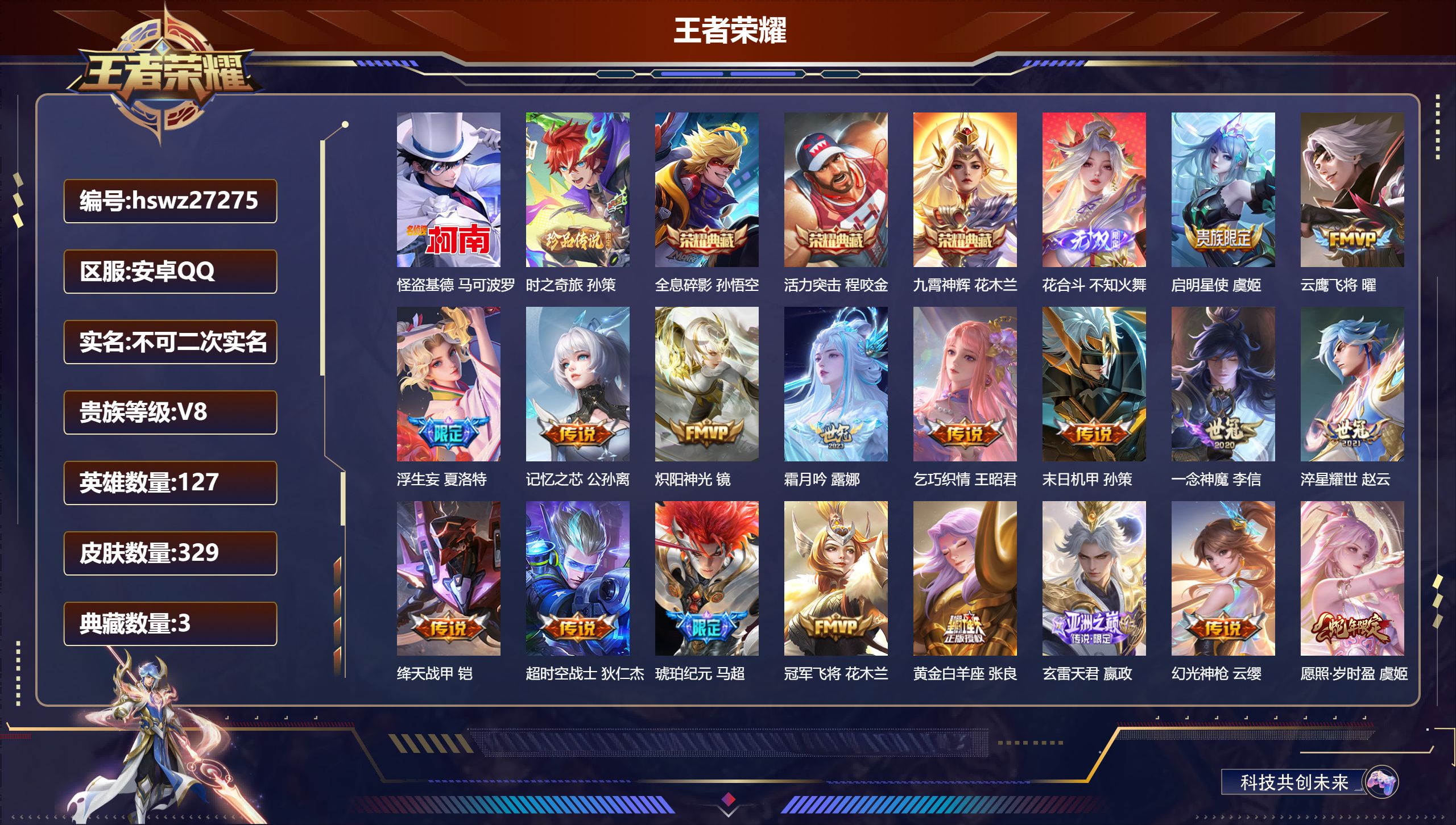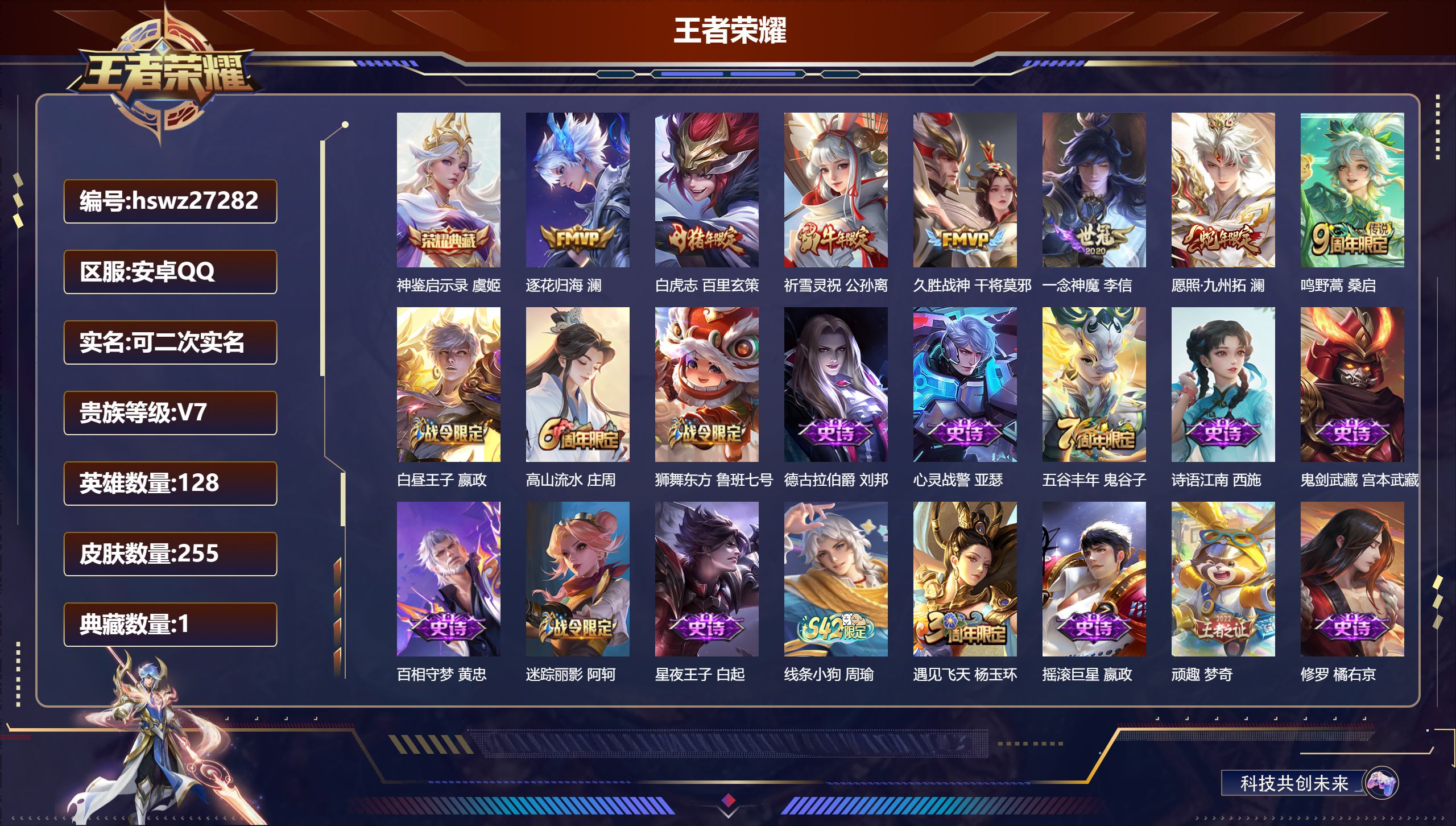 PX_2537658-Q/至尊星耀/255皮肤/128英雄/1典藏/0珍品无双/0无双/0珍品传说/7传说/75史诗/9稀有英雄 【1,典藏皮肤】神鉴启示录,虞姬, 【7,传说皮肤】逐花归海,澜,白虎志,百里玄策,祈雪灵祝,公孙离,久胜战神,干将莫邪,一念神魔,李信,愿照·九州拓,澜,鸣野蒿,桑启, 【75,史诗皮肤】白昼王子,嬴政,高山流水,庄周,狮舞东方,鲁班七号,德古拉伯爵,刘邦,心灵战警,亚瑟,五谷丰年,鬼谷子,诗语江南,西施,鬼剑武藏,宫本武藏,百相守梦,黄忠,迷踪丽影,阿轲,星夜王子,白起,线条小狗,周瑜,遇见飞天,杨玉环,摇滚巨星,嬴政,顽趣,梦奇,修罗,橘右京,魅力维加斯,妲己,黄金分割率,诸葛亮,霸王别姬,虞姬,荣光圣徽,蒙恬,女仆咖啡,妲己,星界游侠,暃,晚萤,娜可露露,舞动绿茵,蔡文姬,繁星吟游,蔡文姬,暗夜贵公子,嬴政,鹰眼统帅,狄仁杰,白晶晶,芈月,大圣娶亲,孙悟空,末日机甲,莱西奥,李小龙,裴擒虎,龙骑士,墨子,金属风暴,墨子,特工魅影,百里守约,原初追逐者,百里玄策,逐浪之夏,李元芳,未来纪元,赵云,朱雀志,百里守约,黎明之约,雅典娜,魔术师,狄仁杰,热力回旋,百里玄策,神威,马超,皇家上将,赵云,冰冠公主,雅典娜,梁祝,上官婉儿,云间偶戏,元歌,水晶猎龙者,花木兰,圣诞狂欢,吕布,魅语,不知火舞,罗小黑战记,百里玄策,白龙吟,韩信,星界战将,牛魔,地狱岩魂,廉颇,蔷薇恋人,孙尚香,冰雪圆舞曲,甄姬,千年之狐,李白,节奏热浪,阿轲,暗夜猫娘,阿轲,游园惊梦,甄姬,曙光守护者,铠,万灵启世,女娲,心灵骇客,安琪拉,箭羽风息,伽罗,乱世虎臣,张飞,万物之道,弈星,王者之锤,钟无艳,绅士熊喵,刘禅,缤纷独角兽,小乔,真爱魔法,干将莫邪,水果甜心,孙尚香,狂想玩偶喵,蒙犽,江河有灵,阿古朵,幽灵船长,曹操,乘风破浪,夏侯惇,暗隐猎兽者,兰陵王, 【109,勇者皮肤】圆桌骑士,盾山,烛龙,曹操,爱心护理,阿轲,沙漠行僧,达摩,大漠名商,沈梦溪,缤纷绘卷,张良,纽约教父,刘备,大发明家,达摩,丁香结,小乔,功夫炙烤,廉颇,海盐诗旅,桑启,朔风刀,夏侯惇,醍醐杖,老夫子,汉昭烈帝,刘备,白色死神,白起,黄金武士,典韦,夺宝奇兵,刘邦,御旌,牛魔,阴阳师,狄仁杰,次元突破,哪吒,古海寻踪,张良,功夫老勺,老夫子,西部大镖客,牛魔,鲨炮海盗猫,沈梦溪,海滩派对,项羽,万华元夜,狄仁杰,克喵,鬼谷子,踏浪烽翎,莱西奥,演武夺筹,程咬金,西部游侠,莱西奥,猎兽之王,吕布,哥特玫瑰,露娜,守护之力,大乔,无双福将,程咬金,百相守梦,影,原初探秘者,鬼谷子,潮玩探月行,猪八戒,天穹祈灯,鬼谷子,疑决卦,明世隐,化身博士,扁鹊,潮玩骑士王,亚瑟,阿尔法小队,后羿,五福同心,张飞,幻乐之宴,鬼谷子,霸王丸,宫本武藏,虹云星官,明世隐,雾影缉谜,兰陵王,救世之瞳,扁鹊,赤刃凌霄,敖隐,死亡骑士,亚瑟,危途狂花,戈娅,掌控之力,诸葛亮,海滩丽影,钟无艳,圣弓游侠,后羿,忍·炎影,赵云,狰,白起,雪境奇遇,西施,坚韧之力,苏烈,万事如意,刘备,擒涛扼浪,裴擒虎,乓乓大师,鲁班大师,探海日志,鲁班大师,女武神,艾琳,天使之翼,孙膑,玩趣恶龙,高渐离,兔女郎,花木兰,龙腾万里,关羽,金庭之子,兰陵王,未来纪元,宫本武藏,千军破阵,苏烈,荣光之誓,亚瑟,花好人间,甄姬,万象初新,宫本武藏,聚星闪耀,钟无艳,御銮,盾山,单词大作战,雅典娜,时尚教父,姜子牙,秘密基地,刘禅,教廷特使,韩信,街头霸王,韩信,云中旅人,李元芳,妄想特派,李元芳,少女阿狸,妲己,混沌棋,弈星,御霄,米莱狄,蔚蓝守将,蒙恬,暖冬·兔眠,嫦娥,幻想奇妙夜,王昭君,驱傩正仪,钟馗,神迹守卫,钟馗,命运角斗场,狂铁,特工战影,狂铁,御狮,狂铁,白执事,赵云,劲辣红锅,太乙真人,苍林狼骑,苍,天穹之誓,姜子牙,魅影绮裳,影,星梦巡礼,姜子牙,谧流熔炉,太乙真人,暗都幽影,大司命,鹤鸣心笺,艾琳,云械蓝图,云中君,逆浪荇歌,甄姬,线条小狗,周瑜,噬灭天穹,东皇太一,敬我三分,盘古,玫蓝誓约,戈娅,景韶洛都,明世隐, 【64,其他皮肤】伊势巫女,大乔,前尘,金蝉,圣殿之光,刘邦,芝加哥教父,黄忠,潮流仙人,老夫子,三太子,哪吒,棒球奇才,沈梦溪,龙域领主,铠,生化警戒,钟无艳,死神来了,曹操,超能战警,曹操,花见巫女,伽罗,第七人偶,干将莫邪,灼热之刃,李信,熊喵少女,阿古朵,海之征途,孙策,木偶奇遇记,鲁班七号,福禄兄弟,鲁班七号,帝国元帅,项羽,精灵王,后羿,冰刃幻境,镜,碧珀绯影,暃,海军大将,周瑜,星航指挥官,诸葛亮,魇语军师,司马懿,午夜歌剧院,元歌,启蛰,司空震,隐刃,兰陵王,霓裳曲,杨玉环,异域舞娘,貂蝉,街头旋风,裴擒虎,归虚梦演,鲁班大师,东海龙王,东皇太一,修竹墨客,上官婉儿,维京掠夺者,苍,占星师,明世隐,激情绿茵,马可波罗,埃及法老,杨戬,归虚梦演,西施,阿摩司公爵,鬼谷子,画中游,桑启,年年有余,猪八戒,尼罗河女神,女娲,锦衣卫,狄仁杰,一千零一夜,张良,归虚梦演,曜,威尼斯狂欢,百里玄策,幸存者,马超,战争女神,雅典娜,荷鲁斯之眼,云中君,创世神祝,盘古,特种部队,李元芳,绝影神枪,百里守约,蔷薇王座,蔡文姬,森,瑶,孤猎,澜,加勒比小姐,虞姬,踏雪寻梅,弈星,秩序猎龙将,蒙恬,赤焰之缨,云缨,露花倒影,嫦娥,地府判官,钟馗,美梦成真,梦奇,圆桌骑士,太乙真人, 【9,稀有英雄】敖隐,嬴政,不知火舞,橘右京,夏洛特,娜可露露,韩信,艾琳,赵云, 营地ID:,