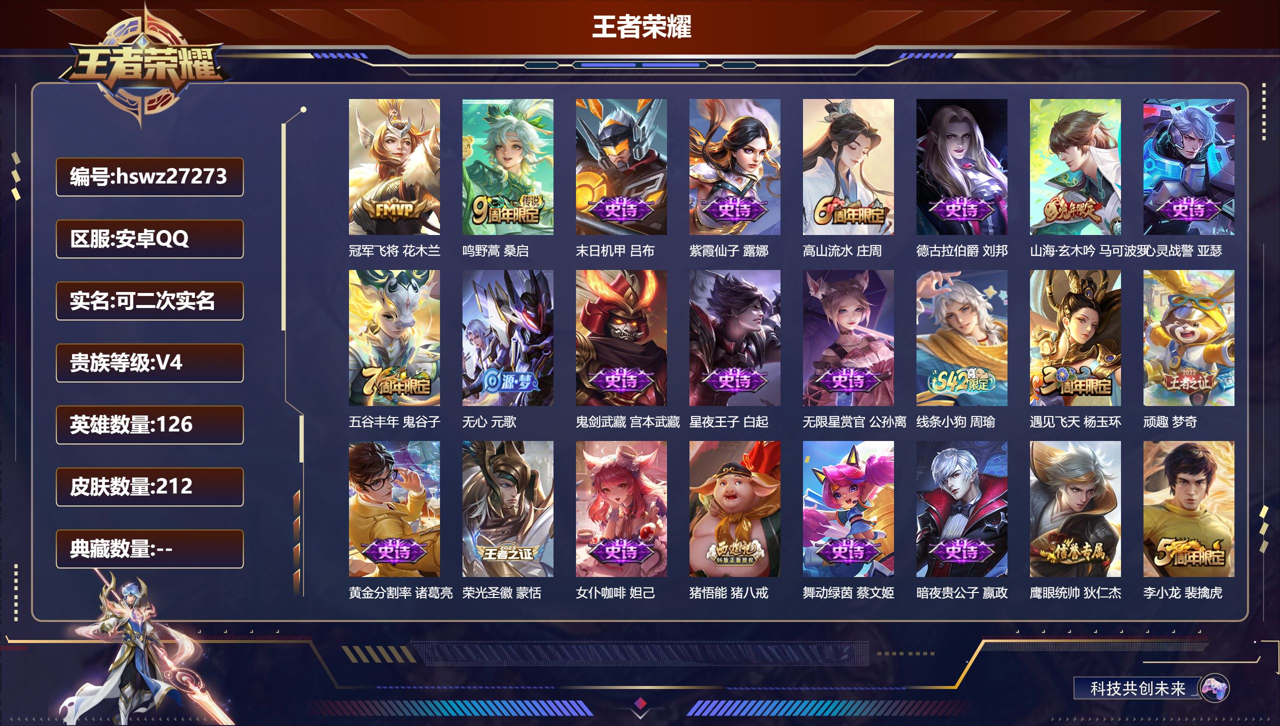 PX_2537554-Q/尊贵铂金/212皮肤/126英雄/0典藏/0珍品无双/0无双/0珍品传说/2传说/52史诗/7稀有英雄 【2,传说皮肤】冠军飞将,花木兰,鸣野蒿,桑启, 【52,史诗皮肤】末日机甲,吕布,紫霞仙子,露娜,高山流水,庄周,德古拉伯爵,刘邦,山海·玄木吟,马可波罗,心灵战警,亚瑟,五谷丰年,鬼谷子,无心,元歌,鬼剑武藏,宫本武藏,星夜王子,白起,无限星赏官,公孙离,线条小狗,周瑜,遇见飞天,杨玉环,顽趣,梦奇,黄金分割率,诸葛亮,荣光圣徽,蒙恬,女仆咖啡,妲己,猪悟能,猪八戒,舞动绿茵,蔡文姬,暗夜贵公子,嬴政,鹰眼统帅,狄仁杰,李小龙,裴擒虎,纤云弄巧,云中君,金属风暴,墨子,特工魅影,百里守约,原初追逐者,百里玄策,逐浪之夏,李元芳,未来纪元,赵云,黎明之约,雅典娜,龙之律动,狂铁,顽岩魄,蒙犽,辉光之辰,后羿,功夫厨神,程咬金,梁祝,上官婉儿,电玩·爆裂旋风,刘禅,圣诞恋歌,貂蝉,水晶猎龙者,花木兰,涂山容容,公孙离,魅语,不知火舞,星界战将,牛魔,地狱岩魂,廉颇,蔷薇恋人,孙尚香,冰雪圆舞曲,甄姬,航海奇遇记,老夫子,节奏热浪,阿轲,曙光守护者,铠,缤纷独角兽,小乔,水果甜心,孙尚香,江河有灵,阿古朵,幽灵船长,曹操,乘风破浪,夏侯惇,暗隐猎兽者,兰陵王, 【113,勇者皮肤】胡桃夹子,干将莫邪,圆桌骑士,盾山,爱心护理,阿轲,沙漠行僧,达摩,大漠名商,沈梦溪,缤纷绘卷,张良,纽约教父,刘备,拳王,达摩,龙舞盛年,沈梦溪,丁香结,小乔,功夫炙烤,廉颇,沉稳之力,孙尚香,海盐诗旅,桑启,幻泉雾影,海月,朔风刀,夏侯惇,醍醐杖,老夫子,归虚梦演,孙膑,汉昭烈帝,刘备,黑桃队长,鲁班七号,黄金武士,典韦,阴阳师,狄仁杰,次元突破,哪吒,古海寻踪,张良,牛运亨通,牛魔,功夫老勺,老夫子,西部大镖客,牛魔,鲨炮海盗猫,沈梦溪,虎啸剑宗,刘邦,海滩派对,项羽,完美运算,后羿,万华元夜,狄仁杰,演武夺筹,程咬金,红桃皇后,芈月,西部游侠,莱西奥,野性能量,吕布,哥特玫瑰,露娜,守护之力,大乔,无双福将,程咬金,瓷语鉴心,露娜,原初探秘者,鬼谷子,潮玩探月行,猪八戒,鸿运当头,亚瑟,天穹祈灯,鬼谷子,疑决卦,明世隐,化身博士,扁鹊,阿尔法小队,后羿,五福同心,张飞,次元傲视,杨戬,星际陆战队,程咬金,幻乐之宴,鬼谷子,霸王丸,宫本武藏,虹云星官,明世隐,救世之瞳,扁鹊,死亡骑士,亚瑟,浪漫序章,刘备,敏锐之力,李白,玩偶对对碰,安琪拉,掌控之力,诸葛亮,海滩丽影,钟无艳,忍·炎影,赵云,雪境奇遇,西施,炽热元素使,姜子牙,坚韧之力,苏烈,唤灵魔甲,刘禅,万事如意,刘备,擒涛扼浪,裴擒虎,乓乓大师,鲁班大师,探海日志,鲁班大师,天使之翼,孙膑,雾都夜雨,干将莫邪,玩趣恶龙,高渐离,兔女郎,花木兰,龙腾万里,关羽,金庭之子,兰陵王,未来纪元,宫本武藏,千军破阵,苏烈,花好人间,甄姬,聚星闪耀,钟无艳,秘密基地,刘禅,教廷特使,韩信,街头霸王,韩信,云中旅人,李元芳,妄想特派,李元芳,西部大镖客,孙悟空,紫罗兰之誓,妲己,神迹守卫,墨子,进击墨子号,墨子,少女阿狸,妲己,混沌棋,弈星,蔚蓝守将,蒙恬,春野闲踪,苏烈,契约魔法,米莱狄,布丁狗之约,阿古朵,命运加冕,露娜,灵野札记,张良,驱傩正仪,钟馗,特工战影,狂铁,虚灵犬护,钟馗,白执事,赵云,劲辣红锅,太乙真人,剑破天穹,刘邦,铁骨偃魂,典韦,熔金海岸,周瑜,苍林狼骑,苍,天穹之誓,姜子牙,星梦巡礼,姜子牙,谧流熔炉,太乙真人,群星魔术团,程咬金,线条小狗,周瑜,噬灭天穹,东皇太一,敬我三分,盘古,玫蓝誓约,戈娅,景韶洛都,明世隐, 【47,其他皮肤】前尘,金蝉,芝加哥教父,黄忠,潮流仙人,老夫子,棒球奇才,沈梦溪,极冰防御线,盾山,龙域领主,铠,超能战警,曹操,花见巫女,伽罗,第七人偶,干将莫邪,万圣前夜,小乔,灼热之刃,李信,木偶奇遇记,鲁班七号,帝国元帅,项羽,精灵王,后羿,碧珀绯影,暃,海军大将,周瑜,星航指挥官,诸葛亮,魇语军师,司马懿,英喵野望,刘禅,启蛰,司空震,隐刃,兰陵王,花间舞,公孙离,异域舞娘,貂蝉,街头旋风,裴擒虎,修竹墨客,上官婉儿,剑舞者,花木兰,范海辛,李白,维京掠夺者,苍,激情绿茵,马可波罗,阿摩司公爵,鬼谷子,画中游,桑启,锦衣卫,狄仁杰,一千零一夜,张良,归虚梦演,曜,幸存者,马超,战争女神,雅典娜,特种部队,李元芳,绝影神枪,百里守约,孤猎,澜,加勒比小姐,虞姬,踏雪寻梅,弈星,精准探案法,米莱狄,精灵公主,王昭君,赤焰之缨,云缨,露花倒影,嫦娥,美梦成真,梦奇,西部大镖客,孙悟空, 【7,稀有英雄】不知火舞,橘右京,夏洛特,娜可露露,韩信,艾琳,赵云, 营地ID:,