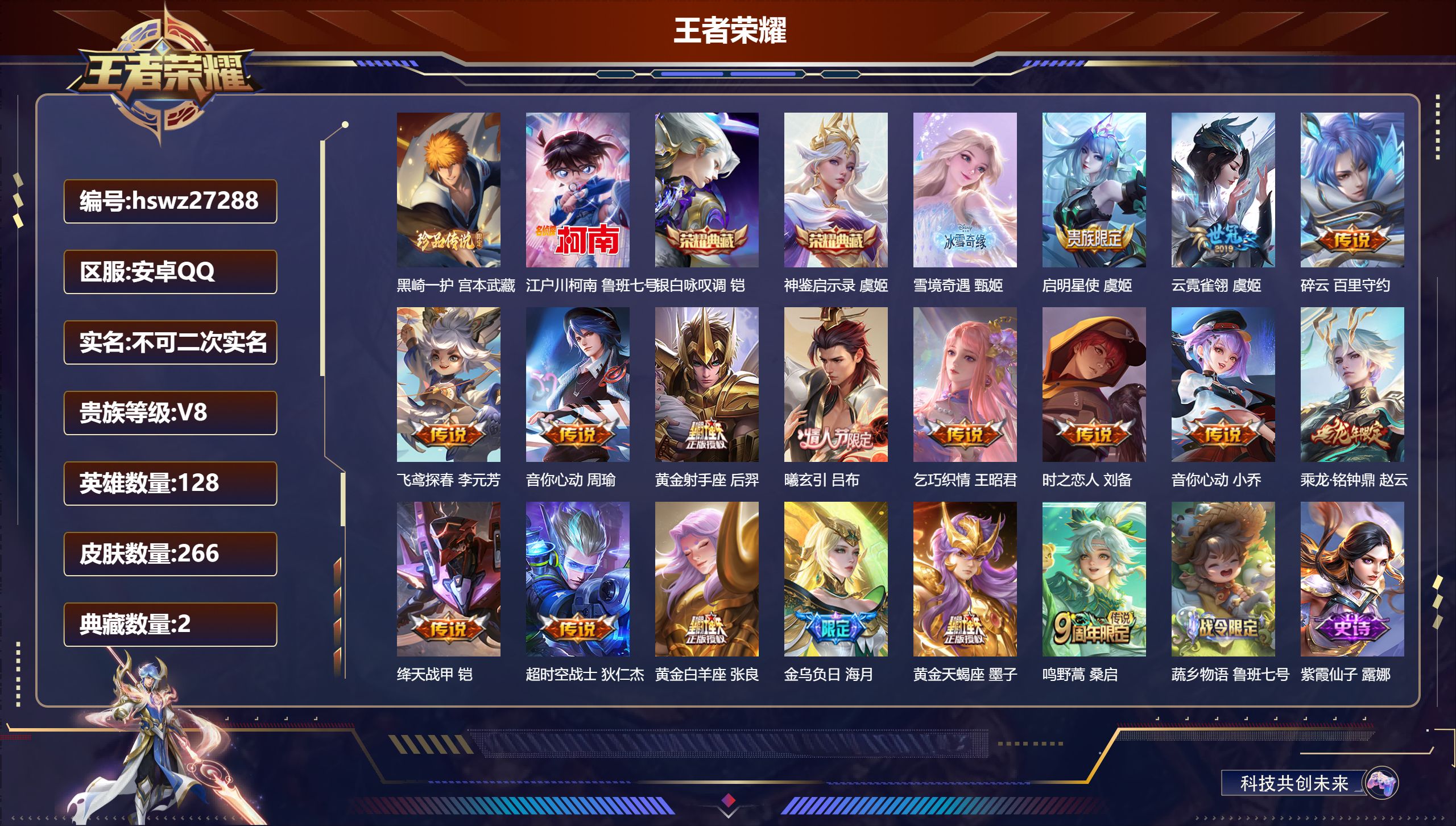 PX_2537682-Q/荣耀王者/266皮肤/128英雄/2典藏/0珍品无双/1无双/2珍品传说/17传说/69史诗/9稀有英雄 【2,珍品传说】黑崎一护,宫本武藏,江户川柯南,鲁班七号, 【2,典藏皮肤】银白咏叹调,铠,神鉴启示录,虞姬, 【1,无双皮肤】雪境奇遇,甄姬, 【17,传说皮肤】启明星使,虞姬,云霓雀翎,虞姬,碎云,百里守约,飞鸢探春,李元芳,音你心动,周瑜,黄金射手座,后羿,曦玄引,吕布,乞巧织情,王昭君,时之恋人,刘备,音你心动,小乔,乘龙·铭钟鼎,赵云,绛天战甲,铠,超时空战士,狄仁杰,黄金白羊座,张良,金乌负日,海月,黄金天蝎座,墨子,鸣野蒿,桑启, 【69,史诗皮肤】蔬乡物语,鲁班七号,紫霞仙子,露娜,云端筑梦师,庄周,燃音魔法,高渐离,苍穹之光,项羽,猫狗日记,大乔,德古拉伯爵,刘邦,心灵战警,亚瑟,戍鼓铭心,钟无艳,鬼剑武藏,宫本武藏,星夜王子,白起,线条小狗,周瑜,摇滚巨星,嬴政,魅力维加斯,妲己,黄金分割率,诸葛亮,偶像歌手,王昭君,女仆咖啡,妲己,白蛇,大乔,晚萤,娜可露露,舞动绿茵,蔡文姬,鹰眼统帅,狄仁杰,孙行者,孙悟空,李小龙,裴擒虎,纤云弄巧,云中君,奇迹圣诞,蔡文姬,龙骑士,墨子,傲雪梅枪,韩信,特工魅影,百里守约,猫狗日记,孙策,逐浪之夏,李元芳,引擎之心,赵云,魔术师,狄仁杰,龙之律动,狂铁,神威,马超,皇家上将,赵云,冰冠公主,雅典娜,功夫厨神,程咬金,电玩·爆裂旋风,刘禅,天才门将,刘禅,圣诞恋歌,貂蝉,水晶猎龙者,花木兰,一生所爱,露娜,烈魂,黄忠,圣诞狂欢,吕布,魅语,不知火舞,器灵·浮梦炉,赵怀真,星界战将,牛魔,地狱岩魂,廉颇,蔷薇恋人,孙尚香,冰雪圆舞曲,甄姬,航海奇遇记,老夫子,千年之狐,李白,节奏热浪,阿轲,暗夜猫娘,阿轲,曙光守护者,铠,青龙志,铠,心灵骇客,安琪拉,乘龙·聚宝船,安琪拉,箭羽风息,伽罗,乱世虎臣,张飞,琥珀纪元,伽罗,绅士熊喵,刘禅,缤纷独角兽,小乔,蓝屏警告,典韦,时之恋人,孙尚香,水果甜心,孙尚香,幽灵船长,曹操,乘风破浪,夏侯惇,暗隐猎兽者,兰陵王, 【102,勇者皮肤】时空谍影,海诺,太极少年,赵怀真,沙漠行僧,达摩,拳王,达摩,大发明家,达摩,龙舞盛年,沈梦溪,丁香结,小乔,功夫炙烤,廉颇,沉稳之力,孙尚香,朔风刀,夏侯惇,醍醐杖,老夫子,朔望之晖,女娲,汉昭烈帝,刘备,白色死神,白起,黑桃队长,鲁班七号,黄金武士,典韦,御旌,牛魔,阴阳师,狄仁杰,次元突破,哪吒,科学大爆炸,项羽,戏梦巡演,空空儿,功夫老勺,老夫子,西部大镖客,牛魔,鲨炮海盗猫,沈梦溪,海滩派对,项羽,完美运算,后羿,万华元夜,狄仁杰,踏浪烽翎,莱西奥,红桃皇后,芈月,奇妙博物学,庄周,西部游侠,莱西奥,野性能量,吕布,哥特玫瑰,露娜,守护之力,大乔,瓷语鉴心,露娜,原初探秘者,鬼谷子,潮玩探月行,猪八戒,鸿运当头,亚瑟,天穹祈灯,鬼谷子,西部大镖客,猪八戒,疑决卦,明世隐,化身博士,扁鹊,阿尔法小队,后羿,无尽旅途,扁鹊,五福同心,张飞,金色潮汐,朵莉亚,星际陆战队,程咬金,幻乐之宴,鬼谷子,救世之瞳,扁鹊,赤刃凌霄,敖隐,潮玩骑兵,杨戬,死亡骑士,亚瑟,敏锐之力,李白,玩偶对对碰,安琪拉,掌控之力,诸葛亮,海滩丽影,钟无艳,忍·炎影,赵云,炽热元素使,姜子牙,坚韧之力,苏烈,万事如意,刘备,乓乓大师,鲁班大师,天使之翼,孙膑,雾都夜雨,干将莫邪,兔女郎,花木兰,龙腾万里,关羽,未来纪元,宫本武藏,千军破阵,苏烈,万象初新,宫本武藏,御銮,盾山,时尚教父,姜子牙,春野之旅,钟无艳,秘密基地,刘禅,街头霸王,韩信,西部大镖客,孙悟空,神迹守卫,墨子,蔬乡物语,李元芳,灵卜魔法,妲己,混沌棋,弈星,御霄,米莱狄,蔚蓝守将,蒙恬,春野闲踪,苏烈,小满鸭,姬小满,幻想奇妙夜,王昭君,驱傩正仪,钟馗,命运角斗场,狂铁,死霸装,白起,特工战影,狂铁,虚灵犬护,钟馗,御狮,狂铁,白执事,赵云,劲辣红锅,太乙真人,剑破天穹,刘邦,星梦巡礼,姜子牙,群星魔术团,程咬金,经纬探寻者,盘古,暗都幽影,大司命,锦麟游梦,庄周,逆浪荇歌,甄姬,线条小狗,周瑜,噬灭天穹,东皇太一,灵卦秘语,少司缘,敬我三分,盘古, 【77,其他皮肤】伊势巫女,大乔,金属狂潮,高渐离,前尘,金蝉,战争骑士,夏侯惇,圣殿之光,刘邦,芝加哥教父,黄忠,潮流仙人,老夫子,三太子,哪吒,棒球奇才,沈梦溪,龙域领主,铠,生化警戒,钟无艳,超能战警,曹操,花见巫女,伽罗,未来旅行,孙膑,第七人偶,干将莫邪,万圣前夜,小乔,灼热之刃,李信,熊喵少女,阿古朵,海之征途,孙策,木偶奇遇记,鲁班七号,帝国元帅,项羽,精灵王,后羿,绯红之刃,露娜,冰刃幻境,镜,碧珀绯影,暃,海军大将,周瑜,魇语军师,司马懿,英喵野望,刘禅,午夜歌剧院,元歌,启蛰,司空震,隐刃,兰陵王,霓裳曲,杨玉环,花间舞,公孙离,异域舞娘,貂蝉,街头旋风,裴擒虎,归虚梦演,鲁班大师,东海龙王,东皇太一,修竹墨客,上官婉儿,剑舞者,花木兰,范海辛,李白,维京掠夺者,苍,占星师,明世隐,归虚梦演,蒙犽,激情绿茵,马可波罗,埃及法老,杨戬,归虚梦演,西施,阿摩司公爵,鬼谷子,画中游,桑启,年年有余,猪八戒,尼罗河女神,女娲,锦衣卫,狄仁杰,一千零一夜,张良,归虚梦演,曜,威尼斯狂欢,百里玄策,幸存者,马超,战争女神,雅典娜,荷鲁斯之眼,云中君,创世神祝,盘古,特种部队,李元芳,绝影神枪,百里守约,蔷薇王座,蔡文姬,森,瑶,孤猎,澜,加勒比小姐,虞姬,踏雪寻梅,弈星,秩序猎龙将,蒙恬,精准探案法,米莱狄,精灵公主,王昭君,赤焰之缨,云缨,露花倒影,嫦娥,地府判官,钟馗,美梦成真,梦奇,天启骑士,关羽,圆桌骑士,太乙真人,西部大镖客,孙悟空,黑崎一护,