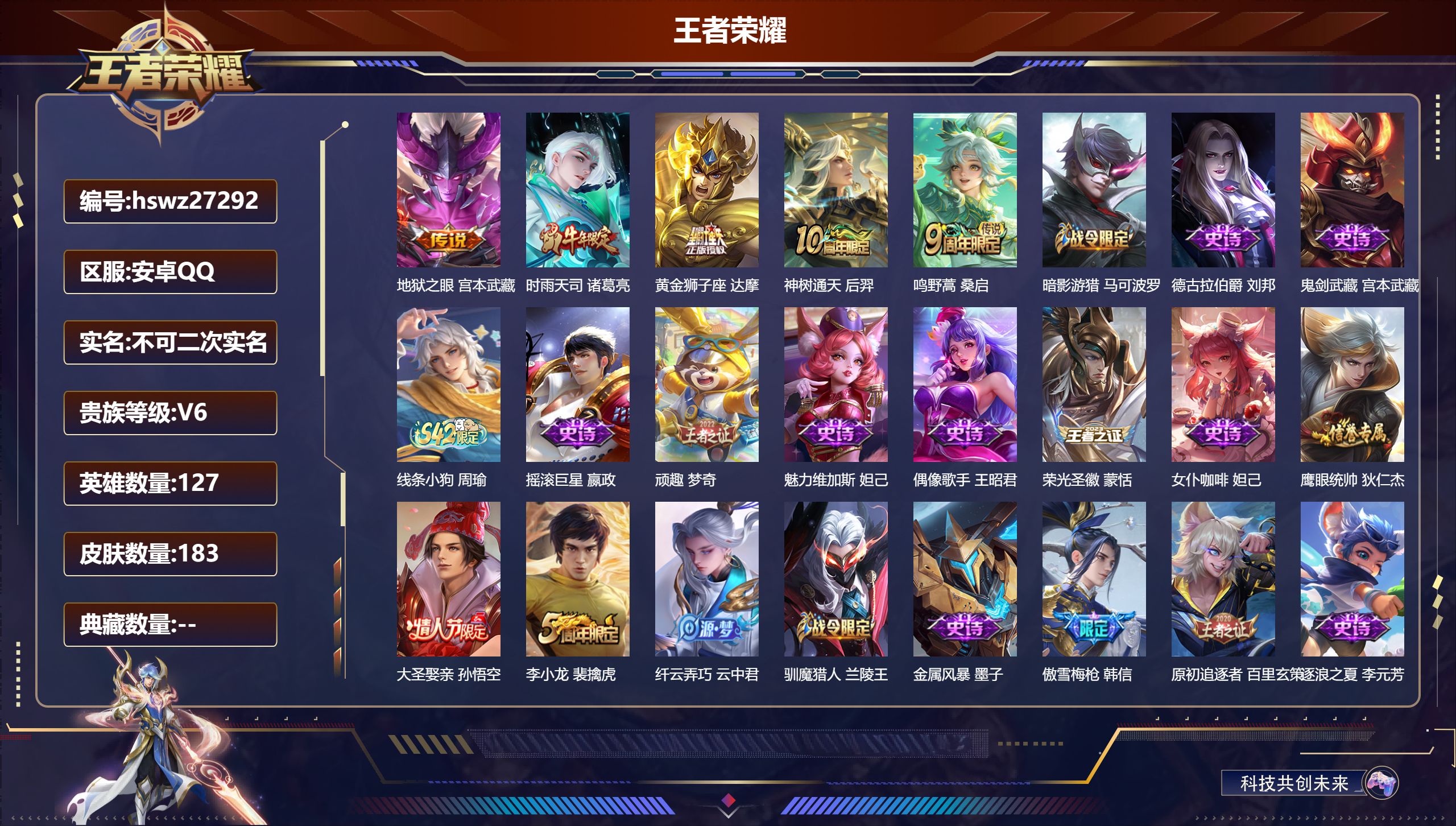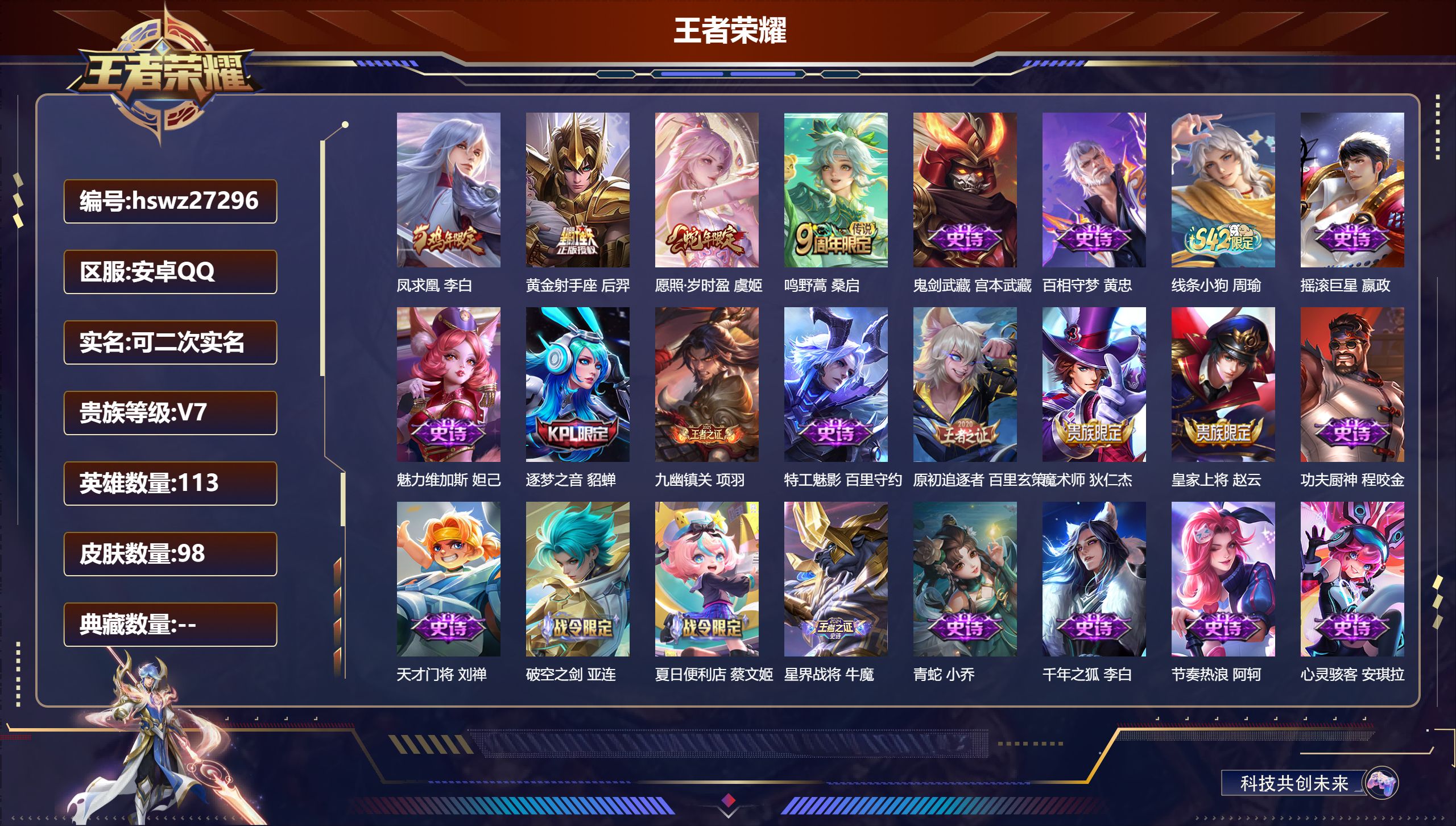 PX_2537716-Q/非凡王者/98皮肤/113英雄/0典藏/0珍品无双/0无双/0珍品传说/4传说/22史诗/7稀有英雄 【4,传说皮肤】凤求凰,李白,黄金射手座,后羿,愿照·岁时盈,虞姬,鸣野蒿,桑启, 【22,史诗皮肤】鬼剑武藏,宫本武藏,百相守梦,黄忠,线条小狗,周瑜,摇滚巨星,嬴政,魅力维加斯,妲己,逐梦之音,貂蝉,九幽镇关,项羽,特工魅影,百里守约,原初追逐者,百里玄策,魔术师,狄仁杰,皇家上将,赵云,功夫厨神,程咬金,天才门将,刘禅,破空之剑,亚连,夏日便利店,蔡文姬,星界战将,牛魔,青蛇,小乔,千年之狐,李白,节奏热浪,阿轲,心灵骇客,安琪拉,乘风破浪,夏侯惇,暗隐猎兽者,兰陵王, 【51,勇者皮肤】烛龙,曹操,汉昭烈帝,刘备,白色死神,白起,黄金武士,典韦,阴阳师,狄仁杰,炼金王,扁鹊,功夫老勺,老夫子,鲤鱼之梦,庄周,海滩派对,项羽,踏浪烽翎,莱西奥,哥特玫瑰,露娜,无双福将,程咬金,百相守梦,影,阿尔法小队,后羿,五福同心,张飞,死亡骑士,亚瑟,破局者,亚连,玩偶对对碰,安琪拉,忍·炎影,赵云,雪境奇遇,西施,重明,芈月,溯影追猎,虞姬,妖精王,孙膑,天使之翼,孙膑,兔女郎,花木兰,龙腾万里,关羽,未来纪元,宫本武藏,罗小黑战记,哪吒,花好人间,甄姬,万象初新,宫本武藏,秘密基地,刘禅,穷奇,典韦,西部大镖客,孙悟空,凯尔特女王,虞姬,命运加冕,露娜,灵野札记,张良,虚灵犬护,钟馗,饕餮,太乙真人,神迹守卫,孙悟空,铁骨偃魂,典韦,苍林狼骑,苍,天穹之誓,姜子牙,星梦巡礼,姜子牙,谧流熔炉,太乙真人,夏日便利店,虞姬,锦麟游梦,庄周,逆浪荇歌,甄姬,线条小狗,周瑜,线条小狗,桑启,噬灭天穹,东皇太一,敬我三分,盘古, 【23,其他皮肤】战争骑士,夏侯惇,圣殿之光,刘邦,芝加哥教父,黄忠,三太子,哪吒,龙域领主,铠,花见巫女,伽罗,万圣前夜,小乔,熊喵少女,阿古朵,木偶奇遇记,鲁班七号,福禄兄弟,鲁班七号,精灵王,后羿,星航指挥官,诸葛亮,霓裳曲,杨玉环,花间舞,公孙离,东海龙王,东皇太一,埃及法老,杨戬,尼罗河女神,女娲,一千零一夜,张良,归虚梦演,曜,战争女神,雅典娜,精灵公主,王昭君,地府判官,钟馗,西部大镖客,孙悟空, 【7,稀有英雄】敖隐,不知火舞,橘右京,娜可露露,韩信,艾琳,赵云, 营地ID:,