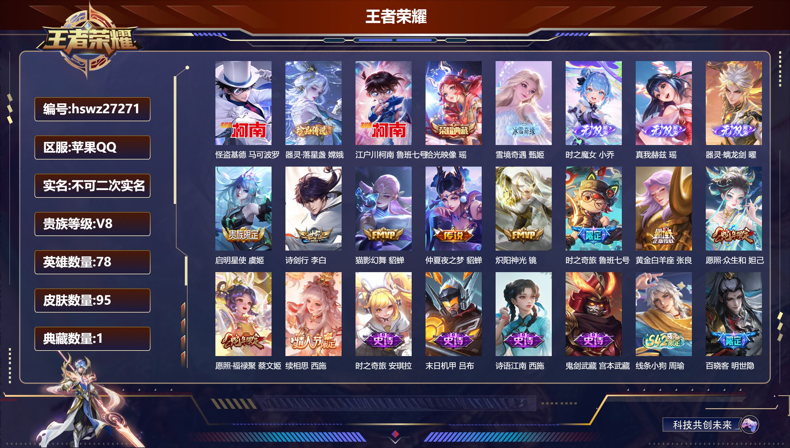 PX_2537547-Q/至圣王者/95皮肤/78英雄/1典藏/0珍品无双/4无双/3珍品传说/10传说/26史诗/3稀有英雄 【3,珍品传说】怪盗基德,马可波罗,器灵·落星盏,嫦娥,江户川柯南,鲁班七号, 【1,典藏皮肤】拾光映像,瑶, 【4,无双皮肤】雪境奇遇,甄姬,时之魔女,小乔,真我赫兹,瑶,器灵·螭龙剑,曜, 【10,传说皮肤】启明星使,虞姬,诗剑行,李白,猫影幻舞,貂蝉,仲夏夜之梦,貂蝉,炽阳神光,镜,时之奇旅,鲁班七号,黄金白羊座,张良,愿照·众生和,妲己,愿照·福禄聚,蔡文姬,续相思,西施, 【26,史诗皮肤】时之奇旅,安琪拉,末日机甲,吕布,诗语江南,西施,鬼剑武藏,宫本武藏,线条小狗,周瑜,百晓客,明世隐,魅力维加斯,妲己,乐园奇幻夜,钟馗,偶像歌手,王昭君,女仆咖啡,妲己,白蛇,大乔,晚萤,娜可露露,遇见神鹿,瑶,舞动绿茵,蔡文姬,冰霜神祇,盘古,时之彼端,妲己,魔术师,狄仁杰,皇家上将,赵云,茶境仙,孙膑,冰雪圆舞曲,甄姬,陌上桑,艾琳,百相守梦,百里守约,水果甜心,孙尚香,化蝶舞,阿轲,幽灵船长,曹操,乘风破浪,夏侯惇, 【37,勇者皮肤】拳王,达摩,黄金武士,典韦,阴阳师,狄仁杰,海滩派对,项羽,守护之力,大乔,金色潮汐,朵莉亚,虹云星官,明世隐,救世之瞳,扁鹊,死亡骑士,亚瑟,浪漫序章,刘备,敏锐之力,李白,胡桃狂想曲,蒙犽,玩偶对对碰,安琪拉,忍·炎影,赵云,雪境奇遇,西施,天使之翼,孙膑,雾都夜雨,干将莫邪,龙腾万里,关羽,未来纪元,宫本武藏,零食大作战,姬小满,街头霸王,韩信,秘证寻踪,小乔,幻想奇妙夜,王昭君,灵野札记,张良,铁骨偃魂,典韦,苍林狼骑,苍,魅影绮裳,影,访茗客,马超,星梦巡礼,姜子牙,谧流熔炉,太乙真人,金福满堂,东皇太一,线条小狗,周瑜,百相守梦,老夫子,噬灭天穹,东皇太一,灵卦秘语,少司缘,爆裂喵拳,达摩,玫蓝誓约,戈娅, 【18,其他皮肤】芝加哥教父,黄忠,潮流仙人,老夫子,龙域领主,铠,英喵野望,刘禅,花间舞,公孙离,街头旋风,裴擒虎,东海龙王,东皇太一,占星师,明世隐,激情绿茵,马可波罗,画中游,桑启,荷鲁斯之眼,云中君,绝影神枪,百里守约,蔷薇王座,蔡文姬,森,瑶,地府判官,钟馗,怪盗基德,马可波罗,器灵·落星盏,嫦娥,江户川柯南,鲁班七号, 【3,稀有英雄】娜可露露,韩信,艾琳, 营地ID:,