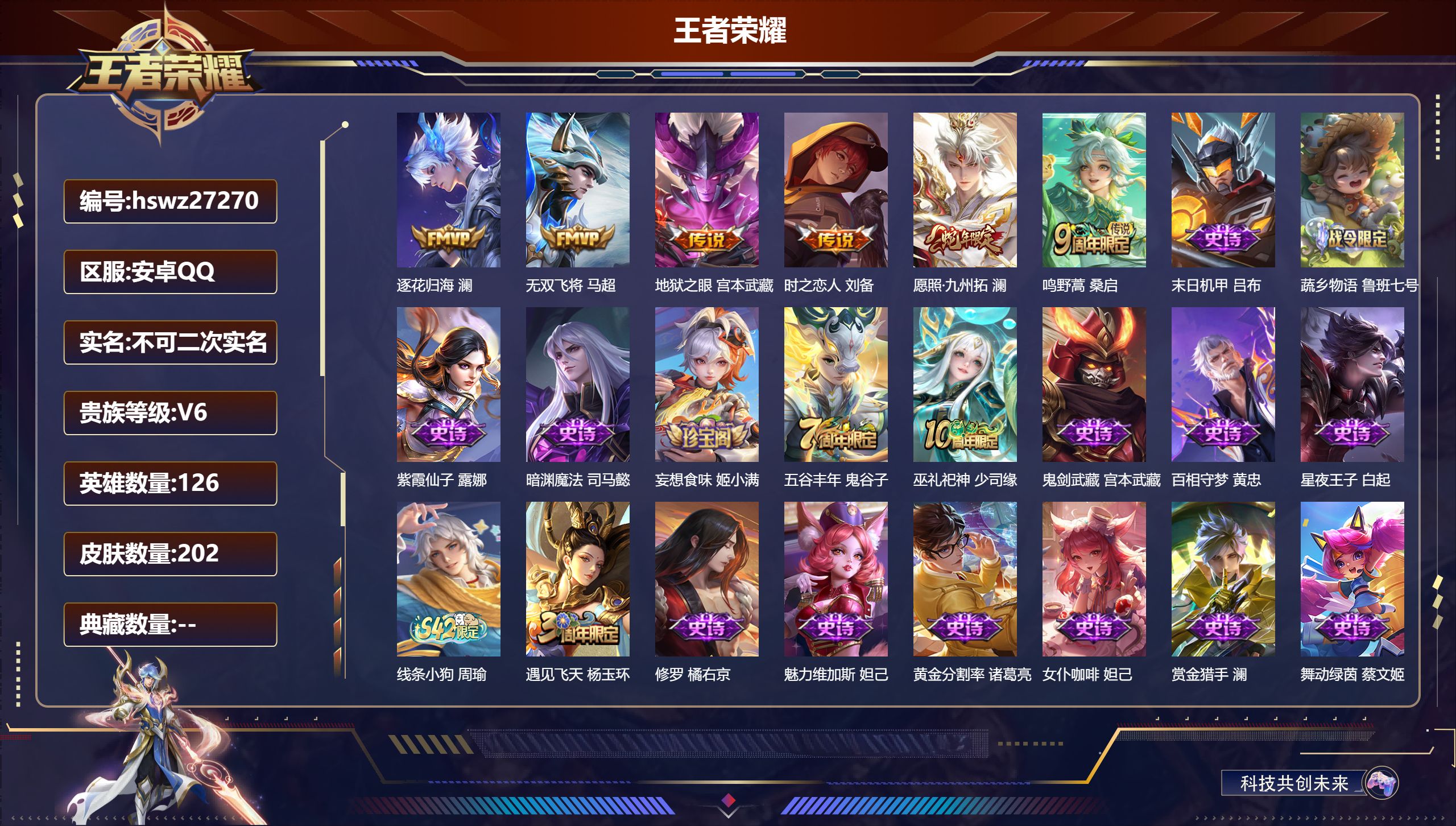 PX_2537526-Q/尊贵铂金/202皮肤/126英雄/0典藏/0珍品无双/0无双/0珍品传说/6传说/47史诗/8稀有英雄 【6,传说皮肤】逐花归海,澜,无双飞将,马超,地狱之眼,宫本武藏,时之恋人,刘备,愿照·九州拓,澜,鸣野蒿,桑启, 【47,史诗皮肤】末日机甲,吕布,蔬乡物语,鲁班七号,紫霞仙子,露娜,暗渊魔法,司马懿,妄想食味,姬小满,五谷丰年,鬼谷子,巫礼祀神,少司缘,鬼剑武藏,宫本武藏,百相守梦,黄忠,星夜王子,白起,线条小狗,周瑜,遇见飞天,杨玉环,修罗,橘右京,魅力维加斯,妲己,黄金分割率,诸葛亮,女仆咖啡,妲己,赏金猎手,澜,舞动绿茵,蔡文姬,鹰眼统帅,狄仁杰,李小龙,裴擒虎,金属风暴,墨子,特工魅影,百里守约,未来纪元,赵云,魔术师,狄仁杰,龙之律动,狂铁,皇家上将,赵云,梁祝,上官婉儿,水晶猎龙者,花木兰,青焰无极,镜,星界战将,牛魔,地狱岩魂,廉颇,茶境仙,孙膑,蔷薇恋人,孙尚香,冰雪圆舞曲,甄姬,千年之狐,李白,曙光守护者,铠,心灵骇客,安琪拉,乱世虎臣,张飞,百相守梦,周瑜,绅士熊喵,刘禅,缤纷独角兽,小乔,水果甜心,孙尚香,化蝶舞,阿轲,江河有灵,阿古朵,幽灵船长,曹操,乘风破浪,夏侯惇,暗隐猎兽者,兰陵王, 【111,勇者皮肤】圆桌骑士,盾山,沙漠行僧,达摩,大漠名商,沈梦溪,缤纷绘卷,张良,纽约教父,刘备,拳王,达摩,大发明家,达摩,龙舞盛年,沈梦溪,功夫炙烤,廉颇,沉稳之力,孙尚香,海盐诗旅,桑启,幻泉雾影,海月,醍醐杖,老夫子,汉昭烈帝,刘备,白色死神,白起,黄金武士,典韦,阴阳师,狄仁杰,次元突破,哪吒,古海寻踪,张良,戏梦巡演,空空儿,功夫老勺,老夫子,鲨炮海盗猫,沈梦溪,海滩派对,项羽,完美运算,后羿,克喵,鬼谷子,踏浪烽翎,莱西奥,野性能量,吕布,哥特玫瑰,露娜,守护之力,大乔,无双福将,程咬金,原初探秘者,鬼谷子,潮玩探月行,猪八戒,天穹祈灯,鬼谷子,疑决卦,明世隐,化身博士,扁鹊,潮玩骑士王,亚瑟,阿尔法小队,后羿,幻乐之宴,鬼谷子,东方不败,武则天,虹云星官,明世隐,潮玩牛仔,马可波罗,潮玩骑兵,杨戬,死亡骑士,亚瑟,浪漫序章,刘备,敏锐之力,李白,玩偶对对碰,安琪拉,海滩丽影,钟无艳,忍·炎影,赵云,雪境奇遇,西施,炽热元素使,姜子牙,唤灵魔甲,刘禅,万事如意,刘备,乓乓大师,鲁班大师,逐霄之志,曹操,探海日志,鲁班大师,天使之翼,孙膑,兔女郎,花木兰,龙腾万里,关羽,金庭之子,兰陵王,幻夜行动,兰陵王,未来纪元,宫本武藏,罗小黑战记,哪吒,千军破阵,苏烈,荣光之誓,亚瑟,花好人间,甄姬,聚星闪耀,钟无艳,潮玩造梦师,刘备,春野之旅,钟无艳,秘密基地,刘禅,教廷特使,韩信,街头霸王,韩信,云中旅人,李元芳,妄想特派,李元芳,西部大镖客,孙悟空,蔬乡物语,李元芳,少女阿狸,妲己,蔚蓝守将,蒙恬,春野闲踪,苏烈,契约魔法,米莱狄,布丁狗之约,阿古朵,暖冬·兔眠,嫦娥,灵野札记,张良,驱傩正仪,钟馗,死霸装,白起,特工战影,狂铁,虚灵犬护,钟馗,白执事,赵云,劲辣红锅,太乙真人,剑破天穹,刘邦,苍威无极,项羽,铁骨偃魂,典韦,熔金海岸,周瑜,苍林狼骑,苍,天穹之誓,姜子牙,魅影绮裳,影,访茗客,马超,星梦巡礼,姜子牙,谧流熔炉,太乙真人,群星魔术团,程咬金,经纬探寻者,盘古,暗都幽影,大司命,鹤鸣心笺,艾琳,锦麟游梦,庄周,逆浪荇歌,甄姬,百相守梦,孙策,线条小狗,周瑜,噬灭天穹,东皇太一,灵卦秘语,少司缘,敬我三分,盘古,玫蓝誓约,戈娅,景韶洛都,明世隐, 【40,其他皮肤】伊势巫女,大乔,战争骑士,夏侯惇,圣殿之光,刘邦,龙域领主,铠,第七人偶,干将莫邪,灼热之刃,李信,熊喵少女,阿古朵,海之征途,孙策,木偶奇遇记,鲁班七号,精灵王,后羿,冰刃幻境,镜,碧珀绯影,暃,星航指挥官,诸葛亮,魇语军师,司马懿,午夜歌剧院,元歌,启蛰,司空震,隐刃,兰陵王,花间舞,公孙离,异域舞娘,貂蝉,街头旋风,裴擒虎,东海龙王,东皇太一,剑舞者,花木兰,范海辛,李白,维京掠夺者,苍,占星师,明世隐,归虚梦演,蒙犽,激情绿茵,马可波罗,埃及法老,杨戬,归虚梦演,西施,阿摩司公爵,鬼谷子,锦衣卫,狄仁杰,一千零一夜,张良,幸存者,马超,绝影神枪,百里守约,森,瑶,孤猎,澜,踏雪寻梅,弈星,赤焰之缨,云缨,天启骑士,关羽,西部大镖客,孙悟空, 【8,稀有英雄】敖隐,不知火舞,橘右京,夏洛特,娜可露露,韩信,艾琳,赵云, 营地ID:,