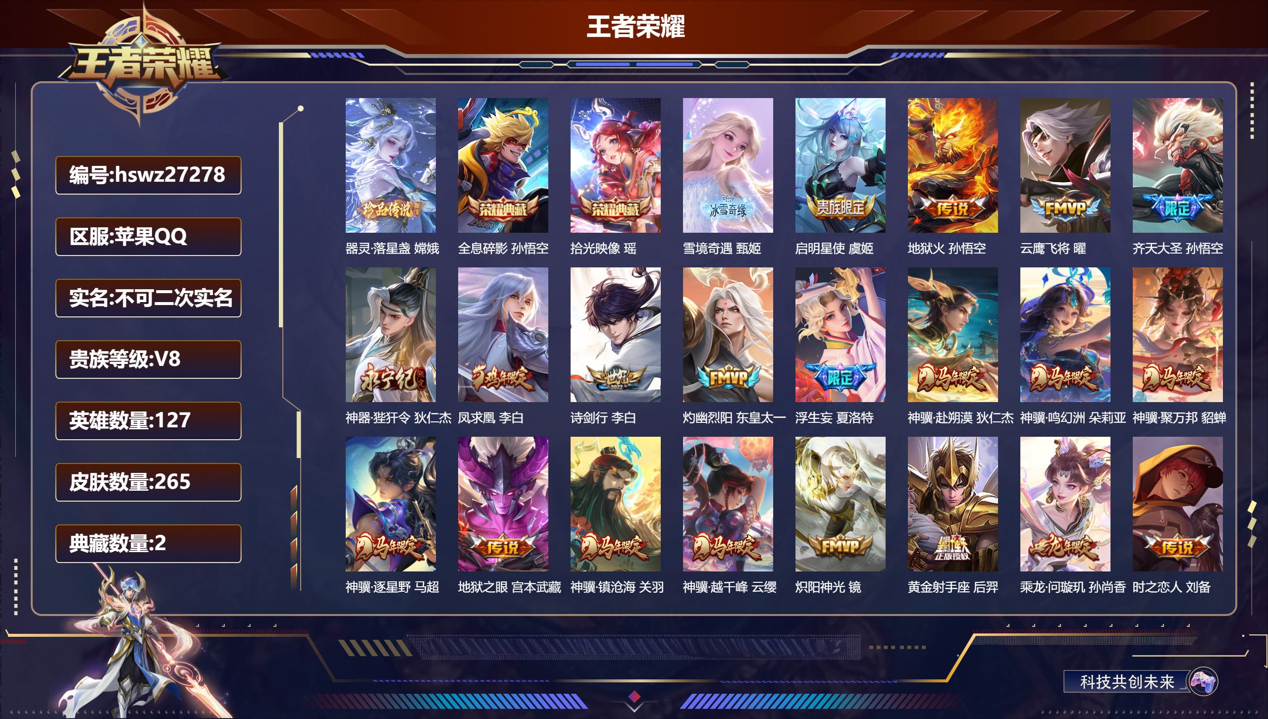 PX_2537635-Q/最强王者/265皮肤/127英雄/2典藏/0珍品无双/1无双/1珍品传说/32传说/56史诗/8稀有英雄 【1,珍品传说】器灵·落星盏,嫦娥, 【2,典藏皮肤】全息碎影,孙悟空,拾光映像,瑶, 【1,无双皮肤】雪境奇遇,甄姬, 【32,传说皮肤】启明星使,虞姬,地狱火,孙悟空,云鹰飞将,曜,齐天大圣,孙悟空,神器·狴犴令,狄仁杰,凤求凰,李白,诗剑行,李白,灼幽烈阳,东皇太一,浮生妄,夏洛特,神骥·赴朔漠,狄仁杰,神骥·鸣幻洲,朵莉亚,神骥·聚万邦,貂蝉,神骥·逐星野,马超,地狱之眼,宫本武藏,神骥·镇沧海,关羽,神骥·越千峰,云缨,炽阳神光,镜,黄金射手座,后羿,乘龙·问璇玑,孙尚香,时之恋人,刘备,绯月行,不知火舞,久胜战神,干将莫邪,末日机甲,孙尚香,一念神魔,李信,冠军飞将,花木兰,黄金白羊座,张良,金乌负日,海月,愿照·九州拓,澜,神树通天,后羿,愿照·山河定,司空震,云诺千山,公孙离,续相思,西施, 【56,史诗皮肤】电玩小子,鲁班七号,末日机甲,吕布,白昼王子,嬴政,高山流水,庄周,银河之约,李元芳,暗渊魔法,司马懿,狮舞东方,鲁班七号,德古拉伯爵,刘邦,山海·玄木吟,马可波罗,五谷丰年,鬼谷子,无心,元歌,巫礼祀神,少司缘,鬼剑武藏,宫本武藏,星夜王子,白起,线条小狗,周瑜,遇见飞天,杨玉环,魅力维加斯,妲己,黄金分割率,诸葛亮,偶像歌手,王昭君,女仆咖啡,妲己,晚萤,娜可露露,舞动绿茵,蔡文姬,繁星吟游,蔡文姬,鹰眼统帅,狄仁杰,大圣娶亲,孙悟空,飞衡,韩信,孙行者,孙悟空,李小龙,裴擒虎,纤云弄巧,云中君,特工魅影,百里守约,猫狗日记,孙策,未来纪元,赵云,引擎之心,赵云,魔术师,狄仁杰,龙之律动,狂铁,皇家上将,赵云,冰冠公主,雅典娜,功夫厨神,程咬金,梁祝,上官婉儿,白龙吟,韩信,茶境仙,孙膑,冰雪圆舞曲,甄姬,千年之狐,李白,节奏热浪,阿轲,曙光守护者,铠,乘龙·聚宝船,安琪拉,乱世虎臣,张飞,缤纷独角兽,小乔,线条小狗,小乔,水果甜心,孙尚香,瑰影绮梦,芈月,化蝶舞,阿轲,江河有灵,阿古朵,幽灵船长,曹操,乘风破浪,夏侯惇,暗隐猎兽者,兰陵王, 【124,勇者皮肤】烛龙,曹操,爱心护理,阿轲,拳王,达摩,大发明家,达摩,龙舞盛年,沈梦溪,丁香结,小乔,功夫炙烤,廉颇,沉稳之力,孙尚香,海盐诗旅,桑启,幻泉雾影,海月,朔风刀,夏侯惇,醍醐杖,老夫子,朔望之晖,女娲,白色死神,白起,黑桃队长,鲁班七号,黄金武士,典韦,落雪兰心,甄姬,御旌,牛魔,阴阳师,狄仁杰,次元突破,哪吒,古海寻踪,张良,牛运亨通,牛魔,功夫老勺,老夫子,鲨炮海盗猫,沈梦溪,海滩派对,项羽,完美运算,后羿,万华元夜,狄仁杰,红桃皇后,芈月,奇妙博物学,庄周,西部游侠,莱西奥,猎兽之王,吕布,哥特玫瑰,露娜,守护之力,大乔,无双福将,程咬金,百相守梦,影,原初探秘者,鬼谷子,星空之诺,沈梦溪,潮玩探月行,猪八戒,天穹祈灯,鬼谷子,疑决卦,明世隐,如懿,安琪拉,化身博士,扁鹊,阿尔法小队,后羿,五福同心,张飞,金色潮汐,朵莉亚,次元傲视,杨戬,幻乐之宴,鬼谷子,霸王丸,宫本武藏,虹云星官,明世隐,雾影缉谜,兰陵王,救世之瞳,扁鹊,赤刃凌霄,敖隐,赤莲之焰,周瑜,死亡骑士,亚瑟,浪漫序章,刘备,敏锐之力,李白,破局者,亚连,幽兰居士,张良,玩偶对对碰,安琪拉,掌控之力,诸葛亮,海滩丽影,钟无艳,忍·炎影,赵云,雪境奇遇,西施,重明,芈月,炽热元素使,姜子牙,坚韧之力,苏烈,唤灵魔甲,刘禅,万事如意,刘备,乓乓大师,鲁班大师,探海日志,鲁班大师,女武神,艾琳,天使之翼,孙膑,兔女郎,花木兰,龙腾万里,关羽,未来纪元,宫本武藏,荣光之誓,亚瑟,花好人间,甄姬,万象初新,宫本武藏,御銮,盾山,春野之旅,钟无艳,秘密基地,刘禅,穷奇,典韦,教廷特使,韩信,街头霸王,韩信,云中旅人,李元芳,西部大镖客,孙悟空,少女阿狸,妲己,灵卜魔法,妲己,混沌棋,弈星,御霄,米莱狄,春野闲踪,苏烈,布丁狗之约,阿古朵,暖冬·兔眠,嫦娥,绒语心约,大乔,幻想奇妙夜,王昭君,灵野札记,张良,驱傩正仪,钟馗,神迹守卫,钟馗,命运角斗场,狂铁,特工战影,狂铁,虚灵犬护,钟馗,御狮,狂铁,班班快跑,鲁班七号,漠中幻影,嫦娥,白执事,赵云,饕餮,太乙真人,剑破天穹,刘邦,熔金海岸,周瑜,天穹之誓,姜子牙,魅影绮裳,影,访茗客,马超,星梦巡礼,姜子牙,破阵·退雄兵,杨戬,谧流熔炉,太乙真人,群星魔术团,程咬金,暗都幽影,大司命,鹤鸣心笺,艾琳,线条小狗,周瑜,线条小狗,桑启,灵卦秘语,少司缘,敬我三分,盘古,爆裂喵拳,达摩,玫蓝誓约,戈娅,景韶洛都,明世隐, 【52,其他皮肤】伊势巫女,大乔,战争骑士,夏侯惇,芝加哥教父,黄忠,潮流仙人,老夫子,棒球奇才,沈梦溪,龙域领主,铠,死神来了,曹操,超能战警,曹操,花见巫女,伽罗,爱与和平,苏烈,第七人偶,干将莫邪,万圣前夜,小乔,灼热之刃,李信,熊喵少女,阿古朵,海之征途,孙策,木偶奇遇记,鲁班七号,福禄兄弟,鲁班七号,帝国元帅,项羽,精灵王,后羿,绯红之刃,露娜,海军大将,周瑜,星航指挥官,诸葛亮,启蛰,司空震,隐刃,兰陵王,霓裳曲,杨玉环,花间舞,公孙离,异域舞娘,貂蝉,街头旋风,裴擒虎,剑舞者,花木兰,范海辛,李白,维京掠夺者,苍,占星师,明世隐,激情绿茵,马可波罗,埃及法老,杨戬,归虚梦演,西施,尼罗河女神,女娲,锦衣卫,狄仁杰,一千零一夜,张良,归虚梦演,曜,威尼斯狂欢,百里玄策,幸存者,马超,特种部队,李元芳,绝影神枪,百里守约,森,瑶,加勒比小姐,虞姬,精灵公主,王昭君,赤焰之缨,云缨,露花倒影,嫦娥,地府判官,钟馗,美梦成真,梦奇,西部大镖客,孙悟空,器灵·落星盏,嫦娥, 【8,稀有英雄