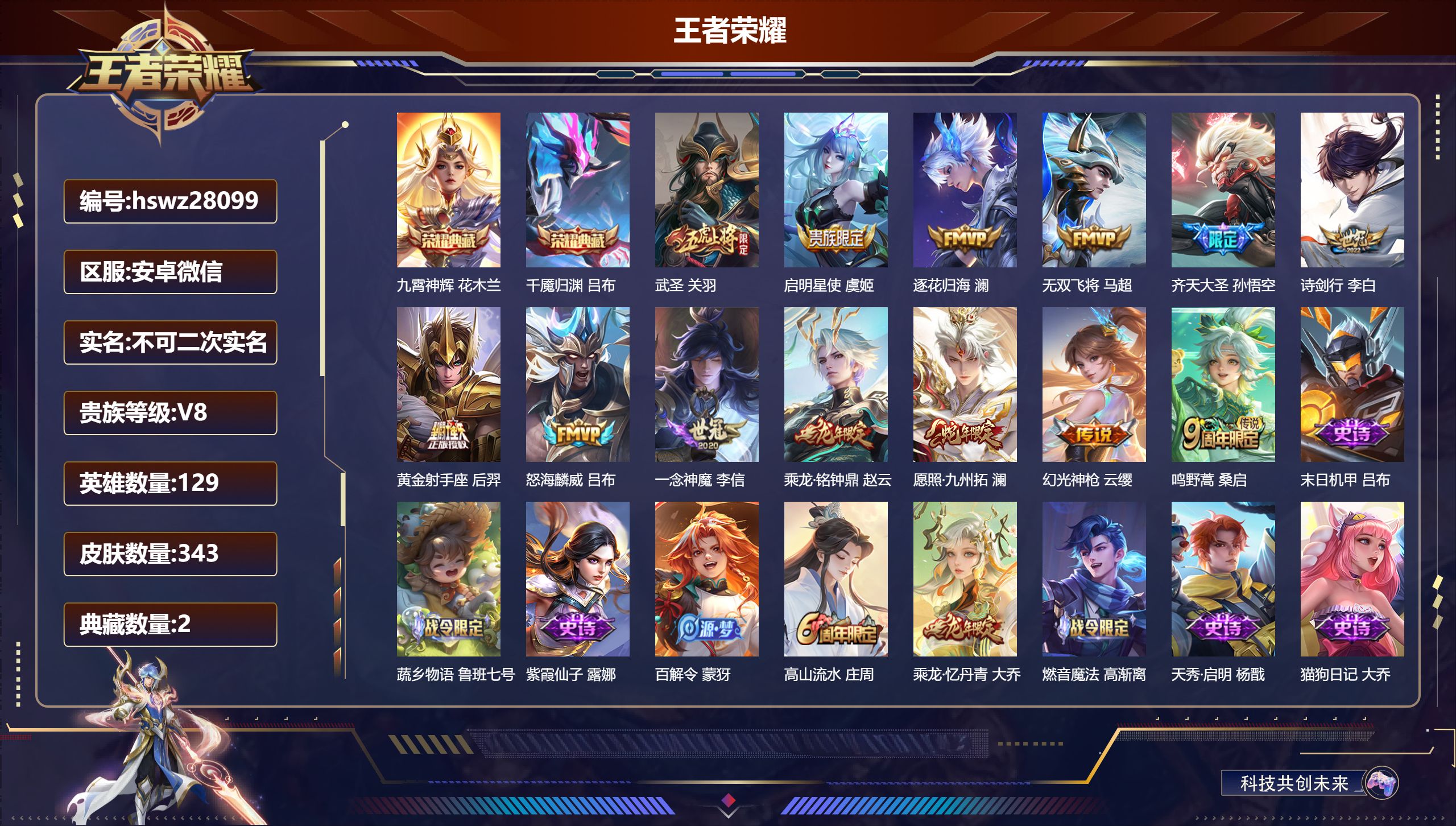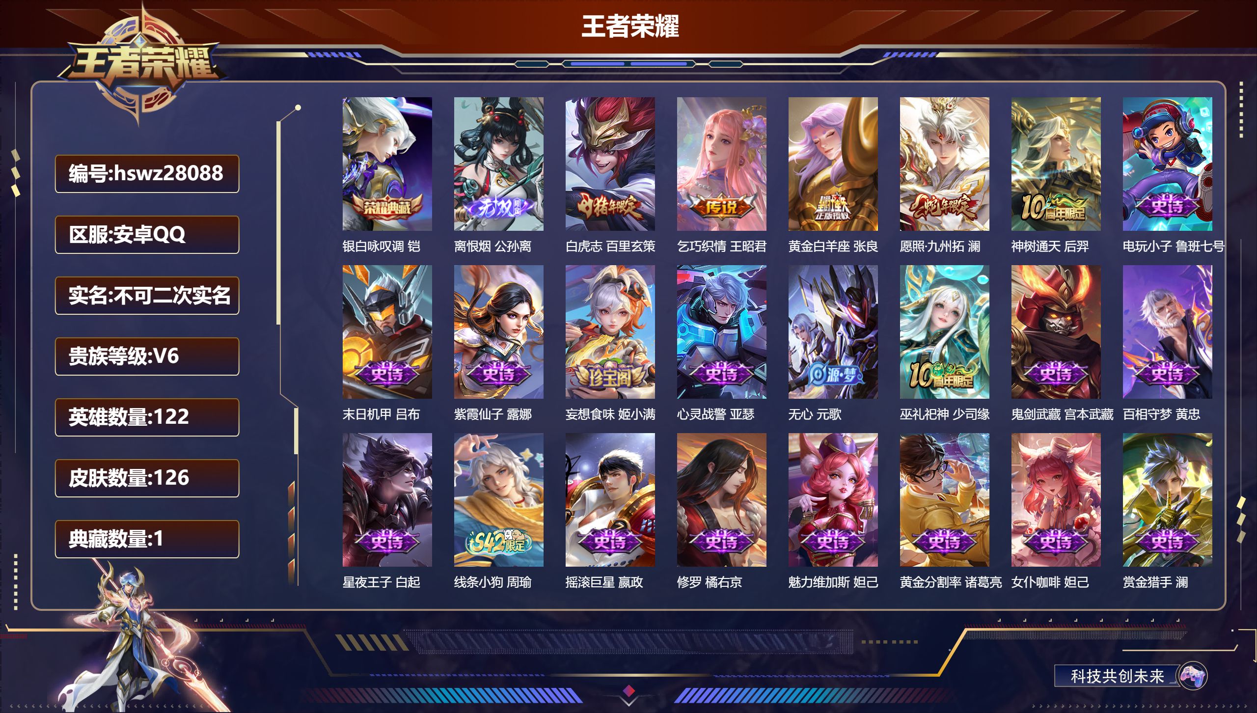 PX_2554260-Q/至尊星耀/126皮肤/122英雄/1典藏/0珍品无双/1无双/0珍品传说/5传说/44史诗/8稀有英雄 【1,典藏皮肤】银白咏叹调,铠, 【1,无双皮肤】离恨烟,公孙离, 【5,传说皮肤】白虎志,百里玄策,乞巧织情,王昭君,黄金白羊座,张良,愿照·九州拓,澜,神树通天,后羿, 【44,史诗皮肤】电玩小子,鲁班七号,末日机甲,吕布,紫霞仙子,露娜,妄想食味,姬小满,心灵战警,亚瑟,无心,元歌,巫礼祀神,少司缘,鬼剑武藏,宫本武藏,百相守梦,黄忠,星夜王子,白起,线条小狗,周瑜,摇滚巨星,嬴政,修罗,橘右京,魅力维加斯,妲己,黄金分割率,诸葛亮,女仆咖啡,妲己,赏金猎手,澜,九幽镇关,项羽,鹰眼统帅,狄仁杰,李小龙,裴擒虎,金属风暴,墨子,特工魅影,百里守约,逐浪之夏,李元芳,魔术师,狄仁杰,龙之律动,狂铁,皇家上将,赵云,至尊宝,孙悟空,功夫厨神,程咬金,水晶猎龙者,花木兰,涂山容容,公孙离,破空之剑,亚连,圣诞狂欢,吕布,器灵·浮梦炉,赵怀真,地狱岩魂,廉颇,曙光守护者,铠,心灵骇客,安琪拉,乱世虎臣,张飞,万物之道,弈星,缤纷独角兽,小乔,线条小狗,小乔,水果甜心,孙尚香,幽灵船长,曹操,乘风破浪,夏侯惇,暗隐猎兽者,兰陵王, 【60,勇者皮肤】大漠名商,沈梦溪,拳王,达摩,大发明家,达摩,沉稳之力,孙尚香,海盐诗旅,桑启,幻泉雾影,海月,白色死神,白起,黄金武士,典韦,阴阳师,狄仁杰,径山谋武,孙权,海滩派对,项羽,完美运算,后羿,克喵,鬼谷子,踏浪烽翎,莱西奥,西部游侠,莱西奥,百相守梦,影,天穹祈灯,鬼谷子,五福同心,张飞,幻乐之宴,鬼谷子,潮玩牛仔,马可波罗,死亡骑士,亚瑟,浪漫序章,刘备,敏锐之力,李白,玩偶对对碰,安琪拉,海滩丽影,钟无艳,忍·炎影,赵云,雪境奇遇,西施,乓乓大师,鲁班大师,溯影追猎,虞姬,极光幻客,蚩奼,天使之翼,孙膑,兔女郎,花木兰,龙腾万里,关羽,未来纪元,宫本武藏,罗小黑战记,哪吒,荣光之誓,亚瑟,花好人间,甄姬,街头霸王,韩信,云中旅人,李元芳,西部大镖客,孙悟空,重装意志,盘古,春野闲踪,苏烈,布丁狗之约,阿古朵,命运加冕,露娜,小满鸭,姬小满,灵野札记,张良,潮玩士官长,雅典娜,死霸装,白起,虚灵犬护,钟馗,铁骨偃魂,典韦,苍林狼骑,苍,天穹之誓,姜子牙,谧流熔炉,太乙真人,鹤鸣心笺,艾琳,锦麟游梦,庄周,逆浪荇歌,甄姬,海之女神,海月,线条小狗,周瑜,玫蓝誓约,戈娅,景韶洛都,明世隐, 【17,其他皮肤】芝加哥教父,黄忠,潮流仙人,老夫子,龙域领主,铠,灼热之刃,李信,精灵王,后羿,碧珀绯影,暃,魇语军师,司马懿,启蛰,司空震,占星师,明世隐,幸存者,马超,战争女神,雅典娜,森,瑶,孤猎,澜,踏雪寻梅,弈星,秩序猎龙将,蒙恬,赤焰之缨,云缨,西部大镖客,孙悟空, 【8,稀有英雄】嬴政,不知火舞,橘右京,夏洛特,娜可露露,韩信,艾琳,赵云, 营地ID:,