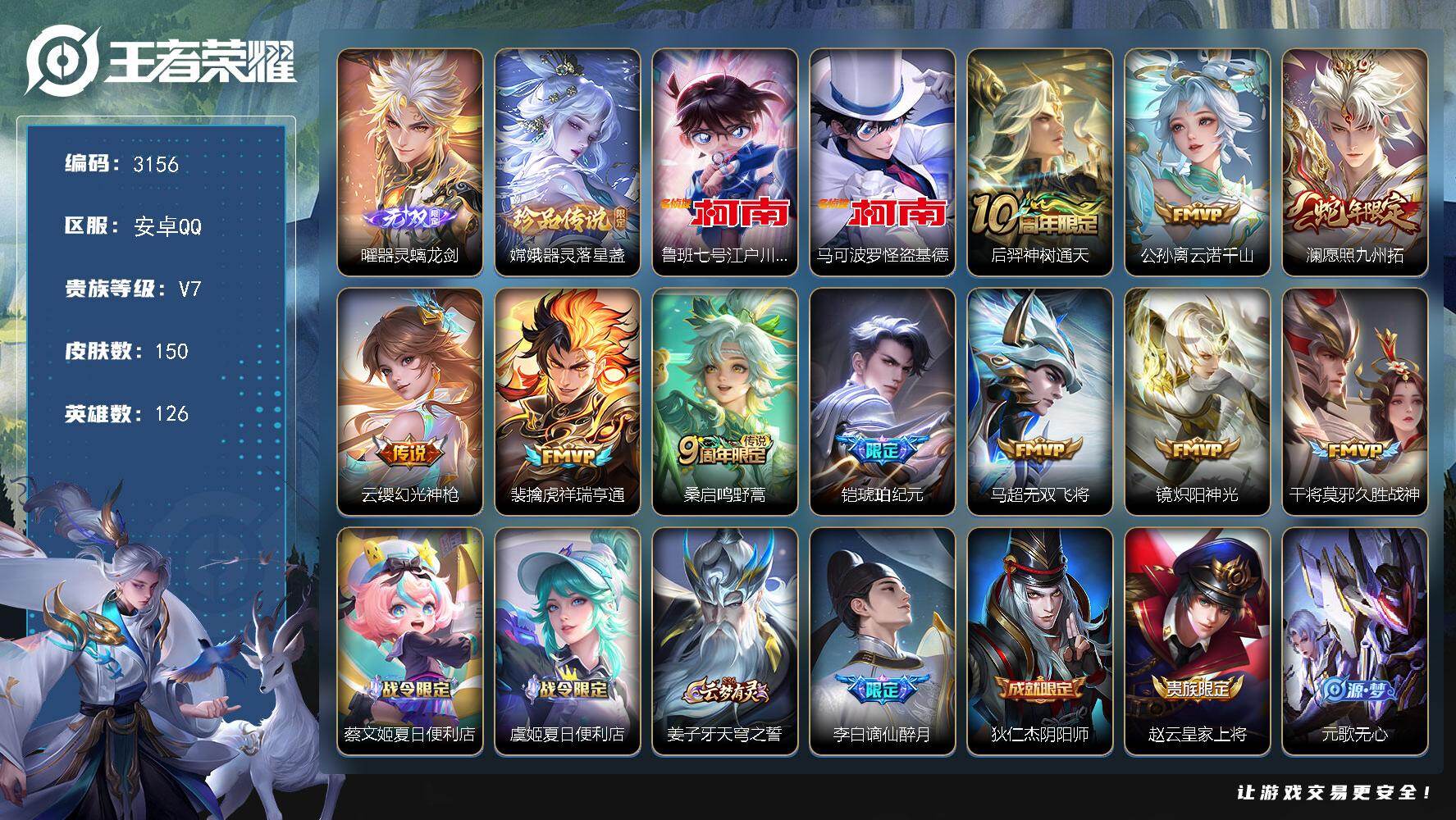 PX_2577000-Q-V7-永恒钻石IV段位-126英雄-150皮肤-1无双-3珍品传说-10传说-48史诗 【无双皮肤】:曜器灵螭龙剑 【珍品传说】:嫦娥器灵落星盏,鲁班七号江户川柯南,马可波罗怪盗基德 【传说皮肤】:后羿神树通天,公孙离云诺千山,澜愿照九州拓,云缨幻光神枪,裴擒虎祥瑞亨通,桑启鸣野蒿,铠琥珀纪元,马超无双飞将,镜炽阳神光,干将莫邪久胜战神 【限定皮肤】:蔡文姬夏日便利店,虞姬夏日便利店,姜子牙天穹之誓,李白谪仙醉月,狄仁杰阴阳师,赵云皇家上将,元歌无心,狄仁杰魔术师,达摩沙漠行僧,项羽海滩派对,兰陵王金庭之子,李元芳云中旅人,女娲朔望之晖,鬼谷子五谷丰年,沈梦溪大漠名商,裴擒虎擒涛扼浪,狂铁电玩高手,上官婉儿神器万象笔,鲁班大师探海日志,桑启海盐诗旅,艾琳流音漫舞,司空震地狱燃心,阿古朵江河有灵,张良古海寻踪,蒙犽百解令,鬼谷子天穹祈灯,铠琥珀纪元,姬小满妄想食味,沈梦溪龙舞盛年,鲁班七号蔬乡物语,李元芳蔬乡物语,刘邦剑破天穹,镜青焰无极,项羽苍威无极,周瑜熔金海岸 【年限皮肤】:澜愿照九州拓 【赛季限定】:达摩沙漠行僧,兰陵王金庭之子,沈梦溪大漠名商,李元芳云中旅人,桑启海盐诗旅,裴擒虎擒涛扼浪,鲁班大师探海日志,张良古海寻踪,鬼谷子天穹祈灯,刘邦剑破天穹,姜子牙天穹之誓,东皇太一噬灭天穹,太乙真人谧流熔炉,甄姬逆浪荇歌,亚瑟荣光之誓 【战令限定】:女娲朔望之晖,狂铁电玩高手,司空震地狱燃心,艾琳流音漫舞,鲁班七号蔬乡物语,李元芳蔬乡物语,镜青焰无极,项羽苍威无极,蔡文姬夏日便利店,虞姬夏日便利店,亚连破空之剑,孙悟空神迹守卫,百里守约百相守梦,老夫子百相守梦,孙膑茶境仙,马超访茗客 【史诗皮肤】:女娲万灵启世,公孙离涂山容容,黄忠百相守梦,狂铁龙之律动,孙膑茶境仙,百里守约百相守梦,李白谪仙醉月,马可波罗星界特工,亚连破空之剑,姬小满战舞者,蔡文姬夏日便利店,镜青焰无极,鲁班七号蔬乡物语,姬小满妄想食味,蒙犽百解令,阿古朵江河有灵,司空震地狱燃心,元歌无心,上官婉儿神器万象笔,鬼谷子五谷丰年,弈星滕王阁序,狂铁电玩高手,哪吒雪上飞焰,钟馗乐园奇幻夜,小乔青蛇,狄仁杰鹰眼统帅,伽罗箭羽风息,孙策猫狗日记,阿轲节奏热浪,白起星夜王子,李元芳逐浪之夏,安琪拉心灵骇客,雅典娜冰冠公主,亚瑟心灵战警,兰陵王暗隐猎兽者,夏侯惇乘风破浪,花木兰水晶猎龙者,张飞乱世虎臣