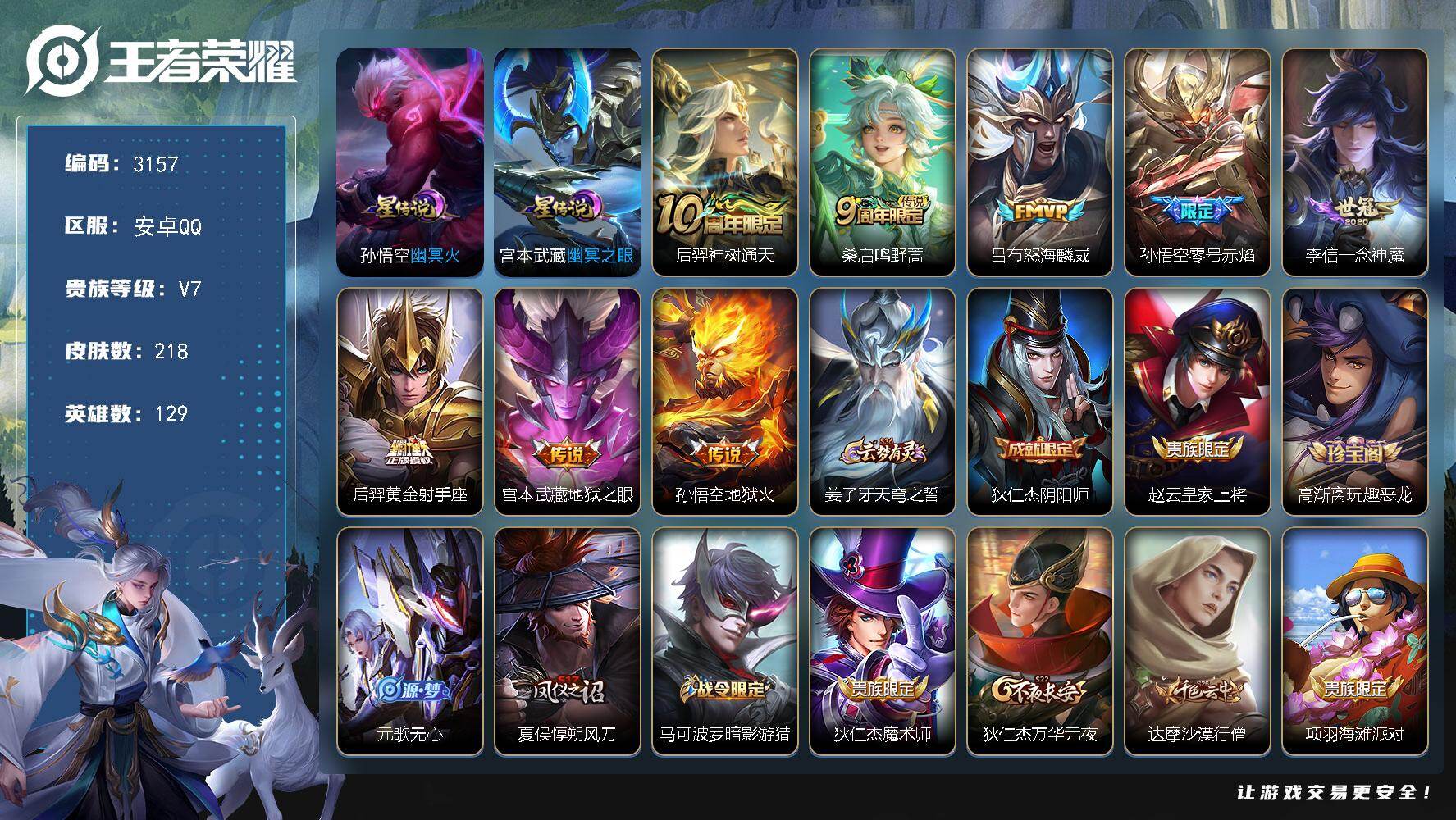 PX_2577001-幽冥火幽冥之眼安卓Q-V7-永恒钻石I段位-129英雄-218皮肤-8传说-59史诗 【英雄全皮】:敖隐全皮 【传说皮肤】:后羿神树通天,桑启鸣野蒿,吕布怒海麟威,孙悟空零号赤焰,李信一念神魔,后羿黄金射手座,宫本武藏地狱之眼,孙悟空地狱火 【限定皮肤】:姜子牙天穹之誓,狄仁杰阴阳师,赵云皇家上将,高渐离玩趣恶龙,元歌无心,夏侯惇朔风刀,马可波罗暗影游猎,狄仁杰魔术师,狄仁杰万华元夜,达摩沙漠行僧,项羽海滩派对,老夫子醍醐杖,关羽冰锋战神,程咬金演武夺筹,韩信傲雪梅枪,兰陵王金庭之子,孙悟空大圣娶亲,孙悟空零号赤焰,李元芳云中旅人,钟馗驱傩正仪,雅典娜单词大作战,鬼谷子原初探秘者,鬼谷子五谷丰年,苏烈千军破阵,百里玄策原初追逐者,弈星混沌棋,梦奇顽趣,沈梦溪大漠名商,明世隐疑决卦,裴擒虎李小龙,裴擒虎擒涛扼浪,云中君纤云弄巧,猪八戒西部大镖客,上官婉儿梁祝,嫦娥拒霜思,蒙犽狂想玩偶喵,鲁班大师探海日志,桑启海盐诗旅,艾琳女武神,阿古朵江河有灵,张良古海寻踪,蒙恬荣光圣徽,鬼谷子天穹祈灯,沈梦溪龙舞盛年,刘邦剑破天穹,程咬金群星魔术团 【赛季限定】:夏侯惇朔风刀,弈星混沌棋,明世隐疑决卦,老夫子醍醐杖,鬼谷子原初探秘者,狄仁杰万华元夜,程咬金演武夺筹,钟馗驱傩正仪,苏烈千军破阵,达摩沙漠行僧,兰陵王金庭之子,沈梦溪大漠名商,李元芳云中旅人,桑启海盐诗旅,裴擒虎擒涛扼浪,鲁班大师探海日志,张良古海寻踪,鬼谷子天穹祈灯,刘邦剑破天穹,姜子牙天穹之誓,东皇太一噬灭天穹,太乙真人谧流熔炉,钟馗虚灵犬护,甄姬逆浪荇歌,亚瑟荣光之誓,百里玄策原初追逐者,梦奇顽趣,蒙恬荣光圣徽,牛魔星界战将 【战令限定】:马可波罗暗影游猎,猪八戒西部大镖客,蒙犽狂想玩偶喵,雅典娜单词大作战,莱西奥光弋星穹,明世隐往忆晖光,周瑜线条小狗 【史诗皮肤】:周瑜线条小狗,女娲万灵启世,莱西奥光弋星穹,黄忠百相守梦,狂铁龙之律动,弈星万物之道,牛魔星界战将,蒙恬荣光圣徽,阿古朵江河有灵,梦奇顽趣,元歌无心,鬼谷子五谷丰年,韩信傲雪梅枪,嫦娥拒霜思,司马懿暗渊魔法,百里玄策热力回旋,云中君纤云弄巧,裴擒虎李小龙,百里玄策原初追逐者,蒙犽狂想玩偶喵,马可波罗暗影游猎,上官婉儿梁祝,狄仁杰鹰眼统帅,伽罗箭羽风息,孙悟空大圣娶亲,白起星夜王子,程咬金功夫厨神,李元芳逐浪之夏,刘禅天才门将,蔡文姬舞动绿茵,铠曙