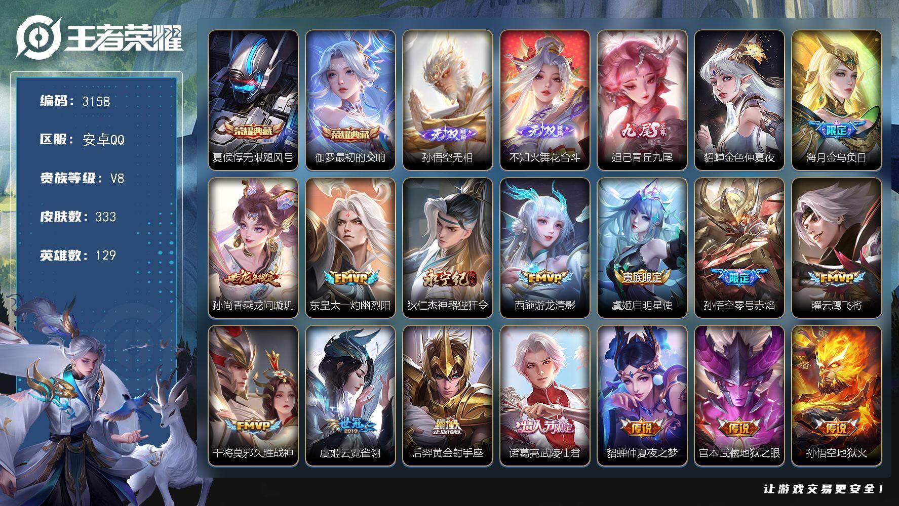 PX_2577007-Q-V8-永恒钻石IV段位-129英雄-333皮肤-2典藏皮肤-3无双-15传说-98史诗 【英雄全皮】:敖隐全皮,蒙恬全皮,莱西奥全皮,戈娅全皮,海诺全皮 【荣耀典藏】:夏侯惇无限飓风号,伽罗最初的交响 【无双皮肤】:孙悟空无相,不知火舞花合斗,妲己青丘九尾 【传说皮肤】:海月金乌负日,孙尚香乘龙问璇玑,东皇太一灼幽烈阳,狄仁杰神器狴犴令,西施游龙清影,虞姬启明星使,孙悟空零号赤焰,曜云鹰飞将,干将莫邪久胜战神,虞姬云霓雀翎,后羿黄金射手座,诸葛亮武陵仙君,貂蝉仲夏夜之梦,宫本武藏地狱之眼,孙悟空地狱火 【限定皮肤】:白起狰,大乔绒语心约,虞姬夏日便利店,姜子牙天穹之誓,杨戬破阵退雄兵,狄仁杰阴阳师,赵云皇家上将,赵云百木心枪,嬴政优雅恋人,孙尚香蔷薇恋人,高渐离死亡摇滚,扁鹊奇幻香踪,吕布御风骁将,元歌云间偶戏,元歌无心,夏侯惇朔风刀,曹操烛龙,典韦穷奇,典韦蓝屏警告,马可波罗暗影游猎,狄仁杰魔术师,狄仁杰万华元夜,狄仁杰神器狴犴令,达摩沙漠行僧,项羽海滩派对,老夫子醍醐杖,程咬金演武夺筹,韩信傲雪梅枪,兰陵王金庭之子,花木兰青春决赛季,亚瑟潮玩骑士王,孙悟空零号赤焰,孙悟空孙行者,李元芳匿光侦查者,李元芳云中旅人,虞姬启明星使,钟馗驱傩正仪,杨戬潮玩骑兵,雅典娜单词大作战,太乙真人饕餮,鬼谷子原初探秘者,鬼谷子五谷丰年,诸葛亮武陵仙君,苏烈千军破阵,百里玄策原初追逐者,百里守约朱雀志,弈星混沌棋,公孙离玉兔公主,沈梦溪大漠名商,明世隐疑决卦,裴擒虎李小龙,裴擒虎擒涛扼浪,狂铁御狮,米莱狄御霄,云中君纤云弄巧,云中君时之祈愿,盾山御銮,猪八戒西部大镖客,上官婉儿梁祝,嫦娥拒霜思,西施玲珑珍味,蒙犽狂想玩偶喵,鲁班大师探海日志,镜匿光追影者,桑启海盐诗旅,戈娅驭风魔法,艾琳流音漫舞,司空震地狱燃心,阿古朵江河有灵,张良古海寻踪,蒙犽百解令,蒙恬荣光圣徽,高渐离燃音魔法,妲己灵卜魔法,鬼谷子天穹祈灯,姬小满妄想食味,安琪拉乘龙聚宝船,孙尚香乘龙问璇玑,沈梦溪龙舞盛年,鲁班七号蔬乡物语,李元芳蔬乡物语,海月金乌负日,刘邦剑破天穹,程咬金群星魔术团,关羽决胜骁骑,镜青焰无极,项羽苍威无极,海诺心动手记,芈月浮光幕影,周瑜熔金海岸,不知火舞花合斗 【年限皮肤】:百里守约朱雀志,吕布御风骁将,孙尚香乘龙问璇玑,安琪拉乘龙聚宝船 【赛季限定】:白起狰,太乙真人饕餮,曹操