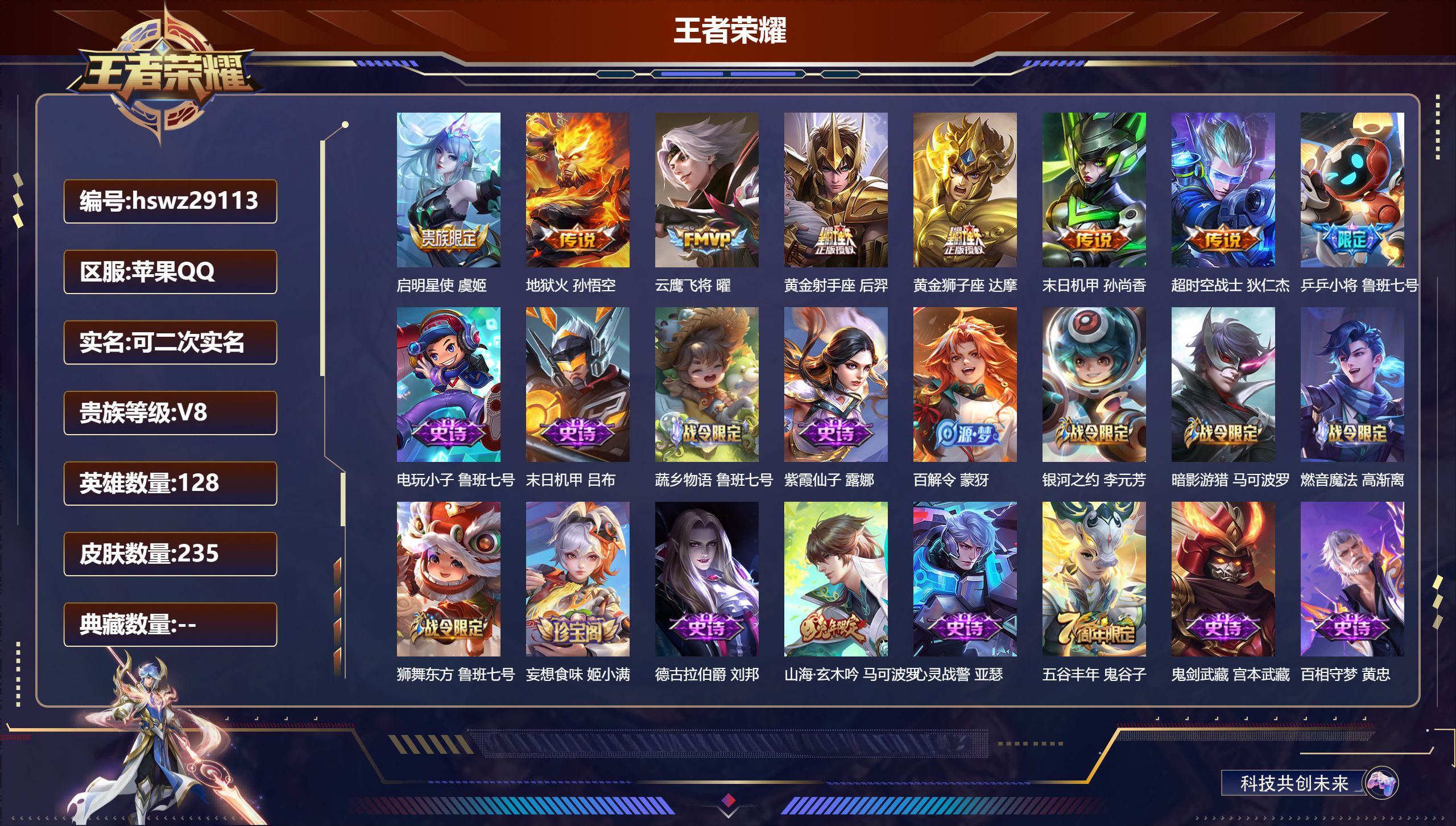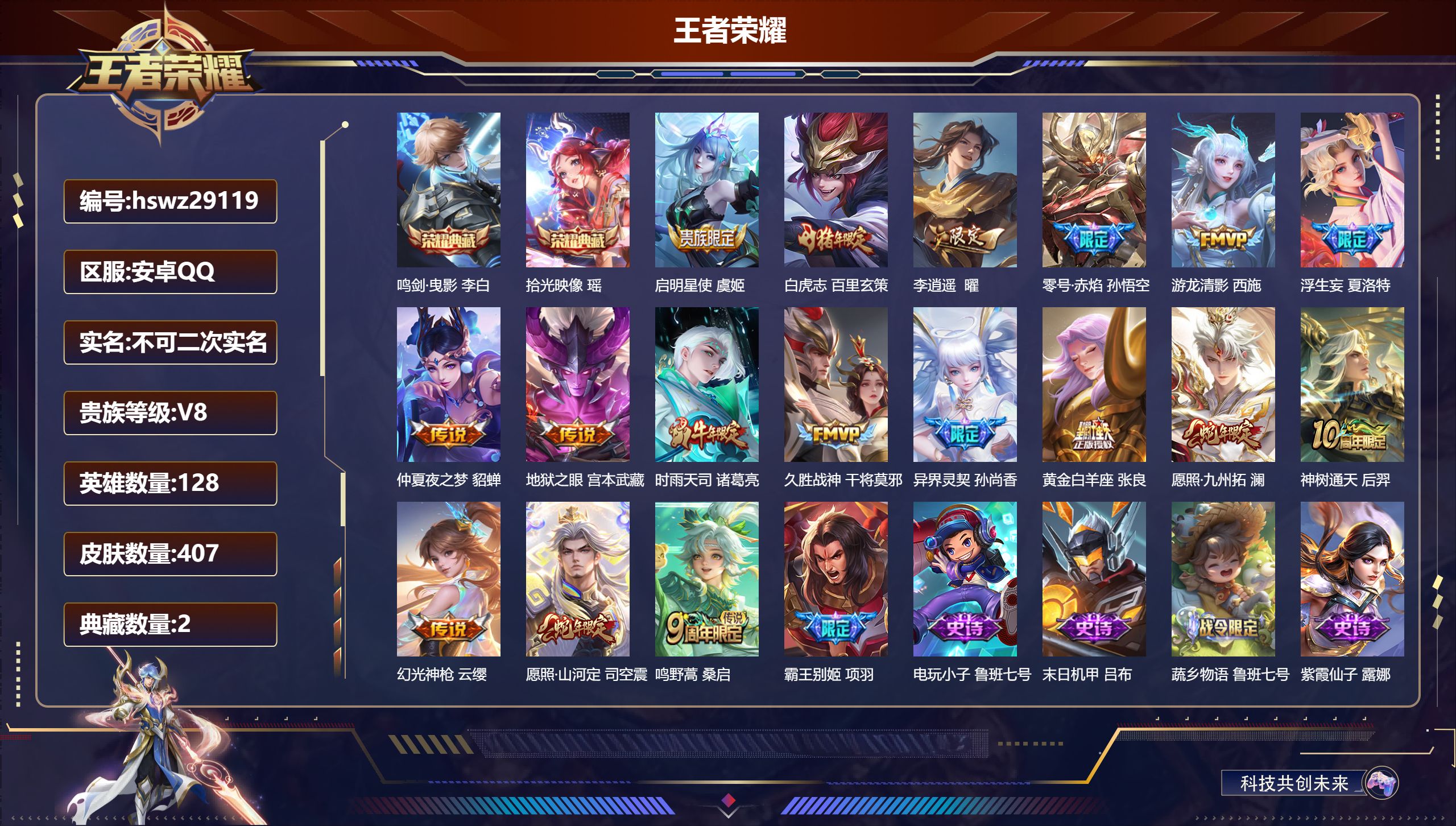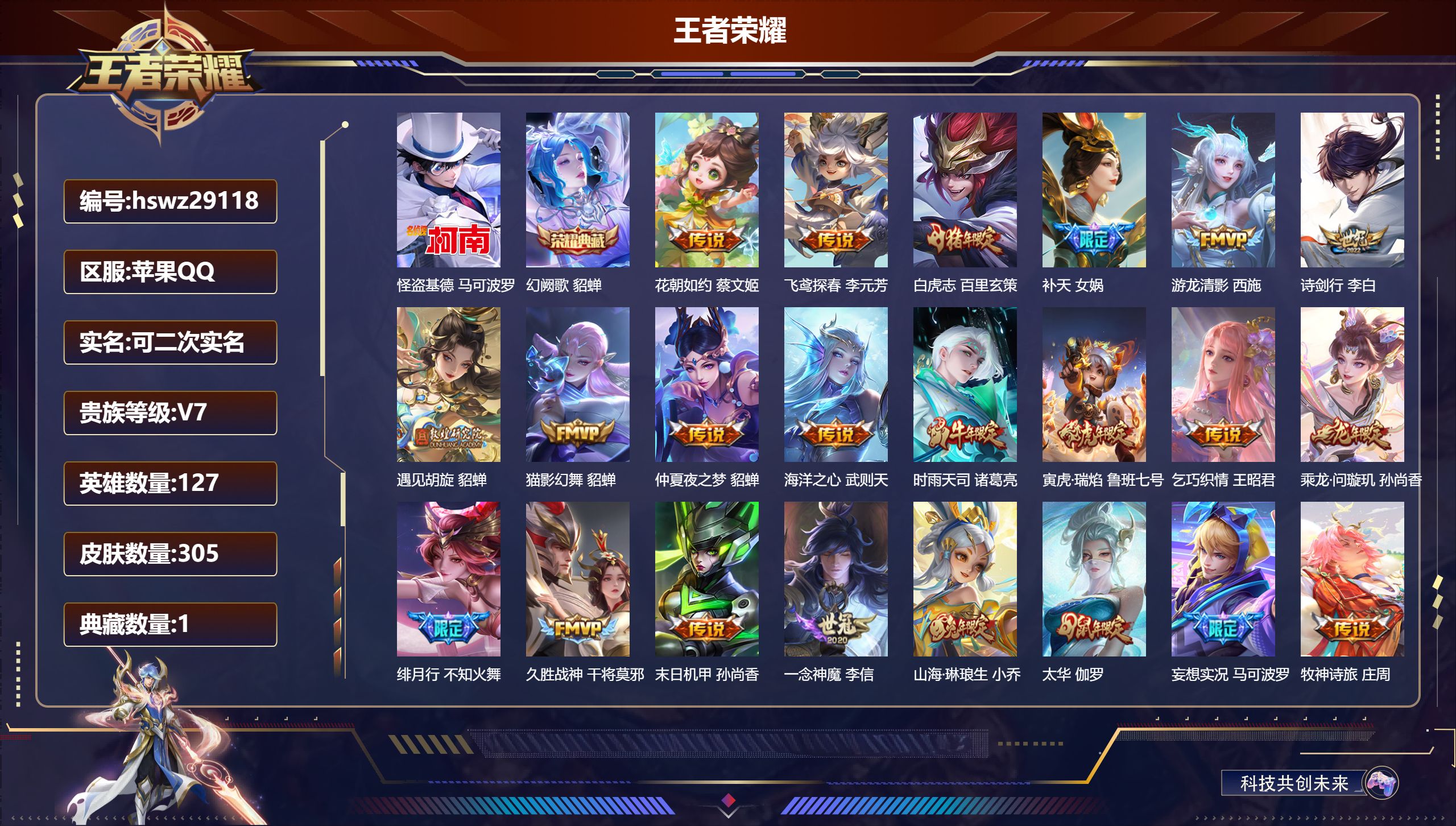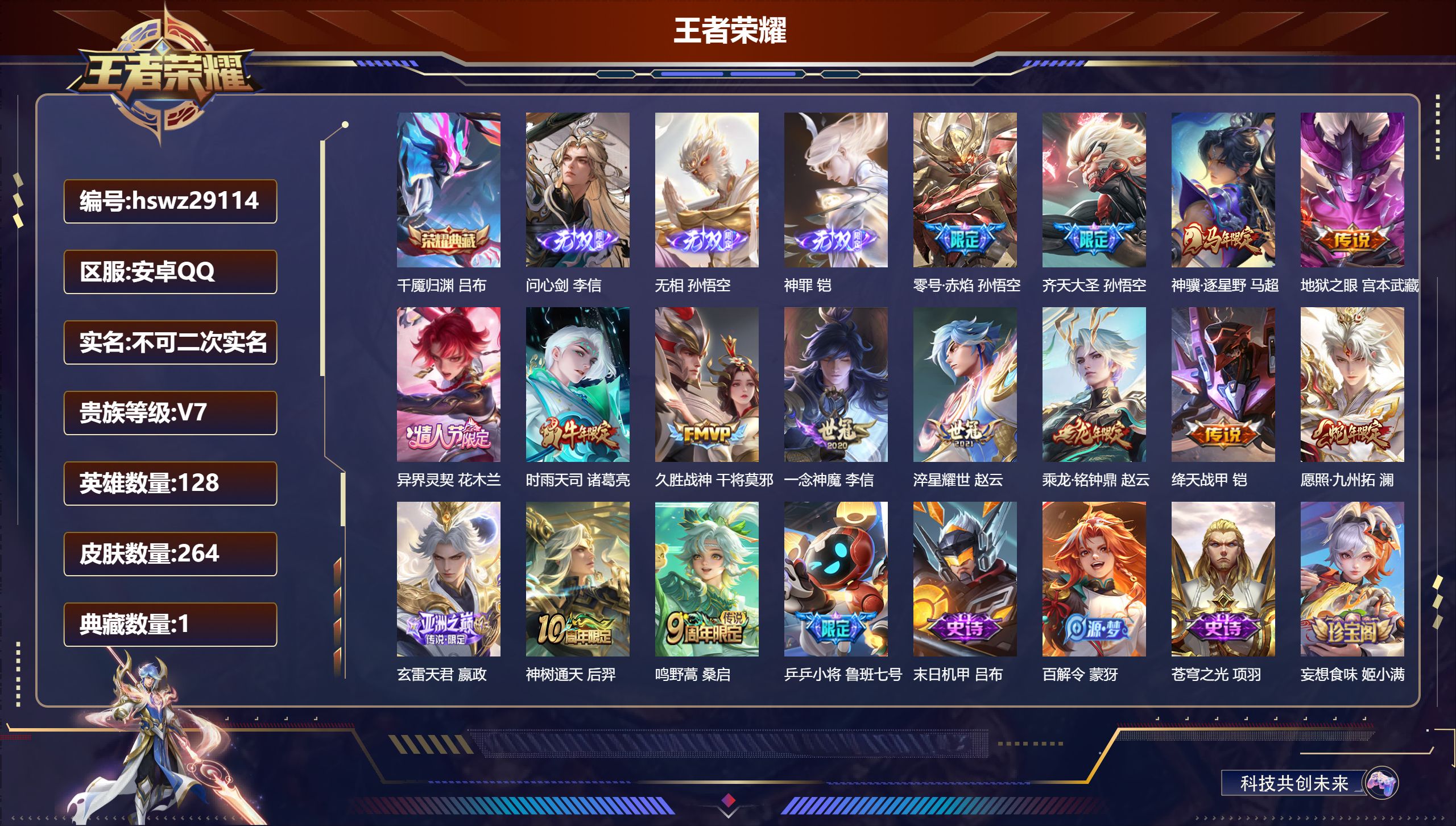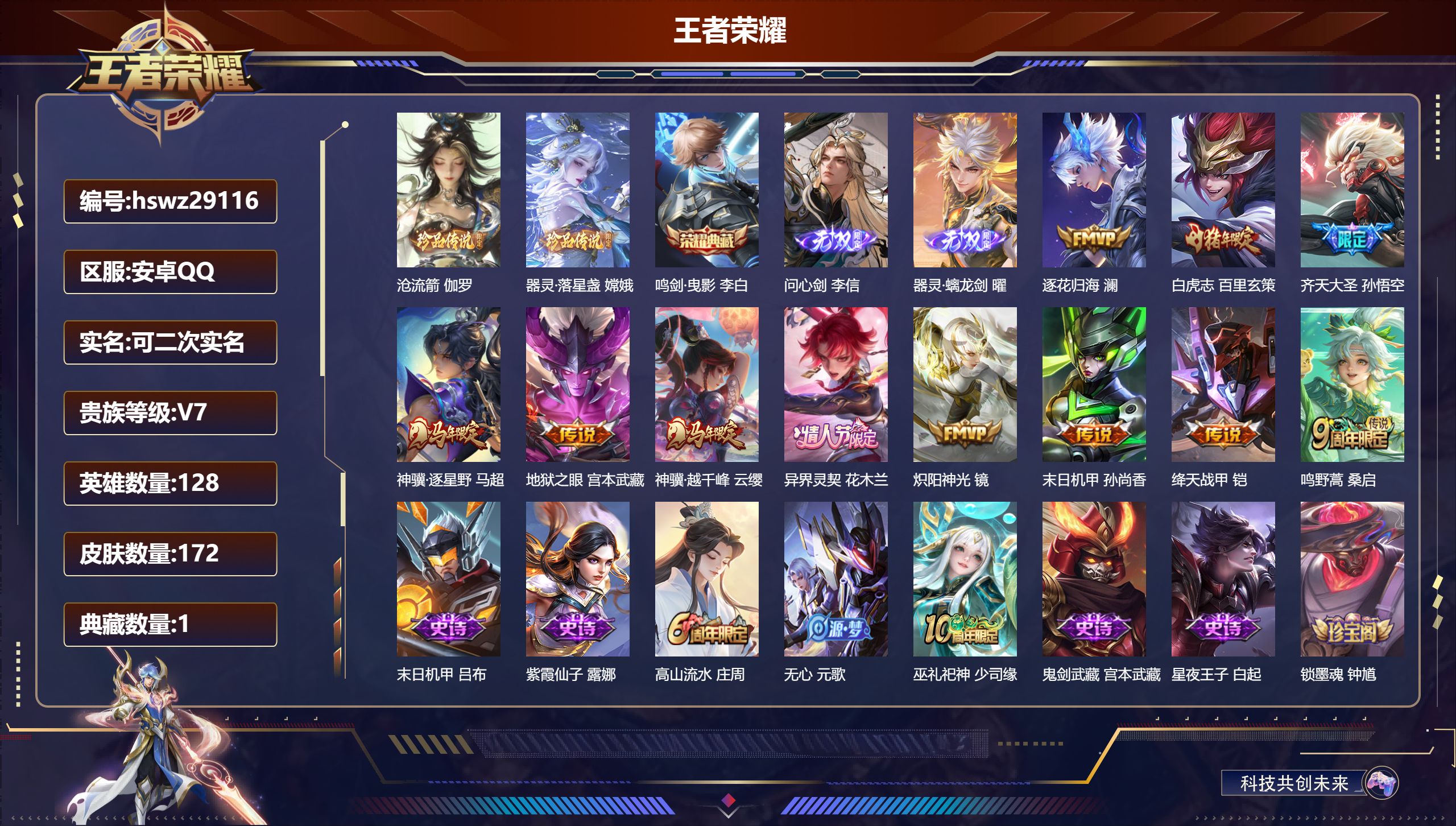 PX_2577006-Q/至尊星耀/172皮肤/128英雄/1典藏/0珍品无双/2无双/2珍品传说/11传说/52史诗/8稀有英雄 【2,珍品传说】沧流箭,伽罗,器灵·落星盏,嫦娥, 【1,典藏皮肤】鸣剑·曳影,李白, 【2,无双皮肤】问心剑,李信,器灵·螭龙剑,曜, 【11,传说皮肤】逐花归海,澜,白虎志,百里玄策,齐天大圣,孙悟空,神骥·逐星野,马超,地狱之眼,宫本武藏,神骥·越千峰,云缨,异界灵契,花木兰,炽阳神光,镜,末日机甲,孙尚香,绛天战甲,铠,鸣野蒿,桑启, 【52,史诗皮肤】末日机甲,吕布,紫霞仙子,露娜,高山流水,庄周,无心,元歌,巫礼祀神,少司缘,鬼剑武藏,宫本武藏,星夜王子,白起,锁墨魂,钟馗,线条小狗,周瑜,百晓客,明世隐,遇见飞天,杨玉环,摇滚巨星,嬴政,修罗,橘右京,魅力维加斯,妲己,黄金分割率,诸葛亮,霸王别姬,虞姬,女仆咖啡,妲己,舞动绿茵,蔡文姬,繁星吟游,蔡文姬,鹰眼统帅,狄仁杰,大圣娶亲,孙悟空,李小龙,裴擒虎,光弋星穹,莱西奥,纤云弄巧,云中君,如梦令,后羿,金属风暴,墨子,猫狗日记,孙策,逐浪之夏,李元芳,未来纪元,赵云,灵蛊蚀心,扁鹊,魔术师,狄仁杰,龙之律动,狂铁,顽岩魄,蒙犽,皇家上将,赵云,冰冠公主,雅典娜,水晶猎龙者,花木兰,涂山容容,公孙离,夏日便利店,蔡文姬,岱宗,典韦,星界战将,牛魔,蔷薇恋人,孙尚香,航海奇遇记,老夫子,千年之狐,李白,节奏热浪,阿轲,万灵启世,女娲,箭羽风息,伽罗,乱世虎臣,张飞,百相守梦,周瑜,天穹守望者,后羿,线条小狗,小乔,水果甜心,孙尚香,乘风破浪,夏侯惇, 【78,勇者皮肤】沙漠行僧,达摩,纽约教父,刘备,拳王,达摩,大发明家,达摩,龙舞盛年,沈梦溪,功夫炙烤,廉颇,沉稳之力,孙尚香,醍醐杖,老夫子,汉昭烈帝,刘备,白色死神,白起,黑桃队长,鲁班七号,御旌,牛魔,阴阳师,狄仁杰,径山谋武,孙权,次元突破,哪吒,功夫老勺,老夫子,鲨炮海盗猫,沈梦溪,海滩派对,项羽,万华元夜,狄仁杰,踏浪烽翎,莱西奥,演武夺筹,程咬金,瓷语鉴心,露娜,百相守梦,影,原初探秘者,鬼谷子,潮玩探月行,猪八戒,鸿运当头,亚瑟,天穹祈灯,鬼谷子,疑决卦,明世隐,阿尔法小队,后羿,次元傲视,杨戬,星际陆战队,程咬金,雾影缉谜,兰陵王,死亡骑士,亚瑟,破局者,亚连,玩偶对对碰,安琪拉,海滩丽影,钟无艳,忍·炎影,赵云,唤灵魔甲,刘禅,万事如意,刘备,乓乓大师,鲁班大师,溯影追猎,虞姬,极光幻客,蚩奼,兔女郎,花木兰,龙腾万里,关羽,未来纪元,宫本武藏,罗小黑战记,哪吒,千军破阵,苏烈,往忆晖光,明世隐,荣光之誓,亚瑟,花好人间,甄姬,万象初新,宫本武藏,御銮,盾山,秘密基地,刘禅,教廷特使,韩信,街头霸王,韩信,西部大镖客,孙悟空,紫罗兰之誓,妲己,神迹守卫,墨子,混沌棋,弈星,御霄,米莱狄,绒语心约,大乔,幻想奇妙夜,王昭君,驱傩正仪,钟馗,命运角斗场,狂铁,神迹守卫,孙悟空,剑破天穹,刘邦,熔金海岸,周瑜,天穹之誓,姜子牙,星梦巡礼,姜子牙,群星魔术团,程咬金,经纬探寻者,盘古,暗都幽影,大司命,鹤鸣心笺,艾琳,云械蓝图,云中君,逆浪荇歌,甄姬,百相守梦,孙策,海之女神,海月,线条小狗,周瑜, 【30,其他皮肤】沧流箭,伽罗,金属狂潮,高渐离,圣殿之光,刘邦,潮流仙人,老夫子,棒球奇才,沈梦溪,龙域领主,铠,生化警戒,钟无艳,超能战警,曹操,未来旅行,孙膑,灼热之刃,李信,精灵王,后羿,星航指挥官,诸葛亮,魇语军师,司马懿,启蛰,司空震,隐刃,兰陵王,东海龙王,东皇太一,范海辛,李白,占星师,明世隐,激情绿茵,马可波罗,尼罗河女神,女娲,锦衣卫,狄仁杰,归虚梦演,曜,荷鲁斯之眼,云中君,创世神祝,盘古,森,瑶,孤猎,澜,赤焰之缨,云缨,天启骑士,关羽,西部大镖客,孙悟空,器灵·落星盏,嫦娥, 【8,稀有英雄】嬴政,不知火舞,橘右京,夏洛特,娜可露露,韩信,艾琳,赵云, 营地ID:,