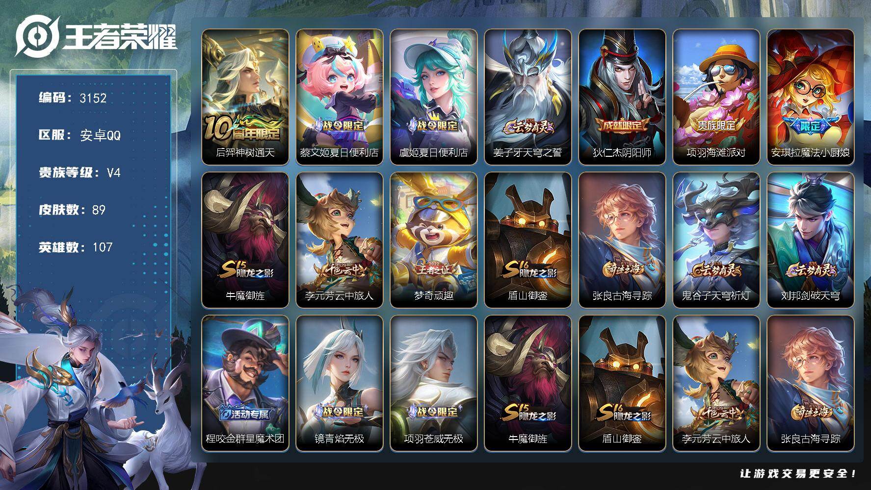 PX_2576983-,市标杨玉环,妲己,王昭君,安卓Q-V4-永恒钻石III段位-107英雄-89皮肤-1传说-19史诗 【传说皮肤】:后羿神树通天 【限定皮肤】:蔡文姬夏日便利店,虞姬夏日便利店,姜子牙天穹之誓,狄仁杰阴阳师,项羽海滩派对,安琪拉魔法小厨娘,牛魔御旌,李元芳云中旅人,梦奇顽趣,盾山御銮,张良古海寻踪,鬼谷子天穹祈灯,刘邦剑破天穹,程咬金群星魔术团,镜青焰无极,项羽苍威无极 【赛季限定】:牛魔御旌,盾山御銮,李元芳云中旅人,张良古海寻踪,鬼谷子天穹祈灯,刘邦剑破天穹,姜子牙天穹之誓,东皇太一噬灭天穹,太乙真人谧流熔炉,钟馗虚灵犬护,甄姬逆浪荇歌,亚瑟荣光之誓,梦奇顽趣,牛魔星界战将,项羽九幽镇关 【战令限定】:镜青焰无极,项羽苍威无极,蔡文姬夏日便利店,虞姬夏日便利店,周瑜线条小狗 【史诗皮肤】:周瑜线条小狗,项羽九幽镇关,女娲万灵启世,牛魔星界战将,蔡文姬夏日便利店,镜青焰无极,梦奇顽趣,狄仁杰鹰眼统帅,阿轲节奏热浪,刘禅天才门将,蔡文姬舞动绿茵,安琪拉心灵骇客,亚瑟心灵战警,安琪拉魔法小厨娘,曹操幽灵船长,妲己魅力维加斯,嬴政摇滚巨星,孙尚香水果甜心,王昭君偶像歌手,甄姬冰雪圆舞曲 【其他皮肤】:艾琳鹤鸣心笺,亚瑟荣光之誓,甄姬逆浪荇歌,张良灵野札记,钟馗虚灵犬护,西施雪境奇遇,太乙真人谧流熔炉,苍苍林狼骑,东皇太一噬灭天穹,虞姬夏日便利店,姜子牙天穹之誓,貂蝉长夏之忆,项羽苍威无极,程咬金群星魔术团,刘邦剑破天穹,鬼谷子天穹祈灯,后羿完美运算,张良古海寻踪,李元芳云中旅人,盾山御銮,牛魔御旌,大乔守护之力,孙尚香沉稳之力,王昭君幻想奇妙夜,狄仁杰阴阳师,甄姬花好人间,花木兰兔女郎,达摩拳王,亚瑟死亡骑士,典韦黄金武士,妲己少女阿狸,姜子牙时尚教父,安琪拉玩偶对对碰,扁鹊救世之瞳,武则天东方不败,白起白色死神,芈月红桃皇后,项羽海滩派对,金蝉前尘,阿古朵熊喵少女,镜冰刃幻境,西施归虚梦演,马超幸存者,瑶森,猪八戒年年有余,嫦娥露花倒影,上官婉儿修竹墨客,沈梦溪棒球奇才,米莱狄精准探案法,杨玉环霓裳曲,明世隐占星师,女娲尼罗河女神,铠龙域领主,鬼谷子阿摩司公爵,干将莫邪第七人偶,哪吒三太子,太乙真人圆桌骑士,苍维京掠夺者,蔡文姬蔷薇王座,虞姬加勒比小姐,小乔万圣前夜,张良一千零一夜,狄仁杰锦衣卫,王昭君精灵公主,花木兰剑舞者,钟无艳生化警戒,鲁班七号木偶奇遇记,