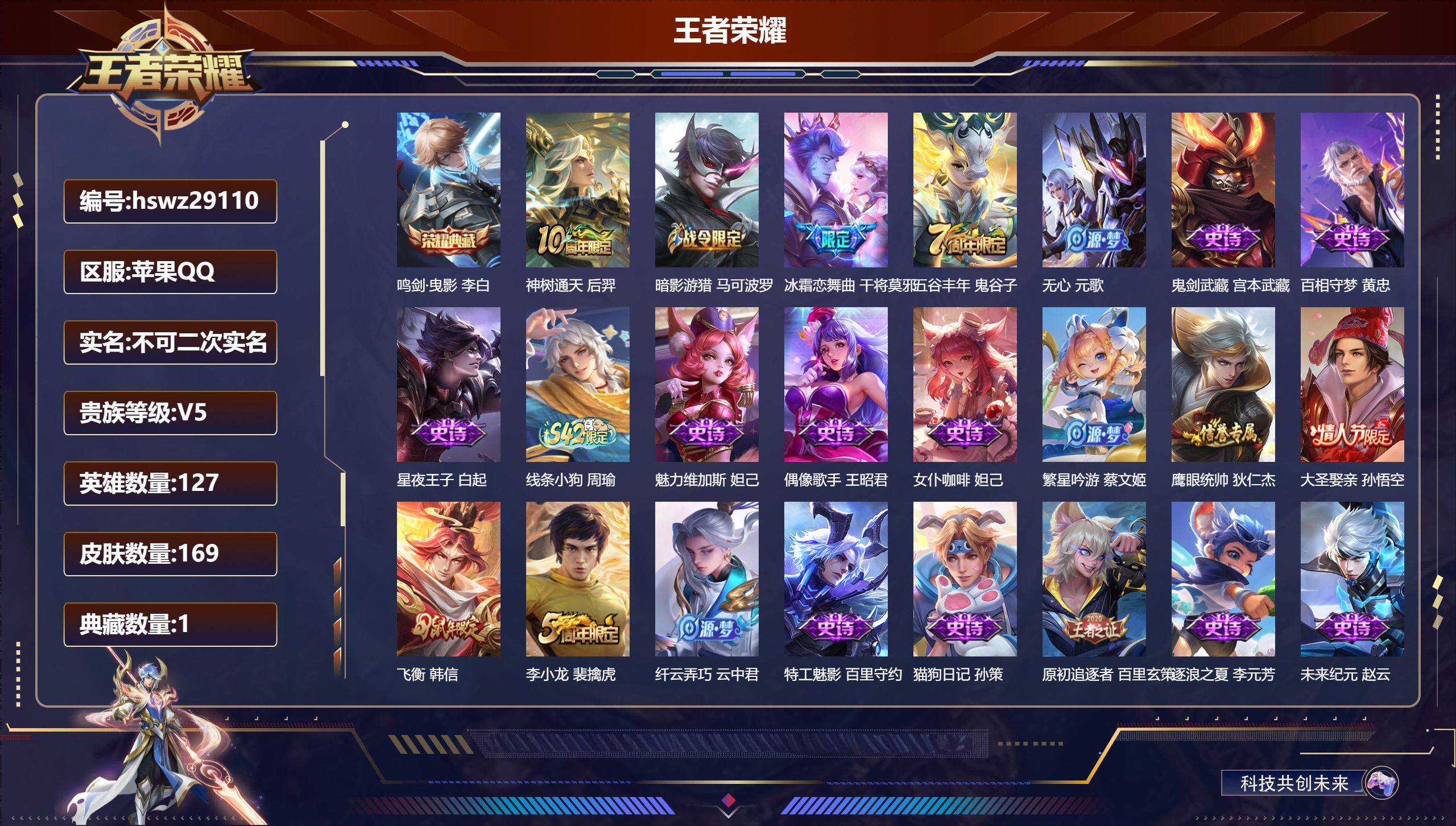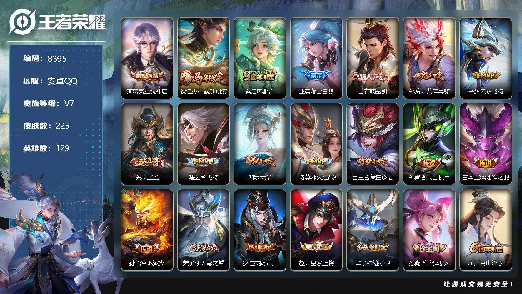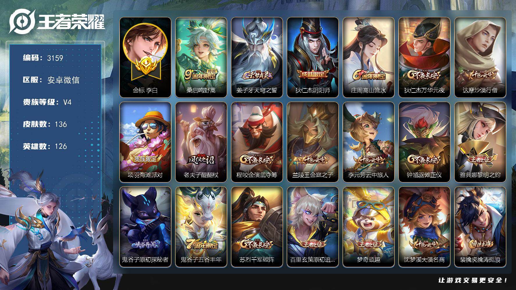 PX_2576996-Q-V7-至尊星耀III段位-123英雄-159皮肤-1无双-7传说-36史诗 【无双皮肤】:曜器灵螭龙剑 【传说皮肤】:澜愿照九州拓,桑启鸣野蒿,瑶时之祈愿,裴擒虎寅虎赤拳,诸葛亮时雨天司,曜云鹰飞将,李白凤求凰 【限定皮肤】:白起狰,狄仁杰阴阳师,虞姬凯尔特女王,赵云皇家上将,嬴政优雅恋人,高渐离死亡摇滚,扁鹊炼金王,芈月重明,周瑜赤莲之焰,元歌云间偶戏,元歌无心,夏侯惇朔风刀,曹操烛龙,马可波罗暗影游猎,狄仁杰魔术师,狄仁杰万华元夜,达摩沙漠行僧,项羽海滩派对,老夫子醍醐杖,程咬金演武夺筹,露娜一生所爱,韩信傲雪梅枪,兰陵王驯魔猎人,兰陵王金庭之子,亚瑟潮玩骑士王,孙悟空至尊宝,牛魔御旌,李元芳云中旅人,钟馗驱傩正仪,干将莫邪冰霜恋舞曲,蔡文姬繁星吟游,太乙真人饕餮,鬼谷子原初探秘者,鬼谷子五谷丰年,诸葛亮时雨天司,百里玄策原初追逐者,弈星混沌棋,沈梦溪大漠名商,明世隐疑决卦,裴擒虎李小龙,裴擒虎寅虎赤拳,裴擒虎擒涛扼浪,狂铁御狮,米莱狄御霄,瑶时之祈愿,云中君纤云弄巧,云中君时之祈愿,盾山御銮,猪八戒西部大镖客,上官婉儿梁祝,鲁班大师探海日志,镜匿光追影者,桑启海盐诗旅,鬼谷子天穹祈灯,刘邦剑破天穹 【年限皮肤】:李白凤求凰,诸葛亮时雨天司,裴擒虎寅虎赤拳,澜愿照九州拓 【赛季限定】:扁鹊炼金王,虞姬凯尔特女王,白起狰,太乙真人饕餮,曹操烛龙,芈月重明,狂铁御狮,米莱狄御霄,牛魔御旌,盾山御銮,夏侯惇朔风刀,弈星混沌棋,明世隐疑决卦,老夫子醍醐杖,鬼谷子原初探秘者,狄仁杰万华元夜,程咬金演武夺筹,钟馗驱傩正仪,达摩沙漠行僧,兰陵王金庭之子,沈梦溪大漠名商,李元芳云中旅人,桑启海盐诗旅,裴擒虎擒涛扼浪,鲁班大师探海日志,鬼谷子天穹祈灯,刘邦剑破天穹,东皇太一噬灭天穹,太乙真人谧流熔炉,百里玄策原初追逐者 【战令限定】:兰陵王驯魔猎人,周瑜赤莲之焰,马可波罗暗影游猎,猪八戒西部大镖客,元歌云间偶戏,亚瑟潮玩骑士王 【史诗皮肤】:阿轲化蝶舞,元歌无心,鬼谷子五谷丰年,云中君时之祈愿,韩信傲雪梅枪,镜匿光追影者,元歌云间偶戏,云中君纤云弄巧,裴擒虎李小龙,百里玄策原初追逐者,马可波罗暗影游猎,蔡文姬繁星吟游,上官婉儿梁祝,兰陵王驯魔猎人,公孙离无限星赏官,狄仁杰鹰眼统帅,露娜一生所爱,干将莫邪冰霜恋舞曲,孙策猫狗日记,蔡文姬舞动绿茵,诸葛亮黄金分割率,兰陵王暗