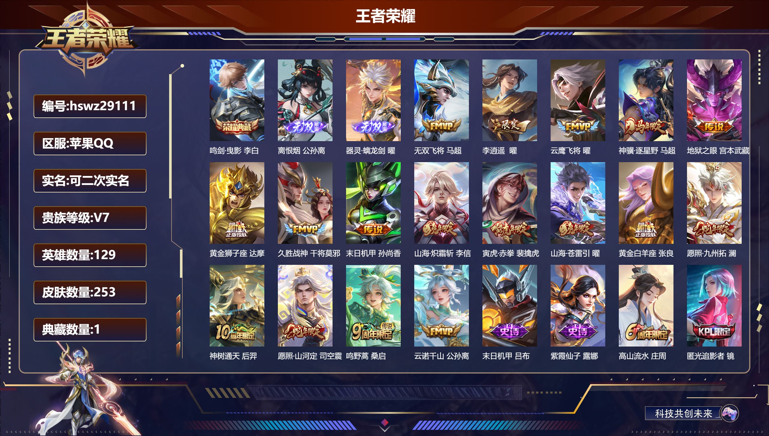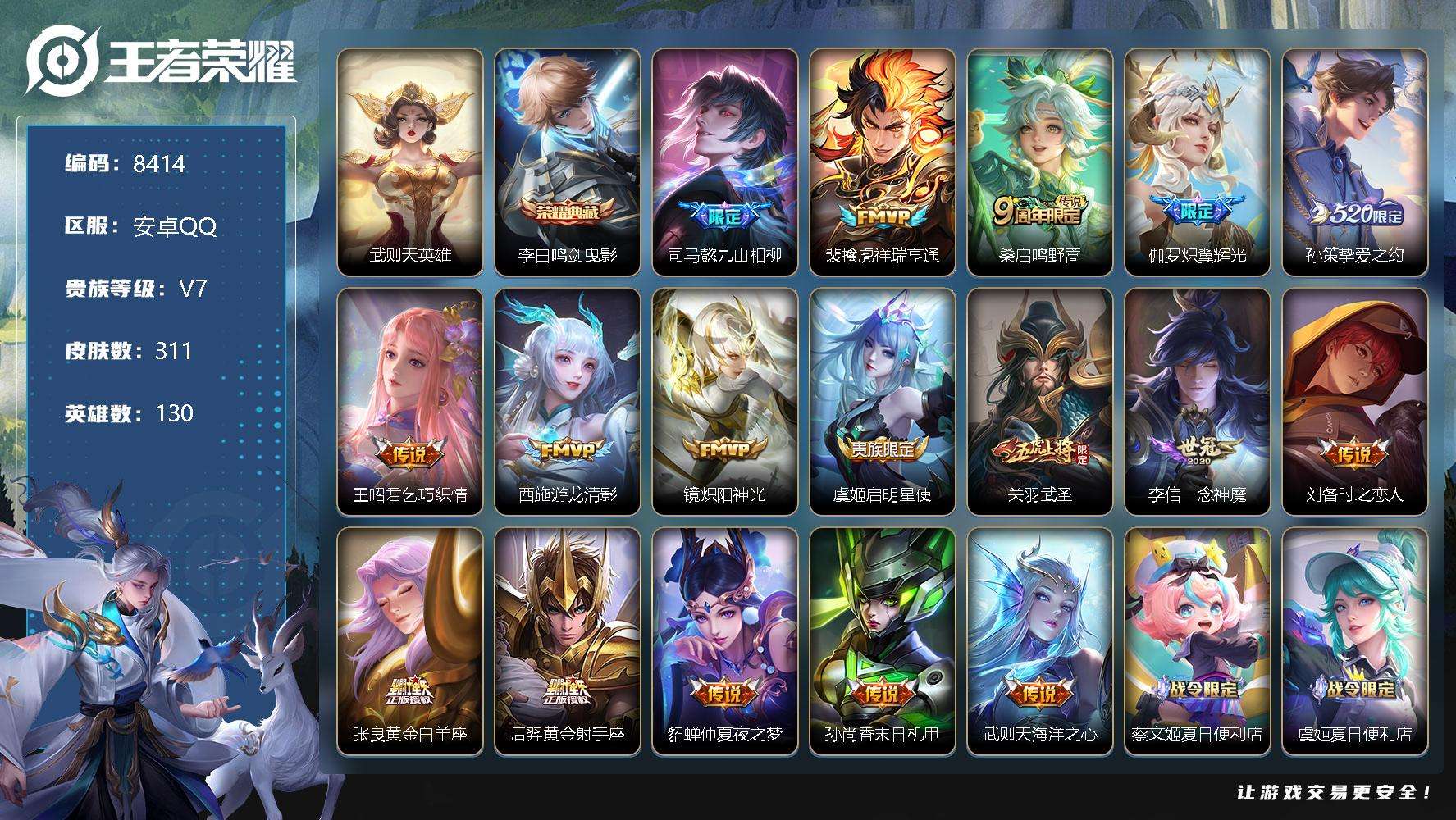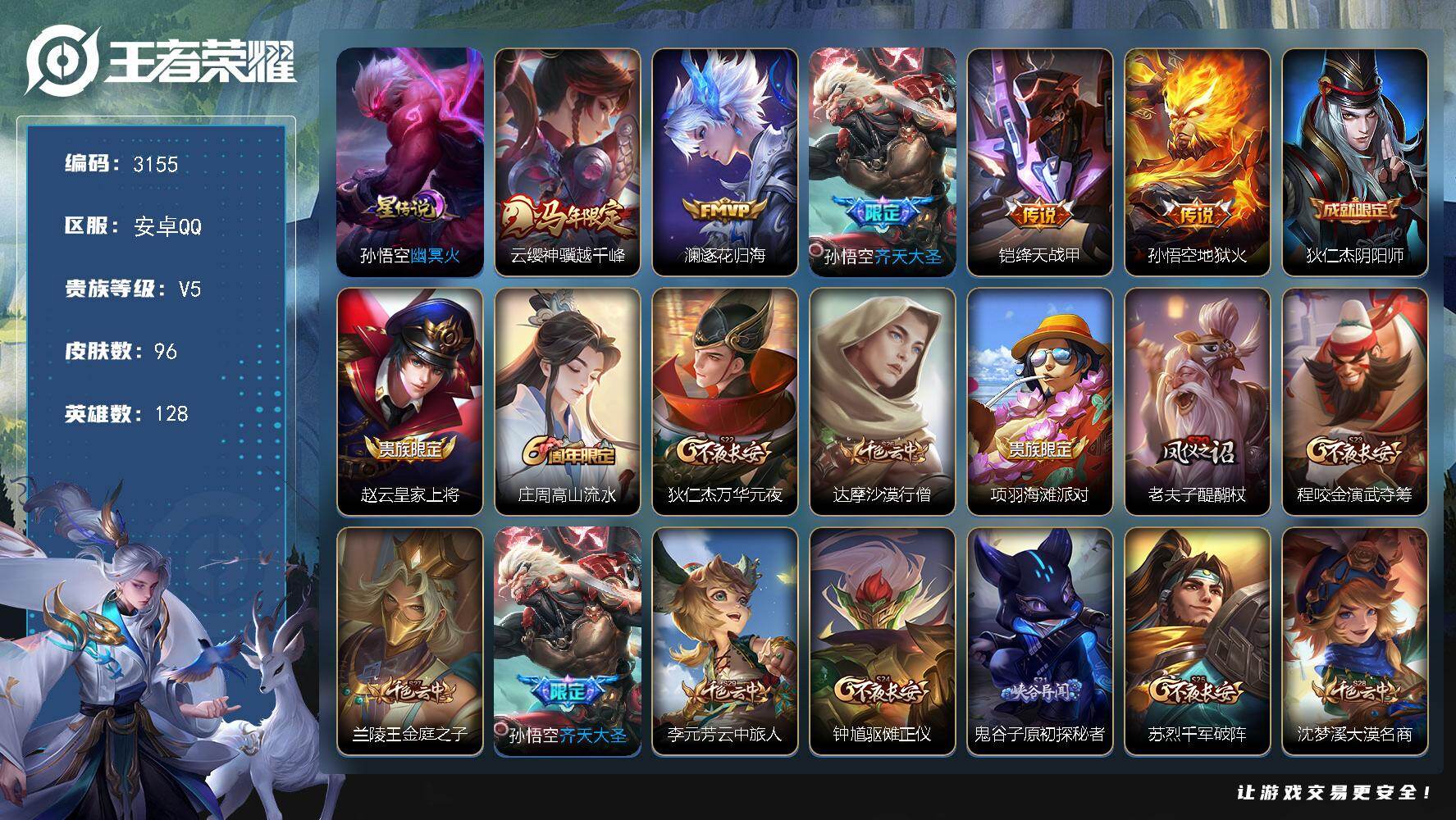 PX_2576996-Q-V7-至尊星耀III段位-123英雄-159皮肤-1无双-7传说-36史诗 【无双皮肤】:曜器灵螭龙剑 【传说皮肤】:澜愿照九州拓,桑启鸣野蒿,瑶时之祈愿,裴擒虎寅虎赤拳,诸葛亮时雨天司,曜云鹰飞将,李白凤求凰 【限定皮肤】:白起狰,狄仁杰阴阳师,虞姬凯尔特女王,赵云皇家上将,嬴政优雅恋人,高渐离死亡摇滚,扁鹊炼金王,芈月重明,周瑜赤莲之焰,元歌云间偶戏,元歌无心,夏侯惇朔风刀,曹操烛龙,马可波罗暗影游猎,狄仁杰魔术师,狄仁杰万华元夜,达摩沙漠行僧,项羽海滩派对,老夫子醍醐杖,程咬金演武夺筹,露娜一生所爱,韩信傲雪梅枪,兰陵王驯魔猎人,兰陵王金庭之子,亚瑟潮玩骑士王,孙悟空至尊宝,牛魔御旌,李元芳云中旅人,钟馗驱傩正仪,干将莫邪冰霜恋舞曲,蔡文姬繁星吟游,太乙真人饕餮,鬼谷子原初探秘者,鬼谷子五谷丰年,诸葛亮时雨天司,百里玄策原初追逐者,弈星混沌棋,沈梦溪大漠名商,明世隐疑决卦,裴擒虎李小龙,裴擒虎寅虎赤拳,裴擒虎擒涛扼浪,狂铁御狮,米莱狄御霄,瑶时之祈愿,云中君纤云弄巧,云中君时之祈愿,盾山御銮,猪八戒西部大镖客,上官婉儿梁祝,鲁班大师探海日志,镜匿光追影者,桑启海盐诗旅,鬼谷子天穹祈灯,刘邦剑破天穹 【年限皮肤】:李白凤求凰,诸葛亮时雨天司,裴擒虎寅虎赤拳,澜愿照九州拓 【赛季限定】:扁鹊炼金王,虞姬凯尔特女王,白起狰,太乙真人饕餮,曹操烛龙,芈月重明,狂铁御狮,米莱狄御霄,牛魔御旌,盾山御銮,夏侯惇朔风刀,弈星混沌棋,明世隐疑决卦,老夫子醍醐杖,鬼谷子原初探秘者,狄仁杰万华元夜,程咬金演武夺筹,钟馗驱傩正仪,达摩沙漠行僧,兰陵王金庭之子,沈梦溪大漠名商,李元芳云中旅人,桑启海盐诗旅,裴擒虎擒涛扼浪,鲁班大师探海日志,鬼谷子天穹祈灯,刘邦剑破天穹,东皇太一噬灭天穹,太乙真人谧流熔炉,百里玄策原初追逐者 【战令限定】:兰陵王驯魔猎人,周瑜赤莲之焰,马可波罗暗影游猎,猪八戒西部大镖客,元歌云间偶戏,亚瑟潮玩骑士王 【史诗皮肤】:阿轲化蝶舞,元歌无心,鬼谷子五谷丰年,云中君时之祈愿,韩信傲雪梅枪,镜匿光追影者,元歌云间偶戏,云中君纤云弄巧,裴擒虎李小龙,百里玄策原初追逐者,马可波罗暗影游猎,蔡文姬繁星吟游,上官婉儿梁祝,兰陵王驯魔猎人,公孙离无限星赏官,狄仁杰鹰眼统帅,露娜一生所爱,干将莫邪冰霜恋舞曲,孙策猫狗日记,蔡文姬舞动绿茵,诸葛亮黄金分割率,兰陵王暗