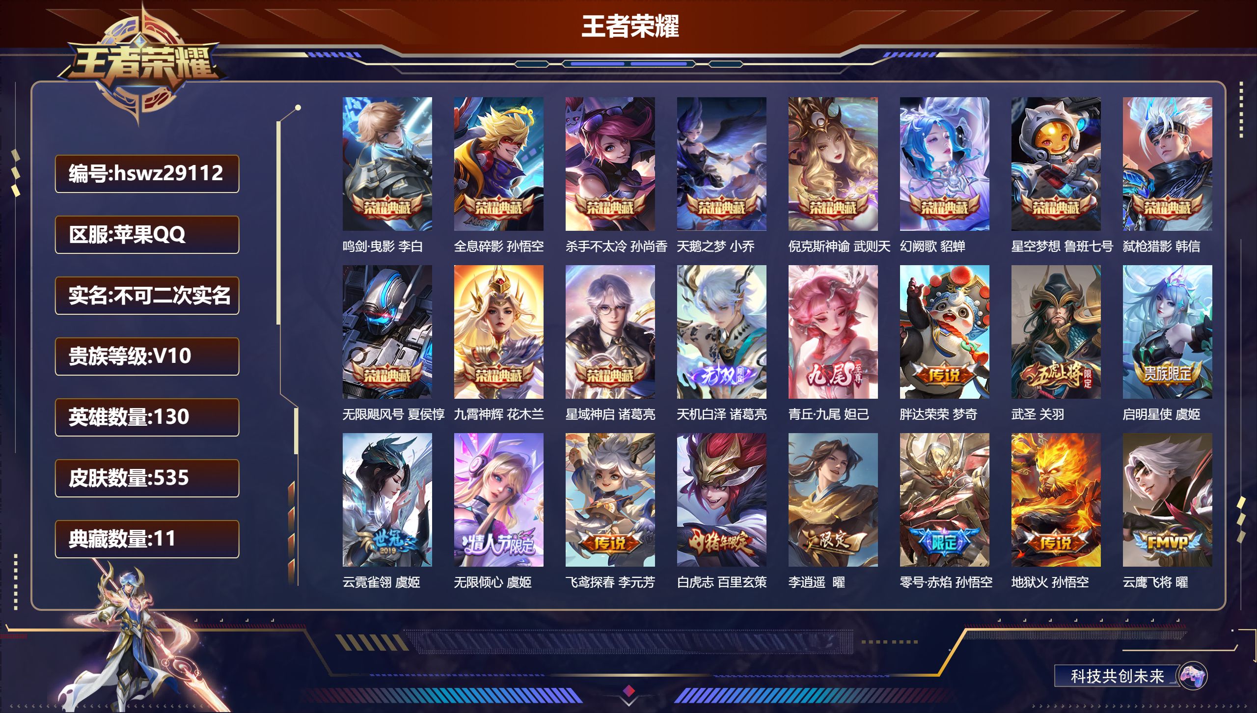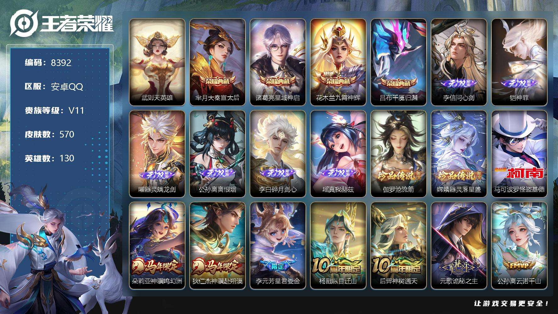 PX_2576992-Q/至尊星耀/535皮肤/130英雄/11典藏/0珍品无双/2无双/0珍品传说/62传说/185史诗/10稀有英雄 【11,典藏皮肤】鸣剑·曳影,李白,全息碎影,孙悟空,杀手不太冷,孙尚香,天鹅之梦,小乔,倪克斯神谕,武则天,幻阙歌,貂蝉,星空梦想,鲁班七号,弑枪猎影,韩信,无限飓风号,夏侯惇,九霄神辉,花木兰,星域神启,诸葛亮, 【2,无双皮肤】天机白泽,诸葛亮,青丘·九尾,妲己, 【62,传说皮肤】胖达荣荣,梦奇,武圣,关羽,启明星使,虞姬,云霓雀翎,虞姬,无限倾心,虞姬,飞鸢探春,李元芳,白虎志,百里玄策,李逍遥,,曜,零号·赤焰,孙悟空,地狱火,孙悟空,云鹰飞将,曜,神器·狴犴令,狄仁杰,深海之息,马可波罗,觅芳踪,艾琳,游龙清影,西施,永曜之星,杨戬,凤求凰,李白,诗剑行,李白,灼幽烈阳,东皇太一,遇见胡旋,貂蝉,猫影幻舞,貂蝉,仲夏夜之梦,貂蝉,记忆之芯,公孙离,地狱之眼,宫本武藏,祈雪灵祝,公孙离,默契交锋,兰陵王,武陵仙君,诸葛亮,鹤羽星尊,诸葛亮,海洋之心,武则天,时雨天司,诸葛亮,音你心动,周瑜,炽阳神光,镜,黄金射手座,后羿,寅虎·瑞焰,鲁班七号,时之奇旅,鲁班七号,怒海麟威,吕布,乞巧织情,王昭君,乘龙·问璇玑,孙尚香,时之恋人,刘备,挚爱之约,孙策,黄金狮子座,达摩,久胜战神,干将莫邪,末日机甲,孙尚香,异界灵契,孙尚香,末日机甲,孙策,山海·炽霜斩,李信,一念神魔,李信,音你心动,小乔,天魔缭乱,吕布,山海·琳琅生,小乔,淬星耀世,赵云,太华,伽罗,绛天战甲,铠,妄想实况,马可波罗,寅虎·赤拳,裴擒虎,超时空战士,狄仁杰,山海·苍雷引,曜,冠军飞将,花木兰,音你闪耀,孙尚香,黄金白羊座,张良,神树通天,后羿,鸣野蒿,桑启, 【185,史诗皮肤】奔雷神使,牛魔,龙鼓争鸣,蒙犽,霸王别姬,项羽,乒乒小将,鲁班七号,时之奇旅,安琪拉,电玩小子,鲁班七号,末日机甲,吕布,白昼王子,嬴政,逐梦之星,马可波罗,紫霞仙子,露娜,百解令,蒙犽,高山流水,庄周,银河之约,李元芳,匿光追影者,镜,云端筑梦师,庄周,奇遇舞章,艾琳,真爱至上,周瑜,暗渊魔法,司马懿,暗影游猎,马可波罗,冰霜恋舞曲,干将莫邪,苍穹之光,项羽,天秀·启明,杨戬,狮舞东方,鲁班七号,猫狗日记,大乔,妄想食味,姬小满,德古拉伯爵,刘邦,山海·玄木吟,马可波罗,心灵战警,亚瑟,五谷丰年,鬼谷子,银翎春语,杨玉环,诗语江南,西施,无心,元歌,巫礼祀神,少司缘,鬼剑武藏,宫本武藏,百相守梦,黄忠,迷踪丽影,阿轲,星夜王子,白起,寅虎·心曲,杨玉环,无限星赏官,公孙离,地狱燃心,司空震,锁墨魂,钟馗,线条小狗,周瑜,玉兔公主,公孙离,遇见飞天,杨玉环,摇滚巨星,嬴政,电玩高手,狂铁,顽趣,梦奇,冰锋战神,关羽,蜜橘之夏,公孙离,修罗,橘右京,拒霜思,嫦娥,魅力维加斯,妲己,黄金分割率,诸葛亮,乐园奇幻夜,钟馗,如梦令,嫦娥,凤凰于飞,王昭君,偶像歌手,王昭君,霸王别姬,虞姬,梅西,裴擒虎,荣光圣徽,蒙恬,女仆咖啡,妲己,逐梦之音,貂蝉,九幽镇关,项羽,星界游侠,暃,晚萤,娜可露露,猪悟能,猪八戒,遇见神鹿,瑶,舞动绿茵,蔡文姬,繁星吟游,蔡文姬,暗夜贵公子,嬴政,鹰眼统帅,狄仁杰,胡桃异想国,米莱狄,白晶晶,芈月,大圣娶亲,孙悟空,飞衡,韩信,末日机甲,莱西奥,孙行者,孙悟空,李小龙,裴擒虎,光弋星穹,莱西奥,纤云弄巧,云中君,驯魔猎人,兰陵王,如梦令,后羿,龙骑士,墨子,金属风暴,墨子,逐梦之影,韩信,嘻哈天王,赵云,傲雪梅枪,韩信,冰霜神祇,盘古,匿光侦查者,李元芳,特工魅影,百里守约,猫狗日记,孙策,原初追逐者,百里玄策,逐浪之夏,李元芳,奇幻香踪,扁鹊,时之祈愿,云中君,未来纪元,赵云,时之彼端,妲己,引擎之心,赵云,灵蛊蚀心,扁鹊,朱雀志,百里守约,黎明之约,雅典娜,石田雨龙,后羿,优雅恋人,嬴政,驭风魔法,戈娅,魔术师,狄仁杰,热力回旋,百里玄策,龙之律动,狂铁,神威,马超,皇家上将,赵云,冰冠公主,雅典娜,至尊宝,孙悟空,辉光之辰,后羿,功夫厨神,程咬金,梁祝,上官婉儿,电玩·爆裂旋风,刘禅,天才门将,刘禅,圣诞恋歌,貂蝉,云间偶戏,元歌,水晶猎龙者,花木兰,山海·碧波行,瑶,涂山容容,公孙离,一生所爱,露娜,烈魂,黄忠,御风骁将,吕布,圣诞狂欢,吕布,魅语,不知火舞,天狼绘梦者,上官婉儿,职棒王牌,项羽,罗小黑战记,百里玄策,白龙吟,韩信,岱宗,典韦,圣诞老人,老夫子,天狼运算者,孙膑,星界战将,牛魔,永昼,夏洛特,天狼溯光者,伽罗,地狱岩魂,廉颇,虎魄,张飞,纯白花嫁,小乔,蔷薇恋人,孙尚香,冰雪圆舞曲,甄姬,火炮绅士,黄忠,青蛇,小乔,默契交锋,花木兰,逐梦之翼,哪吒,月团寄思,沈梦溪,航海奇遇记,老夫子,雪上飞焰,哪吒,千年之狐,李白,节奏热浪,阿轲,暗夜猫娘,阿轲,幽恒,甄姬,超时空战士,钟无艳,游园惊梦,甄姬,青春决赛季,花木兰,曙光守护者,铠,万灵启世,女娲,寅虎·展翼,孙膑,瑞麟志,花木兰,青龙志,铠,心灵骇客,安琪拉,寅虎·御盾,廉颇,匿光破解者,沈梦溪,鹤归松栖,赵怀真,箭羽风息,伽罗,玄武志,苏烈,乱世虎臣,张飞,天狼征服者,曹操,百相守梦,周瑜,吟游魔法,明世隐,龙胆,赵云,王者之锤,钟无艳,绅士熊喵,刘禅,缤纷独角兽,小乔,魔法小厨娘,安琪拉,蓝屏警告,典韦,天狼狩猎者,裴擒虎,真爱魔法,干将莫邪,时之恋人,孙尚香,水果甜心,孙尚香,狂想玩偶喵,蒙犽,江河有灵,阿古朵,幽灵船长,曹操,乘风破浪,夏侯惇,暗隐猎兽者,兰陵王, 【193,勇者皮肤】时空谍影,海诺,玲珑珍味,西施,圆桌骑士,盾山,烛龙,曹操,爱心护理,阿轲,太极少年,赵怀真,星际陆战队,达摩,沙漠行僧,达摩,大漠名商,沈梦溪,