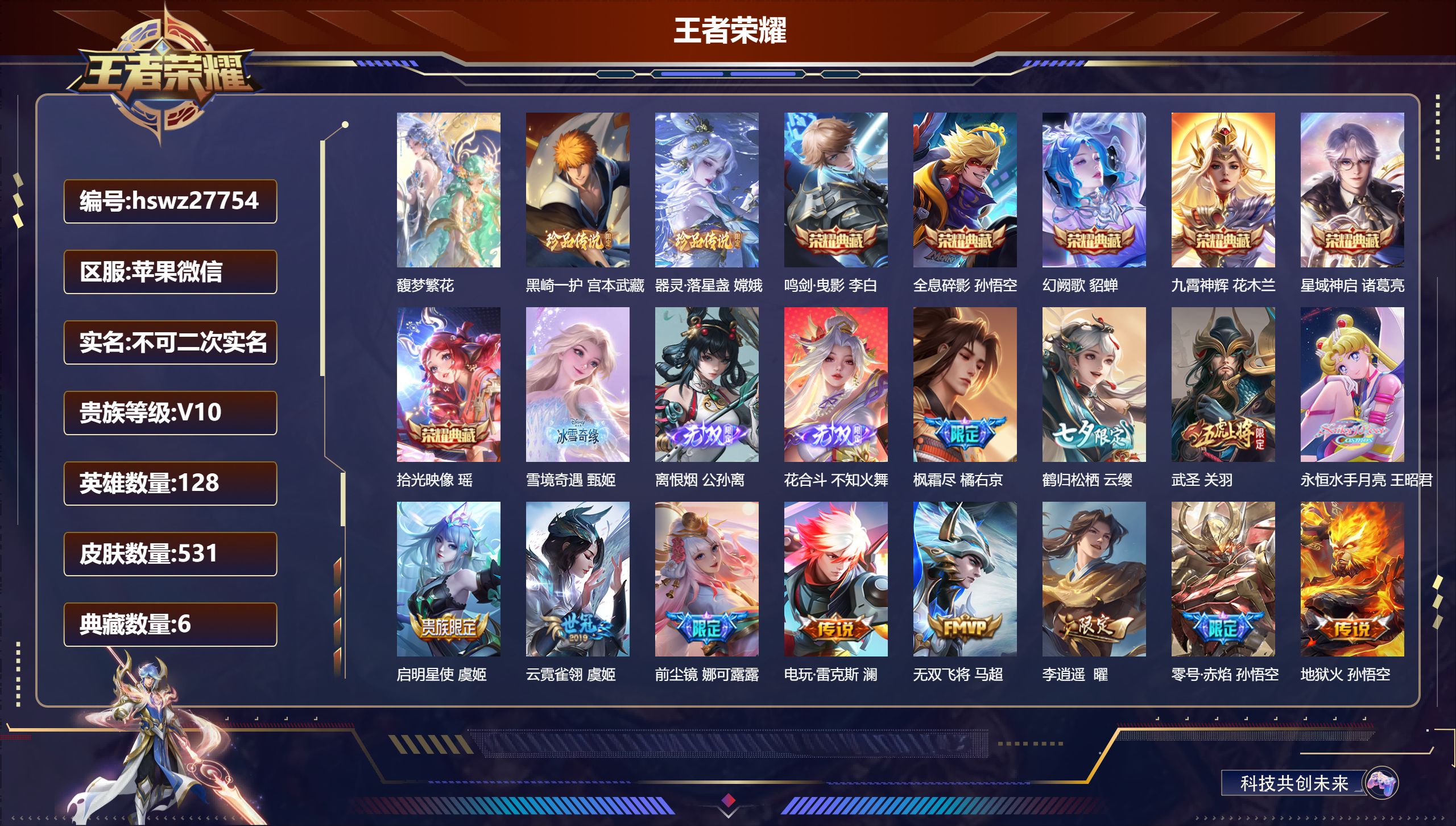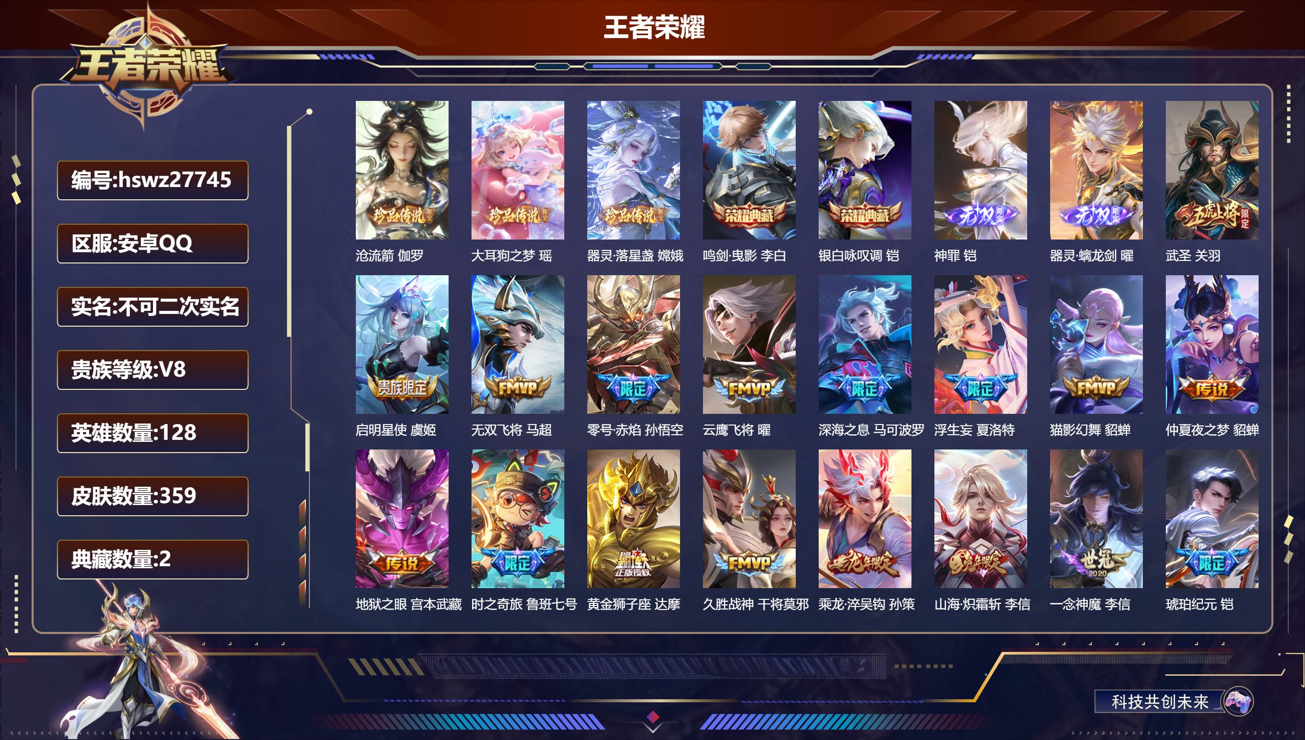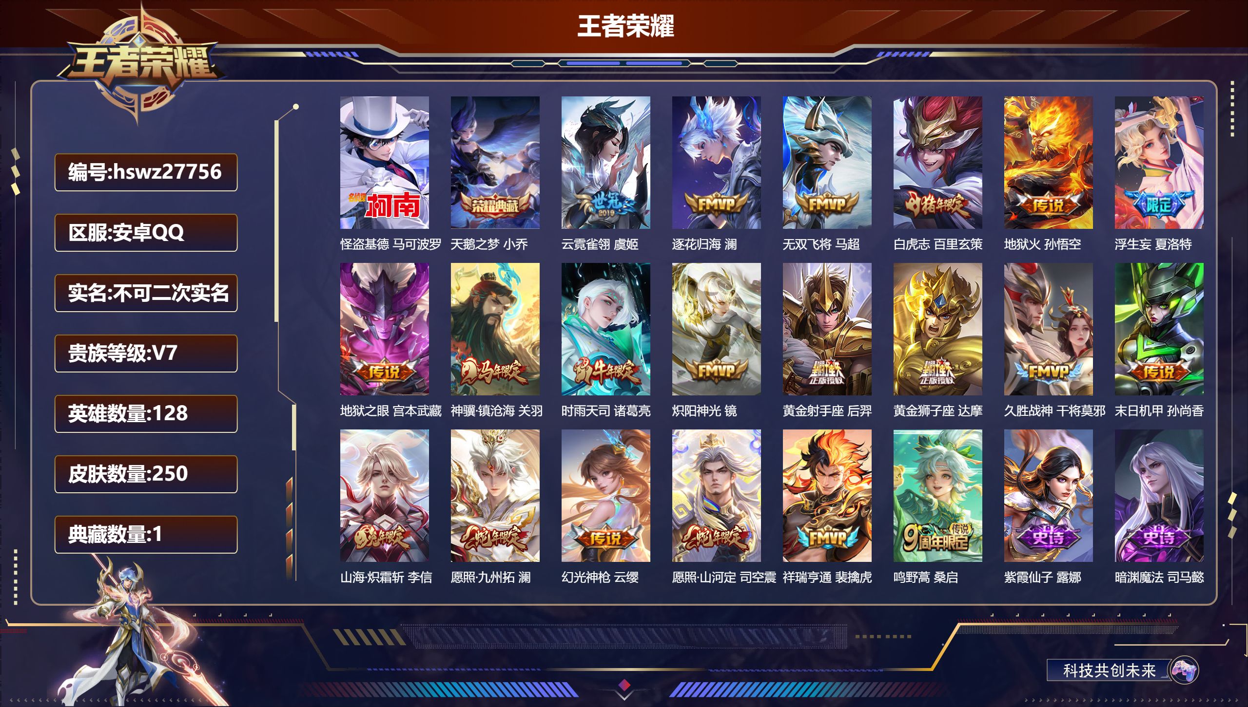 PX_2546378-Q/非凡王者/250皮肤/128英雄/1典藏/0珍品无双/0无双/1珍品传说/20传说/61史诗/9稀有英雄 【1,珍品传说】怪盗基德,马可波罗, 【1,典藏皮肤】天鹅之梦,小乔, 【20,传说皮肤】云霓雀翎,虞姬,逐花归海,澜,无双飞将,马超,白虎志,百里玄策,地狱火,孙悟空,浮生妄,夏洛特,地狱之眼,宫本武藏,神骥·镇沧海,关羽,时雨天司,诸葛亮,炽阳神光,镜,黄金射手座,后羿,黄金狮子座,达摩,久胜战神,干将莫邪,末日机甲,孙尚香,山海·炽霜斩,李信,愿照·九州拓,澜,幻光神枪,云缨,愿照·山河定,司空震,祥瑞亨通,裴擒虎,鸣野蒿,桑启, 【61,史诗皮肤】紫霞仙子,露娜,暗渊魔法,司马懿,暗影游猎,马可波罗,猫狗日记,大乔,妄想食味,姬小满,五谷丰年,鬼谷子,无心,元歌,巫礼祀神,少司缘,鬼剑武藏,宫本武藏,百相守梦,黄忠,星夜王子,白起,线条小狗,周瑜,百晓客,明世隐,摇滚巨星,嬴政,修罗,橘右京,魅力维加斯,妲己,偶像歌手,王昭君,女仆咖啡,妲己,舞动绿茵,蔡文姬,暗夜贵公子,嬴政,鹰眼统帅,狄仁杰,大圣娶亲,孙悟空,孙行者,孙悟空,李小龙,裴擒虎,特工魅影,百里守约,猫狗日记,孙策,原初追逐者,百里玄策,逐浪之夏,李元芳,未来纪元,赵云,黎明之约,雅典娜,石田雨龙,后羿,魔术师,狄仁杰,龙之律动,狂铁,神威,马超,皇家上将,赵云,至尊宝,孙悟空,功夫厨神,程咬金,梁祝,上官婉儿,圣诞恋歌,貂蝉,云间偶戏,元歌,水晶猎龙者,花木兰,涂山容容,公孙离,破空之剑,亚连,圣诞狂欢,吕布,器灵·浮梦炉,赵怀真,茶境仙,孙膑,冰雪圆舞曲,甄姬,千年之狐,李白,织梦人,西施,曙光守护者,铠,心灵骇客,安琪拉,乱世虎臣,张飞,百相守梦,周瑜,万物之道,弈星,谪仙醉月,李白,缤纷独角兽,小乔,线条小狗,小乔,水果甜心,孙尚香,化蝶舞,阿轲,幽灵船长,曹操,暗隐猎兽者,兰陵王, 【123,勇者皮肤】圆桌骑士,盾山,烛龙,曹操,沙漠行僧,达摩,缤纷绘卷,张良,纽约教父,刘备,拳王,达摩,大发明家,达摩,龙舞盛年,沈梦溪,丁香结,小乔,功夫炙烤,廉颇,铁甲之心,典韦,沉稳之力,孙尚香,爱与正义,程咬金,海盐诗旅,桑启,朔风刀,夏侯惇,醍醐杖,老夫子,白色死神,白起,黑桃队长,鲁班七号,黄金武士,典韦,御旌,牛魔,阴阳师,狄仁杰,炼金王,扁鹊,致命风华,阿轲,次元突破,哪吒,科学大爆炸,项羽,功夫老勺,老夫子,鲨炮海盗猫,沈梦溪,海滩派对,项羽,完美运算,后羿,万华元夜,狄仁杰,克喵,鬼谷子,踏浪烽翎,莱西奥,演武夺筹,程咬金,红桃皇后,芈月,守护之力,大乔,无双福将,程咬金,百相守梦,影,原初探秘者,鬼谷子,潮玩探月行,猪八戒,疑决卦,明世隐,化身博士,扁鹊,阿尔法小队,后羿,五福同心,张飞,星际陆战队,程咬金,幻乐之宴,鬼谷子,霸王丸,宫本武藏,虹云星官,明世隐,雾影缉谜,兰陵王,赤刃凌霄,敖隐,死亡骑士,亚瑟,浪漫序章,刘备,敏锐之力,李白,玩偶对对碰,安琪拉,掌控之力,诸葛亮,海滩丽影,钟无艳,忍·炎影,赵云,狰,白起,雪境奇遇,西施,重明,芈月,万事如意,刘备,擒涛扼浪,裴擒虎,乓乓大师,鲁班大师,逐霄之志,曹操,妖精王,孙膑,极光幻客,蚩奼,天使之翼,孙膑,雾都夜雨,干将莫邪,兔女郎,花木兰,龙腾万里,关羽,金庭之子,兰陵王,未来纪元,宫本武藏,罗小黑战记,哪吒,荣光之誓,亚瑟,花好人间,甄姬,万象初新,宫本武藏,御銮,盾山,时尚教父,姜子牙,秘密基地,刘禅,穷奇,典韦,教廷特使,韩信,街头霸王,韩信,云中旅人,李元芳,妄想特派,李元芳,西部大镖客,孙悟空,紫罗兰之誓,妲己,凯尔特女王,虞姬,少女阿狸,妲己,混沌棋,弈星,御霄,米莱狄,春野闲踪,苏烈,布丁狗之约,阿古朵,命运加冕,露娜,幻想奇妙夜,王昭君,灵野札记,张良,驱傩正仪,钟馗,命运角斗场,狂铁,死霸装,白起,虚灵犬护,钟馗,御狮,狂铁,班班快跑,鲁班七号,白执事,赵云,饕餮,太乙真人,神迹守卫,孙悟空,罗小黑战记,张良,剑破天穹,刘邦,青衿临川,桑启,熔金海岸,周瑜,天穹之誓,姜子牙,访茗客,马超,星梦巡礼,姜子牙,破阵·退雄兵,杨戬,谧流熔炉,太乙真人,金福满堂,东皇太一,群星魔术团,程咬金,鹤鸣心笺,艾琳,线条小狗,妲己,锦麟游梦,庄周,逆浪荇歌,甄姬,百相守梦,孙策,线条小狗,周瑜,噬灭天穹,东皇太一,玫蓝誓约,戈娅,景韶洛都,明世隐, 【47,其他皮肤】伊势巫女,大乔,金属狂潮,高渐离,前尘,金蝉,三太子,哪吒,棒球奇才,沈梦溪,生化警戒,钟无艳,花见巫女,伽罗,爱与和平,苏烈,第七人偶,干将莫邪,万圣前夜,小乔,灼热之刃,李信,木偶奇遇记,鲁班七号,精灵王,后羿,碧珀绯影,暃,星航指挥官,诸葛亮,魇语军师,司马懿,英喵野望,刘禅,午夜歌剧院,元歌,启蛰,司空震,花间舞,公孙离,街头旋风,裴擒虎,剑舞者,花木兰,范海辛,李白,归虚梦演,蒙犽,激情绿茵,马可波罗,埃及法老,杨戬,阿摩司公爵,鬼谷子,年年有余,猪八戒,锦衣卫,狄仁杰,归虚梦演,曜,威尼斯狂欢,百里玄策,幸存者,马超,战争女神,雅典娜,创世神祝,盘古,特种部队,李元芳,绝影神枪,百里守约,森,瑶,孤猎,澜,加勒比小姐,虞姬,踏雪寻梅,弈星,秩序猎龙将,蒙恬,精准探案法,米莱狄,精灵公主,王昭君,赤焰之缨,云缨,美梦成真,梦奇,怪盗基德,马可波罗,西部大镖客,孙悟空, 【9,稀有英雄】敖隐,嬴政,不知火舞,橘右京,夏洛特,娜可露露,韩信,艾琳,赵云, 营地ID:,