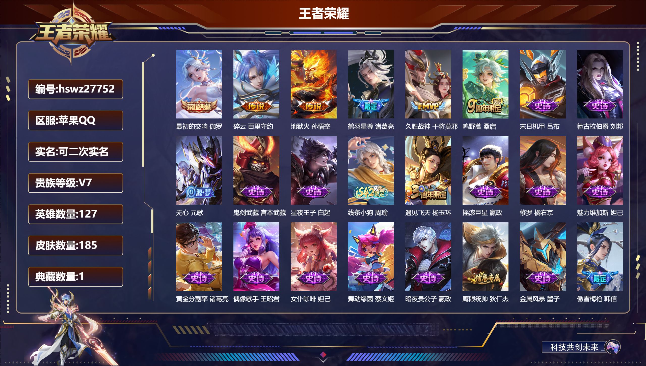 PX_2546343-Q/荣耀王者/185皮肤/127英雄/1典藏/0珍品无双/0无双/0珍品传说/5传说/38史诗/8稀有英雄 【1,典藏皮肤】最初的交响,伽罗, 【5,传说皮肤】碎云,百里守约,地狱火,孙悟空,鹤羽星尊,诸葛亮,久胜战神,干将莫邪,鸣野蒿,桑启, 【38,史诗皮肤】末日机甲,吕布,德古拉伯爵,刘邦,无心,元歌,鬼剑武藏,宫本武藏,星夜王子,白起,线条小狗,周瑜,遇见飞天,杨玉环,摇滚巨星,嬴政,修罗,橘右京,魅力维加斯,妲己,黄金分割率,诸葛亮,偶像歌手,王昭君,女仆咖啡,妲己,舞动绿茵,蔡文姬,暗夜贵公子,嬴政,鹰眼统帅,狄仁杰,金属风暴,墨子,傲雪梅枪,韩信,特工魅影,百里守约,真我赫兹,百里守约,未来纪元,赵云,朱雀志,百里守约,魔术师,狄仁杰,龙之律动,狂铁,皇家上将,赵云,至尊宝,孙悟空,圣诞恋歌,貂蝉,水晶猎龙者,花木兰,圣诞狂欢,吕布,魅语,不知火舞,冰雪圆舞曲,甄姬,火炮绅士,黄忠,千年之狐,李白,青龙志,铠,吟游魔法,明世隐,水果甜心,孙尚香,幽灵船长,曹操,暗隐猎兽者,兰陵王, 【94,勇者皮肤】时空谍影,海诺,烛龙,曹操,沙漠行僧,达摩,大漠名商,沈梦溪,拳王,达摩,丁香结,小乔,功夫炙烤,廉颇,沉稳之力,孙尚香,幻夜卜梦,芈月,海盐诗旅,桑启,幻泉雾影,海月,白色死神,白起,黄金武士,典韦,御旌,牛魔,阴阳师,狄仁杰,径山谋武,孙权,致命风华,阿轲,次元突破,哪吒,古海寻踪,张良,功夫老勺,老夫子,鲨炮海盗猫,沈梦溪,海滩派对,项羽,美猴王,孙悟空,哥特玫瑰,露娜,守护之力,大乔,无双福将,程咬金,瓷语鉴心,露娜,百相守梦,影,潮玩探月行,猪八戒,鸿运当头,亚瑟,天穹祈灯,鬼谷子,疑决卦,明世隐,如懿,安琪拉,化身博士,扁鹊,阿尔法小队,后羿,无尽旅途,扁鹊,五福同心,张飞,夜都怪侠,白起,幻乐之宴,鬼谷子,霸王丸,宫本武藏,虹云星官,明世隐,潮玩牛仔,马可波罗,救世之瞳,扁鹊,死亡骑士,亚瑟,玩偶对对碰,安琪拉,掌控之力,诸葛亮,海滩丽影,钟无艳,忍·炎影,赵云,重明,芈月,坚韧之力,苏烈,万事如意,刘备,逐霄战戟,吕布,乓乓大师,鲁班大师,溯影追猎,虞姬,极光幻客,蚩奼,探海日志,鲁班大师,天使之翼,孙膑,雾都夜雨,干将莫邪,玩趣恶龙,高渐离,龙腾万里,关羽,金庭之子,兰陵王,千军破阵,苏烈,花好人间,甄姬,万象初新,宫本武藏,御銮,盾山,秘密基地,刘禅,穷奇,典韦,教廷特使,韩信,街头霸王,韩信,云中旅人,李元芳,妄想特派,李元芳,西部大镖客,孙悟空,少女阿狸,妲己,混沌棋,弈星,御霄,米莱狄,契约魔法,米莱狄,绒语心约,大乔,幻想奇妙夜,王昭君,灵野札记,张良,御狮,狂铁,白执事,赵云,饕餮,太乙真人,剑破天穹,刘邦,铁骨偃魂,典韦,熔金海岸,周瑜,苍林狼骑,苍,天穹之誓,姜子牙,魅影绮裳,影,星梦巡礼,姜子牙,谧流熔炉,太乙真人,经纬探寻者,盘古,暗都幽影,大司命,线条小狗,周瑜,噬灭天穹,东皇太一, 【49,其他皮肤】伊势巫女,大乔,前尘,金蝉,战争骑士,夏侯惇,芝加哥教父,黄忠,三太子,哪吒,棒球奇才,沈梦溪,极冰防御线,盾山,龙域领主,铠,死神来了,曹操,超能战警,曹操,第七人偶,干将莫邪,灼热之刃,李信,熊喵少女,阿古朵,木偶奇遇记,鲁班七号,帝国元帅,项羽,精灵王,后羿,碧珀绯影,暃,海军大将,周瑜,星航指挥官,诸葛亮,魇语军师,司马懿,午夜歌剧院,元歌,启蛰,司空震,隐刃,兰陵王,霓裳曲,杨玉环,异域舞娘,貂蝉,街头旋风,裴擒虎,归虚梦演,鲁班大师,范海辛,李白,维京掠夺者,苍,激情绿茵,马可波罗,埃及法老,杨戬,画中游,桑启,一千零一夜,张良,归虚梦演,曜,威尼斯狂欢,百里玄策,幸存者,马超,战争女神,雅典娜,荷鲁斯之眼,云中君,绝影神枪,百里守约,孤猎,澜,加勒比小姐,虞姬,秩序猎龙将,蒙恬,精准探案法,米莱狄,赤焰之缨,云缨,露花倒影,嫦娥,地府判官,钟馗,美梦成真,梦奇,天启骑士,关羽,西部大镖客,孙悟空, 【8,稀有英雄】嬴政,不知火舞,橘右京,夏洛特,娜可露露,韩信,艾琳,赵云, 营地ID:,