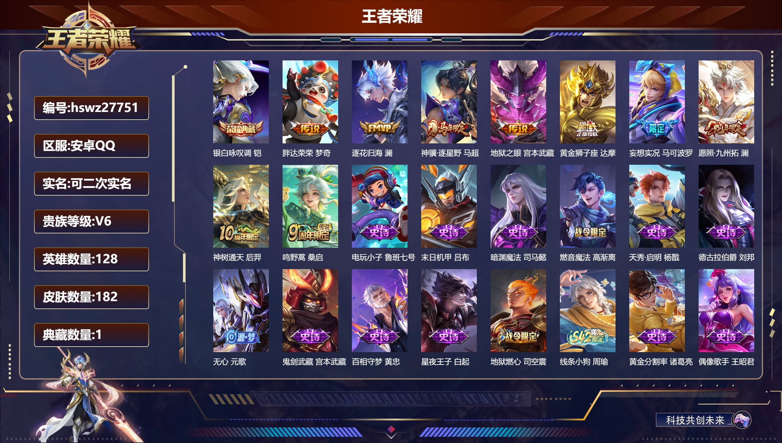PX_2546336-Q/非凡王者/182皮肤/128英雄/1典藏/0珍品无双/0无双/0珍品传说/9传说/55史诗/9稀有英雄 【1,典藏皮肤】银白咏叹调,铠, 【9,传说皮肤】胖达荣荣,梦奇,逐花归海,澜,神骥·逐星野,马超,地狱之眼,宫本武藏,黄金狮子座,达摩,妄想实况,马可波罗,愿照·九州拓,澜,神树通天,后羿,鸣野蒿,桑启, 【55,史诗皮肤】电玩小子,鲁班七号,末日机甲,吕布,暗渊魔法,司马懿,燃音魔法,高渐离,天秀·启明,杨戬,德古拉伯爵,刘邦,无心,元歌,鬼剑武藏,宫本武藏,百相守梦,黄忠,星夜王子,白起,地狱燃心,司空震,线条小狗,周瑜,黄金分割率,诸葛亮,偶像歌手,王昭君,女仆咖啡,妲己,九幽镇关,项羽,暗夜贵公子,嬴政,鹰眼统帅,狄仁杰,李小龙,裴擒虎,光弋星穹,莱西奥,纤云弄巧,云中君,龙骑士,墨子,金属风暴,墨子,特工魅影,百里守约,原初追逐者,百里玄策,逐浪之夏,李元芳,未来纪元,赵云,魔术师,狄仁杰,龙之律动,狂铁,顽岩魄,蒙犽,皇家上将,赵云,冰冠公主,雅典娜,至尊宝,孙悟空,功夫厨神,程咬金,梁祝,上官婉儿,天才门将,刘禅,涂山容容,公孙离,怒海争锋,黄忠,圣诞狂欢,吕布,器灵·浮梦炉,赵怀真,夏日便利店,蔡文姬,星界战将,牛魔,地狱岩魂,廉颇,蔷薇恋人,孙尚香,冰雪圆舞曲,甄姬,千年之狐,李白,曙光守护者,铠,心灵骇客,安琪拉,箭羽风息,伽罗,水果甜心,孙尚香,化蝶舞,阿轲,江河有灵,阿古朵,幽灵船长,曹操,乘风破浪,夏侯惇,暗隐猎兽者,兰陵王, 【94,勇者皮肤】时空谍影,海诺,胡桃夹子,干将莫邪,大漠名商,沈梦溪,拳王,达摩,龙舞盛年,沈梦溪,丁香结,小乔,功夫炙烤,廉颇,沉稳之力,孙尚香,海盐诗旅,桑启,汉昭烈帝,刘备,白色死神,白起,黄金武士,典韦,阴阳师,狄仁杰,径山谋武,孙权,次元突破,哪吒,古海寻踪,张良,功夫老勺,老夫子,西部大镖客,牛魔,鲨炮海盗猫,沈梦溪,海滩派对,项羽,完美运算,后羿,克喵,鬼谷子,踏浪烽翎,莱西奥,西部游侠,莱西奥,野性能量,吕布,无双福将,程咬金,潮玩探月行,猪八戒,鸿运当头,亚瑟,天穹祈灯,鬼谷子,决胜大满贯,曹操,阿尔法小队,后羿,五福同心,张飞,虹云星官,明世隐,雾影缉谜,兰陵王,潮玩牛仔,马可波罗,赤刃凌霄,敖隐,死亡骑士,亚瑟,浪漫序章,刘备,敏锐之力,李白,破局者,亚连,掌控之力,诸葛亮,海滩丽影,钟无艳,忍·炎影,赵云,雪境奇遇,西施,万事如意,刘备,逐霄战戟,吕布,擒涛扼浪,裴擒虎,乓乓大师,鲁班大师,溯影追猎,虞姬,探海日志,鲁班大师,天使之翼,孙膑,雾都夜雨,干将莫邪,往忆晖光,明世隐,荣光之誓,亚瑟,花好人间,甄姬,万象初新,宫本武藏,秘密基地,刘禅,教廷特使,韩信,街头霸王,韩信,云中旅人,李元芳,西部大镖客,孙悟空,灵卜魔法,妲己,秘证寻踪,小乔,春野闲踪,苏烈,契约魔法,米莱狄,布丁狗之约,阿古朵,命运加冕,露娜,小满鸭,姬小满,幻想奇妙夜,王昭君,灵野札记,张良,命运角斗场,狂铁,死霸装,白起,虚灵犬护,钟馗,白执事,赵云,剑破天穹,刘邦,异域游侠,刘备,铁骨偃魂,典韦,熔金海岸,周瑜,苍林狼骑,苍,天穹之誓,姜子牙,长夏之忆,貂蝉,星梦巡礼,姜子牙,谧流熔炉,太乙真人,金福满堂,东皇太一,群星魔术团,程咬金,暗都幽影,大司命,夏日便利店,虞姬,鹤鸣心笺,艾琳,锦麟游梦,庄周,逆浪荇歌,甄姬,线条小狗,周瑜,噬灭天穹,东皇太一,敬我三分,盘古,玫蓝誓约,戈娅, 【25,其他皮肤】战争骑士,夏侯惇,棒球奇才,沈梦溪,龙域领主,铠,爱与和平,苏烈,第七人偶,干将莫邪,灼热之刃,李信,海之征途,孙策,绯红之刃,露娜,星航指挥官,诸葛亮,魇语军师,司马懿,启蛰,司空震,修竹墨客,上官婉儿,占星师,明世隐,激情绿茵,马可波罗,埃及法老,杨戬,尼罗河女神,女娲,幸存者,马超,战争女神,雅典娜,创世神祝,盘古,绝影神枪,百里守约,孤猎,澜,加勒比小姐,虞姬,仙境爱丽丝,妲己,赤焰之缨,云缨,西部大镖客,孙悟空, 【9,稀有英雄】敖隐,嬴政,不知火舞,橘右京,夏洛特,娜可露露,韩信,艾琳,赵云, 营地ID:,