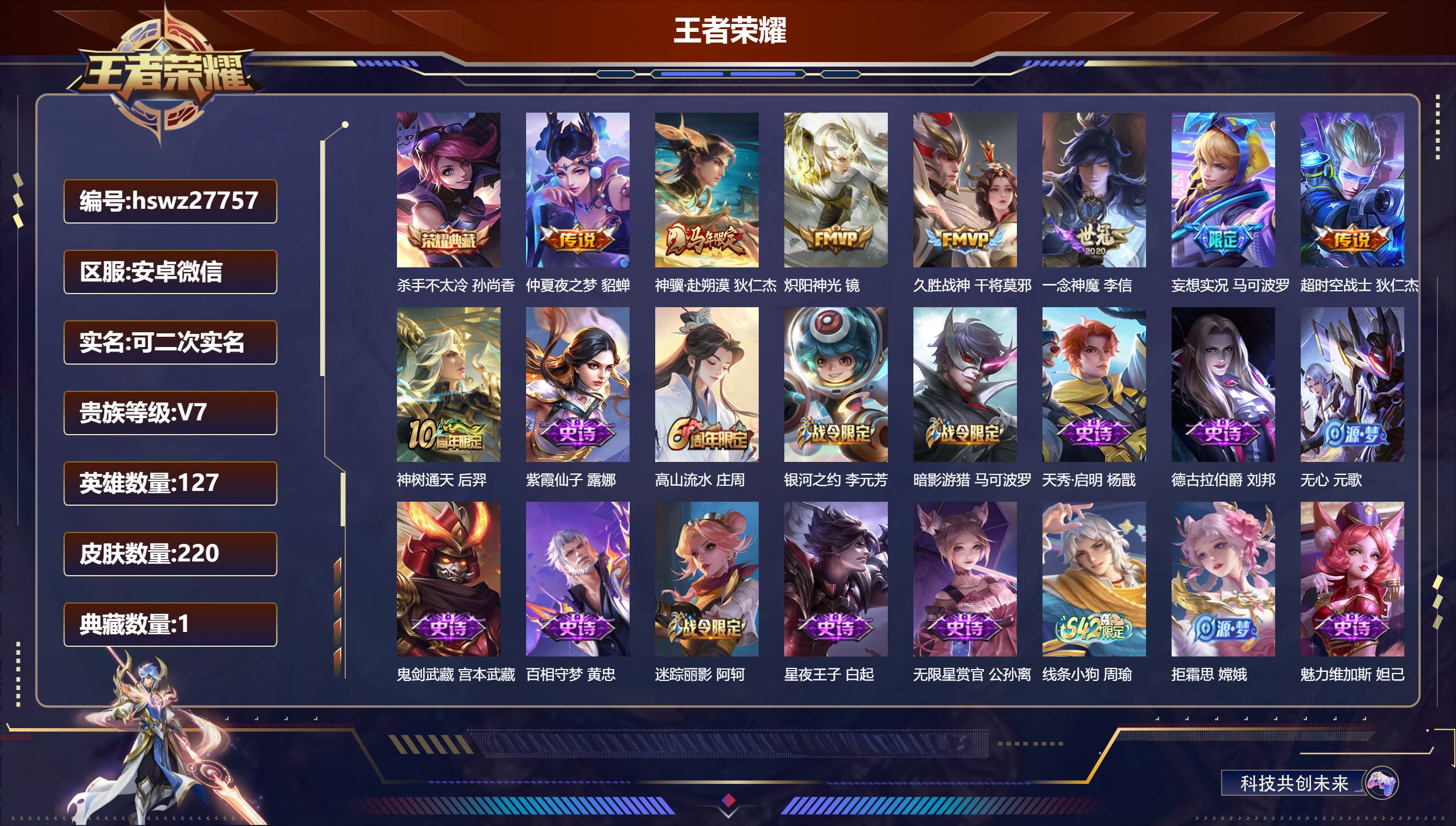 PX_2546390-??信/无双王者/220皮肤/127英雄/1典藏/0珍品无双/0无双/0珍品传说/8传说/64史诗/8稀有英雄 【1,典藏皮肤】杀手不太冷,孙尚香, 【8,传说皮肤】仲夏夜之梦,貂蝉,神骥·赴朔漠,狄仁杰,炽阳神光,镜,久胜战神,干将莫邪,一念神魔,李信,妄想实况,马可波罗,超时空战士,狄仁杰,神树通天,后羿, 【64,史诗皮肤】紫霞仙子,露娜,高山流水,庄周,银河之约,李元芳,暗影游猎,马可波罗,天秀·启明,杨戬,德古拉伯爵,刘邦,无心,元歌,鬼剑武藏,宫本武藏,百相守梦,黄忠,迷踪丽影,阿轲,星夜王子,白起,无限星赏官,公孙离,线条小狗,周瑜,拒霜思,嫦娥,魅力维加斯,妲己,偶像歌手,王昭君,女仆咖啡,妲己,天降福星,梦奇,九幽镇关,项羽,舞动绿茵,蔡文姬,暗夜贵公子,嬴政,鹰眼统帅,狄仁杰,胡桃异想国,米莱狄,李小龙,裴擒虎,光弋星穹,莱西奥,纤云弄巧,云中君,龙骑士,墨子,金属风暴,墨子,特工魅影,百里守约,猫狗日记,孙策,原初追逐者,百里玄策,逐浪之夏,李元芳,未来纪元,赵云,朱雀志,百里守约,黎明之约,雅典娜,优雅恋人,嬴政,鸭鸭历险记,刘禅,魔术师,狄仁杰,龙之律动,狂铁,皇家上将,赵云,至尊宝,孙悟空,梁祝,上官婉儿,天才门将,刘禅,圣诞恋歌,貂蝉,云间偶戏,元歌,水晶猎龙者,花木兰,茶境仙,孙膑,冰雪圆舞曲,甄姬,千年之狐,李白,节奏热浪,阿轲,游园惊梦,甄姬,曙光守护者,铠,万灵启世,女娲,心灵骇客,安琪拉,乱世虎臣,张飞,万物之道,弈星,缤纷独角兽,小乔,线条小狗,小乔,真爱魔法,干将莫邪,水果甜心,孙尚香,狂想玩偶喵,蒙犽,幽灵船长,曹操,乘风破浪,夏侯惇,暗隐猎兽者,兰陵王, 【119,勇者皮肤】时空谍影,海诺,圆桌骑士,盾山,太极少年,赵怀真,星际陆战队,达摩,沙漠行僧,达摩,大漠名商,沈梦溪,缤纷绘卷,张良,纽约教父,刘备,拳王,达摩,丁香结,小乔,功夫炙烤,廉颇,沉稳之力,孙尚香,海盐诗旅,桑启,幻泉雾影,海月,醍醐杖,老夫子,汉昭烈帝,刘备,黄金武士,典韦,夺宝奇兵,刘邦,阴阳师,狄仁杰,径山谋武,孙权,次元突破,哪吒,古海寻踪,张良,科学大爆炸,项羽,戏梦巡演,空空儿,功夫老勺,老夫子,鲨炮海盗猫,沈梦溪,海滩派对,项羽,万华元夜,狄仁杰,无尽征程,廉颇,制霸全明星,牛魔,踏浪烽翎,莱西奥,演武夺筹,程咬金,红桃皇后,芈月,奇妙博物学,庄周,野性能量,吕布,哥特玫瑰,露娜,无双福将,程咬金,瓷语鉴心,露娜,百相守梦,影,原初探秘者,鬼谷子,星空之诺,沈梦溪,潮玩探月行,猪八戒,天穹祈灯,鬼谷子,西部大镖客,猪八戒,疑决卦,明世隐,潮玩骑士王,亚瑟,五福同心,张飞,次元傲视,杨戬,星际陆战队,程咬金,幻乐之宴,鬼谷子,虹云星官,明世隐,潮玩牛仔,马可波罗,赤刃凌霄,敖隐,赤莲之焰,周瑜,死亡骑士,亚瑟,浪漫序章,刘备,破局者,亚连,玩偶对对碰,安琪拉,掌控之力,诸葛亮,海滩丽影,钟无艳,圣弓游侠,后羿,忍·炎影,赵云,雪境奇遇,西施,坚韧之力,苏烈,万事如意,刘备,擒涛扼浪,裴擒虎,乓乓大师,鲁班大师,逐霄之志,曹操,溯影追猎,虞姬,极光幻客,蚩奼,探海日志,鲁班大师,金庭之子,兰陵王,幻夜行动,兰陵王,罗小黑战记,哪吒,千军破阵,苏烈,往忆晖光,明世隐,零食大作战,姬小满,荣光之誓,亚瑟,花好人间,甄姬,万象初新,宫本武藏,单词大作战,雅典娜,秘密基地,刘禅,教廷特使,韩信,街头霸王,韩信,云中旅人,李元芳,妄想特派,李元芳,西部大镖客,孙悟空,紫罗兰之誓,妲己,少女阿狸,妲己,混沌棋,弈星,布丁狗之约,阿古朵,绒语心约,大乔,命运加冕,露娜,小满鸭,姬小满,灵野札记,张良,驱傩正仪,钟馗,鸭鸭历险记,沈梦溪,死霸装,白起,特工战影,狂铁,虚灵犬护,钟馗,班班快跑,鲁班七号,华丽摇滚,太乙真人,罗小黑战记,张良,剑破天穹,刘邦,熔金海岸,周瑜,天穹之誓,姜子牙,魅影绮裳,影,访茗客,马超,星梦巡礼,姜子牙,谧流熔炉,太乙真人,群星魔术团,程咬金,暗都幽影,大司命,鹤鸣心笺,艾琳,锦麟游梦,庄周,逆浪荇歌,甄姬,线条小狗,周瑜,线条小狗,桑启,灵卦秘语,少司缘,玫蓝誓约,戈娅, 【30,其他皮肤】前尘,金蝉,战争骑士,夏侯惇,芝加哥教父,黄忠,棒球奇才,沈梦溪,花见巫女,伽罗,未来旅行,孙膑,第七人偶,干将莫邪,海之征途,孙策,福禄兄弟,鲁班七号,精灵王,后羿,冰刃幻境,镜,东海龙王,东皇太一,维京掠夺者,苍,占星师,明世隐,年年有余,猪八戒,尼罗河女神,女娲,一千零一夜,张良,归虚梦演,曜,幸存者,马超,荷鲁斯之眼,云中君,绝影神枪,百里守约,森,瑶,孤猎,澜,加勒比小姐,虞姬,精准探案法,米莱狄,赤焰之缨,云缨,露花倒影,嫦娥,地府判官,钟馗,美梦成真,梦奇,西部大镖客,孙悟空, 【8,稀有英雄】嬴政,不知火舞,橘右京,夏洛特,娜可露露,韩信,艾琳,赵云, 营地ID:,