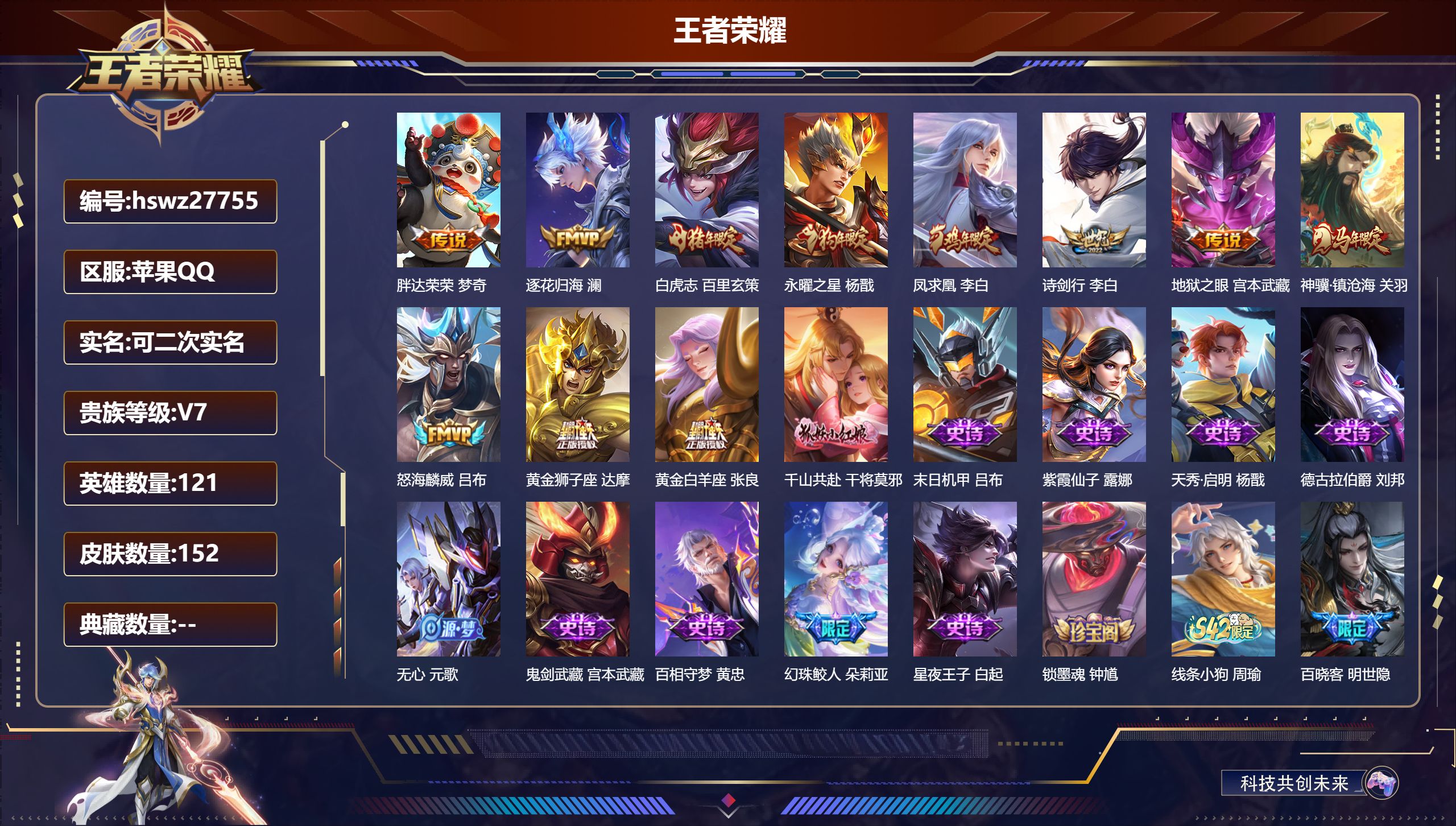 PX_2546370-Q/荣耀王者/152皮肤/121英雄/0典藏/0珍品无双/0无双/0珍品传说/12传说/59史诗/7稀有英雄 【12,传说皮肤】胖达荣荣,梦奇,逐花归海,澜,白虎志,百里玄策,永曜之星,杨戬,凤求凰,李白,诗剑行,李白,地狱之眼,宫本武藏,神骥·镇沧海,关羽,怒海麟威,吕布,黄金狮子座,达摩,黄金白羊座,张良,千山共赴,干将莫邪, 【59,史诗皮肤】末日机甲,吕布,紫霞仙子,露娜,天秀·启明,杨戬,德古拉伯爵,刘邦,无心,元歌,鬼剑武藏,宫本武藏,百相守梦,黄忠,幻珠鲛人,朵莉亚,星夜王子,白起,锁墨魂,钟馗,线条小狗,周瑜,百晓客,明世隐,撼世英歌,盘古,修罗,橘右京,赞萌露比,云缨,滕王阁序,弈星,偶像歌手,王昭君,九幽镇关,项羽,遇见神鹿,瑶,舞动绿茵,蔡文姬,鹰眼统帅,狄仁杰,胡桃异想国,米莱狄,光弋星穹,莱西奥,原初追逐者,百里玄策,逐浪之夏,李元芳,时之祈愿,云中君,灵蛊蚀心,扁鹊,雪豹·霜爪,百里守约,石田雨龙,后羿,鸭鸭历险记,刘禅,魔术师,狄仁杰,龙之律动,狂铁,顽岩魄,蒙犽,皇家上将,赵云,冰冠公主,雅典娜,至尊宝,孙悟空,辉光之辰,后羿,东方月初,大司命,梁祝,上官婉儿,云间偶戏,元歌,涂山容容,公孙离,破空之剑,亚连,青焰无极,镜,浮光幕影,芈月,夏日便利店,蔡文姬,永昼,夏洛特,地狱岩魂,廉颇,茶境仙,孙膑,织梦人,西施,曙光守护者,铠,百相守梦,周瑜,琥珀纪元,伽罗,谪仙醉月,李白,线条小狗,小乔,时之恋人,孙尚香,水果甜心,孙尚香,绮世丹青,狄仁杰,幽灵船长,曹操,乘风破浪,夏侯惇, 【60,勇者皮肤】拳王,达摩,大发明家,达摩,龙舞盛年,沈梦溪,丁香结,小乔,黄金武士,典韦,阴阳师,狄仁杰,次元突破,哪吒,功夫老勺,老夫子,海滩派对,项羽,克喵,鬼谷子,踏浪烽翎,莱西奥,野性能量,吕布,百相守梦,影,原初探秘者,鬼谷子,天穹祈灯,鬼谷子,阿尔法小队,后羿,五福同心,张飞,虹云星官,明世隐,潮玩牛仔,马可波罗,救世之瞳,扁鹊,赤刃凌霄,敖隐,死亡骑士,亚瑟,浪漫序章,刘备,破局者,亚连,掌控之力,诸葛亮,乓乓大师,鲁班大师,溯影追猎,虞姬,极光幻客,蚩奼,兔女郎,花木兰,龙腾万里,关羽,罗小黑战记,哪吒,往忆晖光,明世隐,荣光之誓,亚瑟,街头霸王,韩信,少女阿狸,妲己,春野闲踪,苏烈,绒语心约,大乔,命运加冕,露娜,小满鸭,姬小满,幻想奇妙夜,王昭君,灵野札记,张良,鸭鸭历险记,沈梦溪,死霸装,白起,虚灵犬护,钟馗,班班快跑,鲁班七号,白执事,赵云,剑破天穹,刘邦,熔金海岸,周瑜,天穹之誓,姜子牙,魅影绮裳,影,访茗客,马超,谧流熔炉,太乙真人,夏日便利店,虞姬,鹤鸣心笺,艾琳,线条小狗,妲己,锦麟游梦,庄周,逆浪荇歌,甄姬,百相守梦,孙策,线条小狗,周瑜,玫蓝誓约,戈娅, 【23,其他皮肤】伊势巫女,大乔,潮流仙人,老夫子,三太子,哪吒,幻珠鲛人,朵莉亚,灼热之刃,李信,碧珀绯影,暃,星航指挥官,诸葛亮,魇语军师,司马懿,英喵野望,刘禅,午夜歌剧院,元歌,启蛰,司空震,花间舞,公孙离,归虚梦演,蒙犽,激情绿茵,马可波罗,埃及法老,杨戬,归虚梦演,曜,幸存者,马超,荷鲁斯之眼,云中君,绝影神枪,百里守约,孤猎,澜,秩序猎龙将,蒙恬,赤焰之缨,云缨,地府判官,钟馗, 【7,稀有英雄】敖隐,不知火舞,橘右京,夏洛特,娜可露露,韩信,赵云, 营地ID:,
