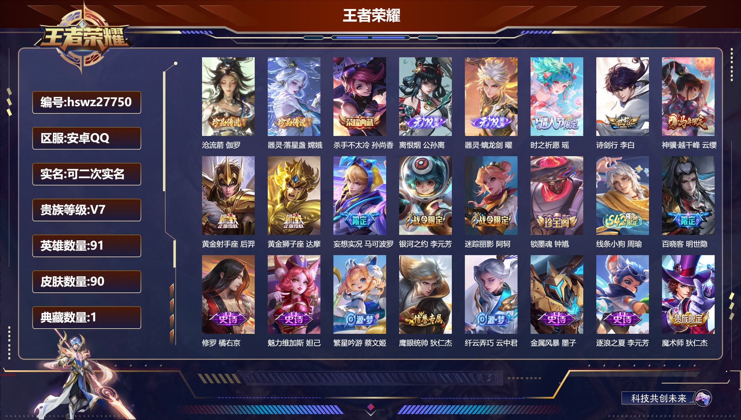 PX_2546332-Q/荣耀王者/90皮肤/91英雄/1典藏/0珍品无双/2无双/2珍品传说/6传说/23史诗/8稀有英雄 【2,珍品传说】沧流箭,伽罗,器灵·落星盏,嫦娥, 【1,典藏皮肤】杀手不太冷,孙尚香, 【2,无双皮肤】离恨烟,公孙离,器灵·螭龙剑,曜, 【6,传说皮肤】时之祈愿,瑶,诗剑行,李白,神骥·越千峰,云缨,黄金射手座,后羿,黄金狮子座,达摩,妄想实况,马可波罗, 【23,史诗皮肤】银河之约,李元芳,迷踪丽影,阿轲,锁墨魂,钟馗,线条小狗,周瑜,百晓客,明世隐,修罗,橘右京,魅力维加斯,妲己,繁星吟游,蔡文姬,鹰眼统帅,狄仁杰,纤云弄巧,云中君,金属风暴,墨子,逐浪之夏,李元芳,魔术师,狄仁杰,皇家上将,赵云,冰冠公主,雅典娜,圣诞恋歌,貂蝉,云间偶戏,元歌,冰雪圆舞曲,甄姬,曙光守护者,铠,箭羽风息,伽罗,线条小狗,小乔,幽灵船长,曹操,暗隐猎兽者,兰陵王, 【42,勇者皮肤】圆桌骑士,盾山,沙漠行僧,达摩,大漠名商,沈梦溪,纽约教父,刘备,大发明家,达摩,丁香结,小乔,铁甲之心,典韦,朔风刀,夏侯惇,醍醐杖,老夫子,黄金武士,典韦,夺宝奇兵,刘邦,阴阳师,狄仁杰,径山谋武,孙权,次元突破,哪吒,鲤鱼之梦,庄周,海滩派对,项羽,万华元夜,狄仁杰,演武夺筹,程咬金,百相守梦,影,原初探秘者,鬼谷子,星空之诺,沈梦溪,疑决卦,明世隐,潮玩骑士王,亚瑟,次元傲视,杨戬,霸王丸,宫本武藏,死亡骑士,亚瑟,玩偶对对碰,安琪拉,忍·炎影,赵云,炽热元素使,姜子牙,乓乓大师,鲁班大师,极光幻客,蚩奼,兔女郎,花木兰,金庭之子,兰陵王,千军破阵,苏烈,花好人间,甄姬,街头霸王,韩信,云中旅人,李元芳,混沌棋,弈星,幻想奇妙夜,王昭君,驱傩正仪,钟馗,白执事,赵云,线条小狗,周瑜, 【17,其他皮肤】沧流箭,伽罗,极冰防御线,盾山,龙域领主,铠,福禄兄弟,鲁班七号,精灵王,后羿,魇语军师,司马懿,午夜歌剧院,元歌,花间舞,公孙离,街头旋风,裴擒虎,修竹墨客,上官婉儿,范海辛,李白,激情绿茵,马可波罗,归虚梦演,曜,创世神祝,盘古,绝影神枪,百里守约,加勒比小姐,虞姬,器灵·落星盏,嫦娥, 【8,稀有英雄】嬴政,不知火舞,橘右京,夏洛特,娜可露露,韩信,艾琳,赵云, 营地ID:,