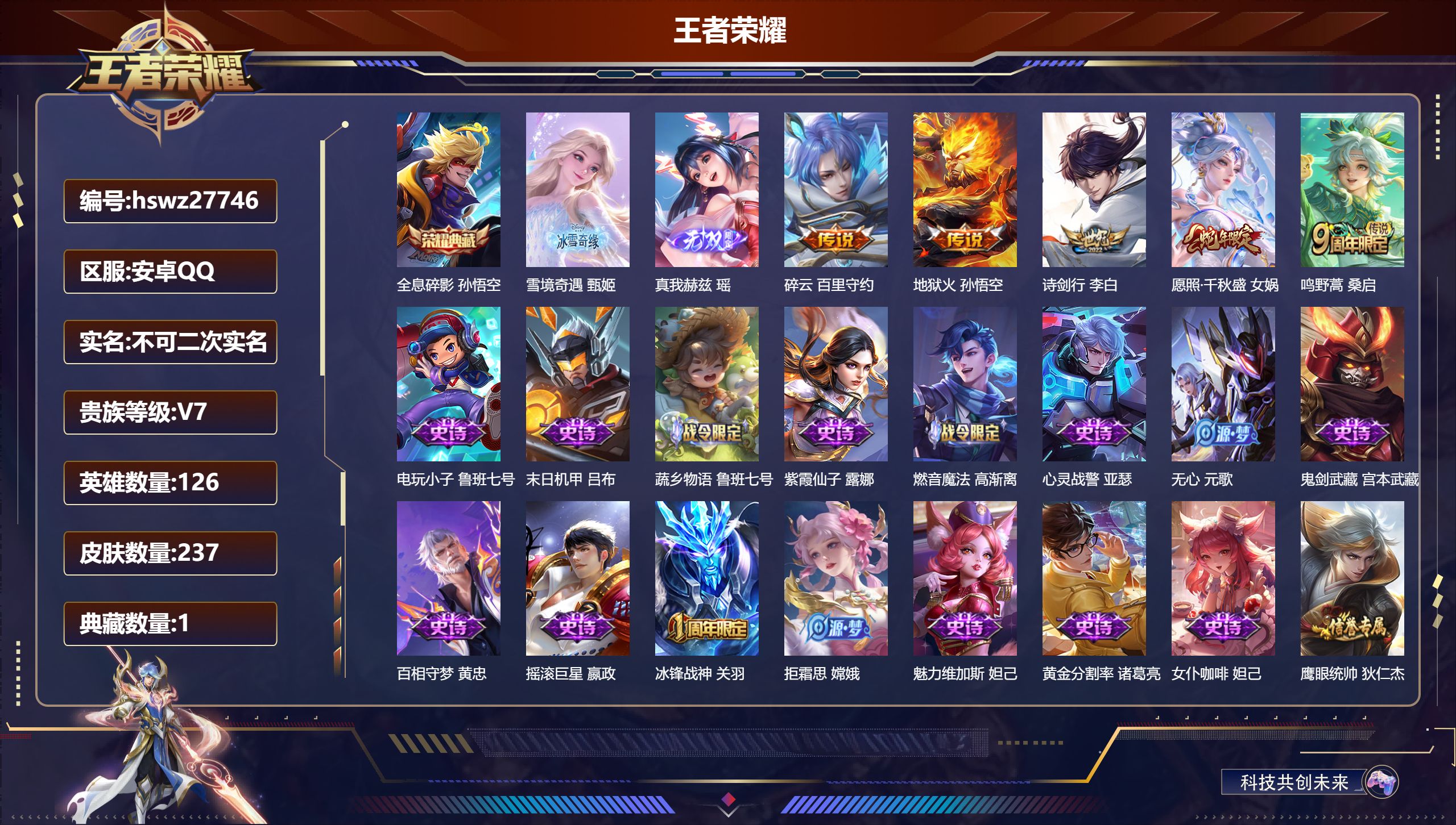 PX_2546312-Q/荣耀黄金/237皮肤/126英雄/1典藏/0珍品无双/2无双/0珍品传说/5传说/48史诗/8稀有英雄 【1,典藏皮肤】全息碎影,孙悟空, 【2,无双皮肤】雪境奇遇,甄姬,真我赫兹,瑶, 【5,传说皮肤】碎云,百里守约,地狱火,孙悟空,诗剑行,李白,愿照·千秋盛,女娲,鸣野蒿,桑启, 【48,史诗皮肤】电玩小子,鲁班七号,末日机甲,吕布,蔬乡物语,鲁班七号,紫霞仙子,露娜,燃音魔法,高渐离,心灵战警,亚瑟,无心,元歌,鬼剑武藏,宫本武藏,百相守梦,黄忠,摇滚巨星,嬴政,冰锋战神,关羽,拒霜思,嫦娥,魅力维加斯,妲己,黄金分割率,诸葛亮,女仆咖啡,妲己,鹰眼统帅,狄仁杰,大圣娶亲,孙悟空,李小龙,裴擒虎,特工魅影,百里守约,逐浪之夏,李元芳,魔术师,狄仁杰,皇家上将,赵云,至尊宝,孙悟空,梁祝,上官婉儿,天才门将,刘禅,圣诞恋歌,貂蝉,云间偶戏,元歌,水晶猎龙者,花木兰,涂山容容,公孙离,破空之剑,亚连,圣诞狂欢,吕布,圣诞老人,老夫子,蔷薇恋人,孙尚香,冰雪圆舞曲,甄姬,青蛇,小乔,千年之狐,李白,节奏热浪,阿轲,暗夜猫娘,阿轲,织梦人,西施,游园惊梦,甄姬,曙光守护者,铠,万灵启世,女娲,心灵骇客,安琪拉,乱世虎臣,张飞,谪仙醉月,李白,水果甜心,孙尚香,江河有灵,阿古朵,暗隐猎兽者,兰陵王, 【122,勇者皮肤】圆桌骑士,盾山,烛龙,曹操,爱心护理,阿轲,太极少年,赵怀真,沙漠行僧,达摩,大漠名商,沈梦溪,缤纷绘卷,张良,纽约教父,刘备,拳王,达摩,大发明家,达摩,龙舞盛年,沈梦溪,功夫炙烤,廉颇,沉稳之力,孙尚香,海盐诗旅,桑启,朔风刀,夏侯惇,归虚梦演,孙膑,汉昭烈帝,刘备,白色死神,白起,黄金武士,典韦,御旌,牛魔,阴阳师,狄仁杰,炼金王,扁鹊,致命风华,阿轲,次元突破,哪吒,古海寻踪,张良,功夫老勺,老夫子,鲨炮海盗猫,沈梦溪,海滩派对,项羽,完美运算,后羿,万华元夜,狄仁杰,克喵,鬼谷子,踏浪烽翎,莱西奥,演武夺筹,程咬金,西部游侠,莱西奥,蜃楼王,庄周,哥特玫瑰,露娜,守护之力,大乔,无双福将,程咬金,原初探秘者,鬼谷子,潮玩探月行,猪八戒,天穹祈灯,鬼谷子,化身博士,扁鹊,潮玩骑士王,亚瑟,阿尔法小队,后羿,五福同心,张飞,狮心王,亚瑟,次元傲视,杨戬,星际陆战队,程咬金,幻乐之宴,鬼谷子,东方不败,武则天,霸王丸,宫本武藏,虹云星官,明世隐,死亡骑士,亚瑟,浪漫序章,刘备,敏锐之力,李白,玩偶对对碰,安琪拉,掌控之力,诸葛亮,海滩丽影,钟无艳,忍·炎影,赵云,狰,白起,雪境奇遇,西施,重明,芈月,坚韧之力,苏烈,唤灵魔甲,刘禅,万事如意,刘备,乓乓大师,鲁班大师,妖精王,孙膑,探海日志,鲁班大师,天使之翼,孙膑,雾都夜雨,干将莫邪,玩趣恶龙,高渐离,兔女郎,花木兰,龙腾万里,关羽,金庭之子,兰陵王,未来纪元,宫本武藏,罗小黑战记,哪吒,零食大作战,姬小满,花好人间,甄姬,万象初新,宫本武藏,御銮,盾山,时尚教父,姜子牙,春野之旅,钟无艳,秘密基地,刘禅,穷奇,典韦,教廷特使,韩信,街头霸王,韩信,云中旅人,李元芳,妄想特派,李元芳,西部大镖客,孙悟空,凯尔特女王,虞姬,蔬乡物语,李元芳,少女阿狸,妲己,灵卜魔法,妲己,御霄,米莱狄,春野闲踪,苏烈,布丁狗之约,阿古朵,命运加冕,露娜,小满鸭,姬小满,幻想奇妙夜,王昭君,灵野札记,张良,驱傩正仪,钟馗,命运角斗场,狂铁,死霸装,白起,特工战影,狂铁,御狮,狂铁,白执事,赵云,饕餮,太乙真人,神迹守卫,孙悟空,剑破天穹,刘邦,熔金海岸,周瑜,苍林狼骑,苍,天穹之誓,姜子牙,星梦巡礼,姜子牙,谧流熔炉,太乙真人,群星魔术团,程咬金,经纬探寻者,盘古,鹤鸣心笺,艾琳,云械蓝图,云中君,逆浪荇歌,甄姬,噬灭天穹,东皇太一,敬我三分,盘古,玫蓝誓约,戈娅, 【60,其他皮肤】伊势巫女,大乔,金属狂潮,高渐离,前尘,金蝉,圣殿之光,刘邦,芝加哥教父,黄忠,潮流仙人,老夫子,三太子,哪吒,棒球奇才,沈梦溪,极冰防御线,盾山,龙域领主,铠,生化警戒,钟无艳,死神来了,曹操,花见巫女,伽罗,第七人偶,干将莫邪,木偶奇遇记,鲁班七号,福禄兄弟,鲁班七号,帝国元帅,项羽,精灵王,后羿,绯红之刃,露娜,冰刃幻境,镜,碧珀绯影,暃,海军大将,周瑜,星航指挥官,诸葛亮,英喵野望,刘禅,午夜歌剧院,元歌,启蛰,司空震,隐刃,兰陵王,花间舞,公孙离,异域舞娘,貂蝉,街头旋风,裴擒虎,修竹墨客,上官婉儿,剑舞者,花木兰,范海辛,李白,维京掠夺者,苍,占星师,明世隐,归虚梦演,蒙犽,激情绿茵,马可波罗,埃及法老,杨戬,归虚梦演,西施,阿摩司公爵,鬼谷子,尼罗河女神,女娲,锦衣卫,狄仁杰,一千零一夜,张良,幸存者,马超,战争女神,雅典娜,创世神祝,盘古,特种部队,李元芳,绝影神枪,百里守约,蔷薇王座,蔡文姬,森,瑶,孤猎,澜,加勒比小姐,虞姬,精灵公主,王昭君,赤焰之缨,云缨,露花倒影,嫦娥,地府判官,钟馗,美梦成真,梦奇,天启骑士,关羽,圆桌骑士,太乙真人,西部大镖客,孙悟空, 【8,稀有英雄】嬴政,不知火舞,橘右京,夏洛特,娜可露露,韩信,艾琳,赵云, 营地ID:,
