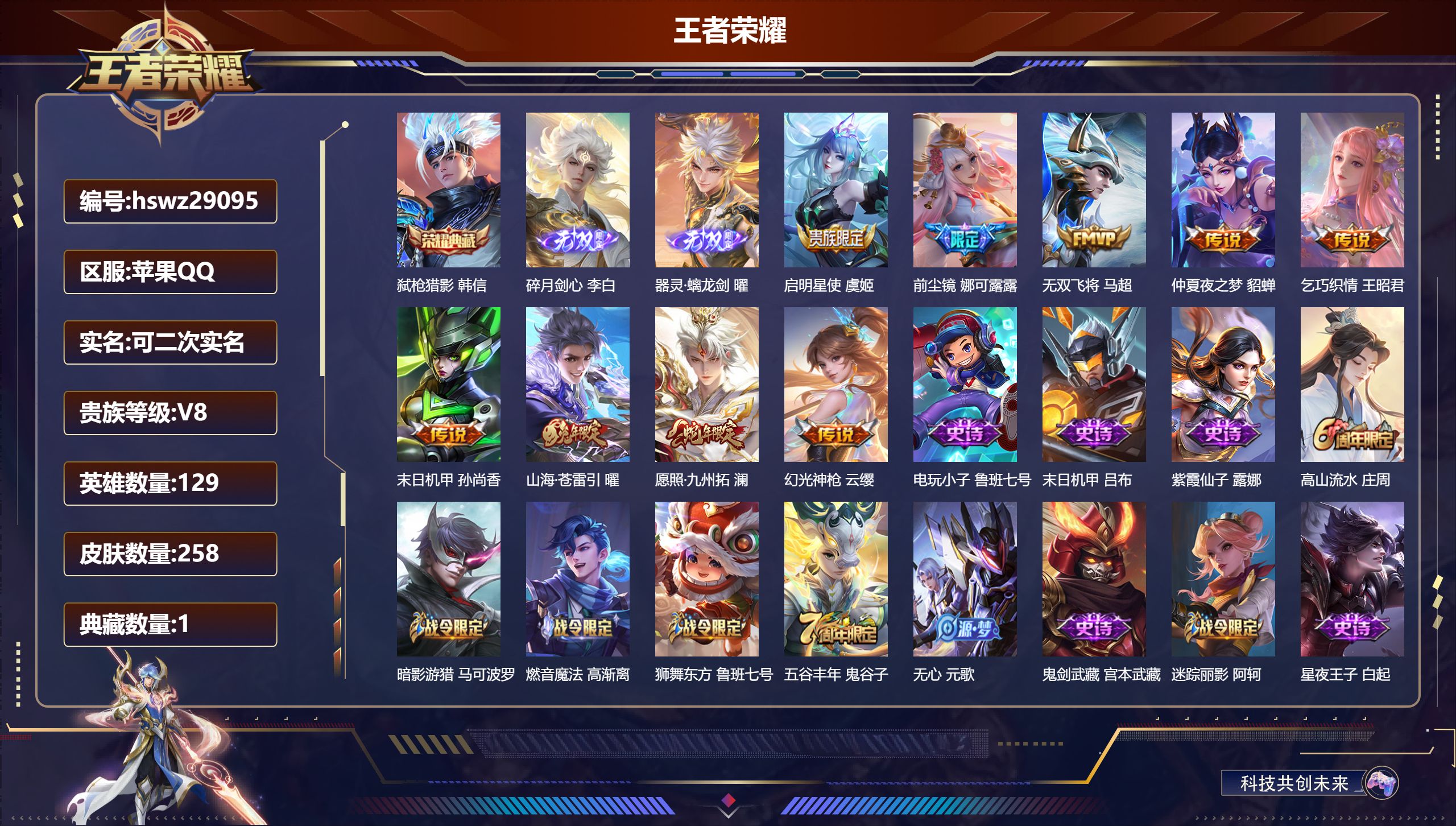 PX_2576927-Q/至尊星耀/93皮肤/98英雄/0典藏/0珍品无双/0无双/1珍品传说/4传说/25史诗/7稀有英雄 【1,珍品传说】兔狲·蓬尾,张飞, 【4,传说皮肤】无双飞将,马超,云鹰飞将,曜,地狱之眼,宫本武藏,黄金狮子座,达摩, 【25,史诗皮肤】末日机甲,吕布,高山流水,庄周,天秀·启明,杨戬,德古拉伯爵,刘邦,无心,元歌,鬼剑武藏,宫本武藏,无限星赏官,公孙离,线条小狗,周瑜,摇滚巨星,嬴政,魅力维加斯,妲己,舞动绿茵,蔡文姬,鹰眼统帅,狄仁杰,特工魅影,百里守约,逐浪之夏,李元芳,藏狐·褐绒,老夫子,雪豹·霜爪,百里守约,鸭鸭历险记,刘禅,魔术师,狄仁杰,龙之律动,狂铁,皇家上将,赵云,功夫厨神,程咬金,魅语,不知火舞,曙光守护者,铠,水果甜心,孙尚香,暗隐猎兽者,兰陵王, 【49,勇者皮肤】缤纷绘卷,张良,拳王,达摩,醍醐杖,老夫子,汉昭烈帝,刘备,白色死神,白起,黄金武士,典韦,阴阳师,狄仁杰,径山谋武,孙权,戏梦巡演,空空儿,海滩派对,项羽,万华元夜,狄仁杰,踏浪烽翎,莱西奥,演武夺筹,程咬金,野性能量,吕布,守护之力,大乔,原初探秘者,鬼谷子,疑决卦,明世隐,阿尔法小队,后羿,次元傲视,杨戬,潮玩牛仔,马可波罗,敏锐之力,李白,忍·炎影,赵云,雪境奇遇,西施,坚韧之力,苏烈,万事如意,刘备,乓乓大师,鲁班大师,溯影追猎,虞姬,玩趣恶龙,高渐离,兔女郎,花木兰,龙腾万里,关羽,罗小黑战记,哪吒,荣光之誓,亚瑟,万象初新,宫本武藏,少女阿狸,妲己,混沌棋,弈星,御霄,米莱狄,春野闲踪,苏烈,布丁狗之约,阿古朵,命运加冕,露娜,灵野札记,张良,驱傩正仪,钟馗,鸭鸭历险记,沈梦溪,死霸装,白起,虚灵犬护,钟馗,班班快跑,鲁班七号,星梦巡礼,姜子牙,鹤鸣心笺,艾琳,逆浪荇歌,甄姬,线条小狗,周瑜, 【16,其他皮肤】伊势巫女,大乔,圣殿之光,刘邦,棒球奇才,沈梦溪,极冰防御线,盾山,龙域领主,铠,木偶奇遇记,鲁班七号,福禄兄弟,鲁班七号,启蛰,司空震,霓裳曲,杨玉环,东海龙王,东皇太一,修竹墨客,上官婉儿,埃及法老,杨戬,归虚梦演,西施,兔狲·蓬尾,张飞,创世神祝,盘古,加勒比小姐,虞姬, 【7,稀有英雄】不知火舞,橘右京,夏洛特,娜可露露,韩信,艾琳,赵云, 营地ID:,