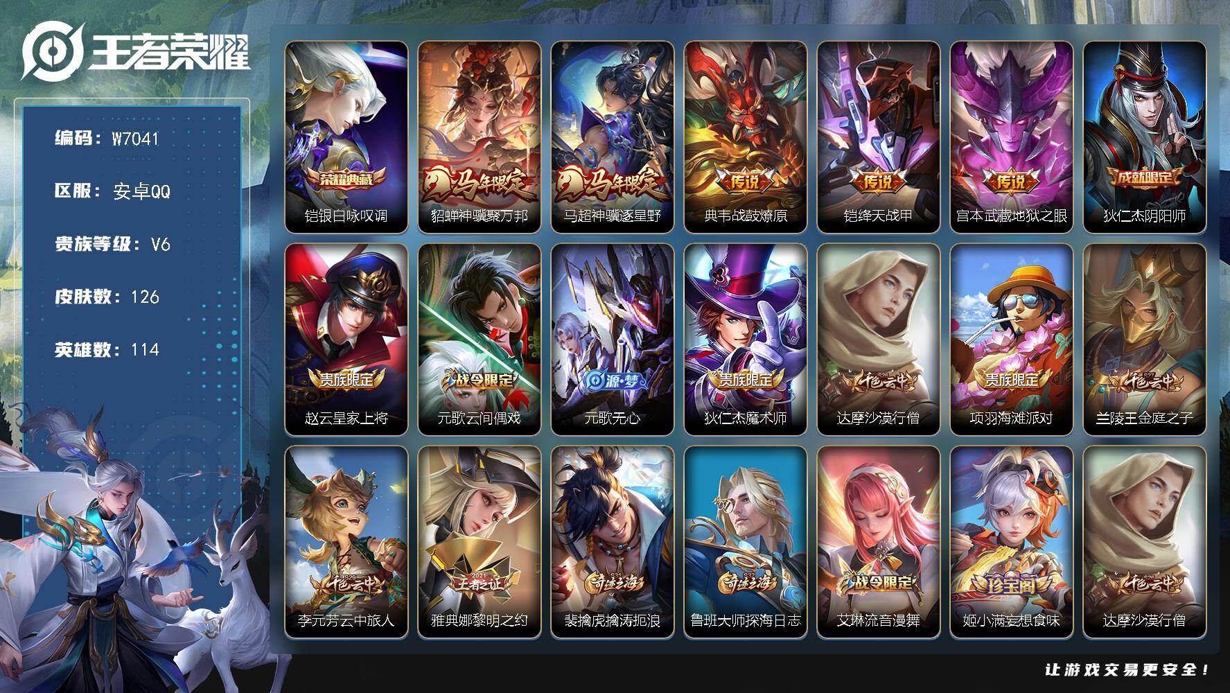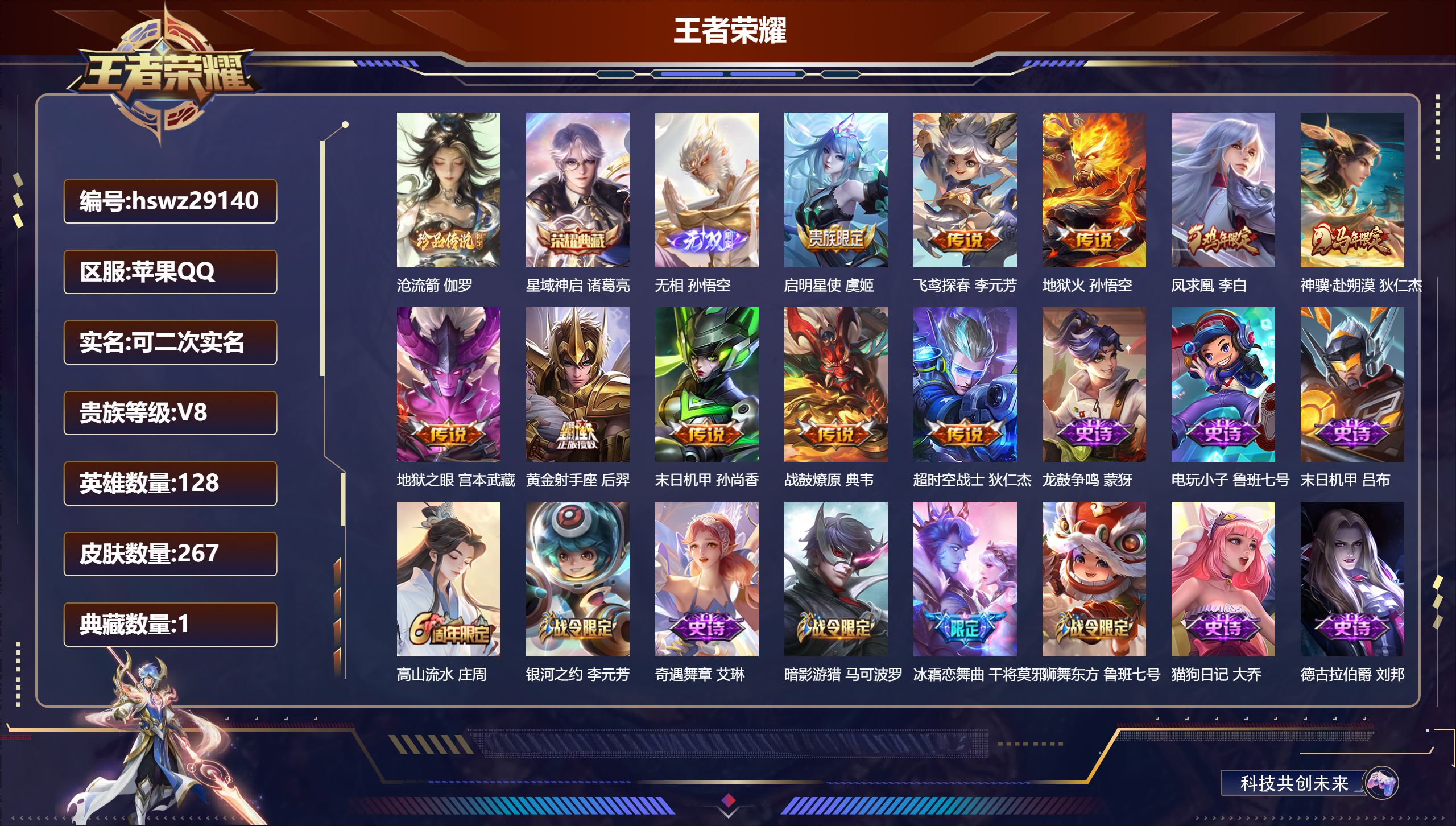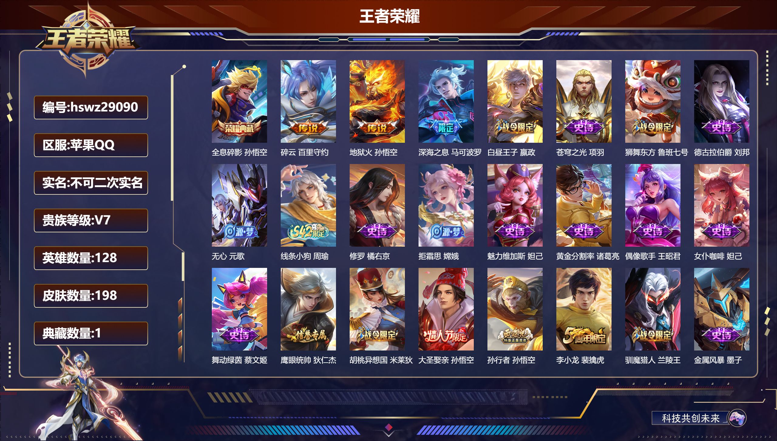 PX_2576902-Q/永恒钻石/198皮肤/128英雄/1典藏/0珍品无双/0无双/0珍品传说/3传说/56史诗/8稀有英雄 【1,典藏皮肤】全息碎影,孙悟空, 【3,传说皮肤】碎云,百里守约,地狱火,孙悟空,深海之息,马可波罗, 【56,史诗皮肤】白昼王子,嬴政,苍穹之光,项羽,狮舞东方,鲁班七号,德古拉伯爵,刘邦,无心,元歌,线条小狗,周瑜,修罗,橘右京,拒霜思,嫦娥,魅力维加斯,妲己,黄金分割率,诸葛亮,偶像歌手,王昭君,女仆咖啡,妲己,舞动绿茵,蔡文姬,鹰眼统帅,狄仁杰,胡桃异想国,米莱狄,大圣娶亲,孙悟空,孙行者,孙悟空,李小龙,裴擒虎,驯魔猎人,兰陵王,金属风暴,墨子,特工魅影,百里守约,猫狗日记,孙策,原初追逐者,百里玄策,逐浪之夏,李元芳,未来纪元,赵云,时之彼端,妲己,黎明之约,雅典娜,魔术师,狄仁杰,龙之律动,狂铁,皇家上将,赵云,至尊宝,孙悟空,辉光之辰,后羿,功夫厨神,程咬金,梁祝,上官婉儿,圣诞恋歌,貂蝉,水晶猎龙者,花木兰,圣诞狂欢,吕布,白龙吟,韩信,地狱岩魂,廉颇,冰雪圆舞曲,甄姬,航海奇遇记,老夫子,千年之狐,李白,节奏热浪,阿轲,暗夜猫娘,阿轲,曙光守护者,铠,乱世虎臣,张飞,绅士熊喵,刘禅,缤纷独角兽,小乔,蓝屏警告,典韦,真爱魔法,干将莫邪,水果甜心,孙尚香,狂想玩偶喵,蒙犽,化蝶舞,阿轲,幽灵船长,曹操,乘风破浪,夏侯惇,暗隐猎兽者,兰陵王, 【102,勇者皮肤】圆桌骑士,盾山,烛龙,曹操,星际陆战队,达摩,沙漠行僧,达摩,大漠名商,沈梦溪,暖冬絮语,程咬金,缤纷绘卷,张良,纽约教父,刘备,大发明家,达摩,丁香结,小乔,功夫炙烤,廉颇,铁甲之心,典韦,沉稳之力,孙尚香,幻泉雾影,海月,朔风刀,夏侯惇,醍醐杖,老夫子,朔望之晖,女娲,归虚梦演,孙膑,汉昭烈帝,刘备,黄金武士,典韦,御旌,牛魔,阴阳师,狄仁杰,次元突破,哪吒,古海寻踪,张良,科学大爆炸,项羽,功夫老勺,老夫子,西部大镖客,牛魔,鲨炮海盗猫,沈梦溪,虎啸剑宗,刘邦,海滩派对,项羽,万华元夜,狄仁杰,演武夺筹,程咬金,奇妙博物学,庄周,猎兽之王,吕布,野性能量,吕布,哥特玫瑰,露娜,守护之力,大乔,无双福将,程咬金,瓷语鉴心,露娜,百相守梦,影,原初探秘者,鬼谷子,潮玩探月行,猪八戒,天穹祈灯,鬼谷子,疑决卦,明世隐,化身博士,扁鹊,五福同心,张飞,星际陆战队,程咬金,幻乐之宴,鬼谷子,霸王丸,宫本武藏,虹云星官,明世隐,雾影缉谜,兰陵王,赤莲之焰,周瑜,死亡骑士,亚瑟,玩偶对对碰,安琪拉,掌控之力,诸葛亮,海滩丽影,钟无艳,圣弓游侠,后羿,忍·炎影,赵云,狰,白起,重明,芈月,炽热元素使,姜子牙,万事如意,刘备,乓乓大师,鲁班大师,女武神,艾琳,天使之翼,孙膑,兔女郎,花木兰,龙腾万里,关羽,金庭之子,兰陵王,未来纪元,宫本武藏,千军破阵,苏烈,花好人间,甄姬,万象初新,宫本武藏,御銮,盾山,单词大作战,雅典娜,秘密基地,刘禅,穷奇,典韦,教廷特使,韩信,街头霸王,韩信,云中旅人,李元芳,妄想特派,李元芳,神迹守卫,墨子,少女阿狸,妲己,混沌棋,弈星,御霄,米莱狄,春野闲踪,苏烈,契约魔法,米莱狄,布丁狗之约,阿古朵,幻想奇妙夜,王昭君,灵野札记,张良,驱傩正仪,钟馗,神迹守卫,钟馗,特工战影,狂铁,御狮,狂铁,饕餮,太乙真人,剑破天穹,刘邦,熔金海岸,周瑜,天穹之誓,姜子牙,星梦巡礼,姜子牙,谧流熔炉,太乙真人,暗都幽影,大司命,海之女神,海月,线条小狗,周瑜, 【37,其他皮肤】金属狂潮,高渐离,前尘,金蝉,战争骑士,夏侯惇,芝加哥教父,黄忠,潮流仙人,老夫子,三太子,哪吒,棒球奇才,沈梦溪,极冰防御线,盾山,龙域领主,铠,生化警戒,钟无艳,死神来了,曹操,花见巫女,伽罗,灼热之刃,李信,福禄兄弟,鲁班七号,精灵王,后羿,绯红之刃,露娜,海军大将,周瑜,隐刃,兰陵王,异域舞娘,貂蝉,东海龙王,东皇太一,修竹墨客,上官婉儿,激情绿茵,马可波罗,埃及法老,杨戬,尼罗河女神,女娲,锦衣卫,狄仁杰,一千零一夜,张良,归虚梦演,曜,威尼斯狂欢,百里玄策,战争女神,雅典娜,特种部队,李元芳,绝影神枪,百里守约,孤猎,澜,加勒比小姐,虞姬,踏雪寻梅,弈星,秩序猎龙将,蒙恬,赤焰之缨,云缨,美梦成真,梦奇, 【8,稀有英雄】嬴政,不知火舞,橘右京,夏洛特,娜可露露,韩信,艾琳,赵云, 营地ID:,