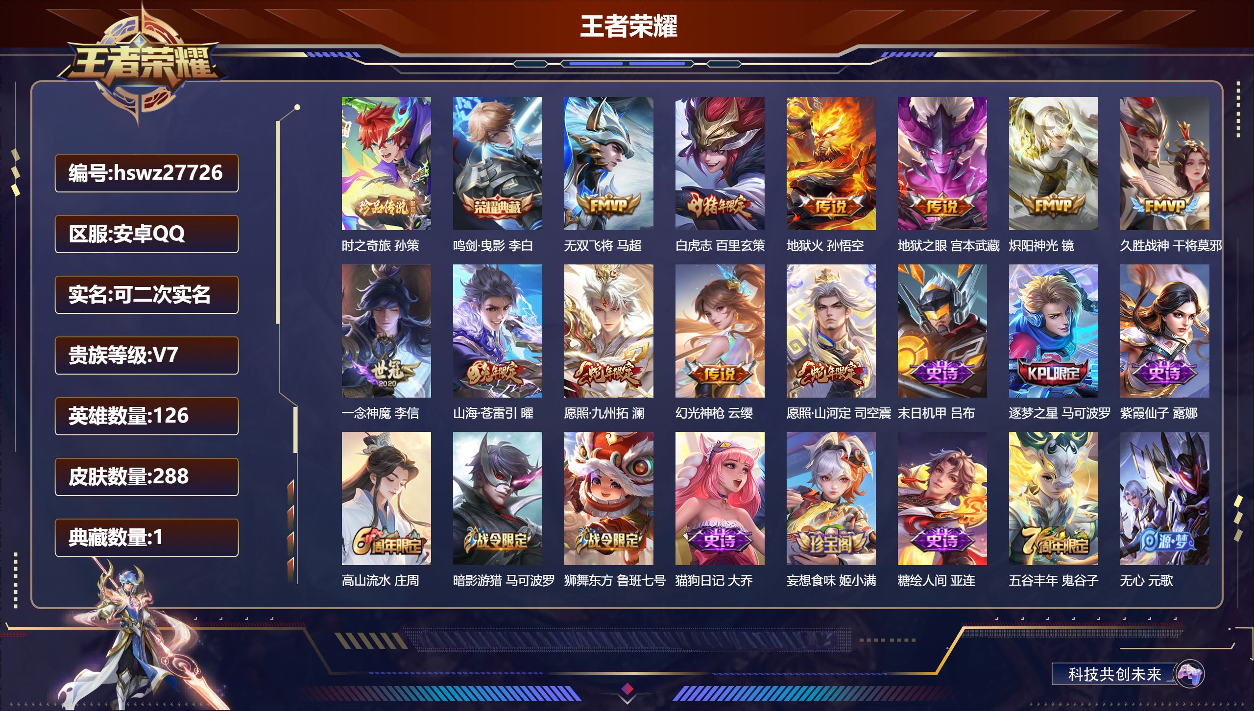 PX_2546199-Q/无双王者/288皮肤/126英雄/1典藏/0珍品无双/0无双/1珍品传说/11传说/79史诗/7稀有英雄 【1,珍品传说】时之奇旅,孙策, 【1,典藏皮肤】鸣剑·曳影,李白, 【11,传说皮肤】无双飞将,马超,白虎志,百里玄策,地狱火,孙悟空,地狱之眼,宫本武藏,炽阳神光,镜,久胜战神,干将莫邪,一念神魔,李信,山海·苍雷引,曜,愿照·九州拓,澜,幻光神枪,云缨,愿照·山河定,司空震, 【79,史诗皮肤】末日机甲,吕布,逐梦之星,马可波罗,紫霞仙子,露娜,高山流水,庄周,暗影游猎,马可波罗,狮舞东方,鲁班七号,猫狗日记,大乔,妄想食味,姬小满,糖绘人间,亚连,五谷丰年,鬼谷子,无心,元歌,鬼剑武藏,宫本武藏,百相守梦,黄忠,星夜王子,白起,地狱燃心,司空震,线条小狗,周瑜,遇见飞天,杨玉环,摇滚巨星,嬴政,顽趣,梦奇,冰锋战神,关羽,修罗,橘右京,魅力维加斯,妲己,黄金分割率,诸葛亮,偶像歌手,王昭君,荣光圣徽,蒙恬,女仆咖啡,妲己,九幽镇关,项羽,舞动绿茵,蔡文姬,繁星吟游,蔡文姬,暗夜贵公子,嬴政,鹰眼统帅,狄仁杰,大圣娶亲,孙悟空,李小龙,裴擒虎,纤云弄巧,云中君,龙骑士,墨子,金属风暴,墨子,逐梦之影,韩信,特工魅影,百里守约,猫狗日记,孙策,原初追逐者,百里玄策,逐浪之夏,李元芳,未来纪元,赵云,藏狐·褐绒,老夫子,黎明之约,雅典娜,优雅恋人,嬴政,魔术师,狄仁杰,热力回旋,百里玄策,龙之律动,狂铁,神威,马超,皇家上将,赵云,冰冠公主,雅典娜,至尊宝,孙悟空,功夫厨神,程咬金,圣诞恋歌,貂蝉,云间偶戏,元歌,水晶猎龙者,花木兰,涂山容容,公孙离,御风骁将,吕布,圣诞狂欢,吕布,天狼绘梦者,上官婉儿,地狱岩魂,廉颇,冰雪圆舞曲,甄姬,月团寄思,沈梦溪,航海奇遇记,老夫子,千年之狐,李白,节奏热浪,阿轲,暗夜猫娘,阿轲,曙光守护者,铠,万灵启世,女娲,乱世虎臣,张飞,龙胆,赵云,天狼狩猎者,裴擒虎,水果甜心,孙尚香,狂想玩偶喵,蒙犽,化蝶舞,阿轲,江河有灵,阿古朵,幽灵船长,曹操,乘风破浪,夏侯惇,暗隐猎兽者,兰陵王, 【135,勇者皮肤】时空谍影,海诺,圆桌骑士,盾山,烛龙,曹操,爱心护理,阿轲,沙漠行僧,达摩,大漠名商,沈梦溪,缤纷绘卷,张良,纽约教父,刘备,拳王,达摩,大发明家,达摩,乐园追猎者,白起,丁香结,小乔,功夫炙烤,廉颇,沉稳之力,孙尚香,爱与正义,程咬金,海盐诗旅,桑启,幻泉雾影,海月,朔风刀,夏侯惇,醍醐杖,老夫子,归虚梦演,孙膑,汉昭烈帝,刘备,白色死神,白起,黑桃队长,鲁班七号,黄金武士,典韦,御旌,牛魔,阴阳师,狄仁杰,径山谋武,孙权,次元突破,哪吒,古海寻踪,张良,功夫老勺,老夫子,西部大镖客,牛魔,鲨炮海盗猫,沈梦溪,海滩派对,项羽,完美运算,后羿,万华元夜,狄仁杰,无尽征程,廉颇,克喵,鬼谷子,踏浪烽翎,莱西奥,演武夺筹,程咬金,红桃皇后,芈月,野性能量,吕布,哥特玫瑰,露娜,守护之力,大乔,无双福将,程咬金,瓷语鉴心,露娜,百相守梦,影,原初探秘者,鬼谷子,潮玩探月行,猪八戒,天穹祈灯,鬼谷子,西部大镖客,猪八戒,疑决卦,明世隐,化身博士,扁鹊,潮玩骑士王,亚瑟,阿尔法小队,后羿,五福同心,张飞,次元傲视,杨戬,星际陆战队,程咬金,幻乐之宴,鬼谷子,霸王丸,宫本武藏,虹云星官,明世隐,雾影缉谜,兰陵王,舞狮寰,吕布,死亡骑士,亚瑟,敏锐之力,李白,危途狂花,戈娅,玩偶对对碰,安琪拉,掌控之力,诸葛亮,海滩丽影,钟无艳,忍·炎影,赵云,雪境奇遇,西施,重明,芈月,炽热元素使,姜子牙,坚韧之力,苏烈,唤灵魔甲,刘禅,万事如意,刘备,擒涛扼浪,裴擒虎,苍云破阵,蒙恬,乓乓大师,鲁班大师,死亡摇滚,高渐离,溯影追猎,虞姬,极光幻客,蚩奼,探海日志,鲁班大师,女武神,艾琳,天使之翼,孙膑,雾都夜雨,干将莫邪,兔女郎,花木兰,龙腾万里,关羽,流音漫舞,艾琳,金庭之子,兰陵王,千军破阵,苏烈,花好人间,甄姬,万象初新,宫本武藏,聚星闪耀,钟无艳,御銮,盾山,单词大作战,雅典娜,时尚教父,姜子牙,秘密基地,刘禅,穷奇,典韦,教廷特使,韩信,街头霸王,韩信,云中旅人,李元芳,妄想特派,李元芳,神迹守卫,墨子,少女阿狸,妲己,混沌棋,弈星,御霄,米莱狄,蔚蓝守将,蒙恬,春野闲踪,苏烈,契约魔法,米莱狄,布丁狗之约,阿古朵,命运加冕,露娜,幻想奇妙夜,王昭君,灵野札记,张良,驱傩正仪,钟馗,神迹守卫,钟馗,命运角斗场,狂铁,死霸装,白起,特工战影,狂铁,虚灵犬护,钟馗,御狮,狂铁,班班快跑,鲁班七号,劲辣红锅,太乙真人,罗小黑战记,张良,铁骨偃魂,典韦,苍林狼骑,苍,天穹之誓,姜子牙,星梦巡礼,姜子牙,谧流熔炉,太乙真人,暗都幽影,大司命,鹤鸣心笺,艾琳,云械蓝图,云中君,线条小狗,周瑜,线条小狗,桑启,灵卦秘语,少司缘,景韶洛都,明世隐, 【63,其他皮肤】伊势巫女,大乔,金属狂潮,高渐离,前尘,金蝉,战争骑士,夏侯惇,圣殿之光,刘邦,芝加哥教父,黄忠,三太子,哪吒,棒球奇才,沈梦溪,极冰防御线,盾山,龙域领主,铠,生化警戒,钟无艳,花见巫女,伽罗,第七人偶,干将莫邪,万圣前夜,小乔,灼热之刃,李信,熊喵少女,阿古朵,海之征途,孙策,福禄兄弟,鲁班七号,精灵王,后羿,绯红之刃,露娜,冰刃幻境,镜,碧珀绯影,暃,海军大将,周瑜,魇语军师,司马懿,午夜歌剧院,元歌,启蛰,司空震,隐刃,兰陵王,花间舞,公孙离,异域舞娘,貂蝉,街头旋风,裴擒虎,归虚梦演,鲁班大师,东海龙王,东皇太一,修竹墨客,上官婉儿,范海辛,李白,维京掠夺者,苍,占星师,明世隐,归虚梦演,蒙犽,激情绿茵,马可波罗,埃及法老,杨戬,归虚梦演,西施,阿摩司公爵,鬼谷子,画中游,桑启,尼罗河女神,女娲,锦衣卫,
