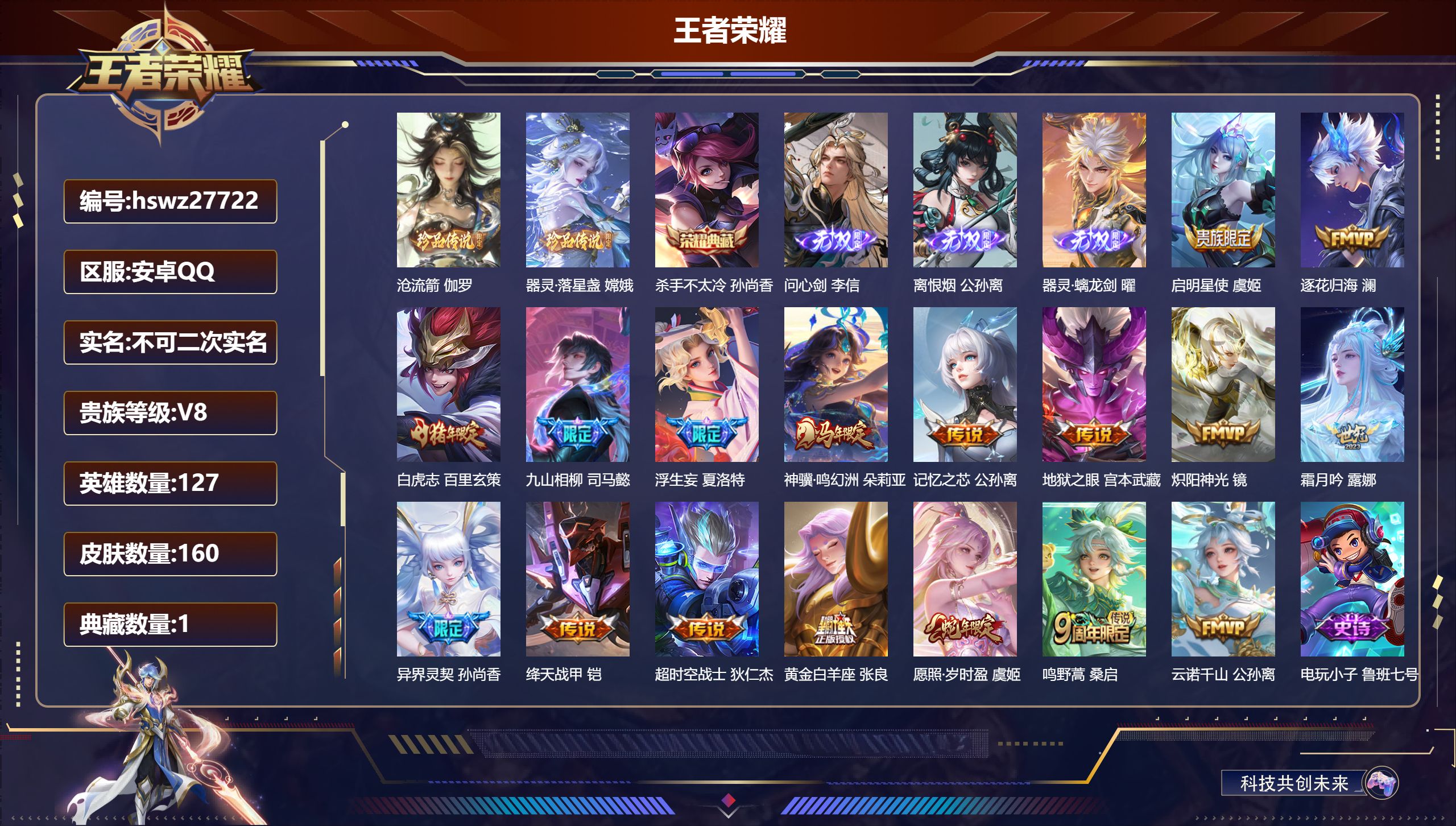 PX_2546181-Q/至尊星耀/160皮肤/127英雄/1典藏/0珍品无双/3无双/2珍品传说/17传说/57史诗/8稀有英雄 【2,珍品传说】沧流箭,伽罗,器灵·落星盏,嫦娥, 【1,典藏皮肤】杀手不太冷,孙尚香, 【3,无双皮肤】问心剑,李信,离恨烟,公孙离,器灵·螭龙剑,曜, 【17,传说皮肤】启明星使,虞姬,逐花归海,澜,白虎志,百里玄策,九山相柳,司马懿,浮生妄,夏洛特,神骥·鸣幻洲,朵莉亚,记忆之芯,公孙离,地狱之眼,宫本武藏,炽阳神光,镜,霜月吟,露娜,异界灵契,孙尚香,绛天战甲,铠,超时空战士,狄仁杰,黄金白羊座,张良,愿照·岁时盈,虞姬,鸣野蒿,桑启,云诺千山,公孙离, 【57,史诗皮肤】电玩小子,鲁班七号,暗渊魔法,司马懿,燃音魔法,高渐离,冰霜恋舞曲,干将莫邪,天秀·音浪,高渐离,猫狗日记,大乔,德古拉伯爵,刘邦,鬼剑武藏,宫本武藏,星夜王子,白起,线条小狗,周瑜,魅力维加斯,妲己,黄金分割率,诸葛亮,偶像歌手,王昭君,白蛇,大乔,赏金猎手,澜,九幽镇关,项羽,晚萤,娜可露露,暗夜贵公子,嬴政,鹰眼统帅,狄仁杰,光弋星穹,莱西奥,春霖将至,上官婉儿,原初追逐者,百里玄策,逐浪之夏,李元芳,时之彼端,妲己,灵蛊蚀心,扁鹊,黎明之约,雅典娜,石田雨龙,后羿,鸭鸭历险记,刘禅,魔术师,狄仁杰,埋骨钱,暃,龙之律动,狂铁,顽岩魄,蒙犽,皇家上将,赵云,天才门将,刘禅,水晶猎龙者,花木兰,涂山容容,公孙离,破空之剑,亚连,心动手记,海诺,圣诞狂欢,吕布,青焰无极,镜,器灵·浮梦炉,赵怀真,星界战将,牛魔,茶境仙,孙膑,冰雪圆舞曲,甄姬,月团寄思,沈梦溪,千年之狐,李白,节奏热浪,阿轲,万灵启世,女娲,万物之道,弈星,星界特工,马可波罗,陌上桑,艾琳,线条小狗,小乔,水果甜心,孙尚香,狂想玩偶喵,蒙犽,化蝶舞,阿轲,幽灵船长,曹操,乘风破浪,夏侯惇, 【65,勇者皮肤】拳王,达摩,龙舞盛年,沈梦溪,功夫炙烤,廉颇,沉稳之力,孙尚香,阴阳师,狄仁杰,次元突破,哪吒,鲨炮海盗猫,沈梦溪,海滩派对,项羽,踏浪烽翎,莱西奥,红桃皇后,芈月,西部游侠,莱西奥,哥特玫瑰,露娜,百相守梦,影,天穹祈灯,鬼谷子,阿尔法小队,后羿,东方不败,武则天,雾影缉谜,兰陵王,救世之瞳,扁鹊,赤刃凌霄,敖隐,死亡骑士,亚瑟,浪漫序章,刘备,危途狂花,戈娅,破局者,亚连,海滩丽影,钟无艳,忍·炎影,赵云,雪境奇遇,西施,乓乓大师,鲁班大师,逐霄之志,曹操,溯影追猎,虞姬,极光幻客,蚩奼,雾都夜雨,干将莫邪,兔女郎,花木兰,罗小黑战记,哪吒,往忆晖光,明世隐,荣光之誓,亚瑟,花好人间,甄姬,街头霸王,韩信,灵卜魔法,妲己,春野闲踪,苏烈,布丁狗之约,阿古朵,命运加冕,露娜,灵野札记,张良,鸭鸭历险记,沈梦溪,特工战影,狂铁,虚灵犬护,钟馗,剑破天穹,刘邦,苍威无极,项羽,铁骨偃魂,典韦,熔金海岸,周瑜,苍林狼骑,苍,天穹之誓,姜子牙,魅影绮裳,影,访茗客,马超,星梦巡礼,姜子牙,谧流熔炉,太乙真人,群星魔术团,程咬金,暗都幽影,大司命,鹤鸣心笺,艾琳,逆浪荇歌,甄姬,线条小狗,周瑜,线条小狗,桑启,噬灭天穹,东皇太一,灵卦秘语,少司缘,玫蓝誓约,戈娅,景韶洛都,明世隐, 【18,其他皮肤】沧流箭,伽罗,极冰防御线,盾山,龙域领主,铠,花见巫女,伽罗,未来旅行,孙膑,魇语军师,司马懿,午夜歌剧院,元歌,启蛰,司空震,花间舞,公孙离,占星师,明世隐,归虚梦演,蒙犽,激情绿茵,马可波罗,孤猎,澜,加勒比小姐,虞姬,踏雪寻梅,弈星,赤焰之缨,云缨,露花倒影,嫦娥,器灵·落星盏,嫦娥, 【8,稀有英雄】敖隐,不知火舞,橘右京,夏洛特,娜可露露,韩信,艾琳,赵云, 营地ID:,