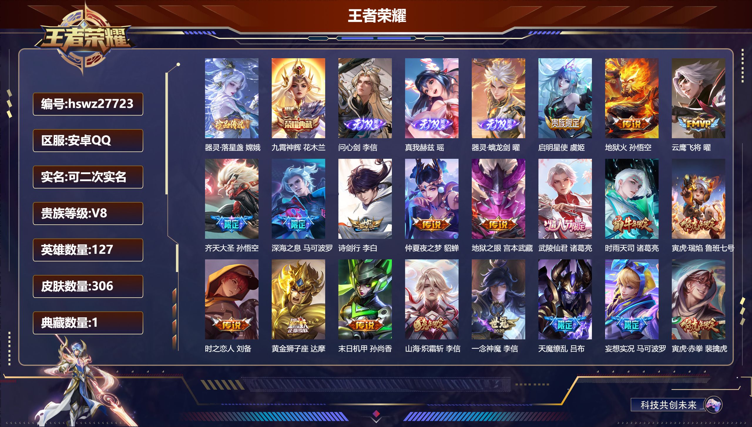 PX_2546189-Q/最强王者/306皮肤/127英雄/1典藏/0珍品无双/3无双/1珍品传说/24传说/92史诗/8稀有英雄 【1,珍品传说】器灵·落星盏,嫦娥, 【1,典藏皮肤】九霄神辉,花木兰, 【3,无双皮肤】问心剑,李信,真我赫兹,瑶,器灵·螭龙剑,曜, 【24,传说皮肤】启明星使,虞姬,地狱火,孙悟空,云鹰飞将,曜,齐天大圣,孙悟空,深海之息,马可波罗,诗剑行,李白,仲夏夜之梦,貂蝉,地狱之眼,宫本武藏,武陵仙君,诸葛亮,时雨天司,诸葛亮,寅虎·瑞焰,鲁班七号,时之恋人,刘备,黄金狮子座,达摩,末日机甲,孙尚香,山海·炽霜斩,李信,一念神魔,李信,天魔缭乱,吕布,妄想实况,马可波罗,寅虎·赤拳,裴擒虎,超时空战士,狄仁杰,山海·苍雷引,曜,愿照·九州拓,澜,愿照·山河定,司空震,鸣野蒿,桑启, 【92,史诗皮肤】末日机甲,吕布,逐梦之星,马可波罗,紫霞仙子,露娜,银河之约,李元芳,暗渊魔法,司马懿,冰霜恋舞曲,干将莫邪,妄想食味,姬小满,心灵战警,亚瑟,五谷丰年,鬼谷子,无心,元歌,鬼剑武藏,宫本武藏,星夜王子,白起,地狱燃心,司空震,线条小狗,周瑜,遇见飞天,杨玉环,摇滚巨星,嬴政,电玩高手,狂铁,顽趣,梦奇,冰锋战神,关羽,蜜橘之夏,公孙离,修罗,橘右京,魅力维加斯,妲己,黄金分割率,诸葛亮,偶像歌手,王昭君,荣光圣徽,蒙恬,女仆咖啡,妲己,逐梦之音,貂蝉,赏金猎手,澜,晚萤,娜可露露,舞动绿茵,蔡文姬,暗夜贵公子,嬴政,鹰眼统帅,狄仁杰,玫瑰异探,镜,孙行者,孙悟空,李小龙,裴擒虎,纤云弄巧,云中君,龙骑士,墨子,金属风暴,墨子,逐梦之影,韩信,傲雪梅枪,韩信,特工魅影,百里守约,猫狗日记,孙策,逐浪之夏,李元芳,未来纪元,赵云,时之彼端,妲己,引擎之心,赵云,黎明之约,雅典娜,优雅恋人,嬴政,驭风魔法,戈娅,魔术师,狄仁杰,神威,马超,皇家上将,赵云,冰冠公主,雅典娜,至尊宝,孙悟空,辉光之辰,后羿,功夫厨神,程咬金,梁祝,上官婉儿,电玩·爆裂旋风,刘禅,天才门将,刘禅,圣诞恋歌,貂蝉,云间偶戏,元歌,水晶猎龙者,花木兰,撼地雄心,廉颇,破空之剑,亚连,御风骁将,吕布,圣诞狂欢,吕布,魅语,不知火舞,白龙吟,韩信,永昼,夏洛特,地狱岩魂,廉颇,冰雪圆舞曲,甄姬,默契交锋,花木兰,雪上飞焰,哪吒,千年之狐,李白,节奏热浪,阿轲,暗夜猫娘,阿轲,游园惊梦,甄姬,青春决赛季,花木兰,曙光守护者,铠,心灵骇客,安琪拉,箭羽风息,伽罗,乱世虎臣,张飞,百相守梦,百里守约,线条小狗,小乔,蓝屏警告,典韦,天狼狩猎者,裴擒虎,水果甜心,孙尚香,化蝶舞,阿轲,江河有灵,阿古朵,幽灵船长,曹操,乘风破浪,夏侯惇,暗隐猎兽者,兰陵王, 【125,勇者皮肤】玲珑珍味,西施,圆桌骑士,盾山,烛龙,曹操,太极少年,赵怀真,沙漠行僧,达摩,大漠名商,沈梦溪,缤纷绘卷,张良,纽约教父,刘备,大发明家,达摩,丁香结,小乔,功夫炙烤,廉颇,铁甲之心,典韦,沉稳之力,孙尚香,海盐诗旅,桑启,幻泉雾影,海月,朔风刀,夏侯惇,醍醐杖,老夫子,朔望之晖,女娲,归虚梦演,孙膑,汉昭烈帝,刘备,白色死神,白起,黑桃队长,鲁班七号,黄金武士,典韦,王牌新星,海月,御旌,牛魔,阴阳师,狄仁杰,次元突破,哪吒,古海寻踪,张良,牛运亨通,牛魔,科学大爆炸,项羽,功夫老勺,老夫子,鲨炮海盗猫,沈梦溪,虎啸剑宗,刘邦,海滩派对,项羽,完美运算,后羿,万华元夜,狄仁杰,演武夺筹,程咬金,红桃皇后,芈月,奇妙博物学,庄周,野性能量,吕布,守护之力,大乔,无双福将,程咬金,瓷语鉴心,露娜,百相守梦,影,原初探秘者,鬼谷子,星空之诺,沈梦溪,潮玩探月行,猪八戒,鸿运当头,亚瑟,天穹祈灯,鬼谷子,疑决卦,明世隐,如懿,安琪拉,化身博士,扁鹊,阿尔法小队,后羿,金色潮汐,朵莉亚,次元傲视,杨戬,幻乐之宴,鬼谷子,东方不败,武则天,霸王丸,宫本武藏,虹云星官,明世隐,死亡骑士,亚瑟,敏锐之力,李白,胡桃狂想曲,蒙犽,破局者,亚连,幽兰居士,张良,掌控之力,诸葛亮,海滩丽影,钟无艳,忍·炎影,赵云,雪境奇遇,西施,重明,芈月,坚韧之力,苏烈,万事如意,刘备,逐霄战戟,吕布,擒涛扼浪,裴擒虎,乓乓大师,鲁班大师,探海日志,鲁班大师,天使之翼,孙膑,雾都夜雨,干将莫邪,玩趣恶龙,高渐离,兔女郎,花木兰,龙腾万里,关羽,流音漫舞,艾琳,金庭之子,兰陵王,幻夜行动,兰陵王,未来纪元,宫本武藏,罗小黑战记,哪吒,千军破阵,苏烈,花好人间,甄姬,万象初新,宫本武藏,聚星闪耀,钟无艳,御銮,盾山,时尚教父,姜子牙,秘密基地,刘禅,教廷特使,韩信,街头霸王,韩信,云中旅人,李元芳,进击墨子号,墨子,少女阿狸,妲己,混沌棋,弈星,御霄,米莱狄,蔚蓝守将,蒙恬,契约魔法,米莱狄,布丁狗之约,阿古朵,午后时光,王昭君,幻想奇妙夜,王昭君,灵野札记,张良,驱傩正仪,钟馗,命运角斗场,狂铁,特工战影,狂铁,虚灵犬护,钟馗,御狮,狂铁,白执事,赵云,饕餮,太乙真人,华丽摇滚,太乙真人,劲辣红锅,太乙真人,神迹守卫,孙悟空,剑破天穹,刘邦,铁骨偃魂,典韦,苍林狼骑,苍,星梦巡礼,姜子牙,谧流熔炉,太乙真人,鹤鸣心笺,艾琳,线条小狗,周瑜,百相守梦,老夫子,噬灭天穹,东皇太一,景韶洛都,明世隐, 【62,其他皮肤】金属狂潮,高渐离,前尘,金蝉,圣殿之光,刘邦,芝加哥教父,黄忠,潮流仙人,老夫子,三太子,哪吒,龙域领主,铠,超能战警,曹操,花见巫女,伽罗,爱与和平,苏烈,第七人偶,干将莫邪,万圣前夜,小乔,灼热之刃,李信,熊喵少女,阿古朵,海之征途,孙策,木偶奇遇记,鲁班七号,福禄兄弟,鲁班七号,精灵王,后羿,绯红之刃,露娜,冰刃幻境,镜,海军大将,周瑜,星航指挥官,诸葛亮,魇语军师,司马懿,英喵野望