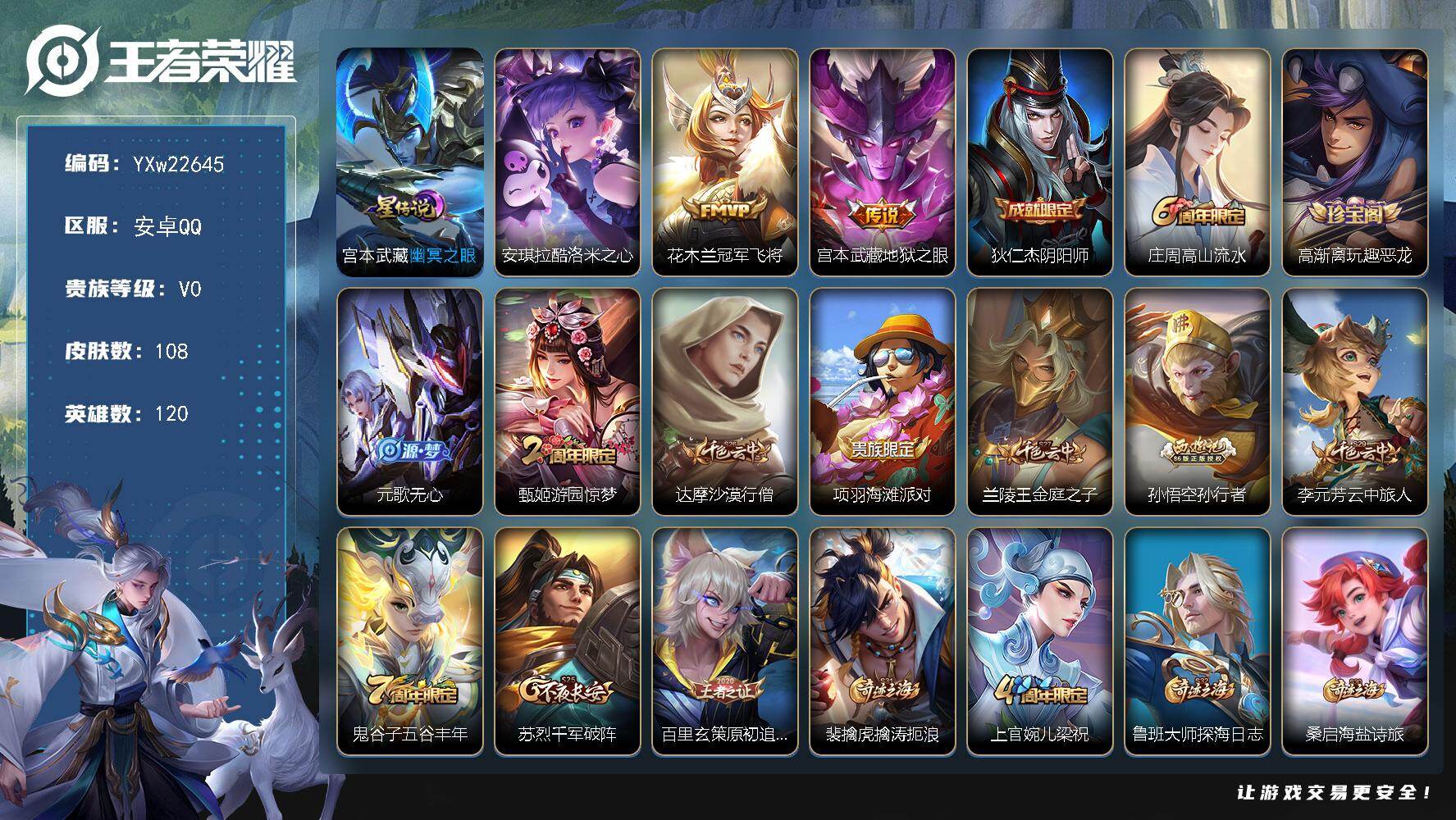 PX_2547427-??推荐·酷洛米之心·冠军飞将·幽冥之眼·孙行者·无心·紫霞仙子·无二次包过】YXw22645-安卓Q-120英雄-108皮肤-6王者印记-174铭文-贵族积分0w【贵族1】【1珍品·1星传说·2传说·3按键】【因赛季更新游戏段付以上号为准!】 【珍品传说】:安琪拉酷洛米之心 【星元皮肤】:宫本武藏幽冥之眼 【传说皮肤】:花木兰冠军飞将,宫本武藏地狱之眼 【限定皮肤】:狄仁杰阴阳师,庄周高山流水,高渐离玩趣恶龙,元歌无心,甄姬游园惊梦,达摩沙漠行僧,项羽海滩派对,兰陵王金庭之子,孙悟空孙行者,李元芳云中旅人,鬼谷子五谷丰年,苏烈千军破阵,百里玄策原初追逐者,裴擒虎擒涛扼浪,上官婉儿梁祝,鲁班大师探海日志,桑启海盐诗旅,沈梦溪龙舞盛年,刘邦剑破天穹 【赛季限定】:苏烈千军破阵,达摩沙漠行僧,兰陵王金庭之子,李元芳云中旅人,桑启海盐诗旅,裴擒虎擒涛扼浪,鲁班大师探海日志,刘邦剑破天穹,东皇太一噬灭天穹,太乙真人谧流熔炉,钟馗虚灵犬护,亚瑟荣光之誓,百里玄策原初追逐者 【战令限定】:周瑜线条小狗 【史诗皮肤】:周瑜线条小狗,黄忠百相守梦,百里守约真我赫兹,元歌无心,鬼谷子五谷丰年,庄周高山流水,孙悟空孙行者,百里玄策原初追逐者,橘右京修罗,上官婉儿梁祝,狄仁杰鹰眼统帅,孙策猫狗日记,阿轲节奏热浪,程咬金功夫厨神,刘禅天才门将,甄姬游园惊梦,花木兰水晶猎龙者,张飞乱世虎臣,曹操幽灵船长,刘禅绅士熊喵,吕布圣诞狂欢,墨子金属风暴,妲己魅力维加斯,嬴政摇滚巨星,嬴政暗夜贵公子,孙尚香水果甜心,甄姬冰雪圆舞曲,赵云未来纪元,露娜紫霞仙子,鲁班七号电玩小子 【其他皮肤】:影百相守梦,虞姬溯影追猎,艾琳鹤鸣心笺,亚瑟荣光之誓,鬼谷子克喵,莱西奥踏浪烽翎,白起死霸装,姬小满小满鸭,露娜命运加冕,阿古朵布丁狗之约,张良灵野札记,苏烈春野闲踪,钟馗虚灵犬护,刘备浪漫序章,戈娅玫蓝誓约,明世隐景韶洛都,西施雪境奇遇,典韦铁骨偃魂,太乙真人谧流熔炉,苍苍林狼骑,干将莫邪雾都夜雨,东皇太一噬灭天穹,大司命暗都幽影,刘邦剑破天穹,沈梦溪龙舞盛年,后羿完美运算,鲁班大师探海日志,太乙真人劲辣红锅,裴擒虎擒涛扼浪,猪八戒潮玩探月行,桑启海盐诗旅,李元芳云中旅人,蒙恬蔚蓝守将,兰陵王金庭之子,达摩沙漠行僧,妲己紫罗兰之誓,苏烈千军破阵,刘禅秘密基地,狂铁特工战影,高渐离玩趣恶龙,孙膑归虚梦演,吕布野性能量,明世隐虹云星官,李白敏锐之力,诸葛亮掌控之力,老夫子功夫老勺,关羽龙腾万里,狄仁杰阴阳师,后羿阿尔法小队,刘备万事如意,甄姬花好人间,达摩拳王,亚瑟死亡骑士,典韦黄金武士,安琪拉玩偶对对碰,宫本武藏未来纪元,扁鹊化身博士,武则天东方不败,牛魔西部大镖客,白起白色死神,赵云忍炎影,达摩大发明家,韩信街头霸王,韩信教廷特使,项羽海滩派对,云缨赤焰之缨,澜孤猎,瑶森,李信灼热之刃,孙策海之征途,铠龙域领主,干将莫邪第七人偶,东皇太一东海龙王,马可波罗激情绿茵,张良一千零一夜 【内测皮肤】:高渐离玩趣恶龙,狂铁特工战影