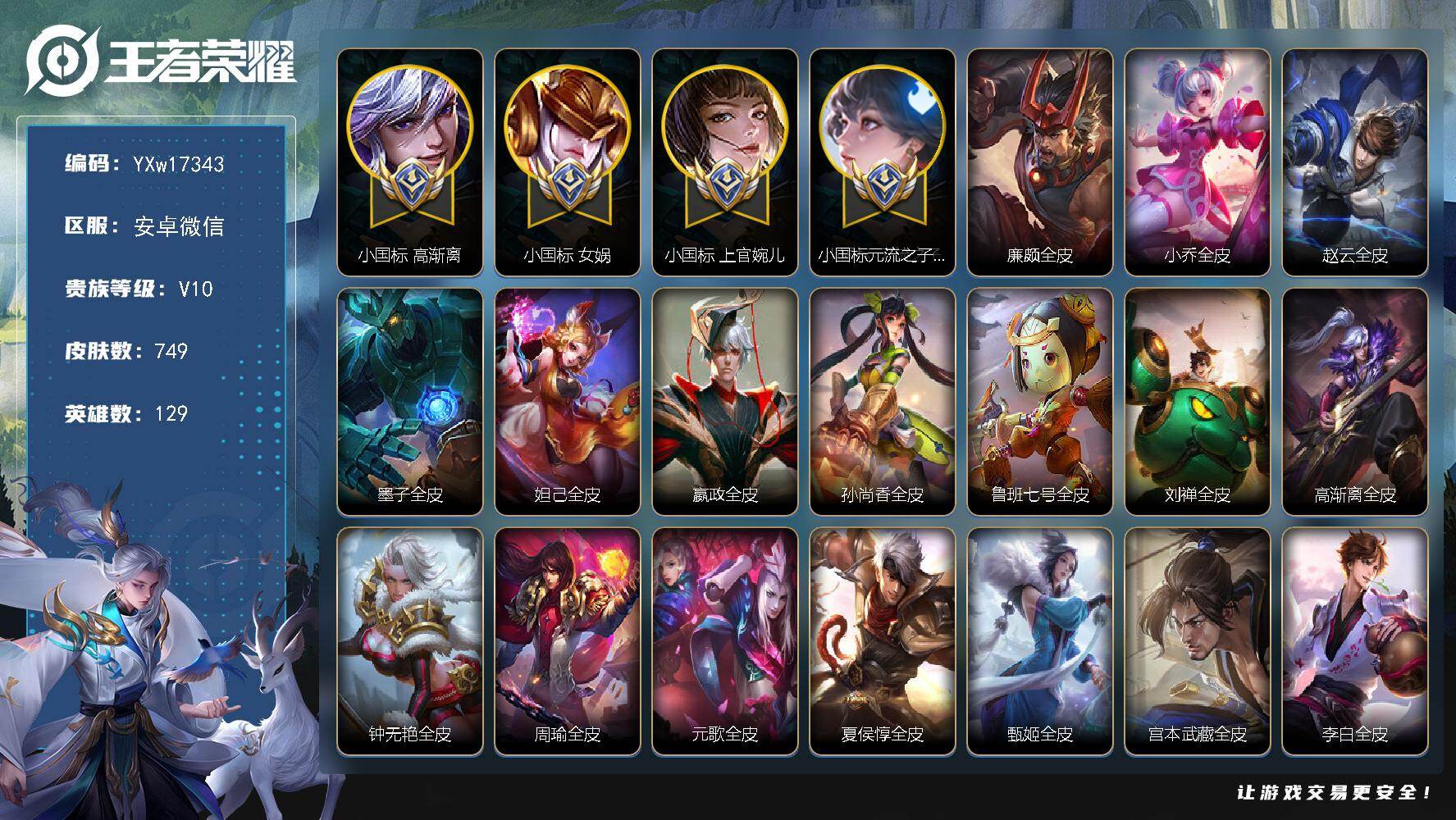 PX_2576109-??面板号·V10·4.8W流光积分·满典藏·差1满无双·差1满珍品·珍品无双馥梦繁花·10水晶小兵·19星传说·27个天幕·342按键·雪境奇遇天幕·1.47w小国女娲·1.44w小国婉儿·1.37w小国元流之子·1.38w小国高渐离·1.1w金标玄策·金标瑶·金标蔡文姬·18个金标·不可二次包过】YXw17343-安卓WX-129英雄-749皮肤-24王者印记-300铭文-贵族积分96w【贵族10】【21典藏·1珍品无双·13无双·9珍品·19星传说·132传说·27天幕·342按键·625个性戳戳·206幸运值】【因赛季更新游戏段付以上号为准!】,【荣耀典藏】:武则天英雄,孙悟空全息碎影,武则天倪克斯神谕,夏侯惇无限飓风号,小乔天鹅之梦,孙尚香杀手不太冷,鲁班七号星空梦想,芈月大秦宣太后,程咬金活力突击,李白鸣剑曳影,诸葛亮星域神启,花木兰九霄神辉,关羽赤影疾锋,铠银白咏叹调,貂蝉幻阙歌,韩信弑枪猎影,虞姬神鉴启示录,瑶拾光映像,伽罗最初的交响,吕布千魇归渊,安琪拉颠倒童话魔镜,【珍品无双】:貂蝉馥梦繁花,【无双皮肤】:孙悟空无相,铠神罪,诸葛亮天机白泽,曜器灵螭龙剑,甄姬雪境奇遇,公孙离离恨烟,不知火舞花合斗,韩信群星魔术团,小乔时之魔女,李白碎月剑心,瑶真我赫兹,妲己青丘九尾,武则天神器明辉仪,【珍品传说】:宫本武藏黑崎一护,暃朽木白哉,安琪拉酷洛米之心,瑶大耳狗之梦,张飞兔狲蓬尾,嫦娥器灵落星盏,孙策时之奇旅,鲁班七号江户川柯南,马可波罗怪盗基德,【星元皮肤】:诸葛亮岁雨灵司,伽罗太华红枫,兰陵王荆棘舞步,诸葛亮苍灵仙君,曜云鹰彻晓,李白玉鸾吟,王昭君乞巧织春,刘备时之羁绊,虞姬无限倾慕,貂蝉幻舞叠翠,狄仁杰星际治安官,刘备时之思念,瑶时之愿境,孙悟空零号雷霆,孙尚香未来机甲,武则天幻海之心,孙悟空幽冥火,宫本武藏幽冥之眼,貂蝉金色仲夏夜,【天幕】:雪境奇遇天幕,天机无算天幕,狸尾假日天幕,力鸭全场天幕,财神纳福天幕,怪盗基德天幕,铃舟系梦天幕,墨染江湖天幕,纸笺情愫天幕,Kuromi时间天幕,春野列车天幕,龙腾四海天幕,月之邀约天幕,闪耀亚洲天幕,Hello,Kitty天幕,电音狂想天幕,春韵弦音天幕,无尽之约天幕,鸿兔大展天幕,路在脚下天幕,浪翻一夏天幕,挚爱童话天幕,花朝如约天幕,金虎啸春天幕,秋月华灯天幕,鲲天幕,共赏芳华天幕,【小兵皮肤】:小兵马上有钱,小兵线条小狗,小兵青铜锵锵兵,小兵赞萌露比,小兵Hello,Kitty,小兵大耳狗甜茶会,小兵狐妖小红娘,小兵侦探大作战,小兵雪境奇遇,小兵露营小黄鸭,【传说皮肤】:王昭君长夜焕生,杨戬纵目迁山,后羿神树通天,曹操万灵伏威,干将莫邪千山共赴,元歌诡秘之主,大司命死亡执政官,司马懿九山相柳,公孙离云诺千山,西施续相思,杨玉环星之鸣奏,后羿千劫归真,司空震愿照山河定,女娲愿照千秋盛,妲己愿照众生和,澜愿照九州拓,蔡文姬愿照福禄聚,虞姬愿照岁时盈,云缨幻光神枪,裴擒虎祥瑞亨通,嬴政玄雷天君,王昭君映山客,桑启鸣野蒿,庄周牧神诗旅,夏侯惇霜北刀,铠冥王哈迪斯,朵莉亚心动手记,云中君群星魔术团,墨子黄金天蝎座,海月金乌负日,亚连落雪白狼,吕布曦玄引,貂蝉曦玄引,典韦战鼓燎原,孙尚香乘龙问璇玑,孙策乘龙淬吴钩,赵云乘龙铭钟鼎,马超琥珀纪元,铠琥珀纪元,澜逐花归海,艾琳觅芳踪,露娜霜月吟,孙膑小动物乐团,狄仁杰夜礼服假面,王昭君永恒水手月亮,甄姬至美化雀舞,大乔时之奇旅,鲁班七号时之奇旅,兰陵王影龙天霄,吕布遇见神鼓,宫本武藏惊梅引,云缨鹤归松栖,上官婉儿妄想奇谈,马可波罗妄想实况,东皇太一灼幽烈阳,诸葛亮鹤羽星尊,澜电玩雷克斯,亚瑟追逃游戏,安琪拉追逃游戏,张飞百相守梦,公孙离记忆之芯,夏洛特浮生妄,干将莫邪画中仙,花木兰燃星之曲,虞姬无限倾心,项羽无限倾心,伽罗炽翼辉光,孙悟空齐天大圣,小乔山海琳琅生,曜山海苍雷引,李信山海炽霜斩,吕布怒海麟威,李白诗剑行,狄仁杰神器狴犴令,不知火舞绯月行,王昭君星穹之声,百里守约碎云,橘右京枫霜尽,娜可露露前尘镜,孙尚香音你闪耀,马可波罗深海之息,后羿无尽星芒,马超无双飞将,大乔挚爱花嫁,孙策挚爱之约,露娜启示之音,蔡文姬花朝如约,女娲补天,孙策末日机甲,瑶时之祈愿,裴擒虎寅虎赤拳,鲁班七号寅虎瑞焰,孙尚香异界灵契,貂蝉遇见胡旋,赵云淬星耀世,王昭君乞巧织情,西施游龙清影,曜李逍遥,,周瑜音你心动,小乔音你心动,李元芳飞鸢探春,兰陵王默契交锋,公孙离祈雪灵祝,诸葛亮时雨天司,铠绛天战甲,镜炽阳神光,虞姬启明星使,孙悟空零号赤焰,关羽武圣,曜云鹰飞将,李信一念神魔,刘备时之恋人,伽罗太华,貂蝉猫影幻舞,张良黄金白羊座,干将莫邪久胜战神,虞姬云霓雀翎,达摩黄金狮子座,百里玄策白虎志,花木兰冠军飞将,梦奇胖达荣荣,后羿黄金射手座,杨戬永曜之星,诸葛亮武陵仙君,貂蝉仲夏夜之梦,李白凤求凰,孙尚香末日机甲,宫本武藏地狱之眼,孙悟空地狱火,吕布天魔缭乱,武则天海洋之心,狄仁杰超时空战士,【限定皮肤】:公孙离离恨烟,夏侯惇霜北刀,铠冥王哈迪斯,暃埋骨钱,蒙犽顽岩魄,蔡文姬夏日便利店,大乔绒语心约,虞姬夏日便利店,姜子牙天穹之誓,杨戬破阵退雄兵,李白谪仙醉月,狄仁杰阴阳师,小乔纯白花嫁,廉颇寅虎御盾,小乔山海琳琅生,赵云皇家上将,赵云引擎之心,赵云龙胆,赵云百木心枪,墨子神迹守卫,墨子降魔,妲己热情桑巴,妲己时之彼端,妲己时之奇旅,嬴政优雅恋人,嬴政白昼王子,孙尚香蔷薇恋人,孙尚
