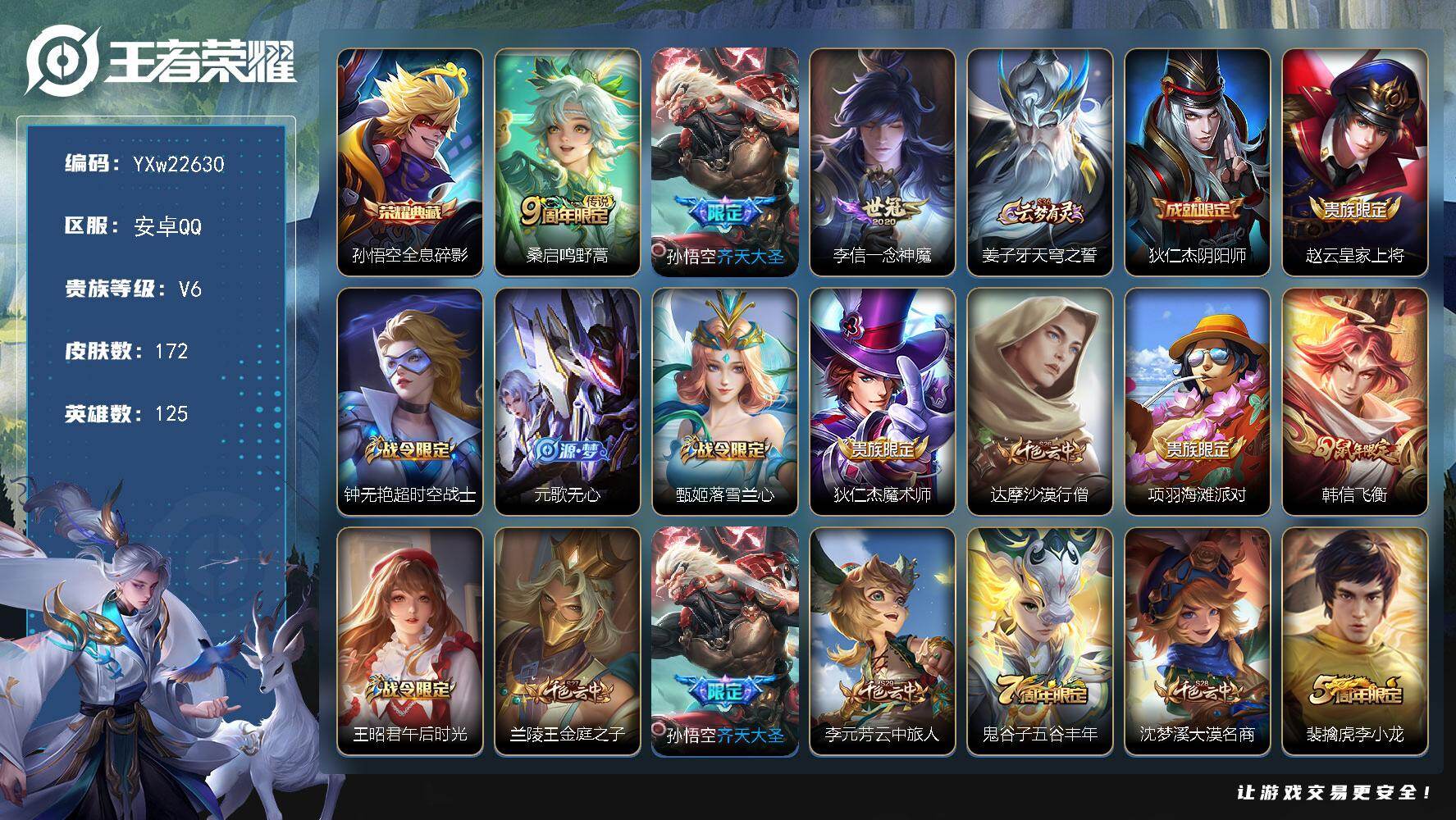 PX_2550831-??小号·全息碎影·飞衡·可二次】YXw22630-安卓Q-125英雄-172皮肤-4王者印记-180铭文-贵族积分1w【贵族5】【1典藏·3传说·7按键】【因赛季更新游戏段付以上号为准!】 【英雄全皮】:孙权全皮 【荣耀典藏】:孙悟空全息碎影 【传说皮肤】:桑启鸣野蒿,孙悟空齐天大圣,李信一念神魔 【限定皮肤】:姜子牙天穹之誓,狄仁杰阴阳师,赵云皇家上将,钟无艳超时空战士,元歌无心,甄姬落雪兰心,狄仁杰魔术师,达摩沙漠行僧,项羽海滩派对,韩信飞衡,王昭君午后时光,兰陵王金庭之子,孙悟空齐天大圣,李元芳云中旅人,鬼谷子五谷丰年,沈梦溪大漠名商,裴擒虎李小龙,裴擒虎擒涛扼浪,狂铁电玩高手,上官婉儿梁祝,西施玲珑珍味,鲁班大师探海日志,桑启海盐诗旅,戈娅驭风魔法,司空震地狱燃心,阿古朵江河有灵,张良古海寻踪,蒙犽百解令,鬼谷子天穹祈灯,刘邦剑破天穹,周瑜熔金海岸 【年限皮肤】:韩信飞衡 【赛季限定】:达摩沙漠行僧,兰陵王金庭之子,沈梦溪大漠名商,李元芳云中旅人,桑启海盐诗旅,裴擒虎擒涛扼浪,鲁班大师探海日志,张良古海寻踪,鬼谷子天穹祈灯,刘邦剑破天穹,姜子牙天穹之誓,东皇太一噬灭天穹,太乙真人谧流熔炉,钟馗虚灵犬护,甄姬逆浪荇歌,亚瑟荣光之誓,项羽九幽镇关 【战令限定】:狂铁电玩高手,王昭君午后时光,钟无艳超时空战士,甄姬落雪兰心,戈娅驭风魔法,西施玲珑珍味,司空震地狱燃心,莱西奥光弋星穹,明世隐往忆晖光,周瑜线条小狗,小乔线条小狗 【史诗皮肤】:盘古撼世英歌,周瑜线条小狗,小乔线条小狗,项羽九幽镇关,莱西奥光弋星穹,公孙离涂山容容,狂铁龙之律动,弈星万物之道,蒙犽百解令,阿古朵江河有灵,司空震地狱燃心,戈娅驭风魔法,刘禅电玩爆裂旋风,元歌无心,鬼谷子五谷丰年,钟无艳超时空战士,狂铁电玩高手,杨戬天秀启明,百里玄策热力回旋,裴擒虎李小龙,韩信飞衡,上官婉儿梁祝,狄仁杰鹰眼统帅,伽罗箭羽风息,孙策猫狗日记,白起星夜王子,程咬金功夫厨神,李元芳逐浪之夏,蔡文姬舞动绿茵,铠曙光守护者,亚瑟心灵战警,兰陵王暗隐猎兽者,夏侯惇乘风破浪,张飞乱世虎臣,吕布末日机甲,李白千年之狐,曹操幽灵船长,吕布圣诞狂欢,墨子金属风暴,妲己魅力维加斯,嬴政摇滚巨星,嬴政暗夜贵公子,孙尚香水果甜心,宫本武藏鬼剑武藏,狄仁杰魔术师,王昭君偶像歌手,甄姬冰雪圆舞曲,貂蝉圣诞恋歌,赵云未来纪元,赵云皇家上将 【其他皮肤】:影百相守梦,虞姬溯影追猎,蚩奼极光幻客,艾琳鹤鸣心笺,孙权径山谋武,明世隐往忆晖光,亚瑟荣光之誓,鬼谷子克喵,莱西奥踏浪烽翎,云中君云械蓝图,甄姬逆浪荇歌,白起死霸装,阿古朵布丁狗之约,钟馗虚灵犬护,刘备浪漫序章,戈娅玫蓝誓约,西施雪境奇遇,典韦铁骨偃魂,太乙真人谧流熔炉,苍苍林狼骑,干将莫邪雾都夜雨,东皇太一噬灭天穹,周瑜熔金海岸,姜子牙天穹之誓,刘邦剑破天穹,廉颇功夫炙烤,鬼谷子天穹祈灯,后羿完美运算,兰陵王幻夜行动,亚连破局者,海月王牌新星,张良古海寻踪,李元芳妄想特派,西施玲珑珍味,鲁班大师探海日志,莱西奥西部游侠,裴擒虎擒涛扼浪,猪八戒潮玩探月行,桑启海盐诗旅,李元芳云中旅人,甄姬落雪兰心,沈梦溪大漠名商,王昭君午后时光,兰陵王金庭之子,程咬金无双福将,达摩沙漠行僧,鲁班大师乓乓大师,刘禅秘密基地,狂铁特工战影,鲁班七号黑桃队长,哪吒次元突破,吕布野性能量,明世隐虹云星官,苏烈坚韧之力,鬼谷子幻乐之宴,李白敏锐之力,诸葛亮掌控之力,孙尚香沉稳之力,老夫子功夫老勺,王昭君幻想奇妙夜,钟无艳海滩丽影,关羽龙腾万里,刘备汉昭烈帝,刘备纽约教父,狄仁杰阴阳师,后羿阿尔法小队,宫本武藏万象初新,刘备万事如意,甄姬花好人间,张飞五福同心,花木兰兔女郎,达摩拳王,亚瑟死亡骑士,典韦黄金武士,妲己少女阿狸,孙膑天使之翼,宫本武藏未来纪元,白起白色死神,程咬金星际陆战队,赵云忍炎影,赵云白执事,达摩大发明家,露娜哥特玫瑰,韩信街头霸王,韩信教廷特使,项羽海滩派对,金蝉前尘,云缨赤焰之缨,司空震启蛰,澜孤猎,蒙恬秩序猎龙将,蒙犽归虚梦演,马超幸存者,瑶森,盘古创世神祝,上官婉儿修竹墨客,李信灼热之刃,孙策海之征途,元歌午夜歌剧院,米莱狄精准探案法,明世隐占星师,铠龙域领主,干将莫邪第七人偶,黄忠芝加哥教父,哪吒三太子,杨戬埃及法老,马可波罗激情绿茵,雅典娜战争女神,夏侯惇战争骑士,李元芳特种部队,钟馗地府判官,孙悟空西部大镖客,小乔万圣前夜,曹操超能战警,老夫子潮流仙人,貂蝉异域舞娘,项羽帝国元帅,鲁班七号福禄兄弟 【内测皮肤】:狂铁特工战影