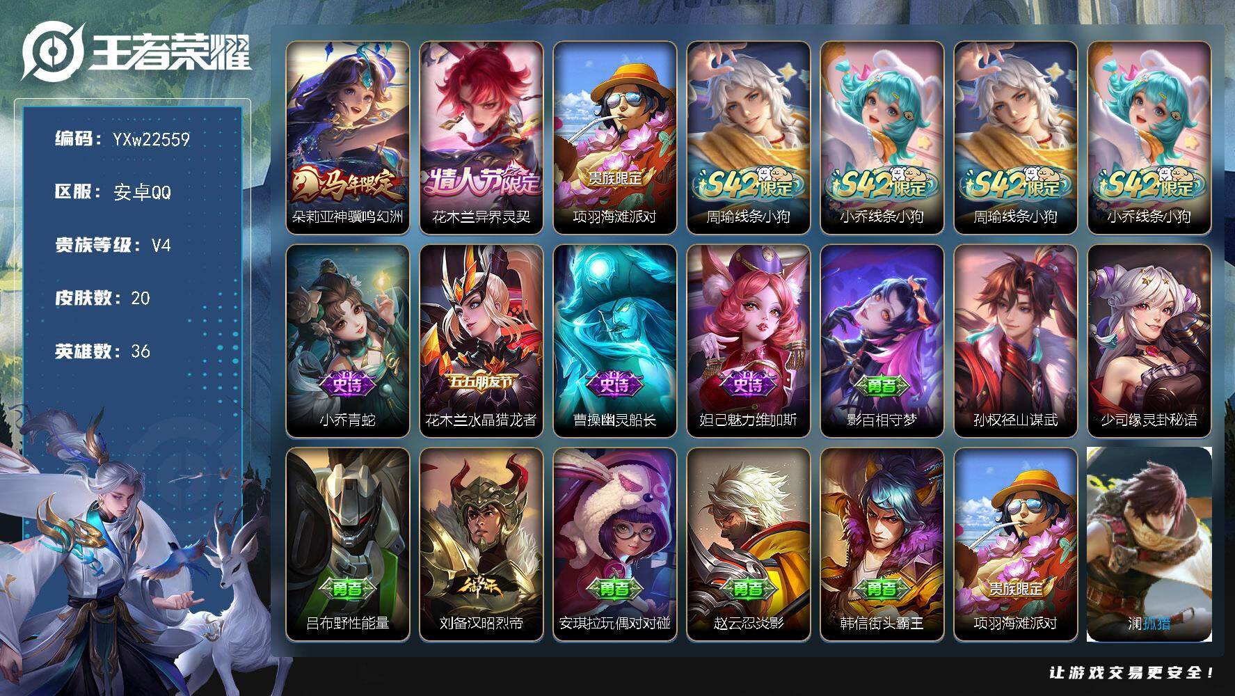 PX_2553643-??女号·全皮貂蝉·全皮西施·天鹅之梦·甄姬雪境奇遇·离恨烟·瑶真我赫兹·酷洛米之心·大耳狗之梦·游龙堇华·紫瑶·神骥鸣幻洲·愿照千秋盛·愿照福禄聚·山海琳琅生·Hello,Kitty天幕·可二次】YXw20735-安卓Q-126英雄-353皮肤-16王者印记-214铭文-贵族积分10w【贵族9】【2典藏·1珍品无双·3无双·3珍品·3星传说·28传说·1天幕·16按键】【因赛季更新游戏段付以上号为准!】 【英雄全皮】:刘禅全皮,貂蝉全皮,孙权全皮,敖隐全皮,西施全皮,蒙恬全皮,戈娅全皮,少司缘全皮 【荣耀典藏】:小乔天鹅之梦,貂蝉幻阙歌 【珍品无双】:貂蝉馥梦繁花 【无双皮肤】:甄姬雪境奇遇,公孙离离恨烟,瑶真我赫兹 【珍品传说】:安琪拉酷洛米之心,瑶大耳狗之梦,马可波罗怪盗基德 【星元皮肤】:西施游龙堇华,瑶时之愿境,孙尚香未来机甲,貂蝉金色仲夏夜 【天幕】:Hello,Kitty天幕 【传说皮肤】:朵莉亚神骥鸣幻洲,貂蝉神骥聚万邦,王昭君长夜焕生,西施续相思,女娲愿照千秋盛,蔡文姬愿照福禄聚,桑启鸣野蒿,貂蝉曦玄引,大乔时之奇旅,安琪拉追逃游戏,小乔山海琳琅生,娜可露露前尘镜,孙尚香音你闪耀,马可波罗深海之息,露娜启示之音,瑶时之祈愿,貂蝉遇见胡旋,西施游龙清影,小乔音你心动,李元芳飞鸢探春,虞姬启明星使,貂蝉猫影幻舞,张良黄金白羊座,干将莫邪久胜战神,百里玄策白虎志,貂蝉仲夏夜之梦,孙尚香末日机甲,宫本武藏地狱之眼 【限定皮肤】:公孙离离恨烟,蒙犽顽岩魄,大乔绒语心约,姜子牙天穹之誓,狄仁杰阴阳师,小乔山海琳琅生,赵云皇家上将,妲己热情桑巴,庄周高山流水,高渐离死亡摇滚,高渐离玩趣恶龙,扁鹊奇幻香踪,白起夜都怪侠,芈月幻夜卜梦,元歌无心,马可波罗暗影游猎,马可波罗深海之息,狄仁杰魔术师,狄仁杰万华元夜,达摩沙漠行僧,项羽海滩派对,貂蝉逐梦之音,貂蝉遇见胡旋,安琪拉追逃游戏,程咬金演武夺筹,露娜启示之音,王昭君午后时光,兰陵王金庭之子,花木兰瑞麟志,娜可露露前尘镜,孙悟空至尊宝,后羿圣弓游侠,李元芳云中旅人,虞姬启明星使,钟馗驱傩正仪,杨玉环遇见飞天,杨玉环寅虎心曲,杨戬潮玩骑兵,干将莫邪真爱魔法,雅典娜黎明之约,太乙真人华丽摇滚,鬼谷子原初探秘者,鬼谷子五谷丰年,大乔白鹤梁神女,大乔时之奇旅,黄忠火炮绅士,苏烈千军破阵,百里玄策白虎志,百里玄策原初追逐者,百里守约朱雀志,梦奇顽趣,公孙离玉兔公主,沈梦溪大漠名商,明世隐吟游魔法,裴擒虎擒涛扼浪,狂铁电玩高手,瑶时之祈愿,瑶山海碧波行,上官婉儿梁祝,嫦娥拒霜思,嫦娥暖冬兔眠,西施玲珑珍味,西施至美乘鲤谣,鲁班大师探海日志,桑启海盐诗旅,暃星界游侠,戈娅驭风魔法,艾琳女武神,阿古朵江河有灵,张良古海寻踪,蒙犽百解令,蒙恬荣光圣徽,鬼谷子天穹祈灯,貂蝉曦玄引,沈梦溪龙舞盛年,鲁班七号蔬乡物语,刘邦剑破天穹,程咬金群星魔术团,周瑜熔金海岸 【年限皮肤】:花木兰瑞麟志,百里玄策白虎志,百里守约朱雀志,杨玉环寅虎心曲,小乔山海琳琅生,瑶山海碧波行,女娲愿照千秋盛,蔡文姬愿照福禄聚 【赛季限定】:鬼谷子原初探秘者,狄仁杰万华元夜,程咬金演武夺筹,钟馗驱傩正仪,苏烈千军破阵,达摩沙漠行僧,兰陵王金庭之子,沈梦溪大漠名商,李元芳云中旅人,桑启海盐诗旅,裴擒虎擒涛扼浪,鲁班大师探海日志,张良古海寻踪,鬼谷子天穹祈灯,刘邦剑破天穹,姜子牙天穹之誓,东皇太一噬灭天穹,太乙真人谧流熔炉,钟馗虚灵犬护,甄姬逆浪荇歌,亚瑟荣光之誓,百里玄策原初追逐者,雅典娜黎明之约,梦奇顽趣,蒙恬荣光圣徽,牛魔星界战将,项羽九幽镇关 【战令限定】:马可波罗暗影游猎,干将莫邪真爱魔法,后羿圣弓游侠,黄忠火炮绅士,芈月幻夜卜梦,明世隐吟游魔法,白起夜都怪侠,狂铁电玩高手,王昭君午后时光,暃星界游侠,嫦娥暖冬兔眠,扁鹊奇幻香踪,杨戬潮玩骑兵,戈娅驭风魔法,西施玲珑珍味,鲁班七号蔬乡物语,孙膑茶境仙,马超访茗客,刘禅鸭鸭历险记,沈梦溪鸭鸭历险记,莱西奥光弋星穹,明世隐往忆晖光,周瑜线条小狗,小乔线条小狗 【史诗皮肤】:明世隐百晓客,蔡文姬奇遇梦乡,周瑜线条小狗,小乔线条小狗,项羽九幽镇关,少司缘巫礼祀神,女娲万灵启世,百里玄策罗小黑战记,莱西奥光弋星穹,公孙离涂山容容,西施织梦人,黄忠百相守梦,狂铁龙之律动,刘禅鸭鸭历险记,阿轲化蝶舞,赵怀真器灵浮梦炉,弈星万物之道,孙膑茶境仙,牛魔星界战将,少司缘涂山红红,蒙犽顽岩魄,桑启奇遇星旅,鲁班七号蔬乡物语,蒙恬荣光圣徽,蒙犽百解令,西施至美乘鲤谣,阿古朵江河有灵,戈娅驭风魔法,刘禅电玩爆裂旋风,扁鹊奇幻香踪,镜玫瑰异探,瑶山海碧波行,暃星界游侠,梦奇顽趣,元歌无心,鬼谷子五谷丰年,狂铁电玩高手,貂蝉唤灵魅影,明世隐吟游魔法,公孙离玉兔公主,杨玉环寅虎心曲,雅典娜黎明之约,黄忠火炮绅士,嫦娥拒霜思,司马懿暗渊魔法,庄周高山流水,安琪拉时之奇旅,沈梦溪月团寄思,干将莫邪真爱魔法,大乔白鹤梁神女,西施诗语江南,百里玄策原初追逐者,马可波罗暗影游猎,瑶遇见神鹿,橘右京修罗,不知火舞魅语,大乔白蛇,上官婉儿梁祝,狄仁杰鹰眼统帅,伽罗箭羽风息,花木兰瑞麟志,百里守约朱雀志,大乔猫狗日记,孙策猫狗日记,杨玉环遇见飞天,程咬金功夫厨神,李元芳逐浪之夏,刘禅天才门将,蔡文姬舞动绿茵,百里守约特工魅影,安琪拉心灵骇客,雅典娜冰冠公主,亚瑟心灵战警,