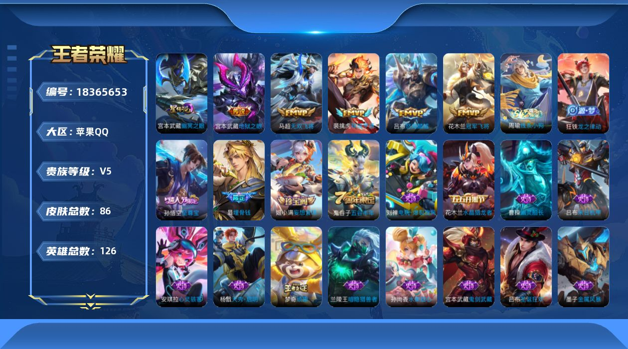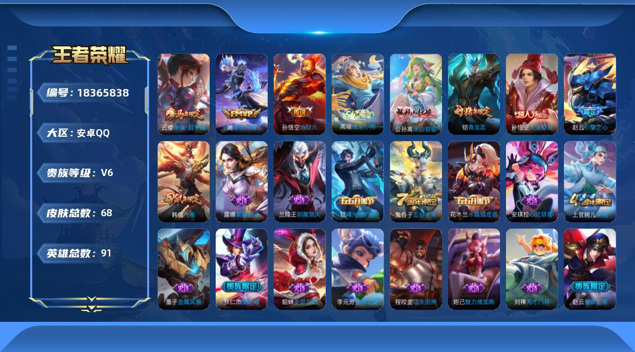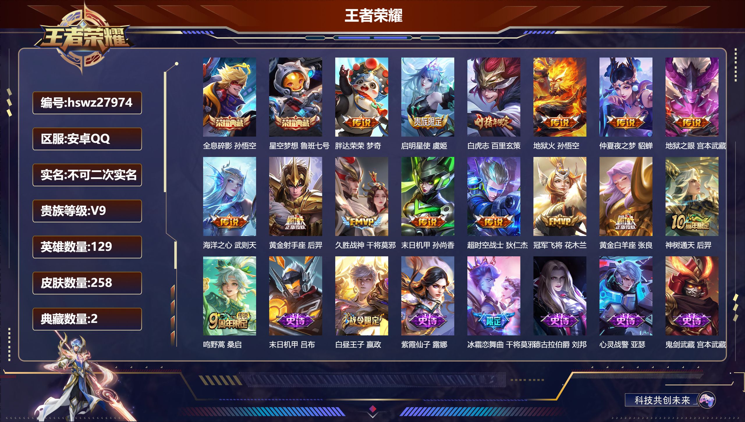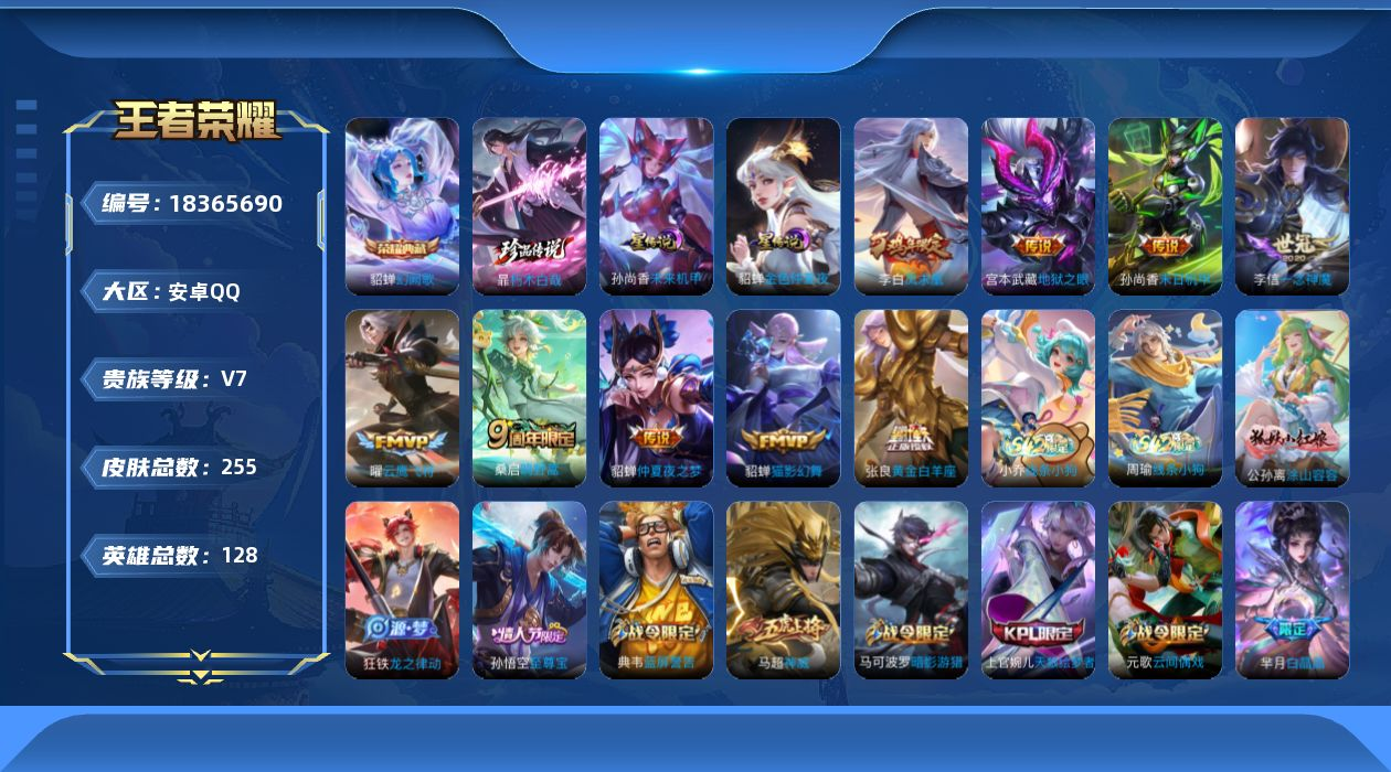 PX_2551799-Q/最强王者/258皮肤/129英雄/2典藏/0珍品无双/0无双/0珍品传说/15传说/56史诗/9稀有英雄 【2,典藏皮肤】全息碎影,孙悟空,星空梦想,鲁班七号, 【15,传说皮肤】胖达荣荣,梦奇,启明星使,虞姬,白虎志,百里玄策,地狱火,孙悟空,仲夏夜之梦,貂蝉,地狱之眼,宫本武藏,海洋之心,武则天,黄金射手座,后羿,久胜战神,干将莫邪,末日机甲,孙尚香,超时空战士,狄仁杰,冠军飞将,花木兰,黄金白羊座,张良,神树通天,后羿,鸣野蒿,桑启, 【56,史诗皮肤】末日机甲,吕布,白昼王子,嬴政,紫霞仙子,露娜,冰霜恋舞曲,干将莫邪,德古拉伯爵,刘邦,心灵战警,亚瑟,鬼剑武藏,宫本武藏,星夜王子,白起,线条小狗,周瑜,遇见飞天,杨玉环,摇滚巨星,嬴政,冰锋战神,关羽,蜜橘之夏,公孙离,魅力维加斯,妲己,热情桑巴,妲己,偶像歌手,王昭君,梅西,裴擒虎,舞动绿茵,蔡文姬,暗夜贵公子,嬴政,鹰眼统帅,狄仁杰,逐梦之光,东皇太一,大圣娶亲,孙悟空,李小龙,裴擒虎,金属风暴,墨子,逐梦之影,韩信,逐浪之夏,李元芳,未来纪元,赵云,引擎之心,赵云,朱雀志,百里守约,石田雨龙,后羿,魔术师,狄仁杰,皇家上将,赵云,冰冠公主,雅典娜,至尊宝,孙悟空,梁祝,上官婉儿,天才门将,刘禅,圣诞恋歌,貂蝉,水晶猎龙者,花木兰,涂山容容,公孙离,圣诞狂欢,吕布,职棒王牌,项羽,地狱岩魂,廉颇,蔷薇恋人,孙尚香,冰雪圆舞曲,甄姬,千年之狐,李白,节奏热浪,阿轲,暗夜猫娘,阿轲,游园惊梦,甄姬,青龙志,铠,心灵骇客,安琪拉,乱世虎臣,张飞,缤纷独角兽,小乔,水果甜心,孙尚香,幽灵船长,曹操,乘风破浪,夏侯惇,暗隐猎兽者,兰陵王, 【113,勇者皮肤】圆桌骑士,盾山,爱心护理,阿轲,沙漠行僧,达摩,大漠名商,沈梦溪,缤纷绘卷,张良,纽约教父,刘备,拳王,达摩,大发明家,达摩,丁香结,小乔,功夫炙烤,廉颇,沉稳之力,孙尚香,海盐诗旅,桑启,朔风刀,夏侯惇,醍醐杖,老夫子,归虚梦演,孙膑,汉昭烈帝,刘备,白色死神,白起,黄金武士,典韦,御旌,牛魔,阴阳师,狄仁杰,炼金王,扁鹊,径山谋武,孙权,次元突破,哪吒,古海寻踪,张良,科学大爆炸,项羽,功夫老勺,老夫子,西部大镖客,牛魔,鲨炮海盗猫,沈梦溪,海滩派对,项羽,完美运算,后羿,万华元夜,狄仁杰,踏浪烽翎,莱西奥,演武夺筹,程咬金,红桃皇后,芈月,奇妙博物学,庄周,美猴王,孙悟空,蜃楼王,庄周,猎兽之王,吕布,野性能量,吕布,哥特玫瑰,露娜,守护之力,大乔,无双福将,程咬金,百相守梦,影,原初探秘者,鬼谷子,潮玩探月行,猪八戒,天穹祈灯,鬼谷子,疑决卦,明世隐,如懿,安琪拉,化身博士,扁鹊,阿尔法小队,后羿,五福同心,张飞,幻乐之宴,鬼谷子,霸王丸,宫本武藏,虹云星官,明世隐,雾影缉谜,兰陵王,赤刃凌霄,敖隐,死亡骑士,亚瑟,敏锐之力,李白,幽兰居士,张良,玩偶对对碰,安琪拉,掌控之力,诸葛亮,海滩丽影,钟无艳,忍·炎影,赵云,狰,白起,重明,芈月,坚韧之力,苏烈,万事如意,刘备,擒涛扼浪,裴擒虎,乓乓大师,鲁班大师,妖精王,孙膑,极光幻客,蚩奼,探海日志,鲁班大师,天使之翼,孙膑,玩趣恶龙,高渐离,兔女郎,花木兰,龙腾万里,关羽,金庭之子,兰陵王,罗小黑战记,哪吒,零食大作战,姬小满,荣光之誓,亚瑟,花好人间,甄姬,万象初新,宫本武藏,御銮,盾山,时尚教父,姜子牙,春野之旅,钟无艳,秘密基地,刘禅,穷奇,典韦,教廷特使,韩信,黑猫爱糖果,李元芳,街头霸王,韩信,云中旅人,李元芳,西部大镖客,孙悟空,凯尔特女王,虞姬,进击墨子号,墨子,少女阿狸,妲己,混沌棋,弈星,御霄,米莱狄,命运加冕,露娜,小满鸭,姬小满,驱傩正仪,钟馗,命运角斗场,狂铁,死霸装,白起,特工战影,狂铁,虚灵犬护,钟馗,御狮,狂铁,白执事,赵云,剑破天穹,刘邦,星梦巡礼,姜子牙,暗都幽影,大司命,鹤鸣心笺,艾琳,锦麟游梦,庄周,逆浪荇歌,甄姬,线条小狗,周瑜, 【74,其他皮肤】伊势巫女,大乔,金属狂潮,高渐离,前尘,金蝉,战争骑士,夏侯惇,圣殿之光,刘邦,芝加哥教父,黄忠,潮流仙人,老夫子,三太子,哪吒,棒球奇才,沈梦溪,极冰防御线,盾山,龙域领主,铠,生化警戒,钟无艳,死神来了,曹操,超能战警,曹操,花见巫女,伽罗,爱与和平,苏烈,第七人偶,干将莫邪,万圣前夜,小乔,灼热之刃,李信,海之征途,孙策,木偶奇遇记,鲁班七号,福禄兄弟,鲁班七号,帝国元帅,项羽,精灵王,后羿,绯红之刃,露娜,冰刃幻境,镜,海军大将,周瑜,星航指挥官,诸葛亮,魇语军师,司马懿,英喵野望,刘禅,午夜歌剧院,元歌,启蛰,司空震,隐刃,兰陵王,霓裳曲,杨玉环,花间舞,公孙离,异域舞娘,貂蝉,街头旋风,裴擒虎,东海龙王,东皇太一,修竹墨客,上官婉儿,剑舞者,花木兰,范海辛,李白,维京掠夺者,苍,占星师,明世隐,归虚梦演,蒙犽,激情绿茵,马可波罗,埃及法老,杨戬,阿摩司公爵,鬼谷子,画中游,桑启,年年有余,猪八戒,尼罗河女神,女娲,锦衣卫,狄仁杰,一千零一夜,张良,归虚梦演,曜,华尔街大亨,程咬金,威尼斯狂欢,百里玄策,幸存者,马超,战争女神,雅典娜,荷鲁斯之眼,云中君,创世神祝,盘古,特种部队,李元芳,绝影神枪,百里守约,蔷薇王座,蔡文姬,森,瑶,加勒比小姐,虞姬,踏雪寻梅,弈星,精准探案法,米莱狄,精灵公主,王昭君,赤焰之缨,云缨,露花倒影,嫦娥,地府判官,钟馗,美梦成真,梦奇,天启骑士,关羽,圆桌骑士,太乙真人,西部大镖客,孙悟空, 【9,稀有英雄】武则天,嬴政,不知火舞,橘右京,夏洛特,娜可露露,韩信,艾琳,赵云, 营地ID:,