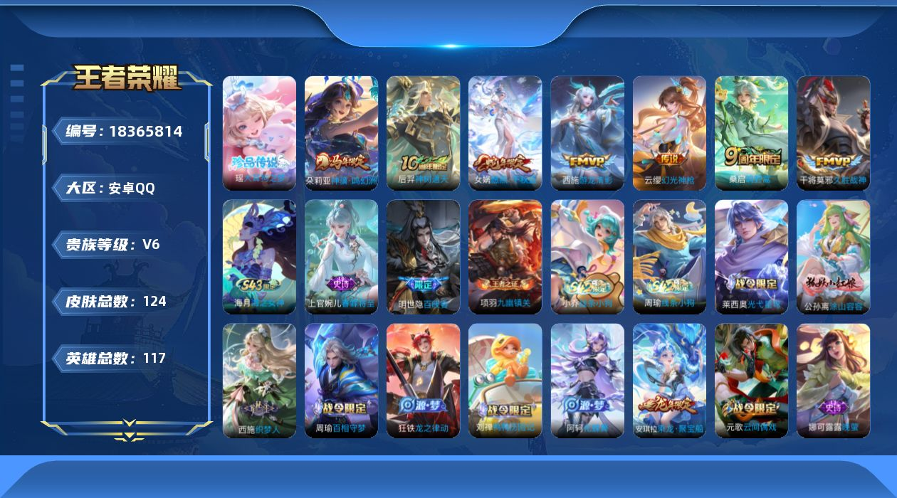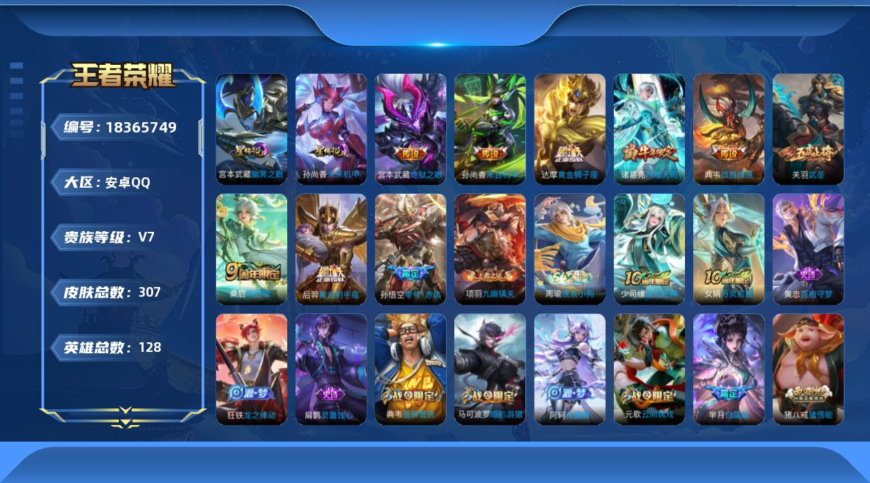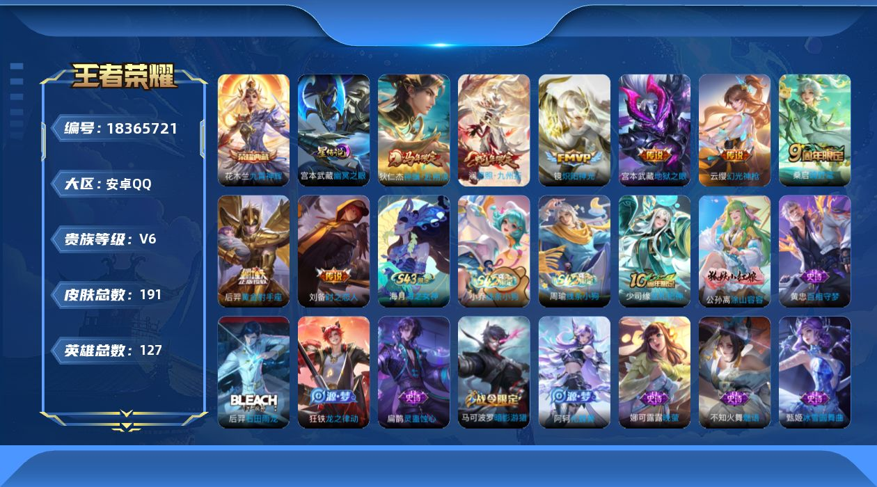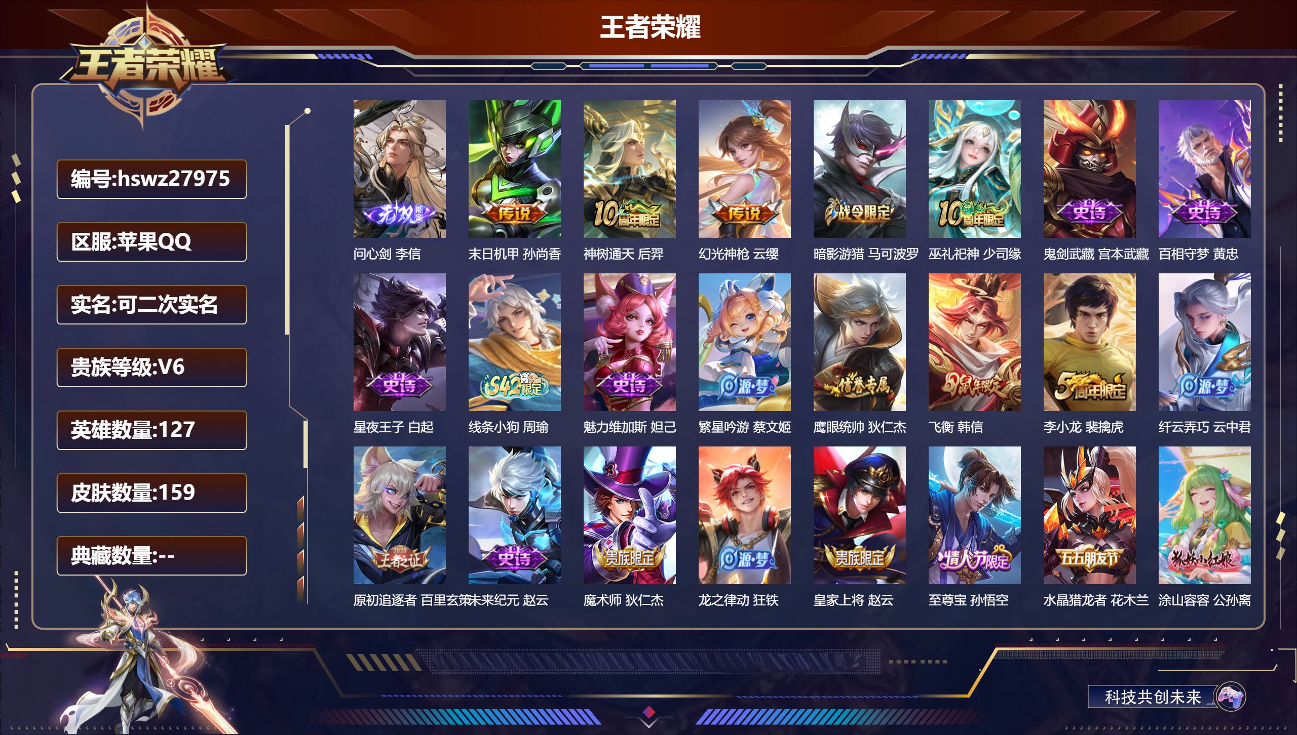 PX_2551802-Q/非凡王者/159皮肤/127英雄/0典藏/0珍品无双/1无双/0珍品传说/3传说/34史诗/7稀有英雄 【1,无双皮肤】问心剑,李信, 【3,传说皮肤】末日机甲,孙尚香,神树通天,后羿,幻光神枪,云缨, 【34,史诗皮肤】暗影游猎,马可波罗,巫礼祀神,少司缘,鬼剑武藏,宫本武藏,百相守梦,黄忠,星夜王子,白起,线条小狗,周瑜,魅力维加斯,妲己,繁星吟游,蔡文姬,鹰眼统帅,狄仁杰,飞衡,韩信,李小龙,裴擒虎,纤云弄巧,云中君,原初追逐者,百里玄策,未来纪元,赵云,魔术师,狄仁杰,龙之律动,狂铁,皇家上将,赵云,至尊宝,孙悟空,水晶猎龙者,花木兰,涂山容容,公孙离,烈魂,黄忠,圣诞狂欢,吕布,魅语,不知火舞,天狼溯光者,伽罗,地狱岩魂,廉颇,蔷薇恋人,孙尚香,缤纷独角兽,小乔,陌上桑,艾琳,百相守梦,百里守约,线条小狗,小乔,水果甜心,孙尚香,瑰影绮梦,芈月,化蝶舞,阿轲,幽灵船长,曹操, 【90,勇者皮肤】烛龙,曹操,爱心护理,阿轲,纽约教父,刘备,拳王,达摩,大发明家,达摩,丁香结,小乔,朔风刀,夏侯惇,醍醐杖,老夫子,归虚梦演,孙膑,汉昭烈帝,刘备,白色死神,白起,黑桃队长,鲁班七号,黄金武士,典韦,御旌,牛魔,阴阳师,狄仁杰,次元突破,哪吒,功夫老勺,老夫子,鲨炮海盗猫,沈梦溪,海滩派对,项羽,万华元夜,狄仁杰,无尽征程,廉颇,踏浪烽翎,莱西奥,演武夺筹,程咬金,红桃皇后,芈月,奇妙博物学,庄周,守护之力,大乔,无双福将,程咬金,瓷语鉴心,露娜,原初探秘者,鬼谷子,潮玩探月行,猪八戒,西部大镖客,猪八戒,疑决卦,明世隐,化身博士,扁鹊,阿尔法小队,后羿,五福同心,张飞,幻乐之宴,鬼谷子,霸王丸,宫本武藏,雾影缉谜,兰陵王,潮玩牛仔,马可波罗,死亡骑士,亚瑟,浪漫序章,刘备,敏锐之力,李白,玩偶对对碰,安琪拉,掌控之力,诸葛亮,海滩丽影,钟无艳,雪境奇遇,西施,重明,芈月,坚韧之力,苏烈,万事如意,刘备,逐霄战戟,吕布,乓乓大师,鲁班大师,溯影追猎,虞姬,雾都夜雨,干将莫邪,兔女郎,花木兰,龙腾万里,关羽,千军破阵,苏烈,荣光之誓,亚瑟,花好人间,甄姬,御銮,盾山,秘密基地,刘禅,穷奇,典韦,教廷特使,韩信,街头霸王,韩信,西部大镖客,孙悟空,重装意志,盘古,少女阿狸,妲己,混沌棋,弈星,御霄,米莱狄,蔚蓝守将,蒙恬,春野闲踪,苏烈,幻想奇妙夜,王昭君,驱傩正仪,钟馗,虚灵犬护,钟馗,御狮,狂铁,班班快跑,鲁班七号,神迹守卫,孙悟空,铁骨偃魂,典韦,苍林狼骑,苍,魅影绮裳,影,星梦巡礼,姜子牙,谧流熔炉,太乙真人,鹤鸣心笺,艾琳,云械蓝图,云中君,逆浪荇歌,甄姬,线条小狗,周瑜,百相守梦,老夫子,噬灭天穹,东皇太一,爆裂喵拳,达摩,玫蓝誓约,戈娅,景韶洛都,明世隐, 【33,其他皮肤】金属狂潮,高渐离,芝加哥教父,黄忠,龙域领主,铠,超能战警,曹操,第七人偶,干将莫邪,熊喵少女,阿古朵,海之征途,孙策,福禄兄弟,鲁班七号,碧珀绯影,暃,星航指挥官,诸葛亮,启蛰,司空震,街头旋风,裴擒虎,归虚梦演,鲁班大师,维京掠夺者,苍,占星师,明世隐,归虚梦演,蒙犽,激情绿茵,马可波罗,埃及法老,杨戬,阿摩司公爵,鬼谷子,年年有余,猪八戒,尼罗河女神,女娲,一千零一夜,张良,归虚梦演,曜,幸存者,马超,创世神祝,盘古,特种部队,李元芳,绝影神枪,百里守约,蔷薇王座,蔡文姬,孤猎,澜,加勒比小姐,虞姬,地府判官,钟馗,天启骑士,关羽,西部大镖客,孙悟空, 【7,稀有英雄】不知火舞,橘右京,夏洛特,娜可露露,韩信,艾琳,赵云, 营地ID:,