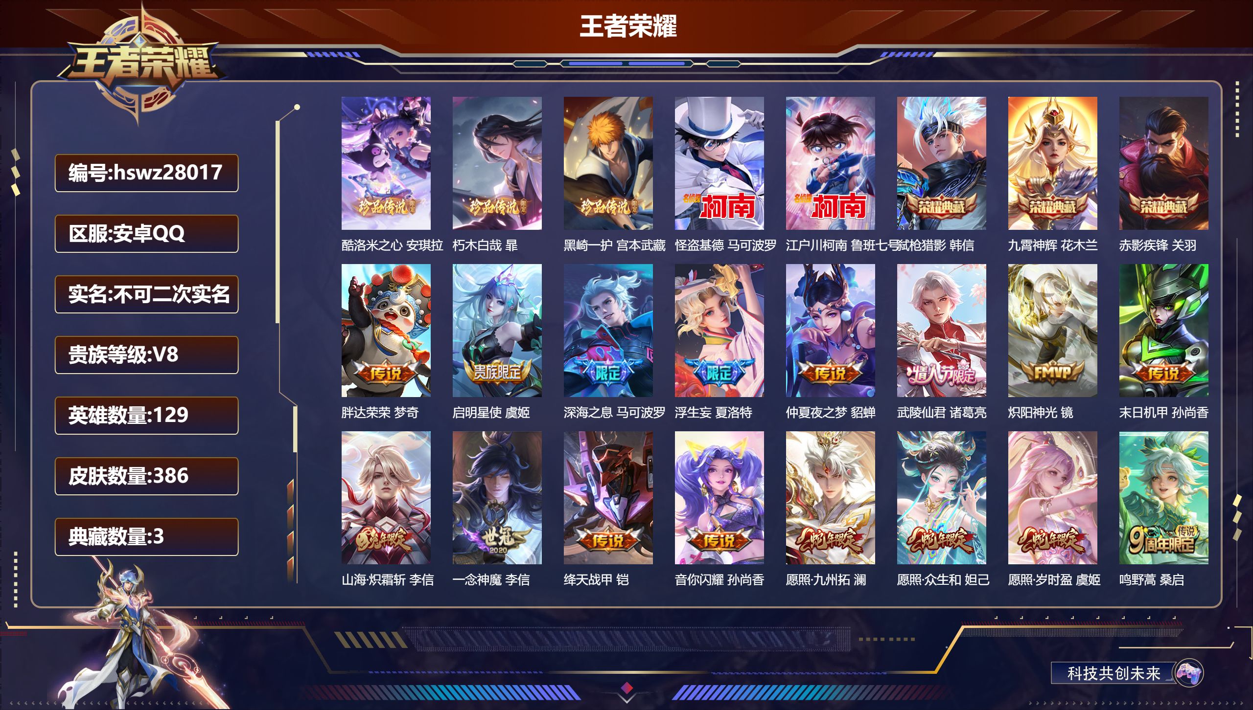 PX_2553668-Q/永恒钻石/386皮肤/129英雄/3典藏/0珍品无双/0无双/5珍品传说/17传说/118史诗/9稀有英雄 【5,珍品传说】酷洛米之心,安琪拉,朽木白哉,暃,黑崎一护,宫本武藏,怪盗基德,马可波罗,江户川柯南,鲁班七号, 【3,典藏皮肤】弑枪猎影,韩信,九霄神辉,花木兰,赤影疾锋,关羽, 【17,传说皮肤】胖达荣荣,梦奇,启明星使,虞姬,深海之息,马可波罗,浮生妄,夏洛特,仲夏夜之梦,貂蝉,武陵仙君,诸葛亮,炽阳神光,镜,末日机甲,孙尚香,山海·炽霜斩,李信,一念神魔,李信,绛天战甲,铠,音你闪耀,孙尚香,愿照·九州拓,澜,愿照·众生和,妲己,愿照·岁时盈,虞姬,鸣野蒿,桑启,云诺千山,公孙离, 【118,史诗皮肤】乒乒小将,鲁班七号,电玩小子,鲁班七号,末日机甲,吕布,蔬乡物语,鲁班七号,紫霞仙子,露娜,百解令,蒙犽,高山流水,庄周,银河之约,李元芳,乘龙·忆丹青,大乔,燃音魔法,高渐离,天秀·启明,杨戬,猫狗日记,大乔,德古拉伯爵,刘邦,山海·玄木吟,马可波罗,心灵战警,亚瑟,五谷丰年,鬼谷子,无心,元歌,鬼剑武藏,宫本武藏,星夜王子,白起,地狱燃心,司空震,线条小狗,周瑜,遇见飞天,杨玉环,摇滚巨星,嬴政,电玩高手,狂铁,顽趣,梦奇,修罗,橘右京,拒霜思,嫦娥,魅力维加斯,妲己,黄金分割率,诸葛亮,热情桑巴,妲己,乐园奇幻夜,钟馗,偶像歌手,王昭君,荣光圣徽,蒙恬,女仆咖啡,妲己,赏金猎手,澜,九幽镇关,项羽,星界游侠,暃,晚萤,娜可露露,遇见神鹿,瑶,舞动绿茵,蔡文姬,暗夜贵公子,嬴政,鹰眼统帅,狄仁杰,孙行者,孙悟空,李小龙,裴擒虎,纤云弄巧,云中君,金属风暴,墨子,傲雪梅枪,韩信,特工魅影,百里守约,猫狗日记,孙策,原初追逐者,百里玄策,逐浪之夏,李元芳,未来纪元,赵云,朱雀志,百里守约,雪豹·霜爪,百里守约,石田雨龙,后羿,优雅恋人,嬴政,鸭鸭历险记,刘禅,驭风魔法,戈娅,魔术师,狄仁杰,热力回旋,百里玄策,龙之律动,狂铁,神威,马超,皇家上将,赵云,冰冠公主,雅典娜,功夫厨神,程咬金,东方月初,大司命,梁祝,上官婉儿,电玩·爆裂旋风,刘禅,天才门将,刘禅,圣诞恋歌,貂蝉,云间偶戏,元歌,水晶猎龙者,花木兰,撼地雄心,廉颇,破空之剑,亚连,一生所爱,露娜,烈魂,黄忠,圣诞狂欢,吕布,青焰无极,镜,器灵·浮梦炉,赵怀真,天狼绘梦者,上官婉儿,奇遇星旅,桑启,夏日便利店,蔡文姬,星界战将,牛魔,永昼,夏洛特,地狱岩魂,廉颇,茶境仙,孙膑,蔷薇恋人,孙尚香,冰雪圆舞曲,甄姬,火炮绅士,黄忠,月团寄思,沈梦溪,航海奇遇记,老夫子,千年之狐,李白,节奏热浪,阿轲,超时空战士,钟无艳,曙光守护者,铠,寅虎·展翼,孙膑,瑞麟志,花木兰,青龙志,铠,心灵骇客,安琪拉,乘龙·聚宝船,安琪拉,箭羽风息,伽罗,乱世虎臣,张飞,吟游魔法,明世隐,万物之道,弈星,谪仙醉月,李白,缤纷独角兽,小乔,魔法小厨娘,安琪拉,百相守梦,百里守约,线条小狗,小乔,天狼狩猎者,裴擒虎,真爱魔法,干将莫邪,水果甜心,孙尚香,狂想玩偶喵,蒙犽,化蝶舞,阿轲,江河有灵,阿古朵,幽灵船长,曹操,乘风破浪,夏侯惇,暗隐猎兽者,兰陵王, 【167,勇者皮肤】玲珑珍味,西施,圆桌骑士,盾山,爱心护理,阿轲,太极少年,赵怀真,沙漠行僧,达摩,大漠名商,沈梦溪,纽约教父,刘备,大发明家,达摩,龙舞盛年,沈梦溪,乐园追猎者,白起,丁香结,小乔,功夫炙烤,廉颇,沉稳之力,孙尚香,幻夜卜梦,芈月,海盐诗旅,桑启,幻泉雾影,海月,朔风刀,夏侯惇,醍醐杖,老夫子,朔望之晖,女娲,归虚梦演,孙膑,汉昭烈帝,刘备,热血海滩,哪吒,白色死神,白起,黑桃队长,鲁班七号,黄金武士,典韦,落雪兰心,甄姬,阴阳师,狄仁杰,次元突破,哪吒,古海寻踪,张良,牛运亨通,牛魔,科学大爆炸,项羽,功夫老勺,老夫子,西部大镖客,牛魔,鲨炮海盗猫,沈梦溪,鲤鱼之梦,庄周,虎啸剑宗,刘邦,海滩派对,项羽,完美运算,后羿,万华元夜,狄仁杰,无尽征程,廉颇,克喵,鬼谷子,制霸全明星,牛魔,踏浪烽翎,莱西奥,演武夺筹,程咬金,红桃皇后,芈月,西部游侠,莱西奥,野性能量,吕布,哥特玫瑰,露娜,守护之力,大乔,无双福将,程咬金,瓷语鉴心,露娜,百相守梦,影,原初探秘者,鬼谷子,星空之诺,沈梦溪,潮玩探月行,猪八戒,鸿运当头,亚瑟,天穹祈灯,鬼谷子,西部大镖客,猪八戒,疑决卦,明世隐,化身博士,扁鹊,潮玩骑士王,亚瑟,阿尔法小队,后羿,无尽旅途,扁鹊,五福同心,张飞,夜都怪侠,白起,金色潮汐,朵莉亚,次元傲视,杨戬,星际陆战队,程咬金,幻乐之宴,鬼谷子,虹云星官,明世隐,雾影缉谜,兰陵王,潮玩牛仔,马可波罗,救世之瞳,扁鹊,赤刃凌霄,敖隐,潮玩骑兵,杨戬,赤莲之焰,周瑜,死亡骑士,亚瑟,敏锐之力,李白,危途狂花,戈娅,胡桃狂想曲,蒙犽,破局者,亚连,玩偶对对碰,安琪拉,掌控之力,诸葛亮,海滩丽影,钟无艳,圣弓游侠,后羿,忍·炎影,赵云,雪境奇遇,西施,炽热元素使,姜子牙,坚韧之力,苏烈,唤灵魔甲,刘禅,万事如意,刘备,逐霄战戟,吕布,擒涛扼浪,裴擒虎,乓乓大师,鲁班大师,探海日志,鲁班大师,天使之翼,孙膑,雾都夜雨,干将莫邪,玩趣恶龙,高渐离,兔女郎,花木兰,龙腾万里,关羽,流音漫舞,艾琳,金庭之子,兰陵王,未来纪元,宫本武藏,千军破阵,苏烈,零食大作战,姬小满,荣光之誓,亚瑟,花好人间,甄姬,万象初新,宫本武藏,聚星闪耀,钟无艳,单词大作战,雅典娜,时尚教父,姜子牙,春野之旅,钟无艳,秘密基地,刘禅,教廷特使,韩信,街头霸王,韩信,云中旅人,李元芳,妄想特派,李元芳,西部大镖客,孙悟空,神迹守卫,墨子,进击墨子号,墨子,蔬乡物语,李元芳,少女阿狸,妲己,灵卜魔法,妲己,混