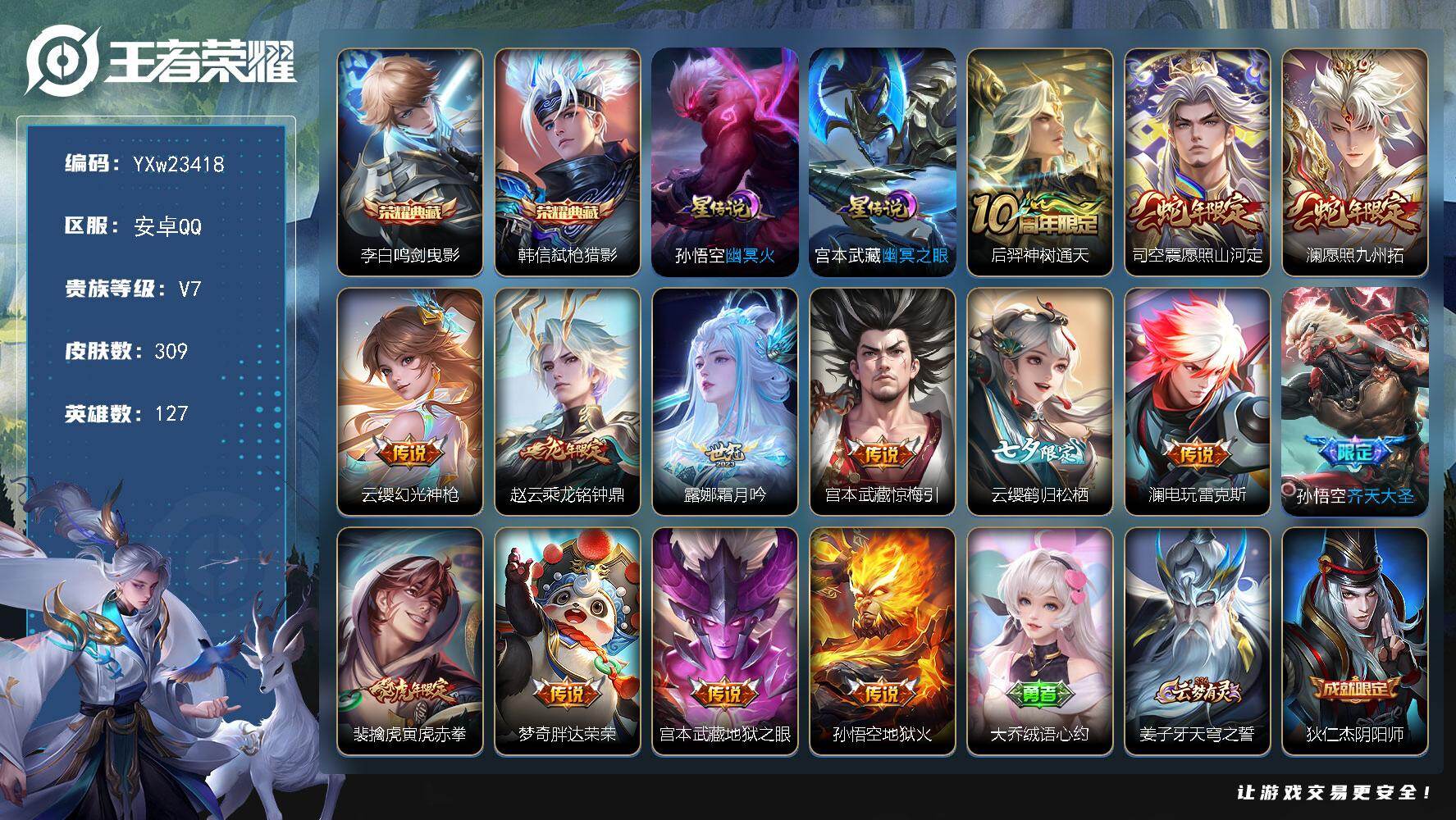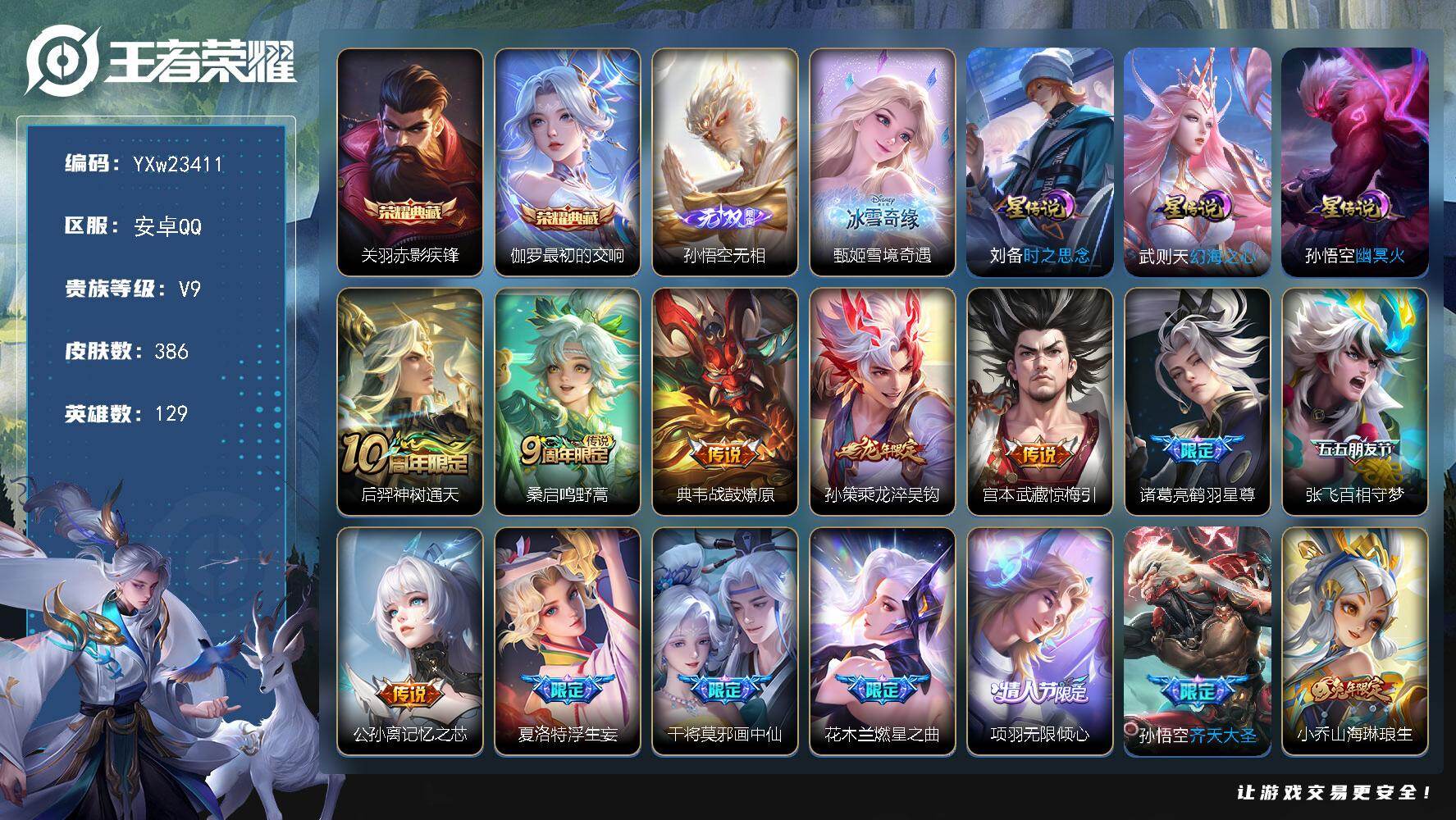PX_2554076-??精品推荐·幻夜逐光天幕·赤影疾锋·最初的交响·无相·雪境奇遇·时之思念·永曜之星·默契交锋·浮生妄·李逍遥·画中仙·诗剑行·燃星之曲·时雨天司·山海炽霜斩·山海苍雷引·淬星耀世无二次包过】YXw23411-安卓Q-129英雄-386皮肤-16王者印记-300铭文-贵族积分10w【贵族9】【2典藏·2无双·3星传说·37传说·1天幕·24按键】【因赛季更新游戏段付以上号为准!】 【英雄全皮】:钟馗全皮,金蝉全皮,戈娅全皮 【荣耀典藏】:关羽赤影疾锋,伽罗最初的交响 【无双皮肤】:孙悟空无相,甄姬雪境奇遇 【天幕】:幻夜逐光天幕 【星元皮肤】:刘备时之思念,孙悟空幽冥火,武则天幻海之心 【传说皮肤】:后羿神树通天,桑启鸣野蒿,典韦战鼓燎原,孙策乘龙淬吴钩,宫本武藏惊梅引,诸葛亮鹤羽星尊,张飞百相守梦,公孙离记忆之芯,夏洛特浮生妄,干将莫邪画中仙,花木兰燃星之曲,项羽无限倾心,孙悟空齐天大圣,小乔山海琳琅生,曜山海苍雷引,李信山海炽霜斩,吕布怒海麟威,李白诗剑行,赵云淬星耀世,王昭君乞巧织情,西施游龙清影,曜李逍遥,,兰陵王默契交锋,诸葛亮时雨天司,铠绛天战甲,镜炽阳神光,虞姬启明星使,曜云鹰飞将,李信一念神魔,刘备时之恋人,貂蝉猫影幻舞,干将莫邪久胜战神,虞姬云霓雀翎,后羿黄金射手座,杨戬永曜之星,诸葛亮武陵仙君,孙悟空地狱火 【限定皮肤】:姜子牙天穹之誓,狄仁杰阴阳师,小乔山海琳琅生,赵云皇家上将,赵云引擎之心,赵云龙胆,嬴政优雅恋人,嬴政白昼王子,鲁班七号狮舞东方,庄周高山流水,钟无艳超时空战士,扁鹊奇幻香踪,芈月重明,吕布猎兽之王,周瑜真爱至上,周瑜赤莲之焰,元歌无心,夏侯惇朔风刀,甄姬幽恒,甄姬游园惊梦,甄姬落雪兰心,曹操烛龙,典韦穷奇,马可波罗暗影游猎,马可波罗山海玄木吟,狄仁杰魔术师,狄仁杰万华元夜,达摩星际陆战队,达摩沙漠行僧,项羽海滩派对,项羽无限倾心,老夫子醍醐杖,安琪拉魔法小厨娘,程咬金演武夺筹,韩信逐梦之影,兰陵王默契交锋,兰陵王驯魔猎人,花木兰燃星之曲,孙悟空齐天大圣,牛魔御旌,张飞虎魄,张飞百相守梦,李元芳云中旅人,虞姬启明星使,钟馗神迹守卫,钟馗驱傩正仪,杨玉环寅虎心曲,杨戬永曜之星,杨戬潮玩骑兵,干将莫邪画中仙,雅典娜单词大作战,雅典娜黎明之约,太乙真人饕餮,东皇太一逐梦之光,鬼谷子原初探秘者,鬼谷子五谷丰年,诸葛亮武陵仙君,诸葛亮时雨天司,诸葛亮鹤羽星尊,黄忠烈魂,铠青龙志,苏烈玄武志,苏烈千军破阵,百里玄策原初追逐者,百里守约朱雀志,弈星混沌棋,梦奇顽趣,沈梦溪大漠名商,明世隐疑决卦,裴擒虎天狼狩猎者,裴擒虎李小龙,裴擒虎擒涛扼浪,狂铁御狮,米莱狄御霄,米莱狄胡桃异想国,瑶山海碧波行,云中君纤云弄巧,李信山海炽霜斩,盾山御銮,猪八戒西部大镖客,上官婉儿梁祝,上官婉儿天狼绘梦者,嫦娥暖冬兔眠,曜李逍遥,,曜山海苍雷引,西施玲珑珍味,蒙犽狂想玩偶喵,鲁班大师探海日志,桑启海盐诗旅,夏洛特浮生妄,金蝉唐三藏,暃星界游侠,戈娅驭风魔法,艾琳女武神,艾琳流音漫舞,赵怀真鹤归松栖,司空震地狱燃心,阿古朵江河有灵,张良古海寻踪,蒙恬荣光圣徽,高渐离燃音魔法,妲己灵卜魔法,鬼谷子天穹祈灯,姬小满妄想食味,安琪拉乘龙聚宝船,孙策乘龙淬吴钩,沈梦溪龙舞盛年,鲁班七号蔬乡物语,李元芳蔬乡物语,刘邦剑破天穹,程咬金群星魔术团,周瑜熔金海岸 【年限皮肤】:杨戬永曜之星,苏烈玄武志,百里守约朱雀志,铠青龙志,甄姬幽恒,诸葛亮时雨天司,杨玉环寅虎心曲,小乔山海琳琅生,曜山海苍雷引,李信山海炽霜斩,瑶山海碧波行,马可波罗山海玄木吟,孙策乘龙淬吴钩,安琪拉乘龙聚宝船 【赛季限定】:太乙真人饕餮,曹操烛龙,芈月重明,典韦穷奇,狂铁御狮,米莱狄御霄,牛魔御旌,盾山御銮,夏侯惇朔风刀,弈星混沌棋,明世隐疑决卦,老夫子醍醐杖,鬼谷子原初探秘者,狄仁杰万华元夜,程咬金演武夺筹,钟馗驱傩正仪,苏烈千军破阵,达摩沙漠行僧,沈梦溪大漠名商,李元芳云中旅人,桑启海盐诗旅,裴擒虎擒涛扼浪,鲁班大师探海日志,张良古海寻踪,鬼谷子天穹祈灯,刘邦剑破天穹,姜子牙天穹之誓,东皇太一噬灭天穹,太乙真人谧流熔炉,钟馗虚灵犬护,甄姬逆浪荇歌,亚瑟荣光之誓,百里玄策原初追逐者,雅典娜黎明之约,梦奇顽趣,蒙恬荣光圣徽,牛魔星界战将 【战令限定】:嬴政白昼王子,吕布猎兽之王,鲁班七号狮舞东方,钟馗神迹守卫,兰陵王驯魔猎人,周瑜赤莲之焰,马可波罗暗影游猎,猪八戒西部大镖客,蒙犽狂想玩偶喵,雅典娜单词大作战,米莱狄胡桃异想国,达摩星际陆战队,钟无艳超时空战士,甄姬落雪兰心,暃星界游侠,嫦娥暖冬兔眠,扁鹊奇幻香踪,杨戬潮玩骑兵,戈娅驭风魔法,西施玲珑珍味,司空震地狱燃心,艾琳流音漫舞,高渐离燃音魔法,妲己灵卜魔法,鲁班七号蔬乡物语,李元芳蔬乡物语,莱西奥光弋星穹,明世隐往忆晖光,周瑜线条小狗,小乔线条小狗 【史诗皮肤】:钟馗锁墨魂,周瑜线条小狗,小乔线条小狗,女娲万灵启世,百里玄策罗小黑战记,莱西奥光弋星穹,黄忠百相守梦,后羿石田雨龙,扁鹊灵蛊蚀心,狂铁龙之律动,牛魔星界战将,鲁班七号蔬乡物语,安琪拉乘龙聚宝船,姬小满妄想食味,蒙恬荣光圣徽,高渐离燃音魔法,妲己灵卜魔法,周瑜雪夜绮愿,阿古朵江河有灵,司空震地狱燃心,赵怀真鹤归松栖,戈娅驭风魔法,刘禅电玩爆裂旋风,扁鹊奇幻香踪,瑶山海碧波行,马可波