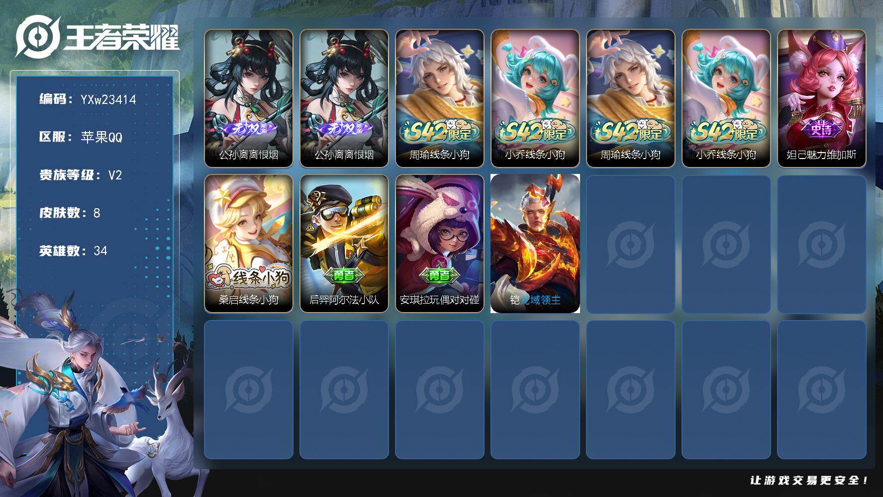 PX_2554078-??小号·离恨烟·无二次包过】YXw23414-苹果Q-34英雄-8皮肤-0王者印记-40铭文-贵族积分0w【贵族2】【1无双·2按键】【因赛季更新游戏段付以上号为准!】 【无双皮肤】:公孙离离恨烟 【限定皮肤】:公孙离离恨烟 【战令限定】:周瑜线条小狗,小乔线条小狗 【史诗皮肤】:周瑜线条小狗,小乔线条小狗,妲己魅力维加斯 【其他皮肤】:桑启线条小狗,后羿阿尔法小队,安琪拉玩偶对对碰,铠龙域领主