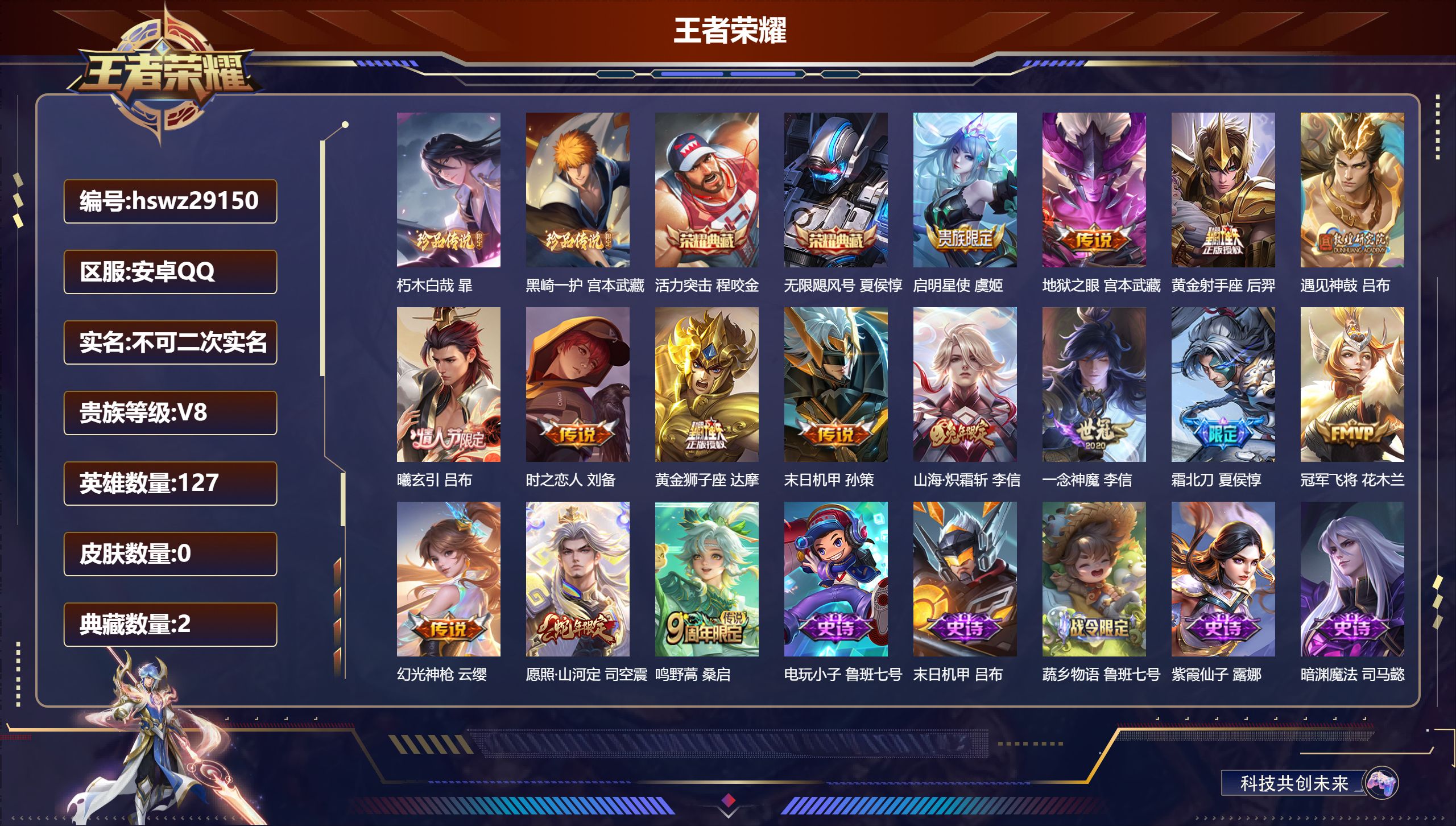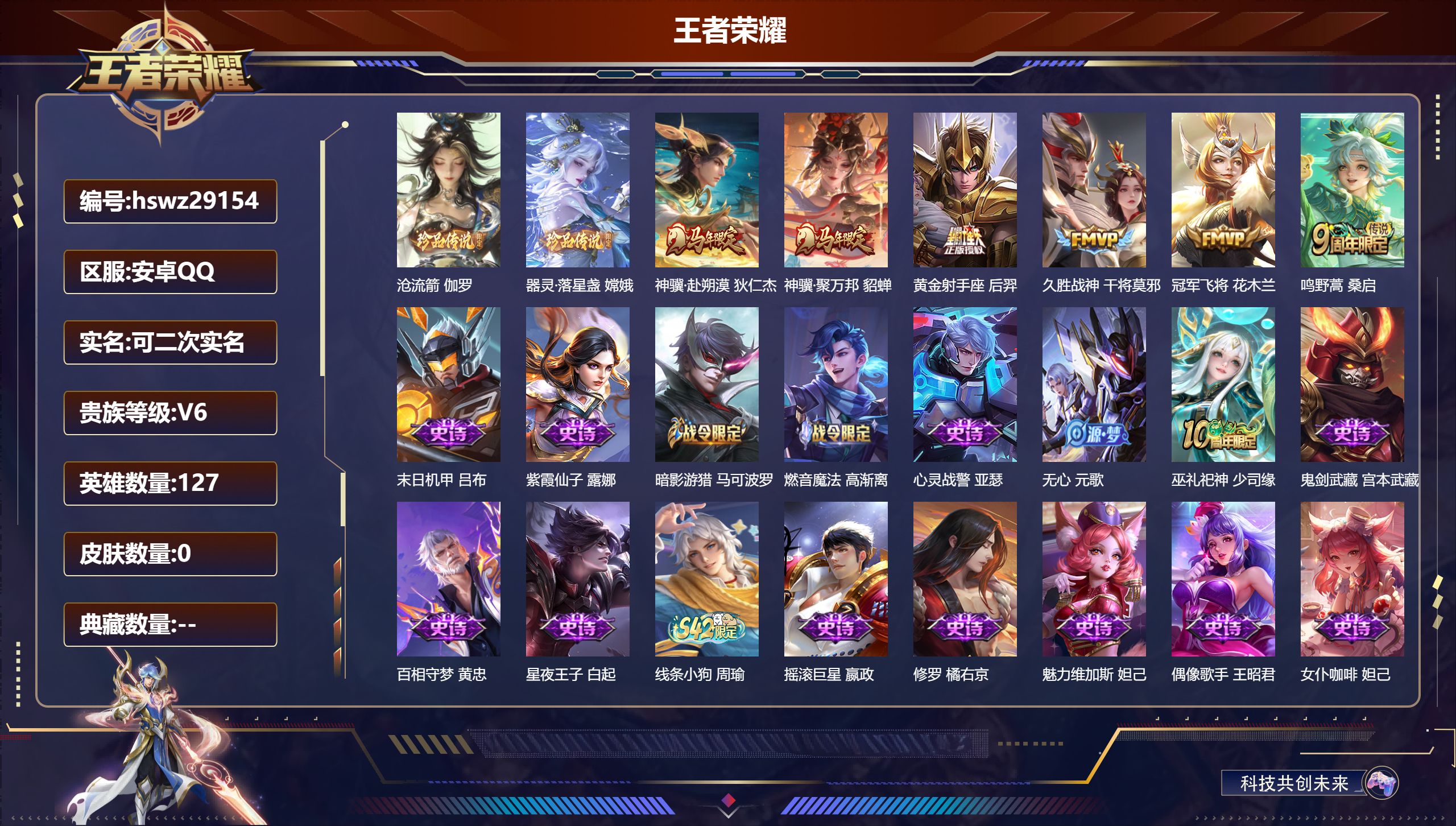 PX_2579104-Q/至尊星耀/432皮肤/130英雄/3典藏/0珍品无双/1无双/0珍品传说/44传说/136史诗/10稀有英雄 【3,典藏皮肤】鸣剑·曳影,李白,全息碎影,孙悟空,九霄神辉,花木兰, 【1,无双皮肤】神器·明辉仪,武则天, 【44,传说皮肤】武圣,关羽,启明星使,虞姬,前尘镜,娜可露露,无限倾心,虞姬,花朝如约,蔡文姬,无双飞将,马超,白虎志,百里玄策,李逍遥,,曜,云鹰飞将,曜,齐天大圣,孙悟空,神器·狴犴令,狄仁杰,追逃游戏,亚瑟,深海之息,马可波罗,觅芳踪,艾琳,游龙清影,西施,永曜之星,杨戬,诗剑行,李白,燃星之曲,花木兰,浮生妄,夏洛特,猫影幻舞,貂蝉,记忆之芯,公孙离,地狱之眼,宫本武藏,武陵仙君,诸葛亮,海洋之心,武则天,炽阳神光,镜,黄金射手座,后羿,无限倾心,项羽,乞巧织情,王昭君,时之恋人,刘备,挚爱之约,孙策,黄金狮子座,达摩,末日机甲,孙尚香,山海·炽霜斩,李信,一念神魔,李信,画中仙,干将莫邪,山海·琳琅生,小乔,淬星耀世,赵云,百相守梦,张飞,炽翼辉光,伽罗,寅虎·赤拳,裴擒虎,超时空战士,狄仁杰,山海·苍雷引,曜,音你闪耀,孙尚香,黄金白羊座,张良, 【136,史诗皮肤】时之奇旅,安琪拉,电玩小子,鲁班七号,末日机甲,吕布,白昼王子,嬴政,蔬乡物语,鲁班七号,紫霞仙子,露娜,高山流水,庄周,云端筑梦师,庄周,真爱至上,周瑜,暗渊魔法,司马懿,暗影游猎,马可波罗,冰霜恋舞曲,干将莫邪,苍穹之光,项羽,狮舞东方,鲁班七号,猫狗日记,大乔,德古拉伯爵,刘邦,山海·玄木吟,马可波罗,心灵战警,亚瑟,五谷丰年,鬼谷子,银翎春语,杨玉环,无心,元歌,鬼剑武藏,宫本武藏,百相守梦,黄忠,星夜王子,白起,无限星赏官,公孙离,线条小狗,周瑜,玉兔公主,公孙离,遇见飞天,杨玉环,摇滚巨星,嬴政,电玩高手,狂铁,顽趣,梦奇,冰锋战神,关羽,百相守梦,关羽,修罗,橘右京,拒霜思,嫦娥,魅力维加斯,妲己,黄金分割率,诸葛亮,电玩·兔顽号,蔡文姬,偶像歌手,王昭君,荣光圣徽,蒙恬,女仆咖啡,妲己,逐梦之音,貂蝉,白蛇,大乔,赏金猎手,澜,九幽镇关,项羽,星界游侠,暃,晚萤,娜可露露,猪悟能,猪八戒,遇见神鹿,瑶,舞动绿茵,蔡文姬,繁星吟游,蔡文姬,暗夜贵公子,嬴政,鹰眼统帅,狄仁杰,胡桃异想国,米莱狄,大圣娶亲,孙悟空,玫瑰异探,镜,李小龙,裴擒虎,纤云弄巧,云中君,驯魔猎人,兰陵王,如梦令,后羿,龙骑士,墨子,金属风暴,墨子,逐梦之影,韩信,傲雪梅枪,韩信,特工魅影,百里守约,猫狗日记,孙策,原初追逐者,百里玄策,逐浪之夏,李元芳,奇幻香踪,扁鹊,时之祈愿,云中君,未来纪元,赵云,引擎之心,赵云,灵蛊蚀心,扁鹊,朱雀志,百里守约,黎明之约,雅典娜,优雅恋人,嬴政,魔术师,狄仁杰,热力回旋,百里玄策,神威,马超,皇家上将,赵云,冰冠公主,雅典娜,至尊宝,孙悟空,辉光之辰,后羿,功夫厨神,程咬金,梁祝,上官婉儿,天才门将,刘禅,圣诞恋歌,貂蝉,云间偶戏,元歌,水晶猎龙者,花木兰,山海·碧波行,瑶,神器·万象笔,上官婉儿,一生所爱,露娜,烈魂,黄忠,圣诞狂欢,吕布,魅语,不知火舞,罗小黑战记,百里玄策,白龙吟,韩信,百相守梦,刘备,天狼运算者,孙膑,星界战将,牛魔,永昼,夏洛特,天狼溯光者,伽罗,地狱岩魂,廉颇,虎魄,张飞,蔷薇恋人,孙尚香,冰雪圆舞曲,甄姬,火炮绅士,黄忠,月团寄思,沈梦溪,航海奇遇记,老夫子,千年之狐,李白,节奏热浪,阿轲,暗夜猫娘,阿轲,超时空战士,钟无艳,游园惊梦,甄姬,曙光守护者,铠,青龙志,铠,心灵骇客,安琪拉,匿光破解者,沈梦溪,箭羽风息,伽罗,乱世虎臣,张飞,天狼征服者,曹操,吟游魔法,明世隐,琥珀纪元,伽罗,天穹守望者,后羿,龙胆,赵云,王者之锤,钟无艳,绅士熊喵,刘禅,缤纷独角兽,小乔,蓝屏警告,典韦,真爱魔法,干将莫邪,水果甜心,孙尚香,狂想玩偶喵,蒙犽,江河有灵,阿古朵,幽灵船长,曹操,乘风破浪,夏侯惇,暗隐猎兽者,兰陵王, 【169,勇者皮肤】时空谍影,海诺,玲珑珍味,西施,圆桌骑士,盾山,烛龙,曹操,爱心护理,阿轲,太极少年,赵怀真,星际陆战队,达摩,沙漠行僧,达摩,大漠名商,沈梦溪,缤纷绘卷,张良,纽约教父,刘备,拳王,达摩,大发明家,达摩,龙舞盛年,沈梦溪,乐园追猎者,白起,丁香结,小乔,功夫炙烤,廉颇,铁甲之心,典韦,沉稳之力,孙尚香,幻夜卜梦,芈月,海盐诗旅,桑启,幻泉雾影,海月,朔风刀,夏侯惇,醍醐杖,老夫子,朔望之晖,女娲,归虚梦演,孙膑,汉昭烈帝,刘备,白色死神,白起,黄金武士,典韦,落雪兰心,甄姬,御旌,牛魔,阴阳师,狄仁杰,炼金王,扁鹊,致命风华,阿轲,次元突破,哪吒,古海寻踪,张良,牛运亨通,牛魔,科学大爆炸,项羽,戏梦巡演,空空儿,功夫老勺,老夫子,西部大镖客,牛魔,鲨炮海盗猫,沈梦溪,虎啸剑宗,刘邦,海滩派对,项羽,万华元夜,狄仁杰,无尽征程,廉颇,制霸全明星,牛魔,演武夺筹,程咬金,红桃皇后,芈月,奇妙博物学,庄周,西部游侠,莱西奥,猎兽之王,吕布,野性能量,吕布,哥特玫瑰,露娜,守护之力,大乔,无双福将,程咬金,瓷语鉴心,露娜,原初探秘者,鬼谷子,潮玩探月行,猪八戒,天穹祈灯,鬼谷子,西部大镖客,猪八戒,疑决卦,明世隐,如懿,安琪拉,化身博士,扁鹊,潮玩骑士王,亚瑟,阿尔法小队,后羿,无尽旅途,扁鹊,五福同心,张飞,夜都怪侠,白起,金色潮汐,朵莉亚,星际陆战队,程咬金,幻乐之宴,鬼谷子,东方不败,武则天,霸王丸,宫本武藏,虹云星官,明世隐,雾影缉谜,兰陵王,潮玩牛仔,马可波罗,救世之瞳,扁鹊,潮玩骑兵,杨戬,赤莲之焰,周瑜,死亡骑士,亚瑟,敏锐之力,李白,危途狂花,戈娅,胡桃狂想曲,蒙犽,破局者,亚连,幽兰居士,张良,玩偶对